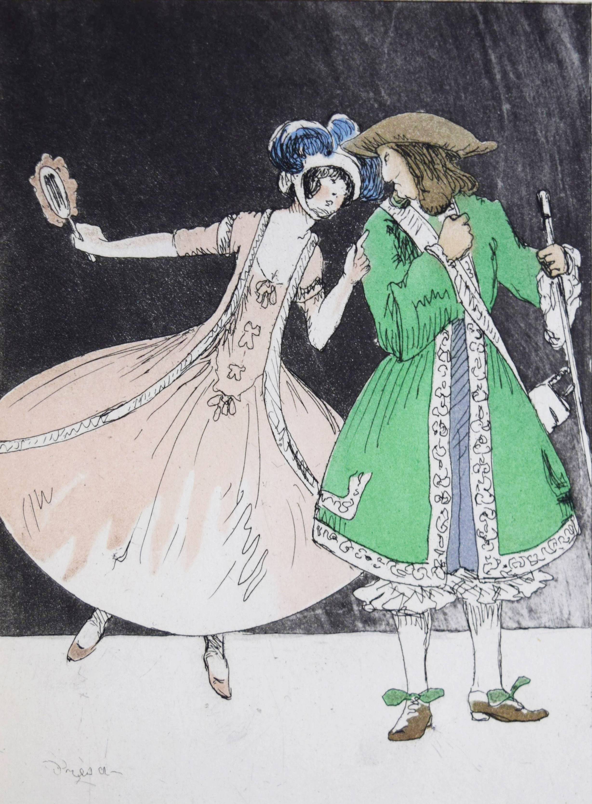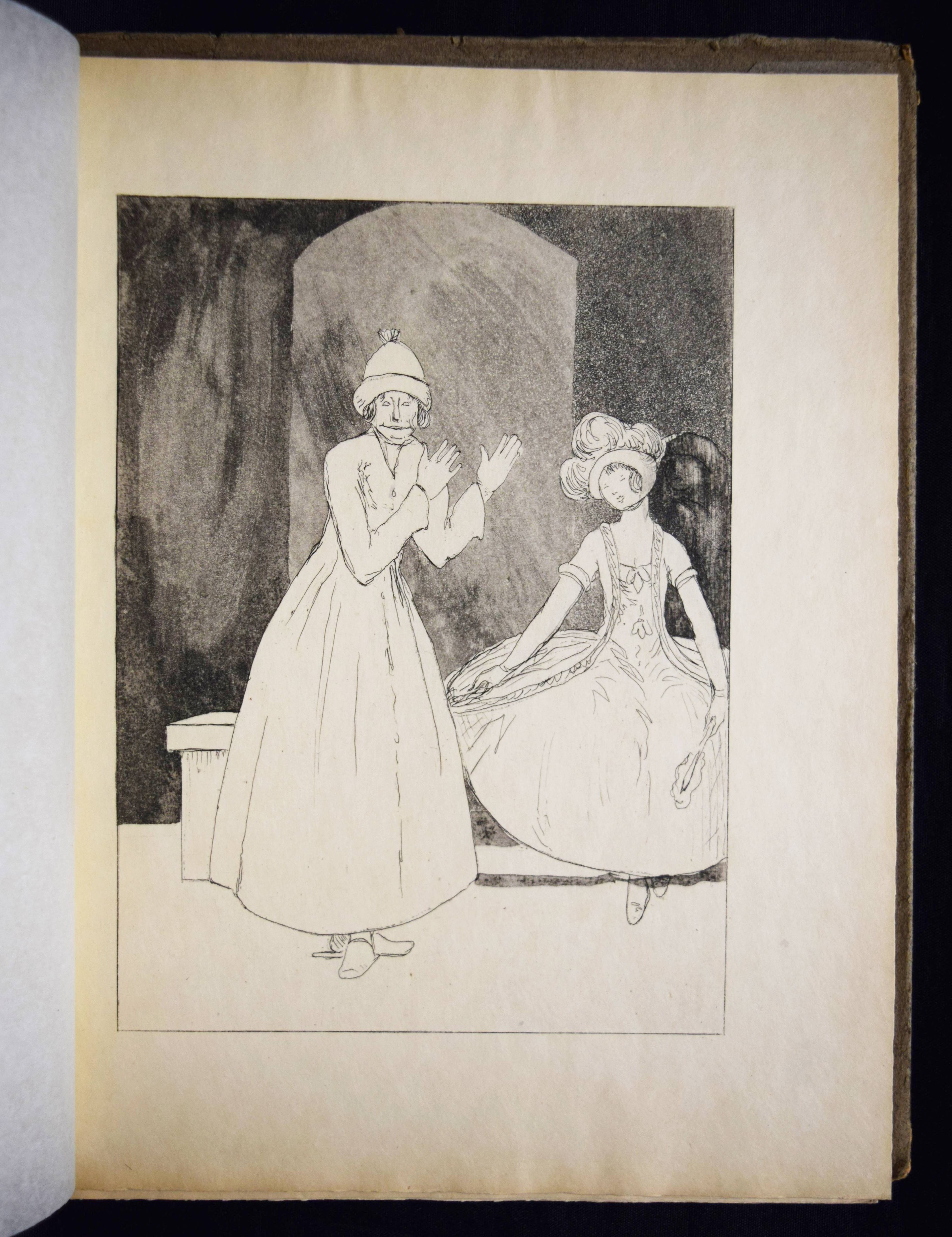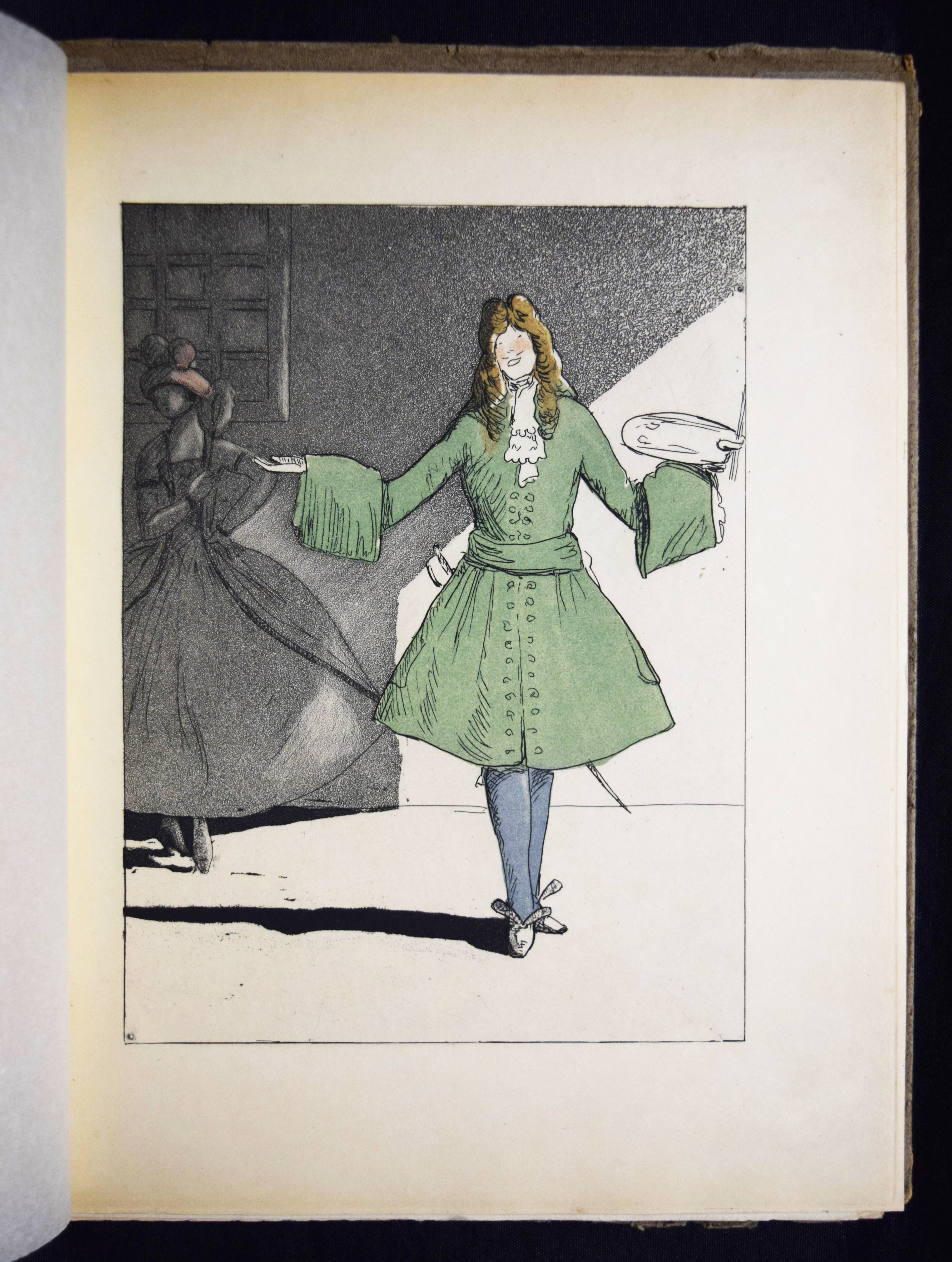Molière (d. i. Jean-Baptiste Poquelin). Le Sicilien. Compositions en couleurs gravée en taille-douce par (Jacques) Drésa. Paris, Société des amis du livre moderne 1914. 8°. 38 S. u. 6 (5 ganzs.) farb. Aquatinta-Radierungen in jeweils 4 versch. Abzügen. Lose Bogen in OHln.-Flügelmappe mit goldgepr. Rückentitel. Monod 8294. – Eines von 125 Exemplaren (No. 10) für die Mitglieder der Société des amis du livre moderne auf Japan-Imperiale (GA 150 Exemplare). Mit der Suite der Radierungen in jeweils vier verschiedenen Zuständen. – J. Drésa (1869-1929), Professor an der Ecole des Beaux-Arts in Paris, arbeitete auch als Kostümdesigner und Bühnenbildner für das Théatre des Arts. „Einer der elegantesten und geschmackvollsten Zeichner des zeitgenössischen Paris“ (Thieme/Becker). – Rücken etwas aufgehellt, Deckel und Kanten etwas berieben, Schließbänder fehlen, sonst gut erhalten.