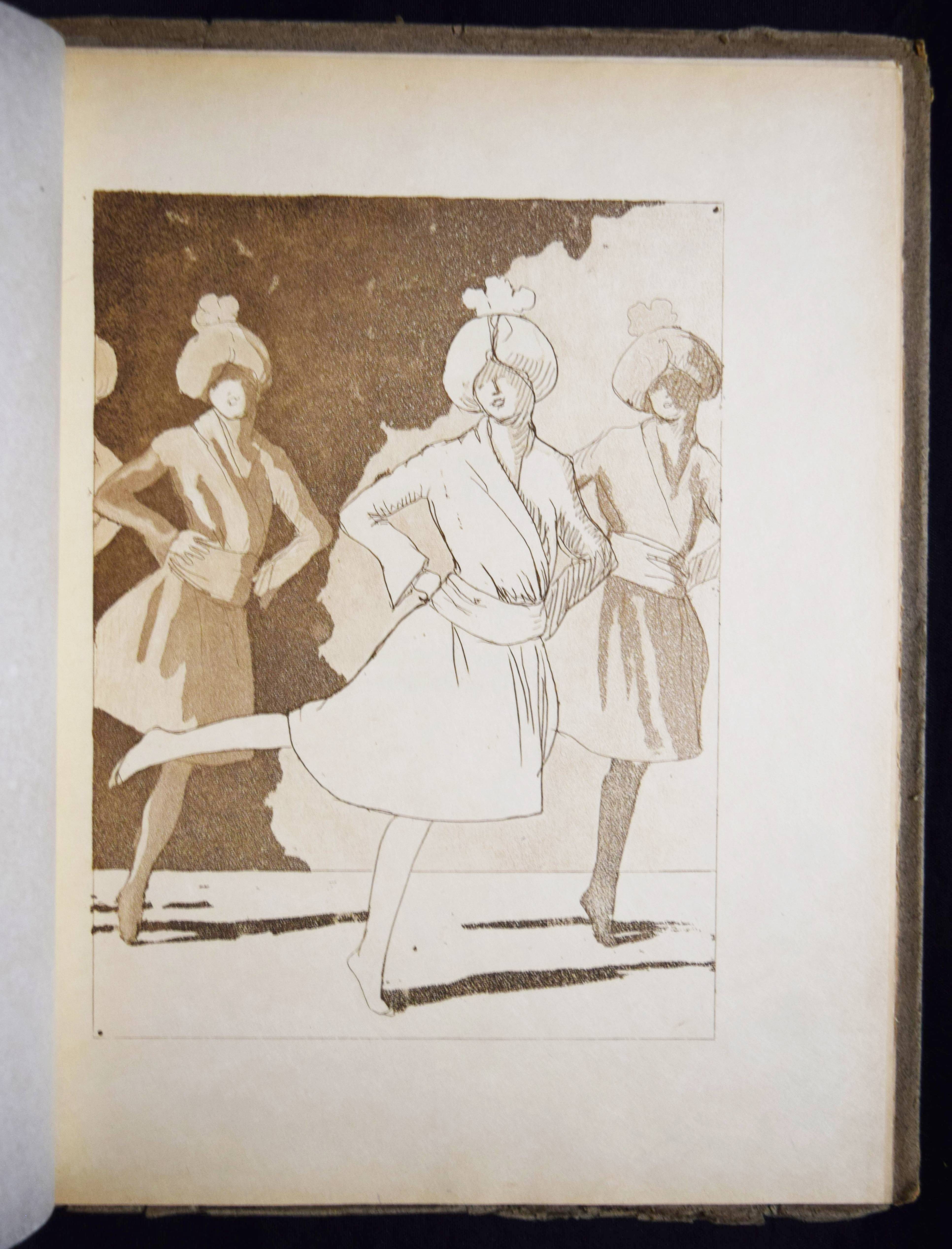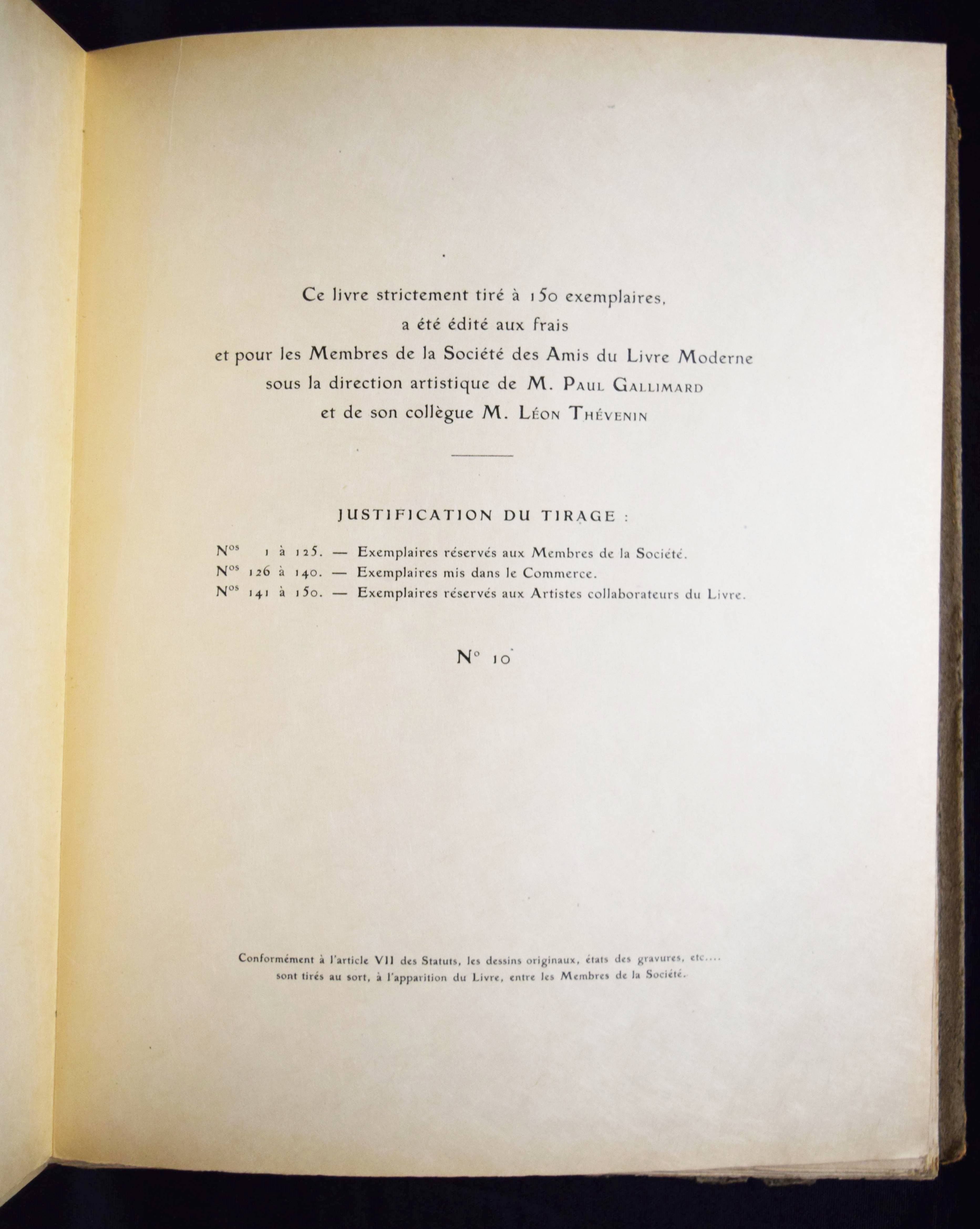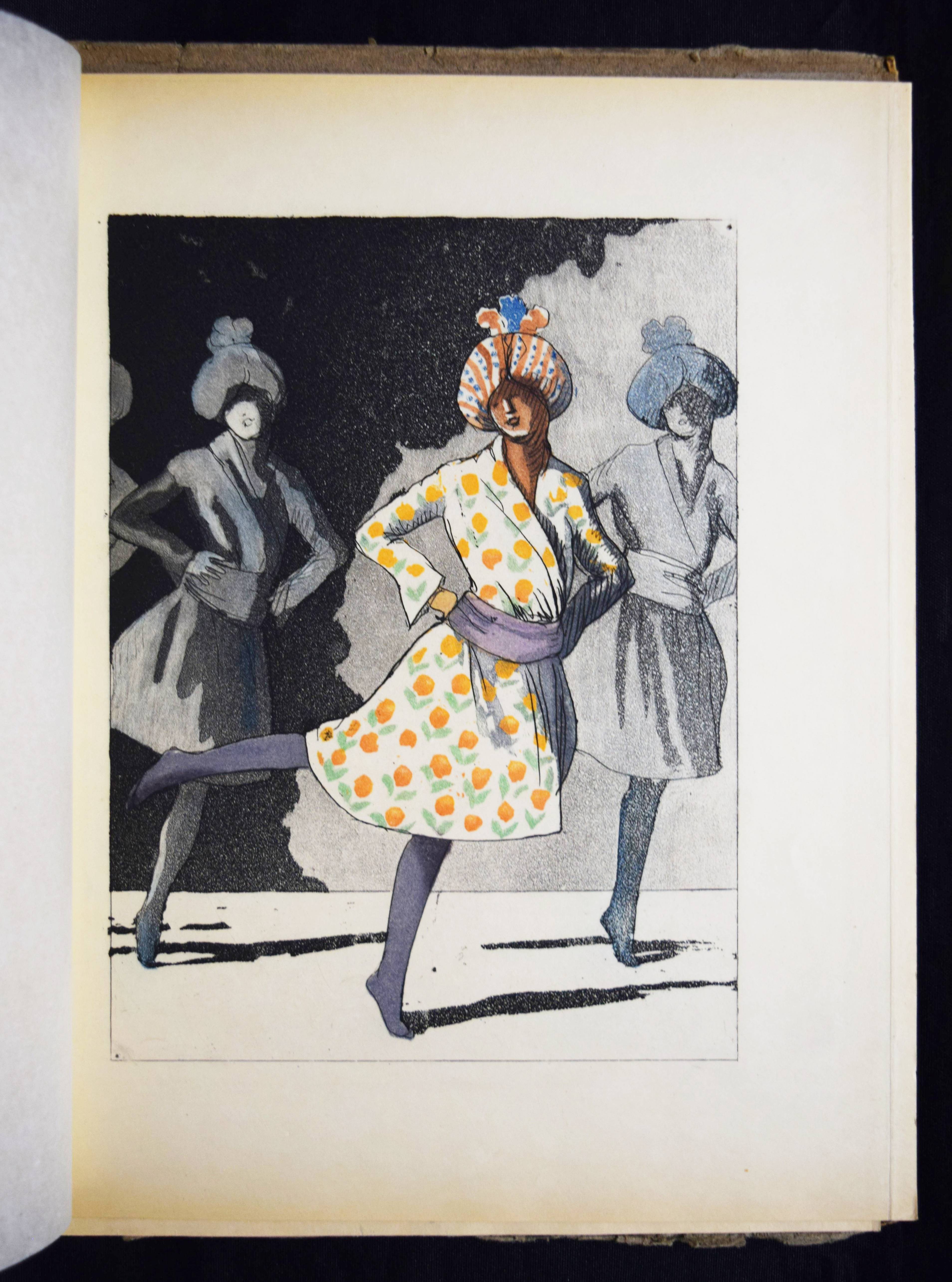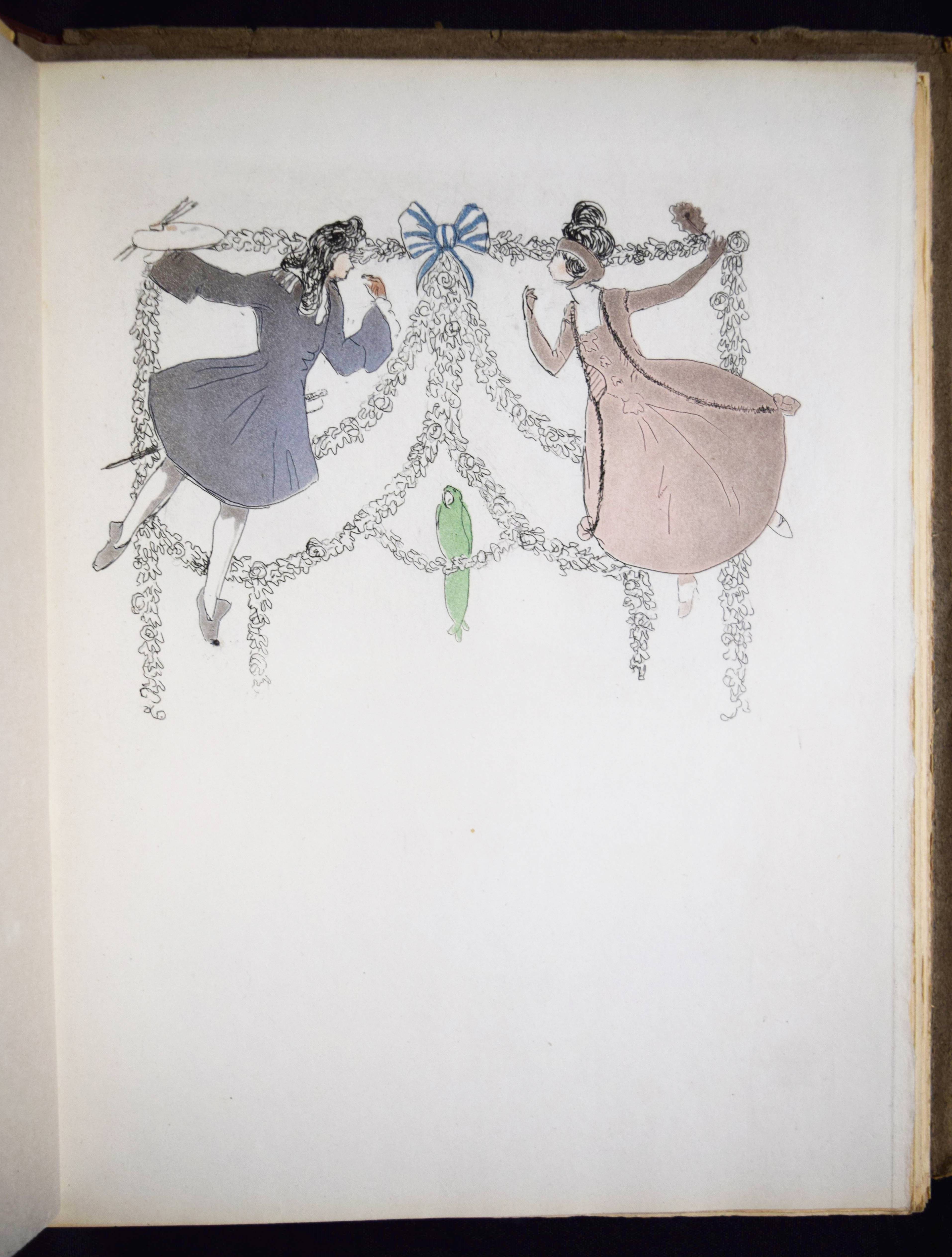 Molière (d. i. Jean-Baptiste Poquelin). Le Sicilien. Compositions en couleurs gravée en taille-douce par (Jacques) Drésa. Paris, Société des amis du livre moderne 1914. 8°. 38 S. u. 6 (5 ganzs.) farb. Aquatinta-Radierungen in jeweils 4 versch. Abzügen. Lose Bogen in OHln.-Flügelmappe mit goldgepr. Rückentitel. Monod 8294. – Eines von 125 Exemplaren (No. 10) für die Mitglieder der Société des amis du livre moderne auf Japan-Imperiale (GA 150 Exemplare). Mit der Suite der Radierungen in jeweils vier verschiedenen Zuständen. – J. Drésa (1869-1929), Professor an der Ecole des Beaux-Arts in Paris, arbeitete auch als Kostümdesigner und Bühnenbildner für das Théatre des Arts. „Einer der elegantesten und geschmackvollsten Zeichner des zeitgenössischen Paris“ (Thieme/Becker). – Rücken etwas aufgehellt, Deckel und Kanten etwas berieben, Schließbänder fehlen, sonst gut erhalten.