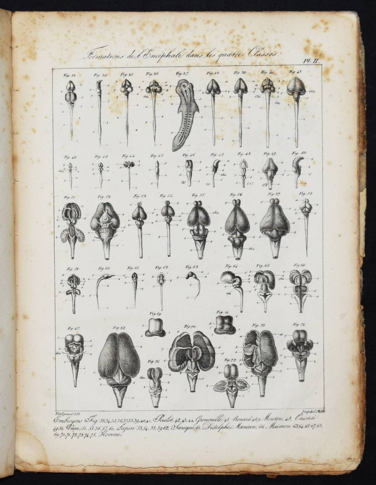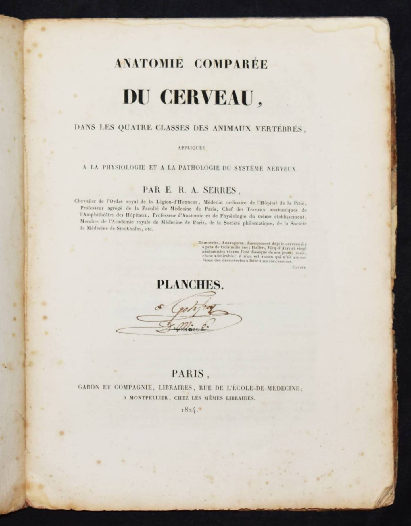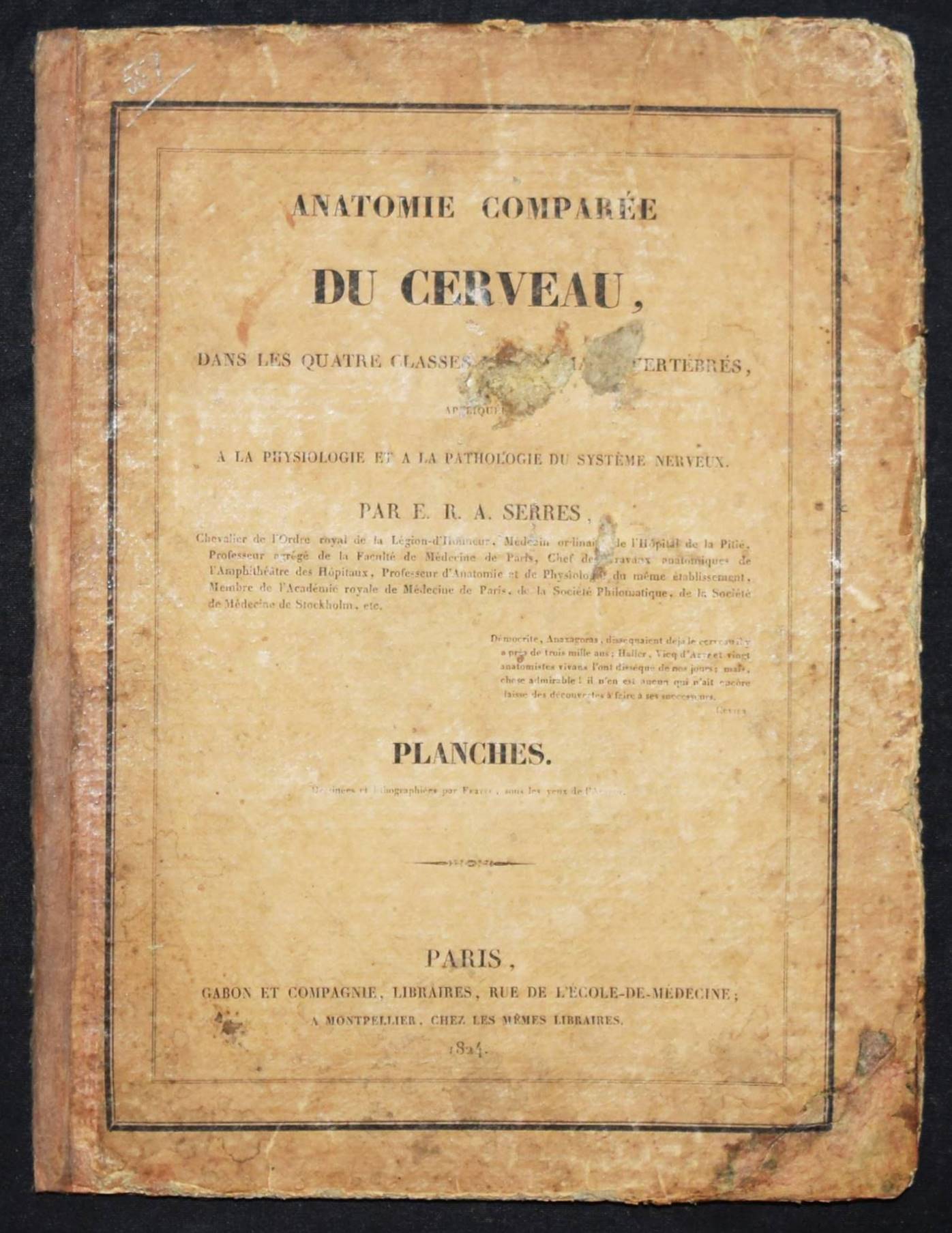 Serre, E(tienne) R(enaud) A(ugustin). Anatomie comparée du cerveau dans les quatres classes des animaux vertébrés. Appliqué à la physiologie et à la pathologie du système nerveux. Planches. Paris, Gabon et Compagnie 1824. 4°. 46 S. u. 16 lithogr. Tafel. OPbd. DSB XII, 315 f. Hirsch-Hüb. IV, 569. – Erste Ausgabe des Tafel-Bands zu der Gehirn-Anatomie der Wirbeltiere. 1827 erschien noch ein zweiter Teil. – „Serres was trained in Paris and received his medical degree in 1810. From 1808 to 1822 he worked at the Hôtel-Dieu. In 1820 he was awarded the prize for physiological research by the Académie des Sciences and the following year gained a special prize for his two-volume work on the comparative anatomy of the brains of vertebrate animals. In 1822, he was appointed chief medical officer at the Hôpital de la Pitié. He was elected to the Académie de médecine in 1822 and to the Académie des Sciences in 1828. In 1839, he preceded Flourens as professor of comparative anatomy at the Jardin des Plantes and two years later became president of the Académie des sciences. Serres studied the comparative anatomy of a number of vertebrate organs. He noted that many organs start from a number of isolated centers, which eventually unite to form a single adult organ. In his general approach to the nature of life and the harmony between the organes he was clearly influenced by Cuvier, who mentioned Serres’s work with admiration. Serres’s theoretical position was more closely akin to that of Geoffroy Saint-Hilaire. Serres believed that there was only one underlying animal type and that in the course of their development, the organs of the higher animals repeated the form of the quivalent organs in lower organisms“ (DSB). – Rücken alt restauriert, Deckel stärker gebräunt, berieben und fleckig, durchgehend braunfleckig, noch gutes Exemplar.