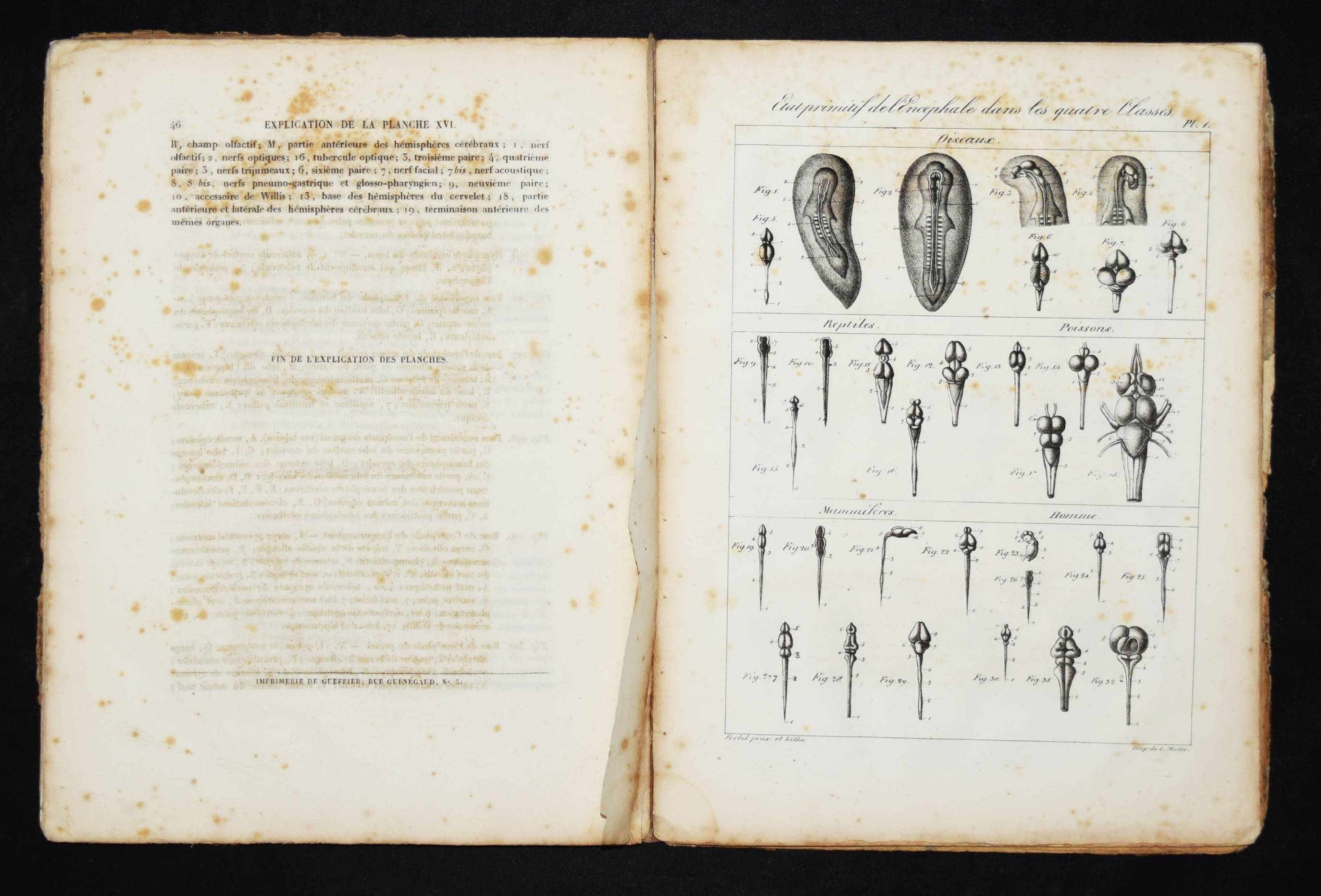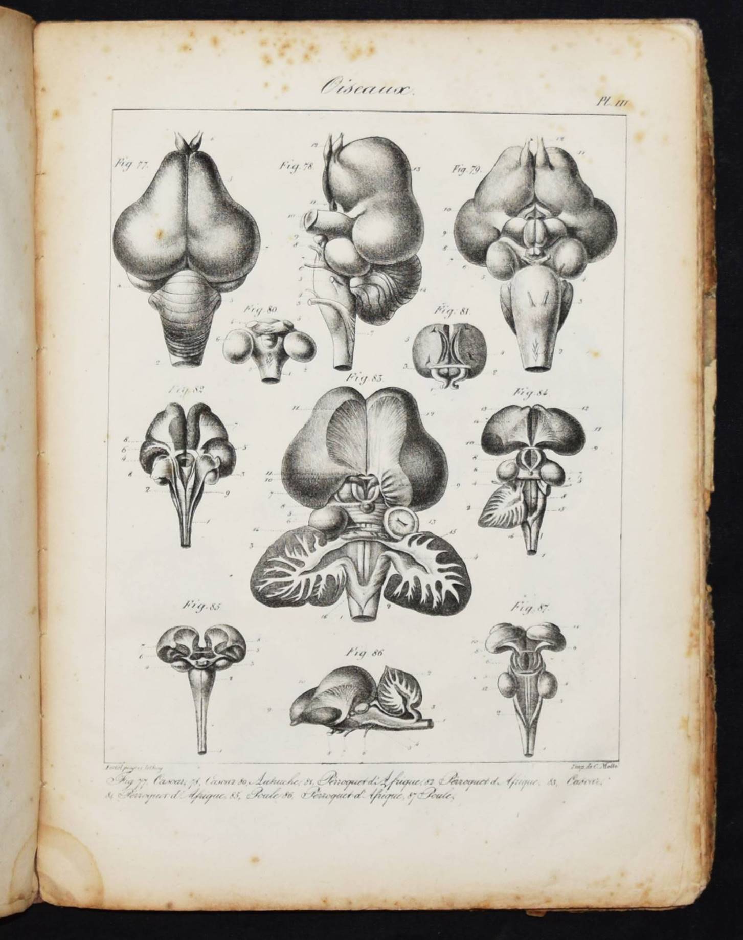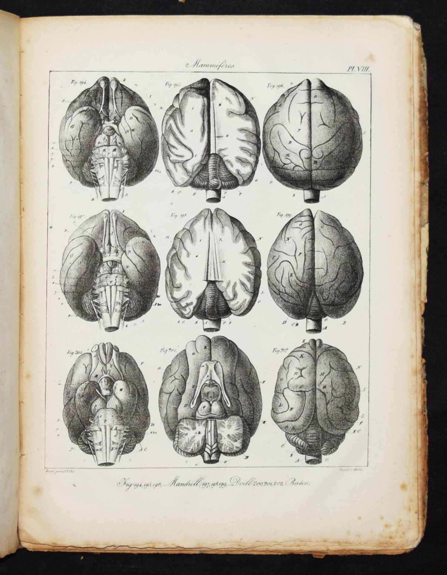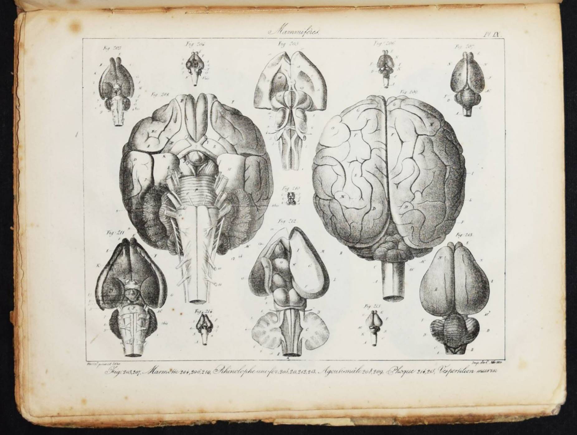 Serre, E(tienne) R(enaud) A(ugustin). Anatomie comparée du cerveau dans les quatres classes des animaux vertébrés. Appliqué à la physiologie et à la pathologie du système nerveux. Planches. Paris, Gabon et Compagnie 1824. 4°. 46 S. u. 16 lithogr. Tafel. OPbd. DSB XII, 315 f. Hirsch-Hüb. IV, 569. – Erste Ausgabe des Tafel-Bands zu der Gehirn-Anatomie der Wirbeltiere. 1827 erschien noch ein zweiter Teil. – „Serres was trained in Paris and received his medical degree in 1810. From 1808 to 1822 he worked at the Hôtel-Dieu. In 1820 he was awarded the prize for physiological research by the Académie des Sciences and the following year gained a special prize for his two-volume work on the comparative anatomy of the brains of vertebrate animals. In 1822, he was appointed chief medical officer at the Hôpital de la Pitié. He was elected to the Académie de médecine in 1822 and to the Académie des Sciences in 1828. In 1839, he preceded Flourens as professor of comparative anatomy at the Jardin des Plantes and two years later became president of the Académie des sciences. Serres studied the comparative anatomy of a number of vertebrate organs. He noted that many organs start from a number of isolated centers, which eventually unite to form a single adult organ. In his general approach to the nature of life and the harmony between the organes he was clearly influenced by Cuvier, who mentioned Serres’s work with admiration. Serres’s theoretical position was more closely akin to that of Geoffroy Saint-Hilaire. Serres believed that there was only one underlying animal type and that in the course of their development, the organs of the higher animals repeated the form of the quivalent organs in lower organisms“ (DSB). – Rücken alt restauriert, Deckel stärker gebräunt, berieben und fleckig, durchgehend braunfleckig, noch gutes Exemplar.
