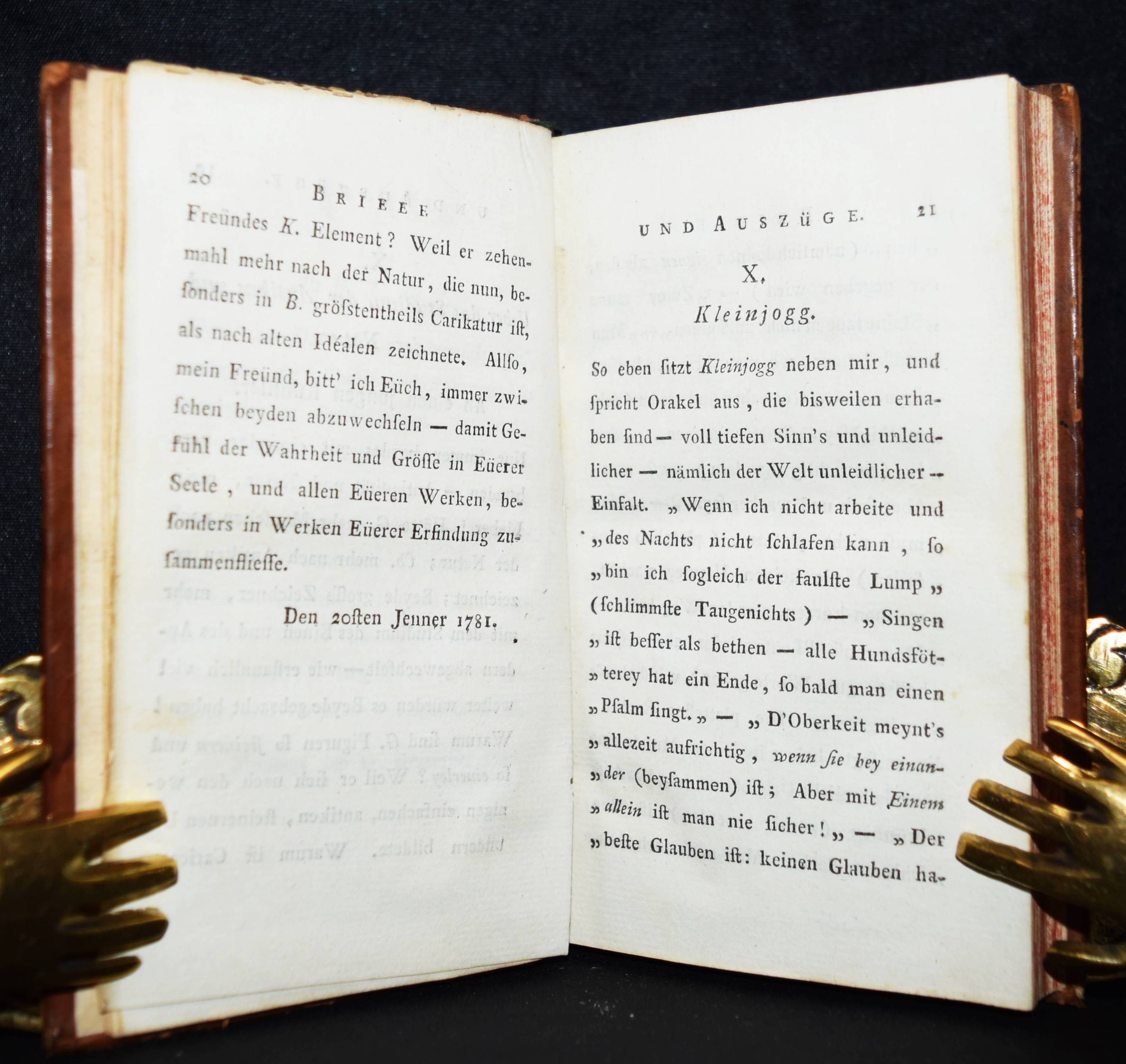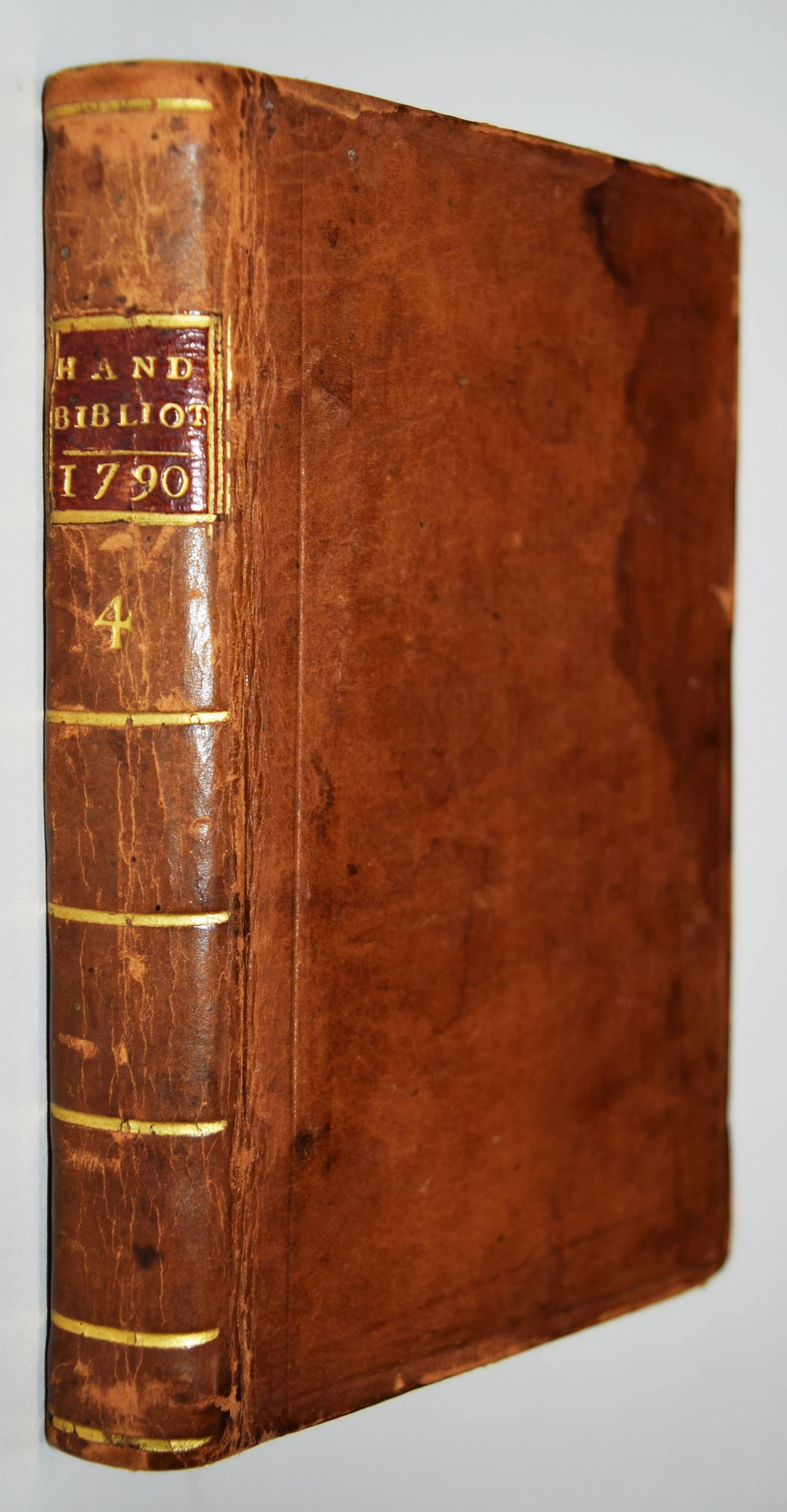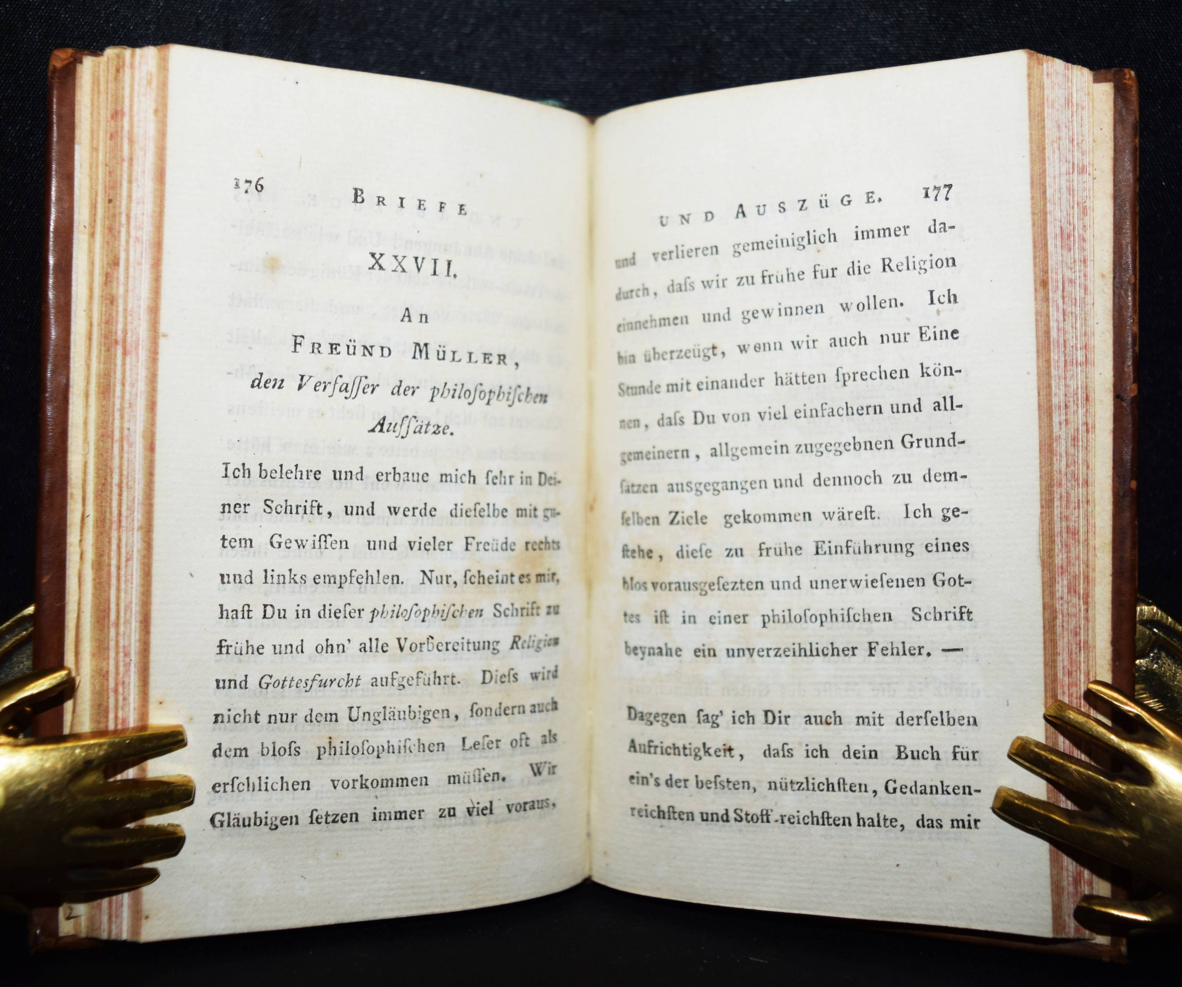 (Lavater, Johann Caspar). Hand-Bibliotheck für Freunde; von Lavatern. IV 1790 an Herrn Schulthessius. (Zürich, Selbstverlag 1790). 12° (13 x 8 cm.). Gestoch. Titelbl. mit handschr. Titel und Namen des Empfängers in Lavaters Handschrift, 285, (1) S. Ldr. d. Zt. mit goldgepr. Rückenschild und Linienvergoldung. Goed. IV/1, 274, 64. Schulte-Strathaus 164. – 4. Heft (von 6) des vierten Jahrgangs. – Das vorliegende Heft enthält: „Briefe, Briefchen und Auszüge aus Briefen“. – Bei dem Widmungsempfänger handelt es sich wohl um ein Familienmitglied der bekannten Züricher Familie Schulthess. Lavater war besonders eng befreundet mit Barbara Schulthess (1745-1818), Ehefrau des Züricher Seidenfabrikanten und Hauptmanns David Schulthess (gest. 1778), die auch bis 1797 mit Goethe einen ausgedehnten Briefwechsel unterhielt. – „Es wurde für Lavater … geradezu Regel, seine vermischten, meist religiös-ascetischen Gedanken, bald zu kleineren Aufsätzen verarbeitet, bald nur als Sentenzen ausgesprochen, zu sammeln und davon ein Heft um das andere seinen Freunden vorzulegen“ (ADB). Auf kleinen Zettelchen pflegte er zudem Gedanken, die ihm zu Hause, auf Spaziergängen oder anderswo kamen, „in hexametrischer Form“ aufzuzeichnen, ebenso notierte er schöne oder gedankenreiche oder tief gefühlte Stellen aus seiner reichen Korrespondenz, aus eigenen oder ihm zugesandten Episteln, oder aus Büchern, mit denen er sich gerade beschäftigte. All dies, dazu zahlreiche Gelegenheitsgedichte, religiöse und philosophische Dichtungen etc., fanden regelmäßig Eingang in Lavaters „Hand-Bibliotheck“, die er in kleinen Auflagen, in Antiqua auf bestes Papier gedruckt, oft mit handschriftlichen Titeln und Widmungen versehen, im Selbstverlag herstellen ließ und kostenlos nur an seine Freunde verteilte. – Einband etwas berieben, gutes Exemplar.