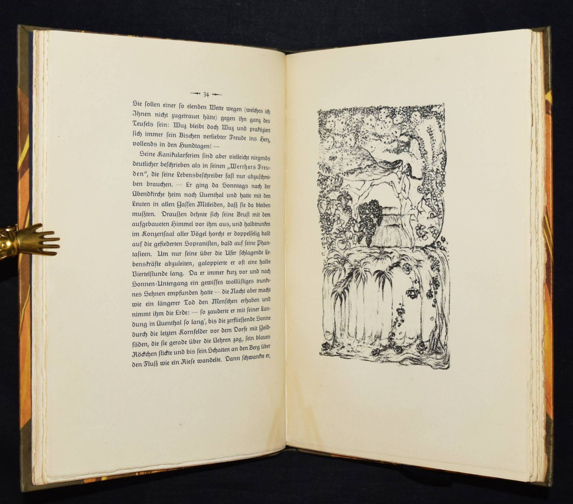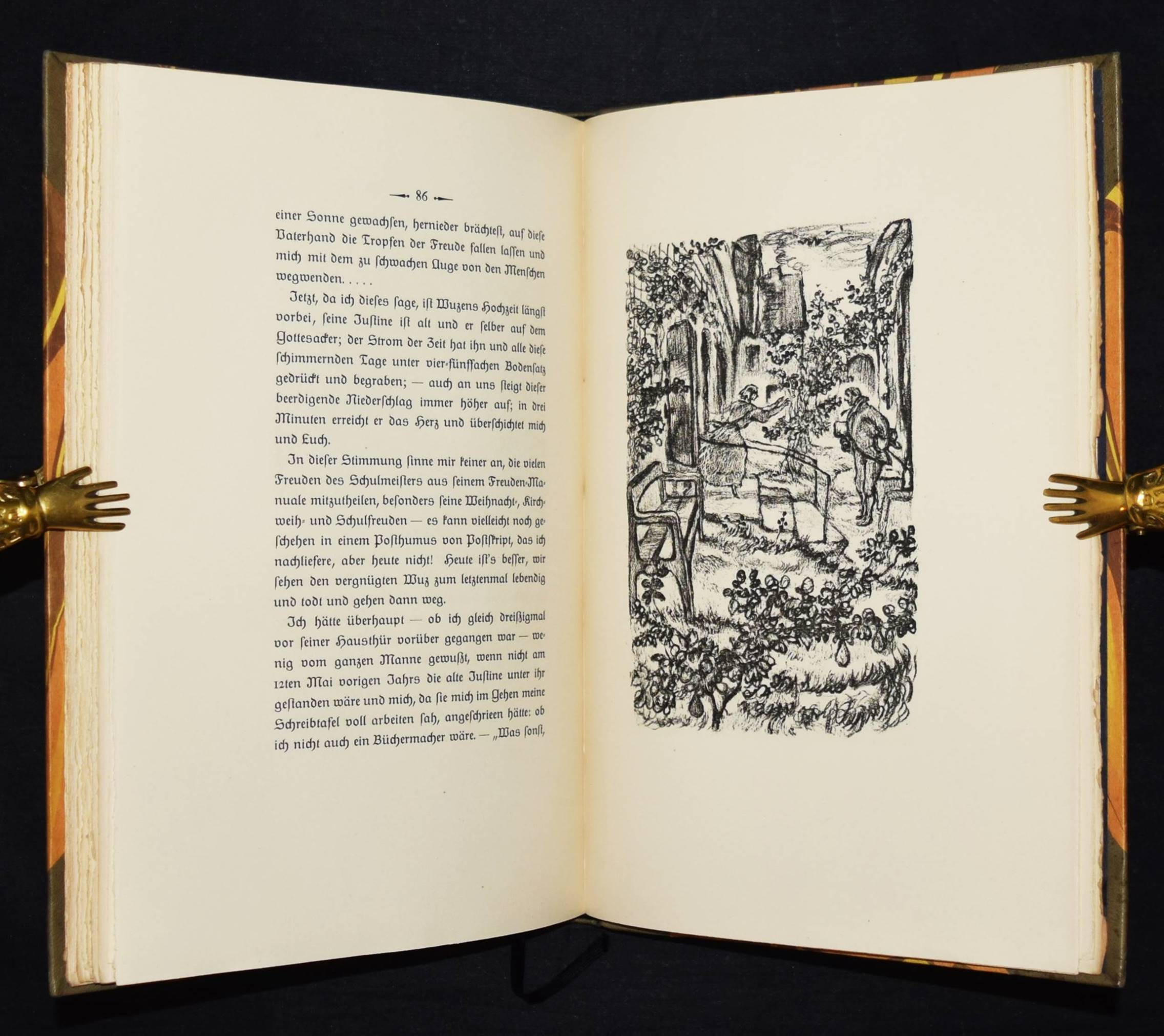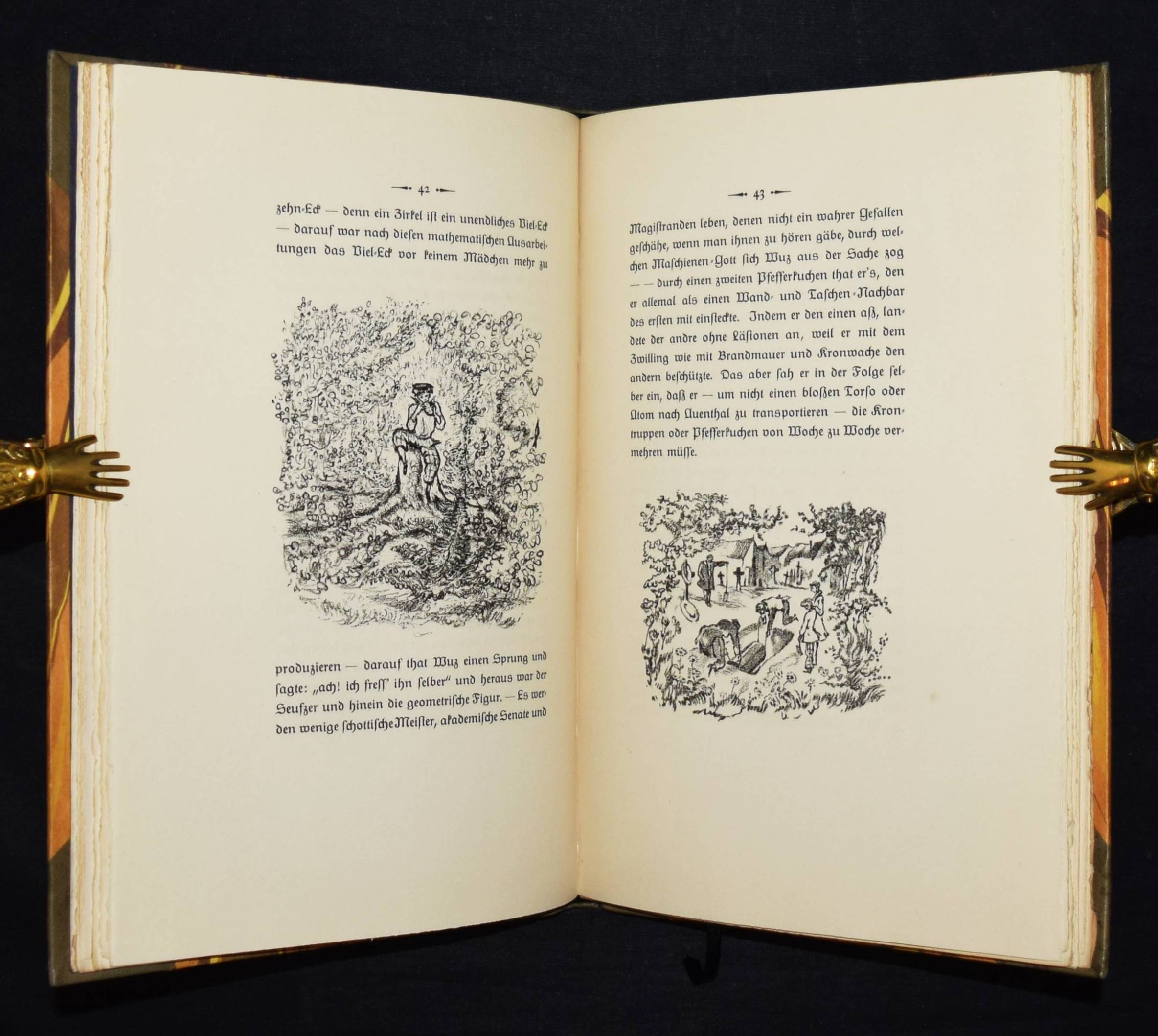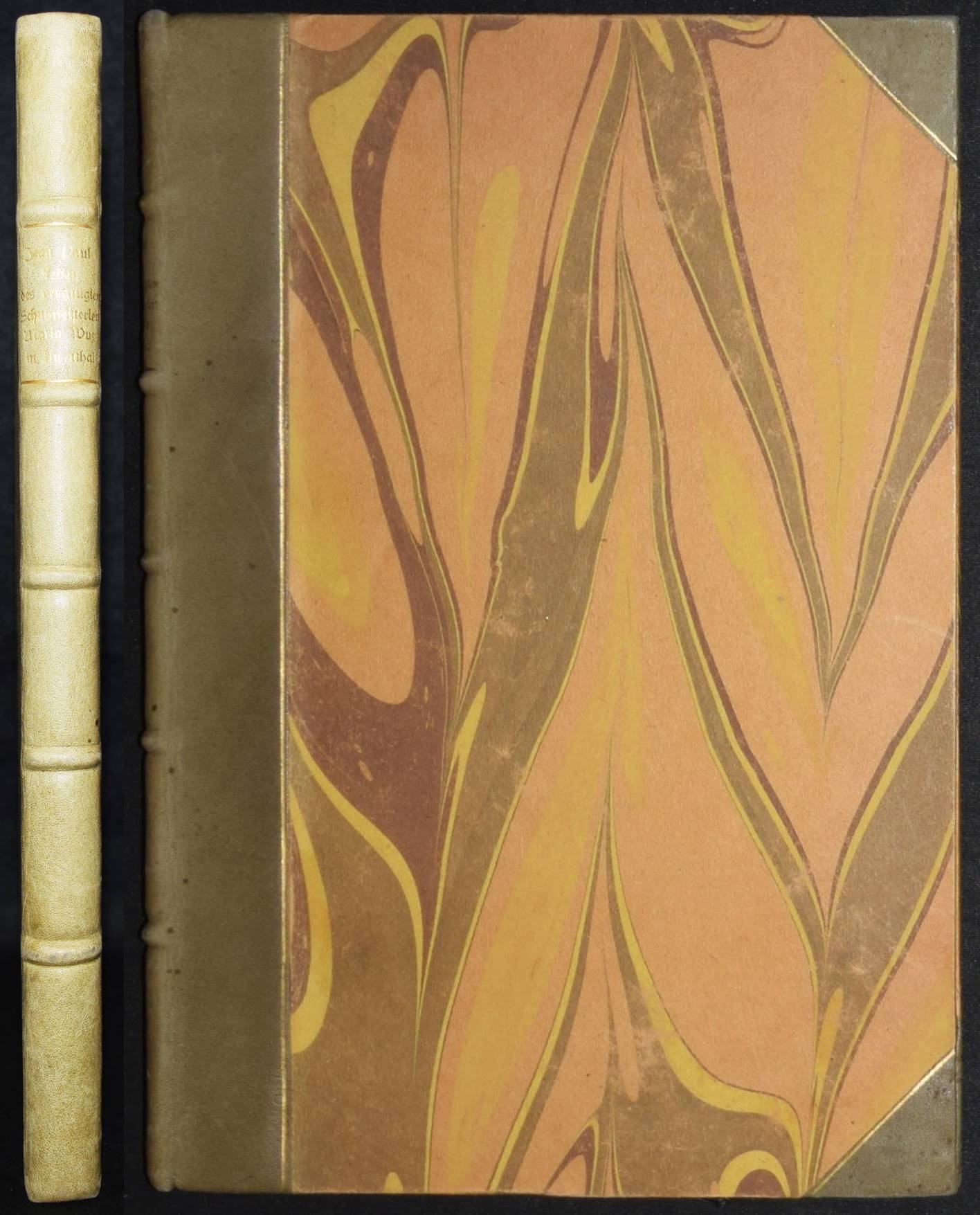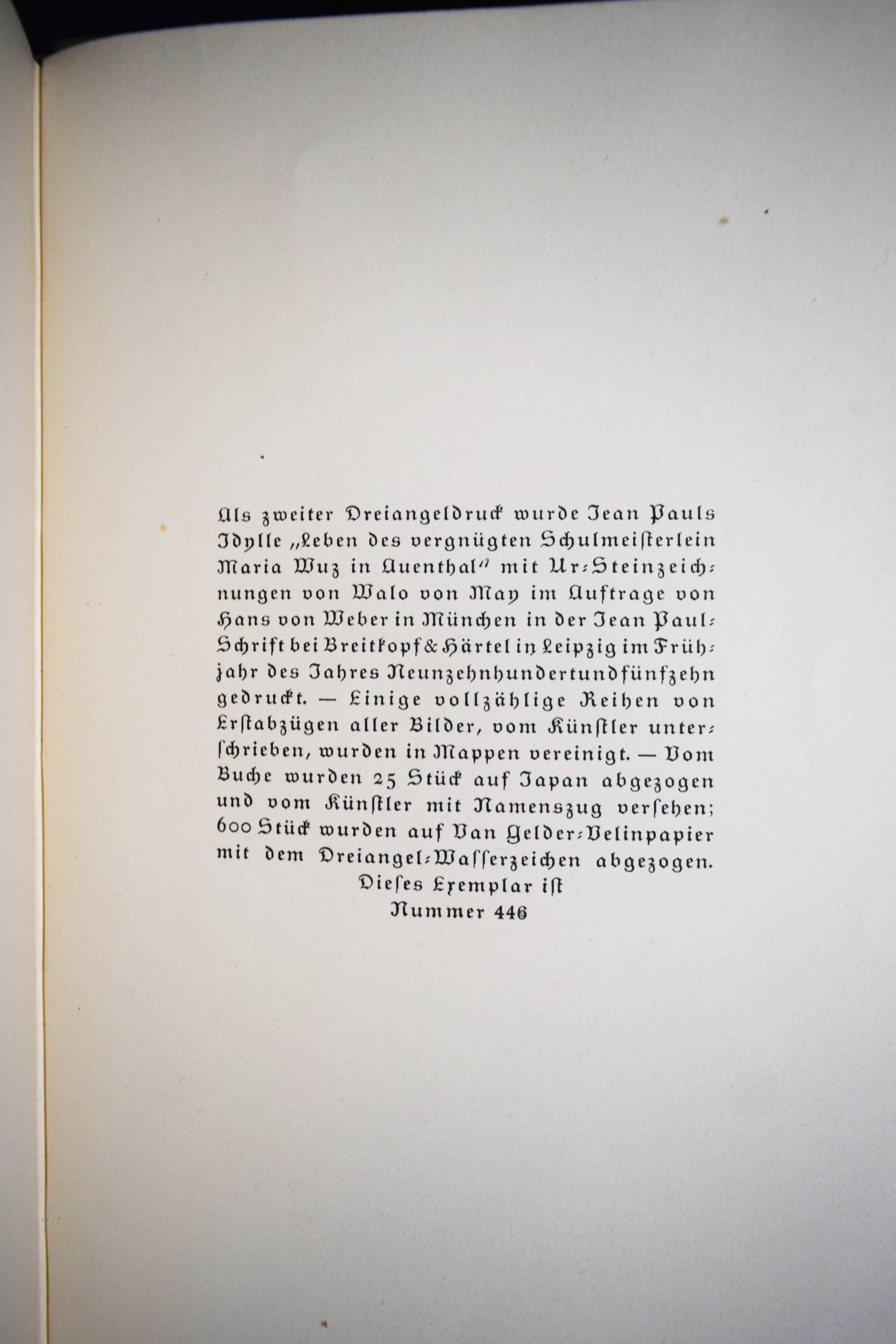 Jean Paul (d. i. Johann Paul Friedrich Richter). Leben des vergnügten Schulmeisterlein Maria Wuz in Auenthal. Eine Art Idylle. München, Hans v. Weber 1915. 4°. 109 S., [1] Bl. mit 60 (4 ganzs.) Orig.-Lithographien von Walo von May. Grauer Orig.-Halblederband mit goldgepr. Rückentitel, 5 unechten Bünden u. Kopfgoldschnitt (monogrammiert ″WFB″). (2. Dreiangeldruck). Rodenberg, 416, 2. Schauer II, 62. Sennewald 15. – Eines von 600 Exemplaren auf Van Gelder-Velin. – Einband geringfügig berieben, schönes Exemplar.