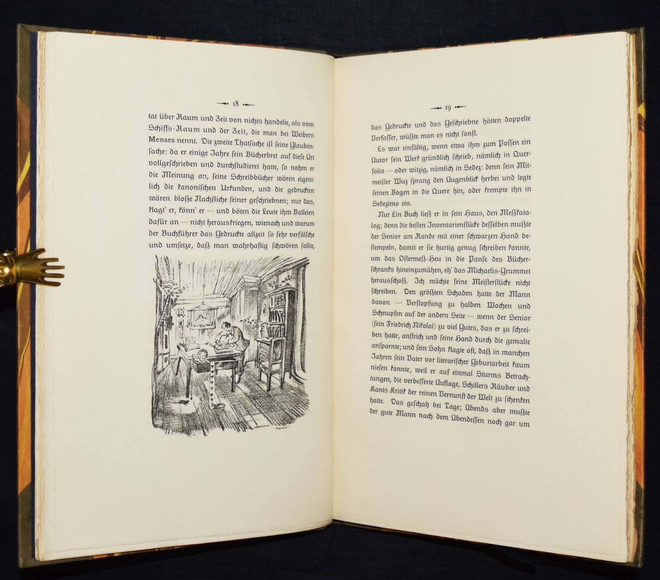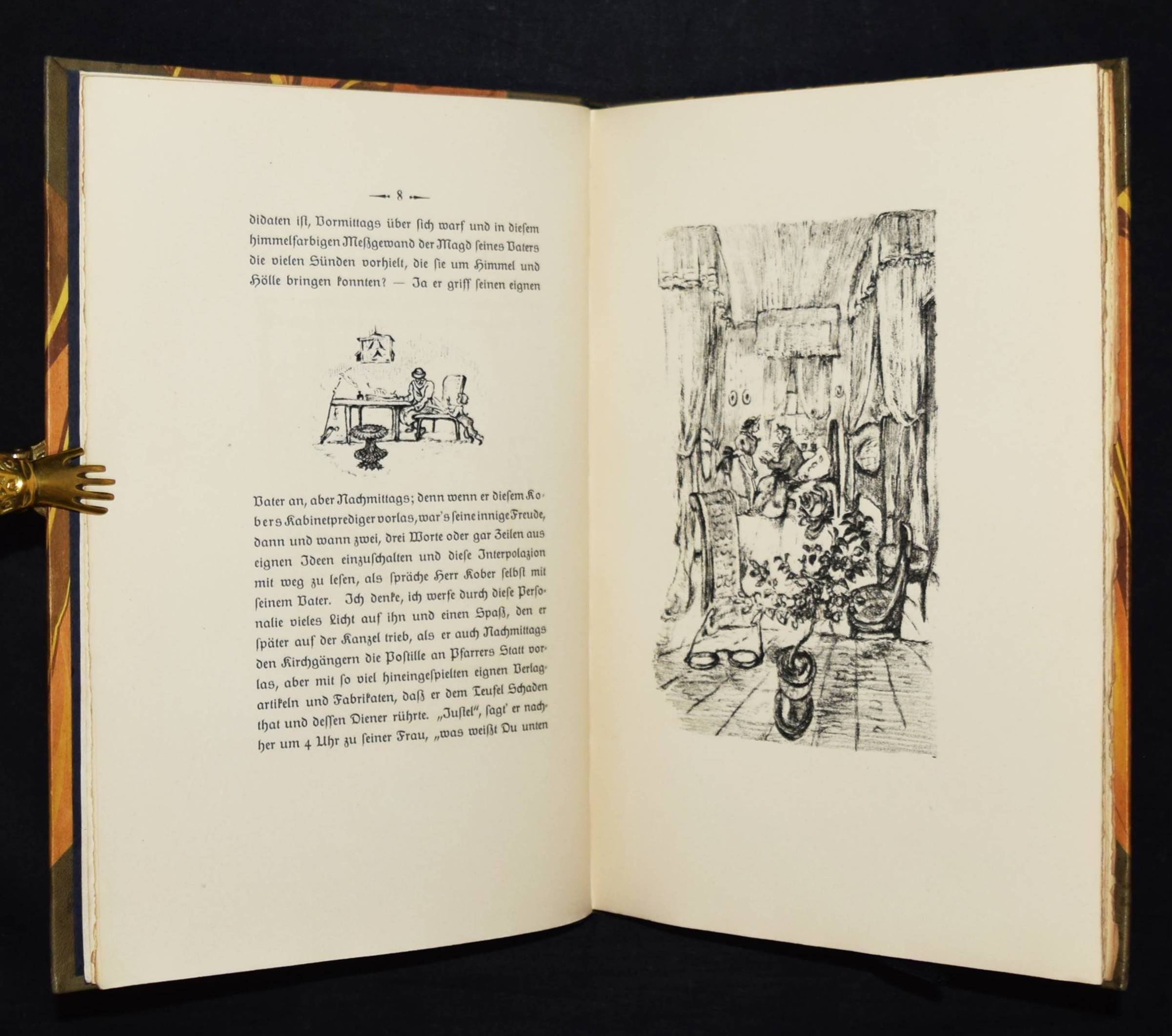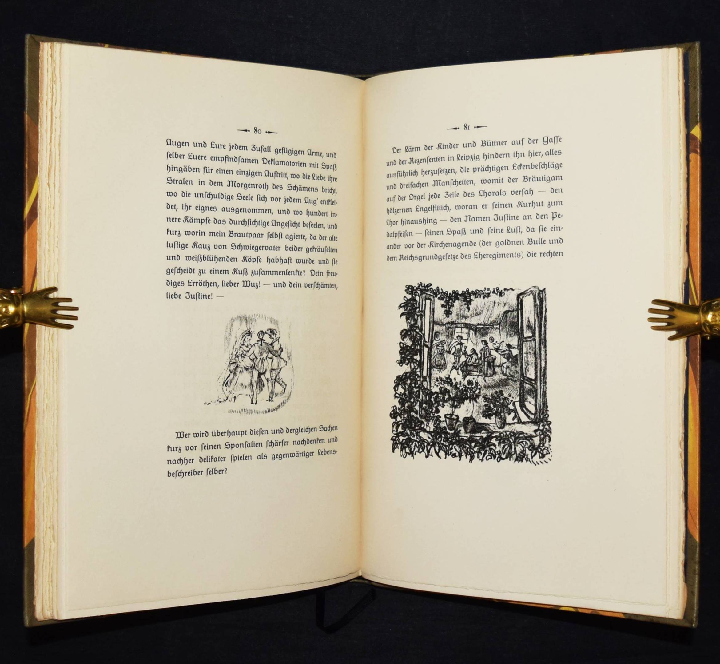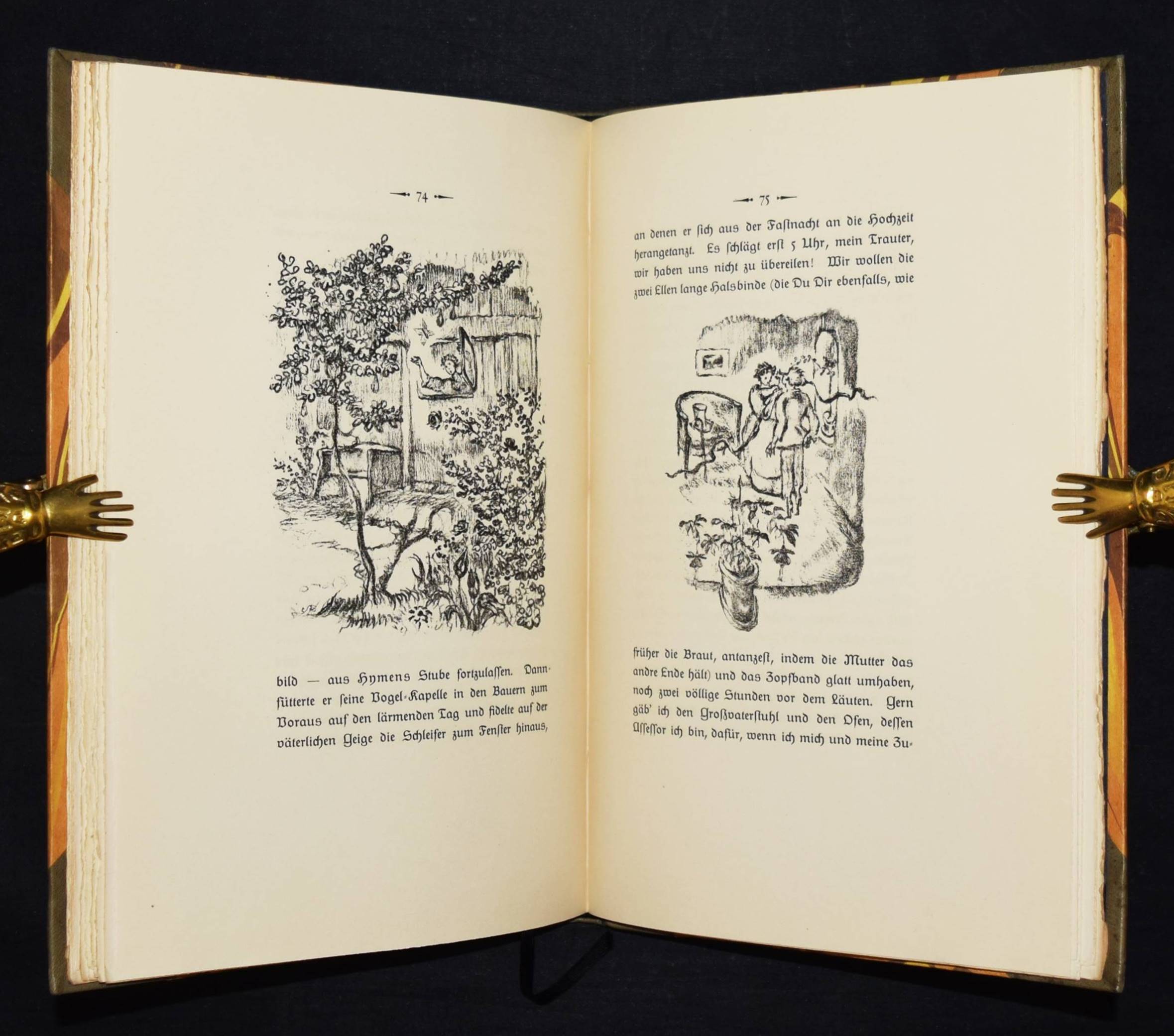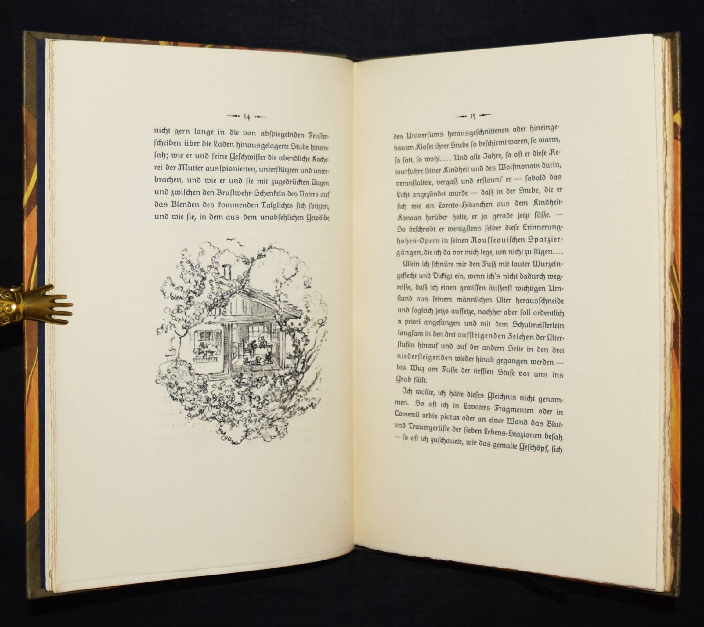 Jean Paul (d. i. Johann Paul Friedrich Richter). Leben des vergnügten Schulmeisterlein Maria Wuz in Auenthal. Eine Art Idylle. München, Hans v. Weber 1915. 4°. 109 S., [1] Bl. mit 60 (4 ganzs.) Orig.-Lithographien von Walo von May. Grauer Orig.-Halblederband mit goldgepr. Rückentitel, 5 unechten Bünden u. Kopfgoldschnitt (monogrammiert ″WFB″). (2. Dreiangeldruck). Rodenberg, 416, 2. Schauer II, 62. Sennewald 15. – Eines von 600 Exemplaren auf Van Gelder-Velin. – Einband geringfügig berieben, schönes Exemplar.