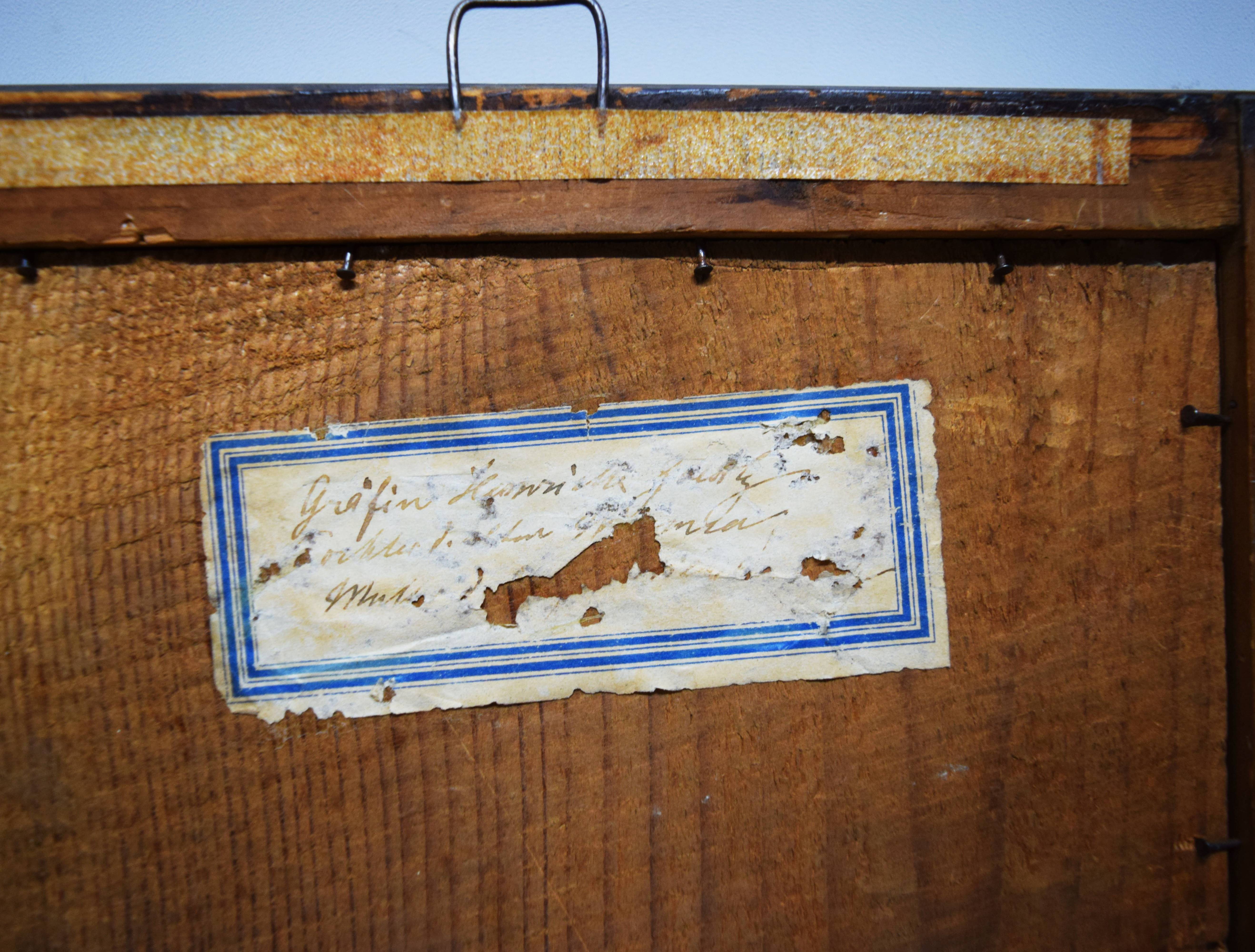 Scherenschnitt – Dame mit Kätzchen. Original-Scherenschnitt (ca. 15,5 x 14,5 cm.) auf hellbraunem Trägerpapier. O. O. u. J. um 1820. Unter Glas alt mit breiter schwarzer Leiste gerahmt (29 x 25 cm.). Dargestellt ist die junge Gräfin Karwick ? (laut unleserlicher Beschriftung auf der Rückseite des Rahmens), die mit ihrem Kätzchen auf einem Tisch spielt.
