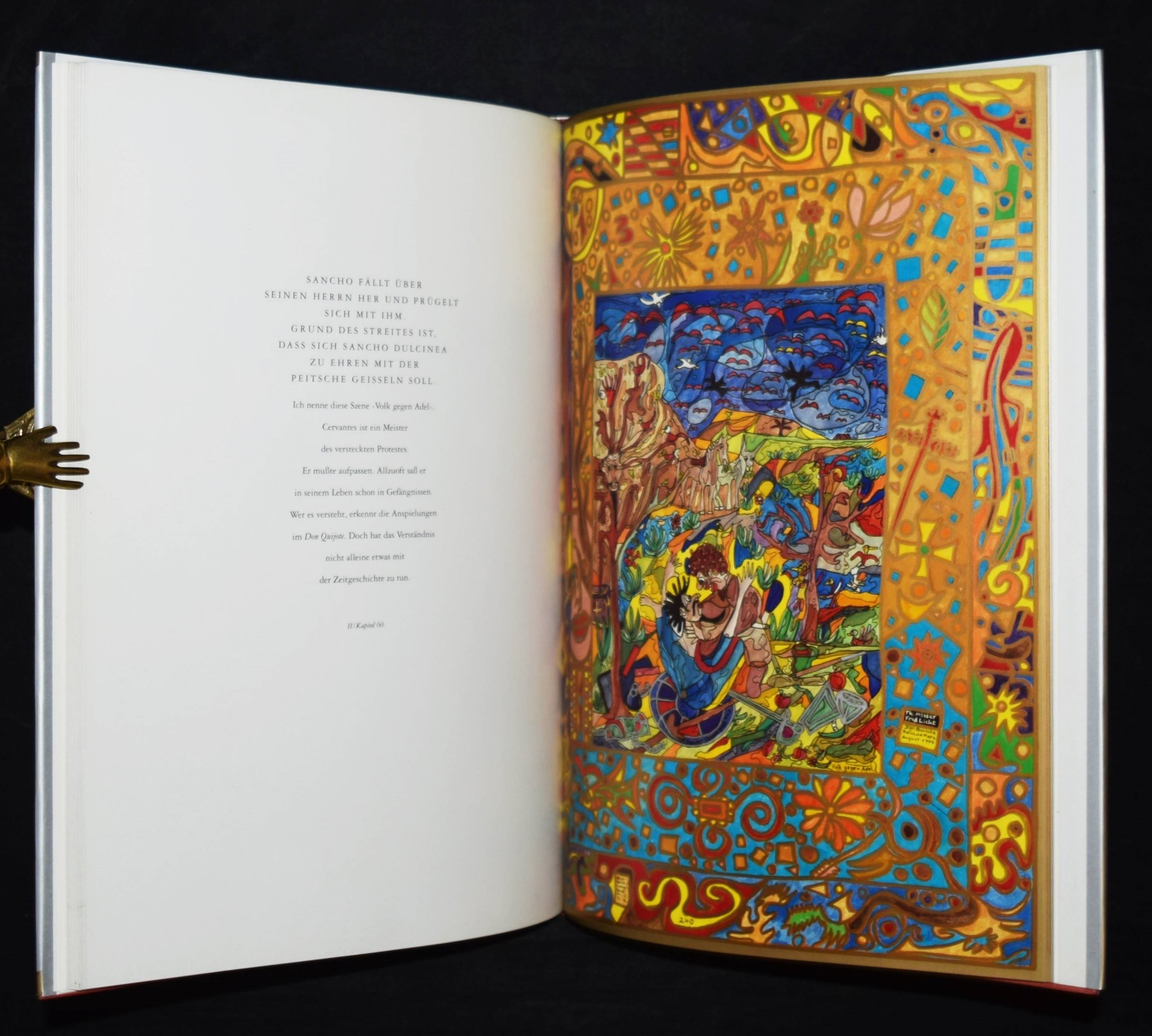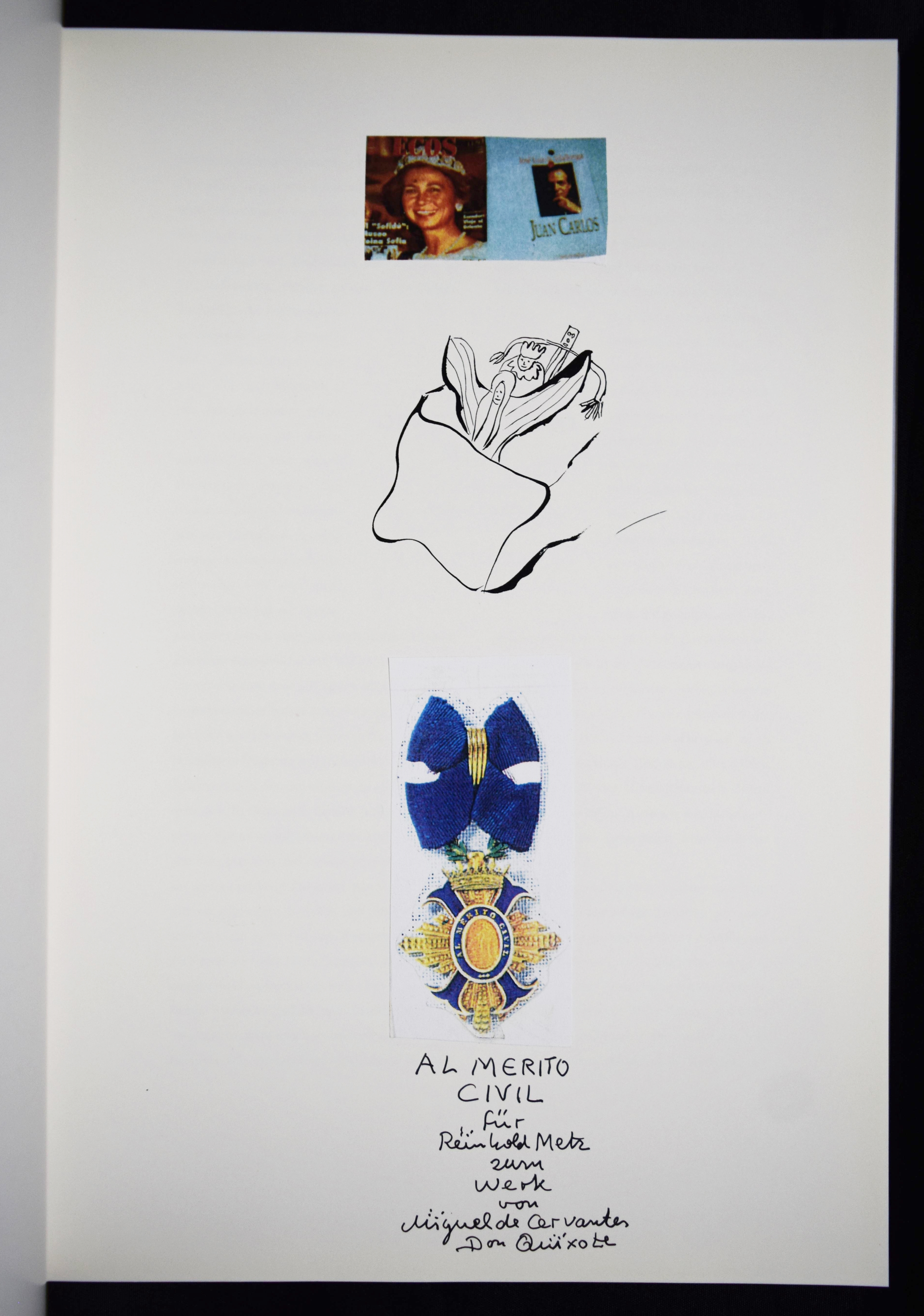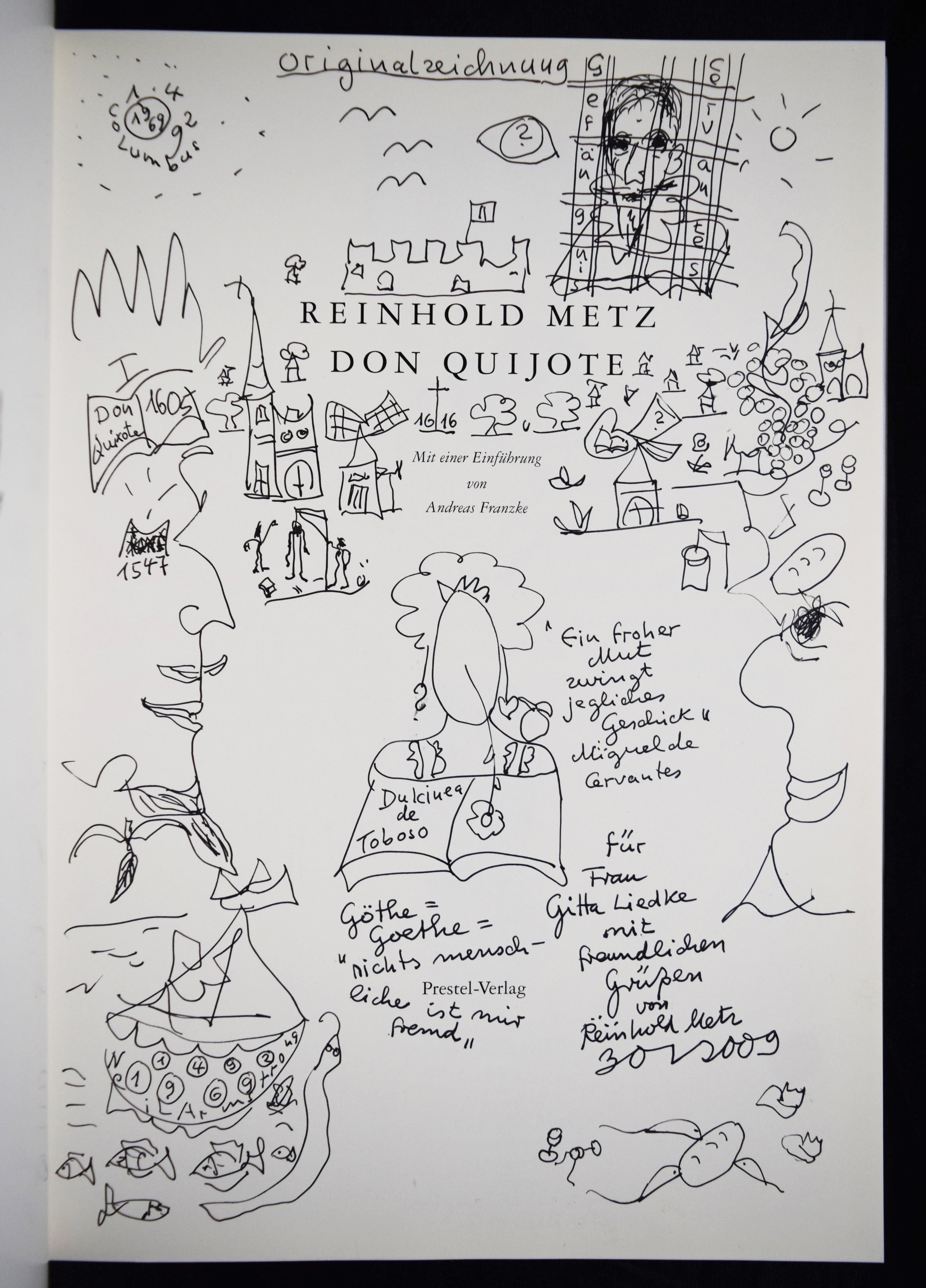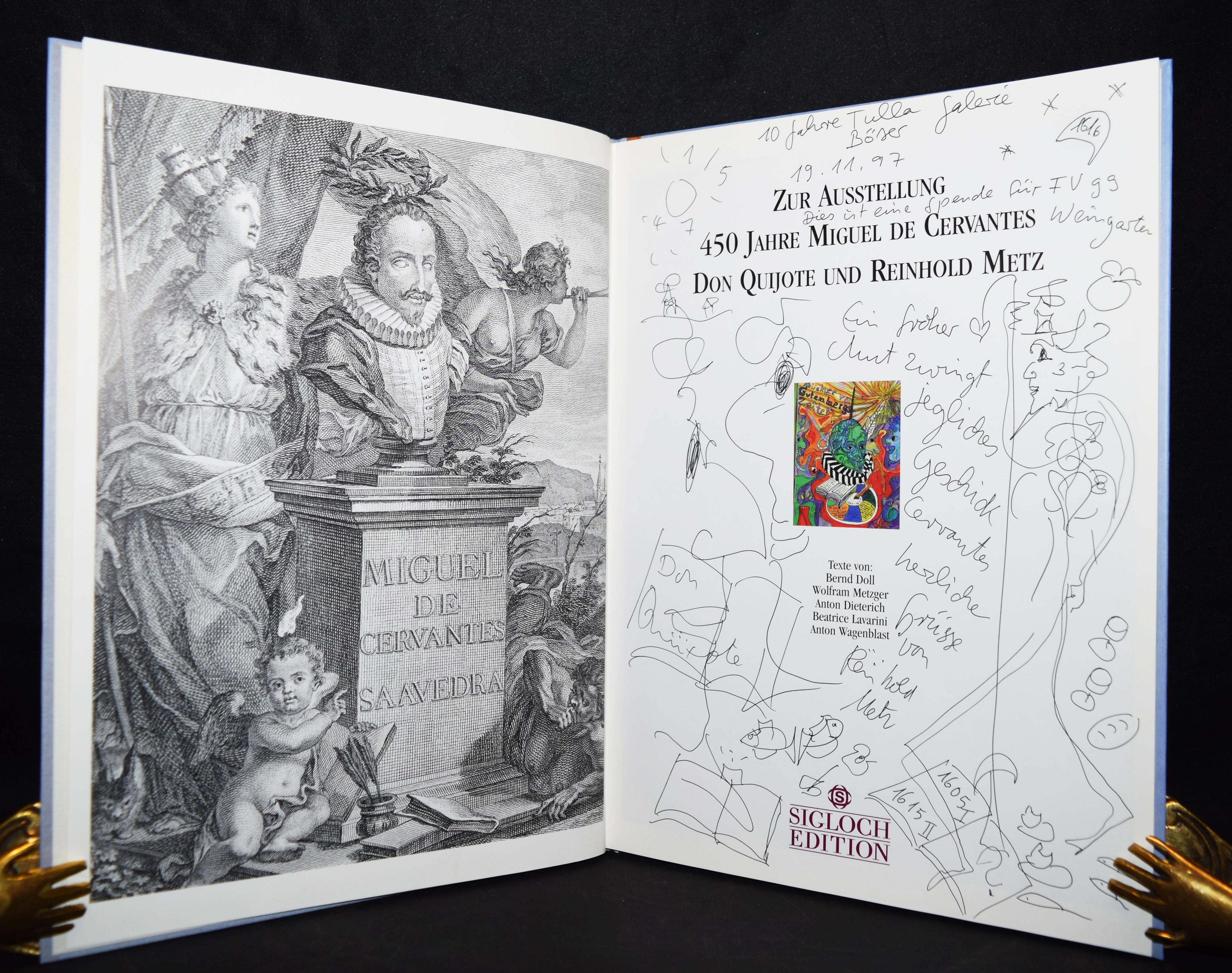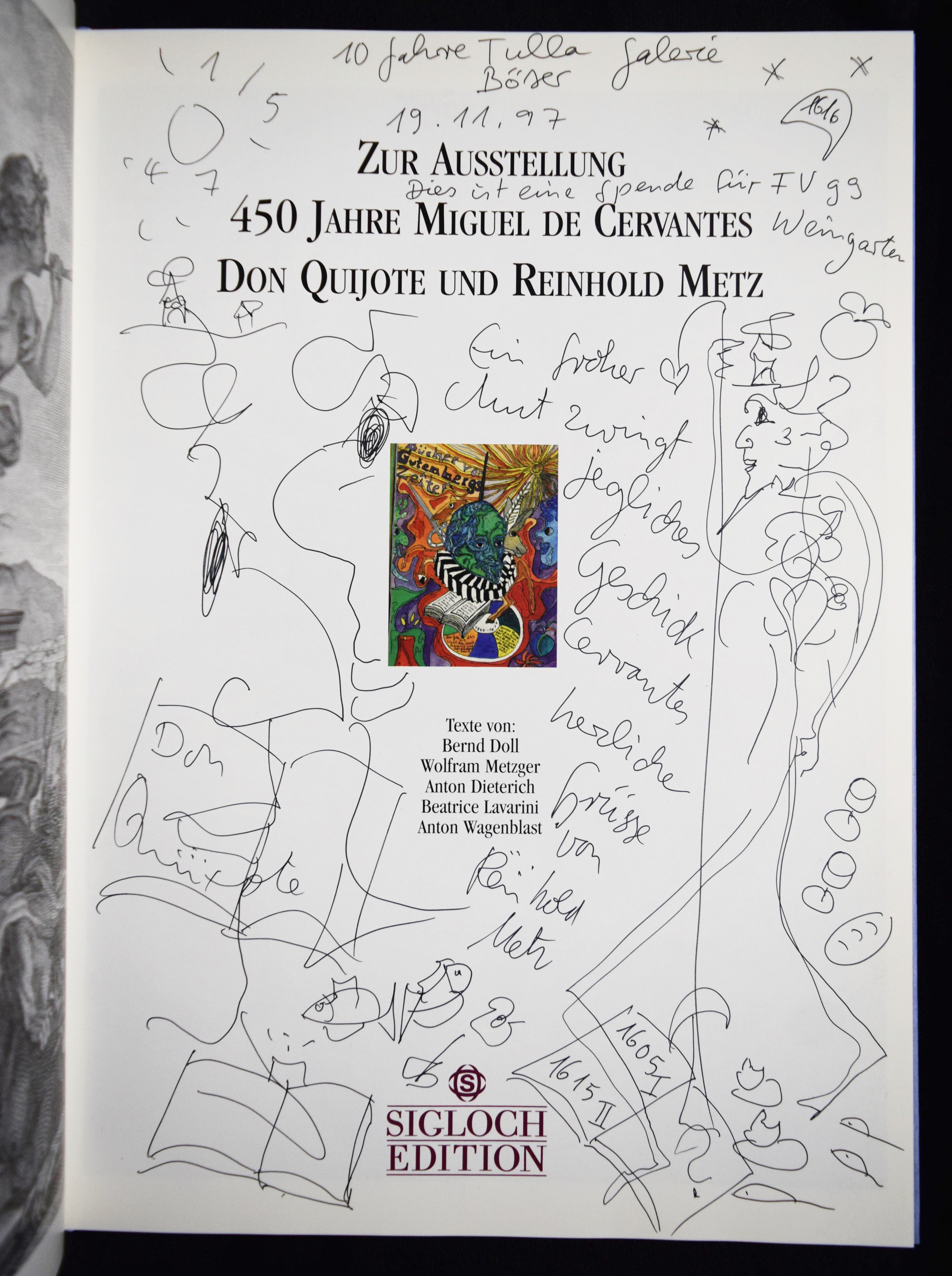 Metz, Reinhold. Don Quijote. [Ausgewählte „Buchmalbilder“, 1973-1991]. Mit einer Einführung von Andreas Franzke. (Und) Doll, Bernd, Wolfram Metzger, Anton Dieterich, Beatrice Lavarini u. Anton Wagenblast. Zur Ausstellung 450 Jahre Miguel de Cervantes Don Quijote und Reinhold Metz. 2 Bände. München, Prestel u. Künzelsau, Edition Sigloch (1991) u. (1997). 4°. 92 S. mit zahlr. farb. Abb.; 53, (1) S. mit zahlr. farb. Abb. Illustr. OPbd. mit farbig illustr. OU. u. farbig illustr. OPbd. Beide Bände mit längerer eigenhändiger Widmung und Zeichnungen von R. Metz auf dem Titelblatt. – Der Maler, Zeichner und Aquarellist R. Metz (geb. 1942 in Durlach) widmet sich seit 1972 dem Thema „Don Quixote“, seitdem sind tausende von Zeichnungen, Malbriefen und phantastische Aquarelle entstanden. Seine Werke wurden in Lausanne, Venedig, Madrid, Los Angeles, Prag und in Neuseeland ausgestellt.