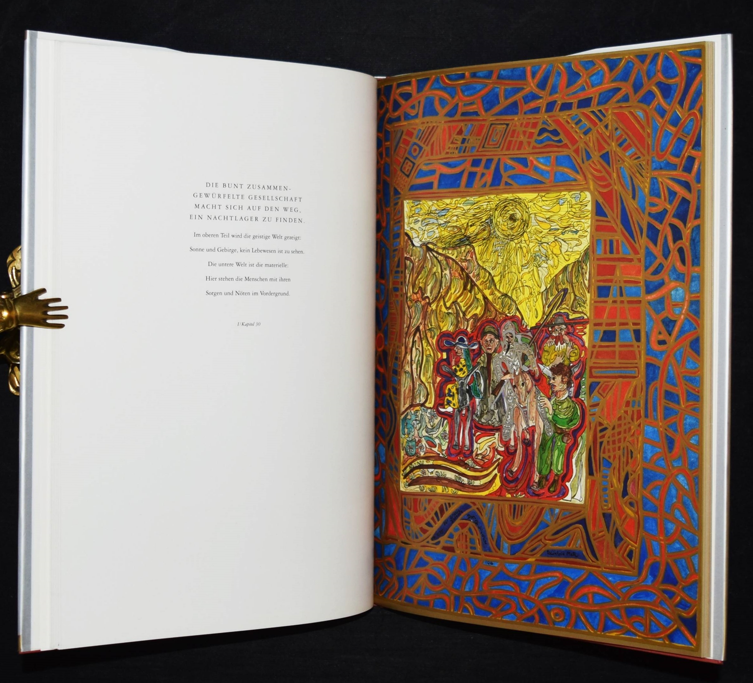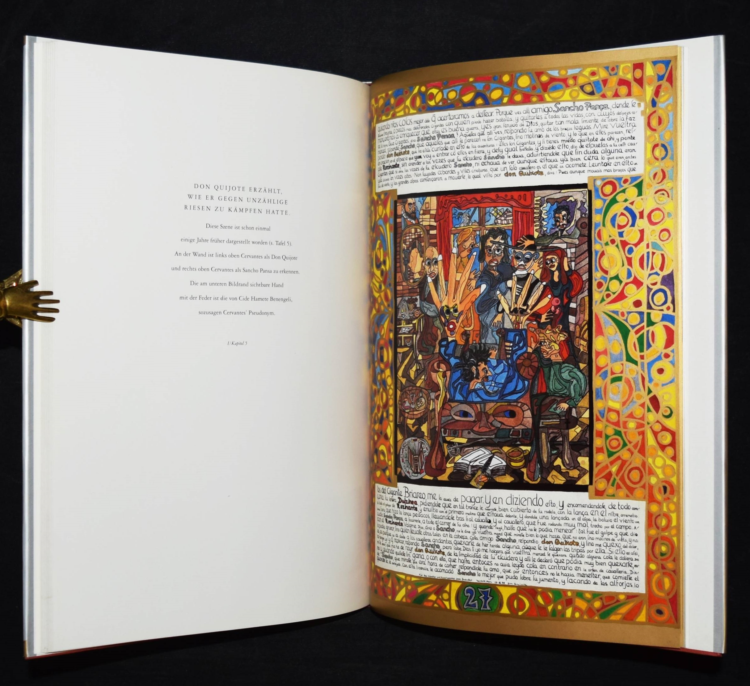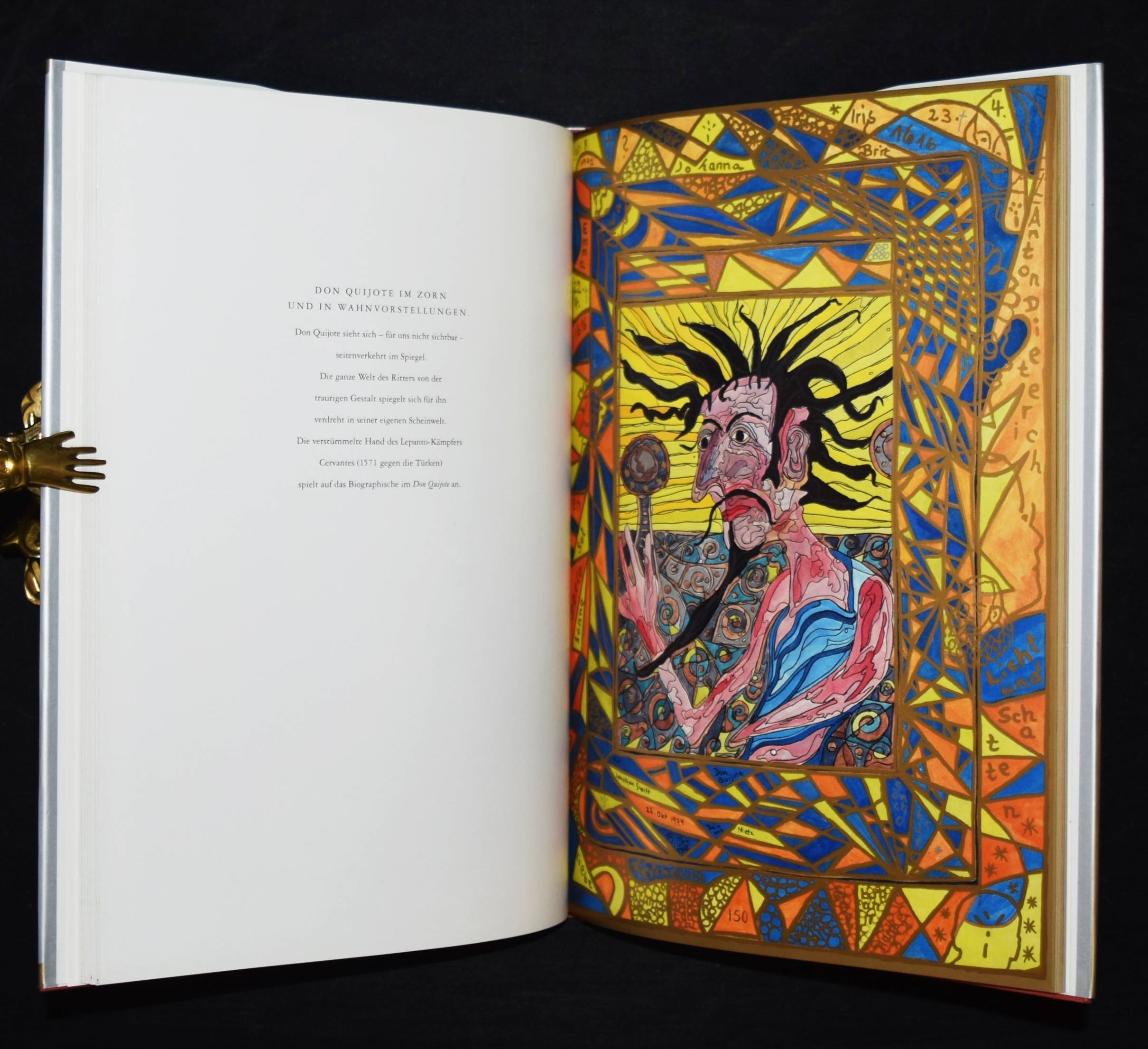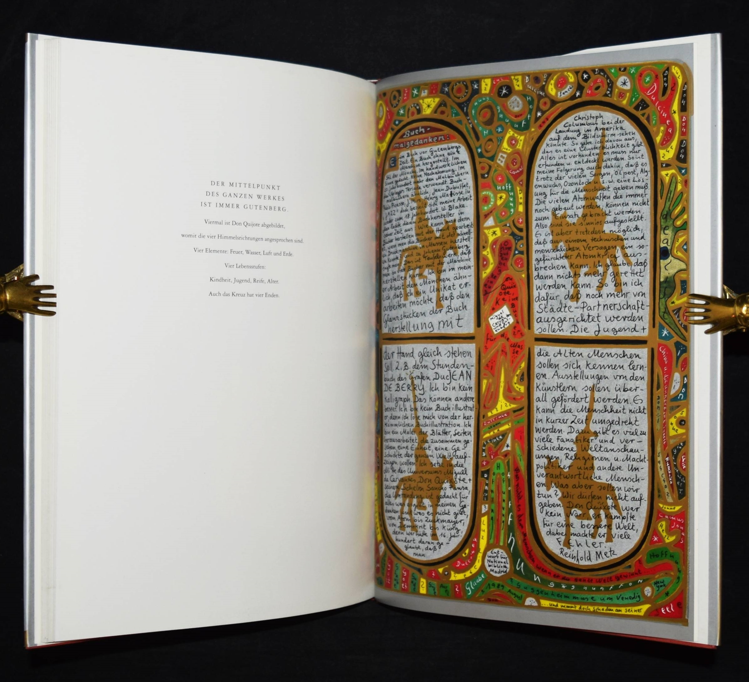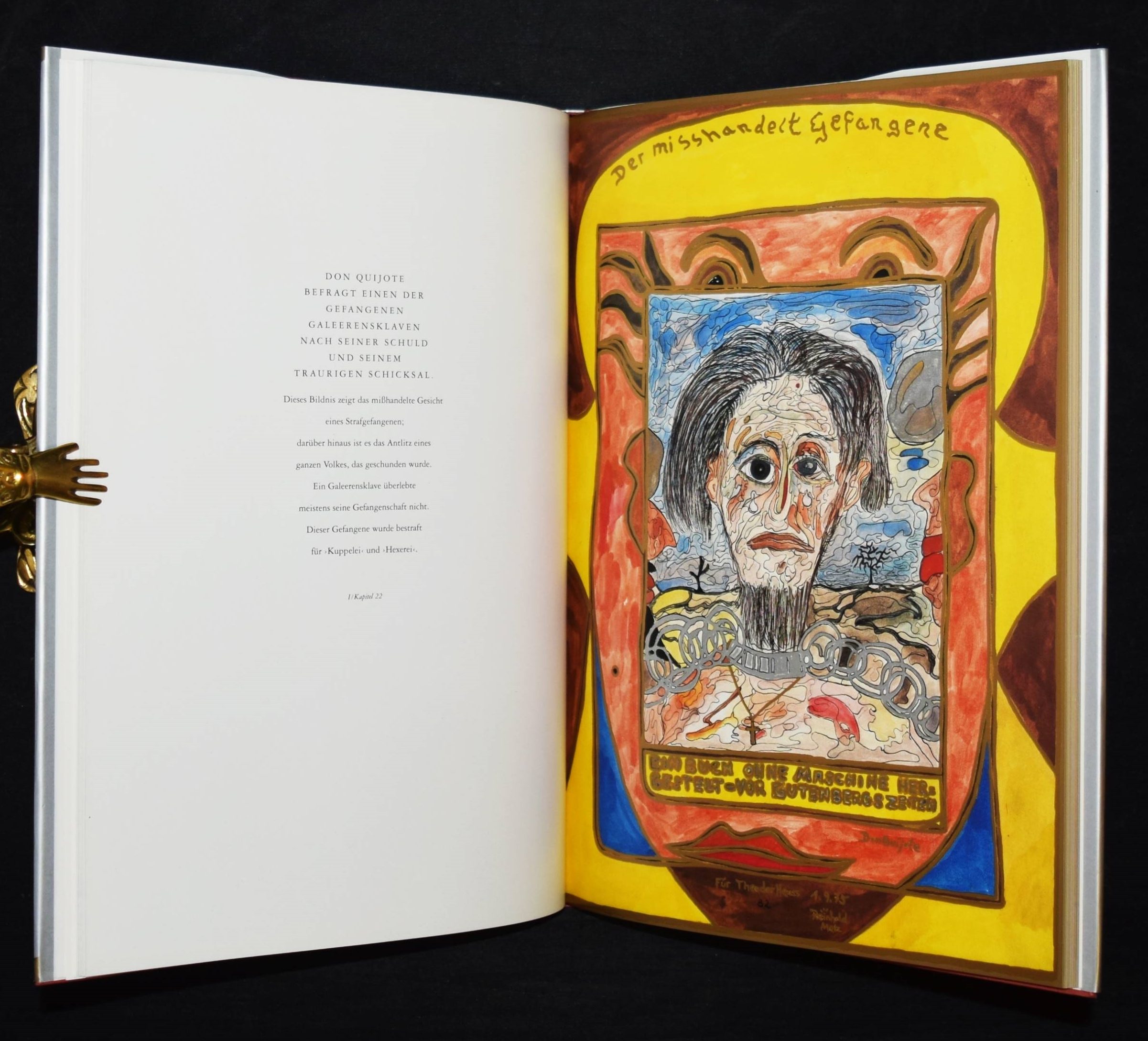 Metz, Reinhold. Don Quijote. [Ausgewählte „Buchmalbilder“, 1973-1991]. Mit einer Einführung von Andreas Franzke. (Und) Doll, Bernd, Wolfram Metzger, Anton Dieterich, Beatrice Lavarini u. Anton Wagenblast. Zur Ausstellung 450 Jahre Miguel de Cervantes Don Quijote und Reinhold Metz. 2 Bände. München, Prestel u. Künzelsau, Edition Sigloch (1991) u. (1997). 4°. 92 S. mit zahlr. farb. Abb.; 53, (1) S. mit zahlr. farb. Abb. Illustr. OPbd. mit farbig illustr. OU. u. farbig illustr. OPbd. Beide Bände mit längerer eigenhändiger Widmung und Zeichnungen von R. Metz auf dem Titelblatt. – Der Maler, Zeichner und Aquarellist R. Metz (geb. 1942 in Durlach) widmet sich seit 1972 dem Thema „Don Quixote“, seitdem sind tausende von Zeichnungen, Malbriefen und phantastische Aquarelle entstanden. Seine Werke wurden in Lausanne, Venedig, Madrid, Los Angeles, Prag und in Neuseeland ausgestellt.