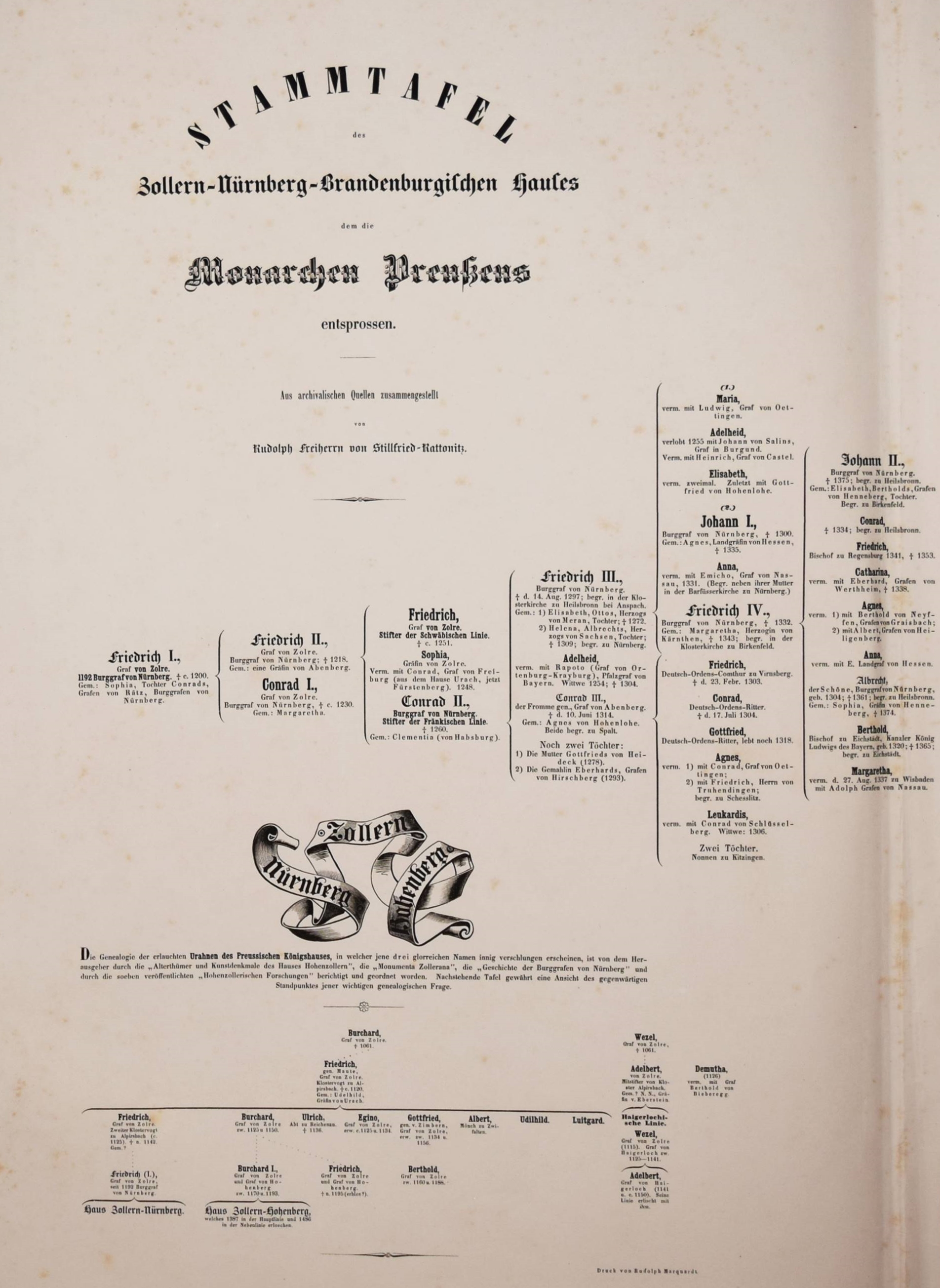 Stillfried-Alcantara, Rudolf Maria Bernhard von. Preussens Monarchen. Sieben nach den besten Original-Gemaelden lithographirte Bilder nebst historischer Einleitung. (Aus archivalischen Quellen zusammengestellt). Berlin, Carl Reimarus (Gropius’sche Buchhandlung) 1847. Imperial-Folio (59 x 45 cm.). [3] Bl. u. 6 (statt 7) lithogr. Portraits u. 1 mehrfach gefalt. „Stammtafel des Zollern-Nürnberg-Brandenburgischen Hauses dem die Monarchen Preußens entsprossen“. OHln. mit Deckel-Wappen. Seltenes Porträtwerk. – Deckel angestaubt, die Tafeln lose, 2 Tafeln mit Randläsuren, stellenweise etwas braunfleckig, sonst gut erhalten.