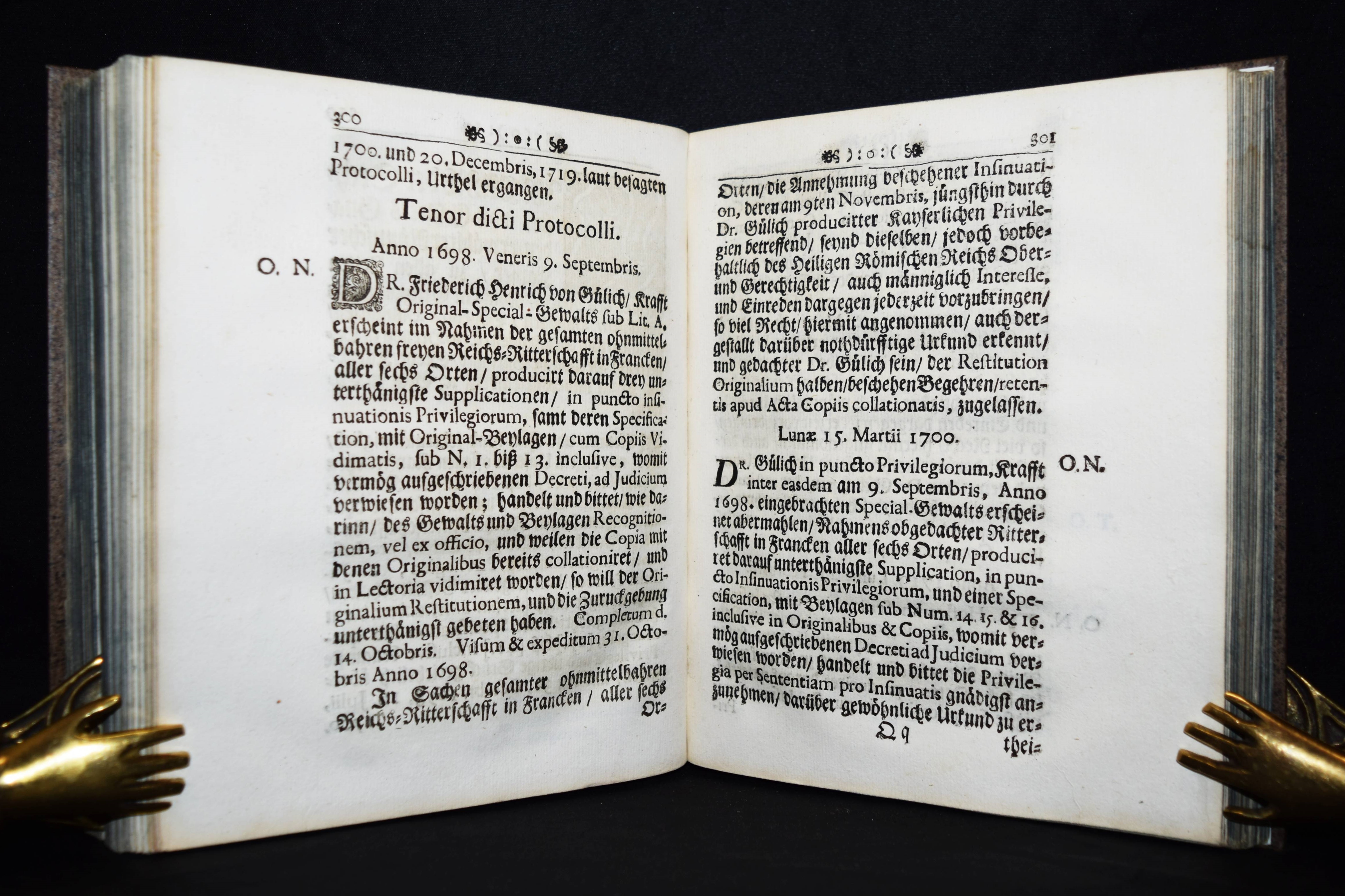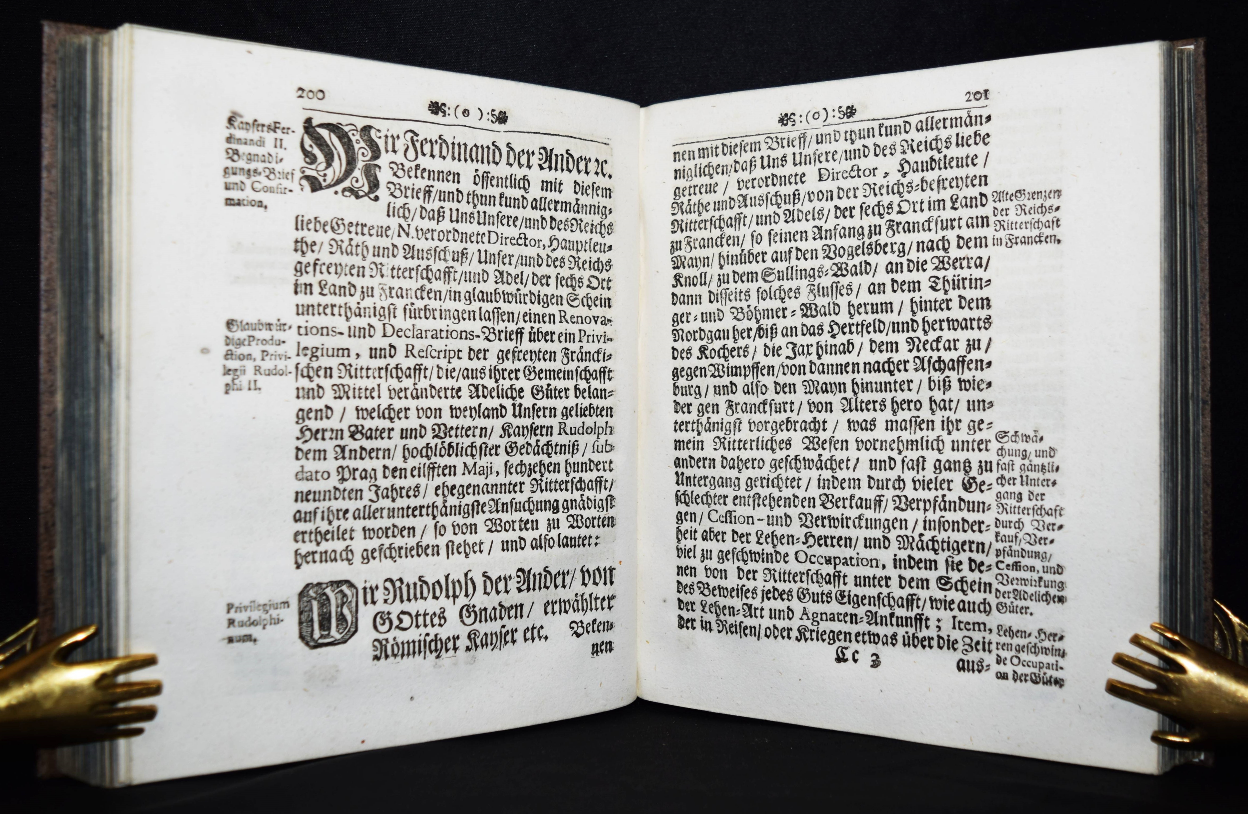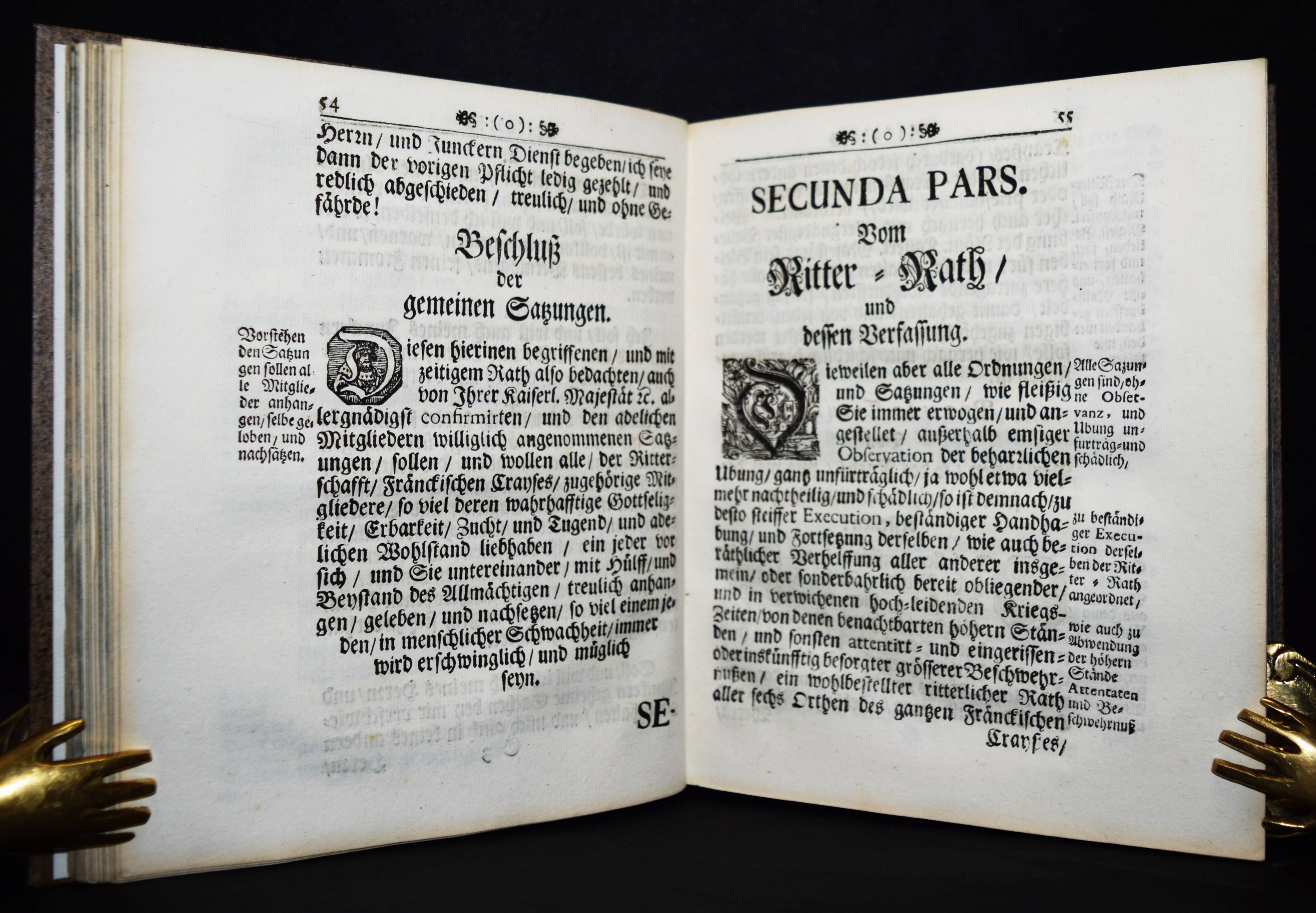 (Burgermeister, Johann Sephan). Des Heiligen Römischen Reichs ohnmittelbahr-freyer Ritterschafft, der sechs Ort in Francken erneuert-, vermehrt- und confirmirte Ordnungen, samt deroselben … Privilegien, und Befreyungs-Brieffen, auch Kayserlichen Rescripten. (Nürnberg) 1720. Gr.-8°. 331 (recte: 339), 20 S., [20] Bl. mit gestochenem Frontispiz, 1 gefalteten Kupfertafel, gestochener Kopfvignette und Holzschnittvignetten. Moderner Pbd. Pfeiffer 15471. VD18 14692880. – Nach Pfeiffer die fünfte und vorletzte Ausgabe, gegenüber der ersten Auflage von 1645 stark erweitert. Enthält außer den Satzungen und Ordnungen die der Reichsritterschaft im Ritterkreis Franken gewährten Privilegien und Befreiungsbriefe sowie Verträge mit anderen Reichsständen. Mit dem Anhang „verschiedener Kayserl. Mandaten, die Differentien zwischen dem Stifft Fulda, und der Reichs-freyen Ritterschafft in Francken, Buchischen Viertels, betreffend“. – Der in Geislingen geborene, vielseitig gebildete Jurist wirkte als Rechtskonsulent, Syndikus der Reichsritterschaft und kayserlicher Rat in Ulm. – „Er war der eifrigste Vertheidiger der Privilegien der freien Reichsritterschaft. Diesen Gegenstand betreffen fast alle seine, deutsch abgefaßten Schriften“ (ADB III, 601). – Die gefaltete Tafel mit restauriertem Einriss und etwas fleckig, sonst sehr gutes und sauberes Exemplar.