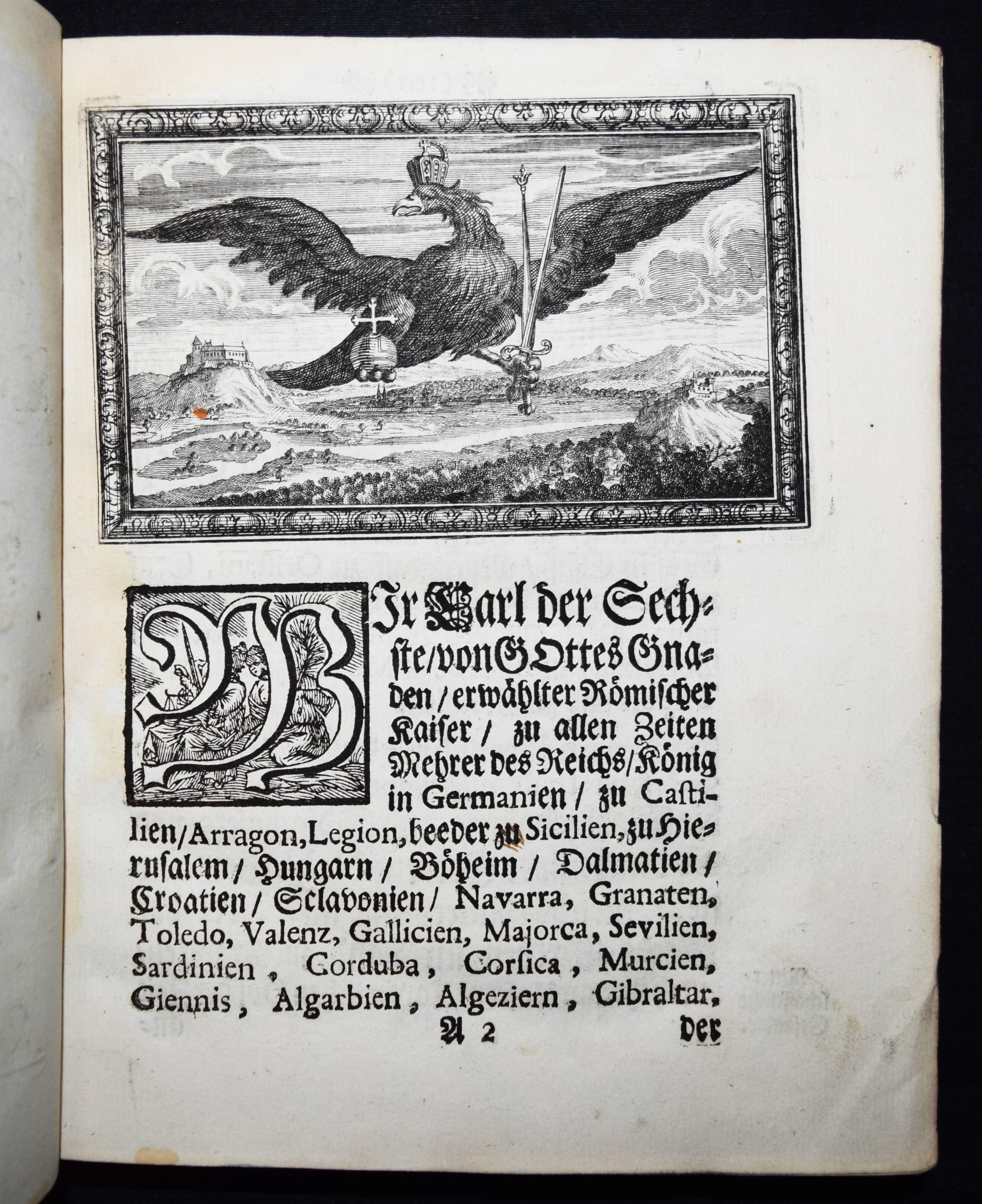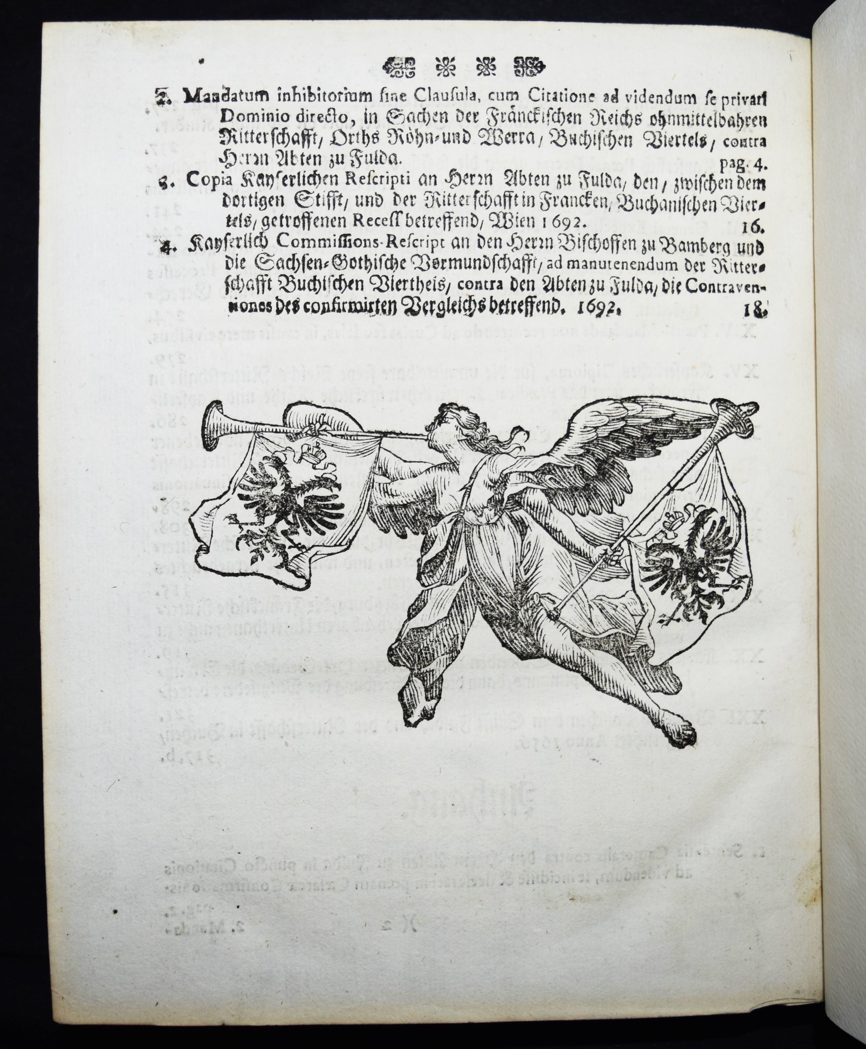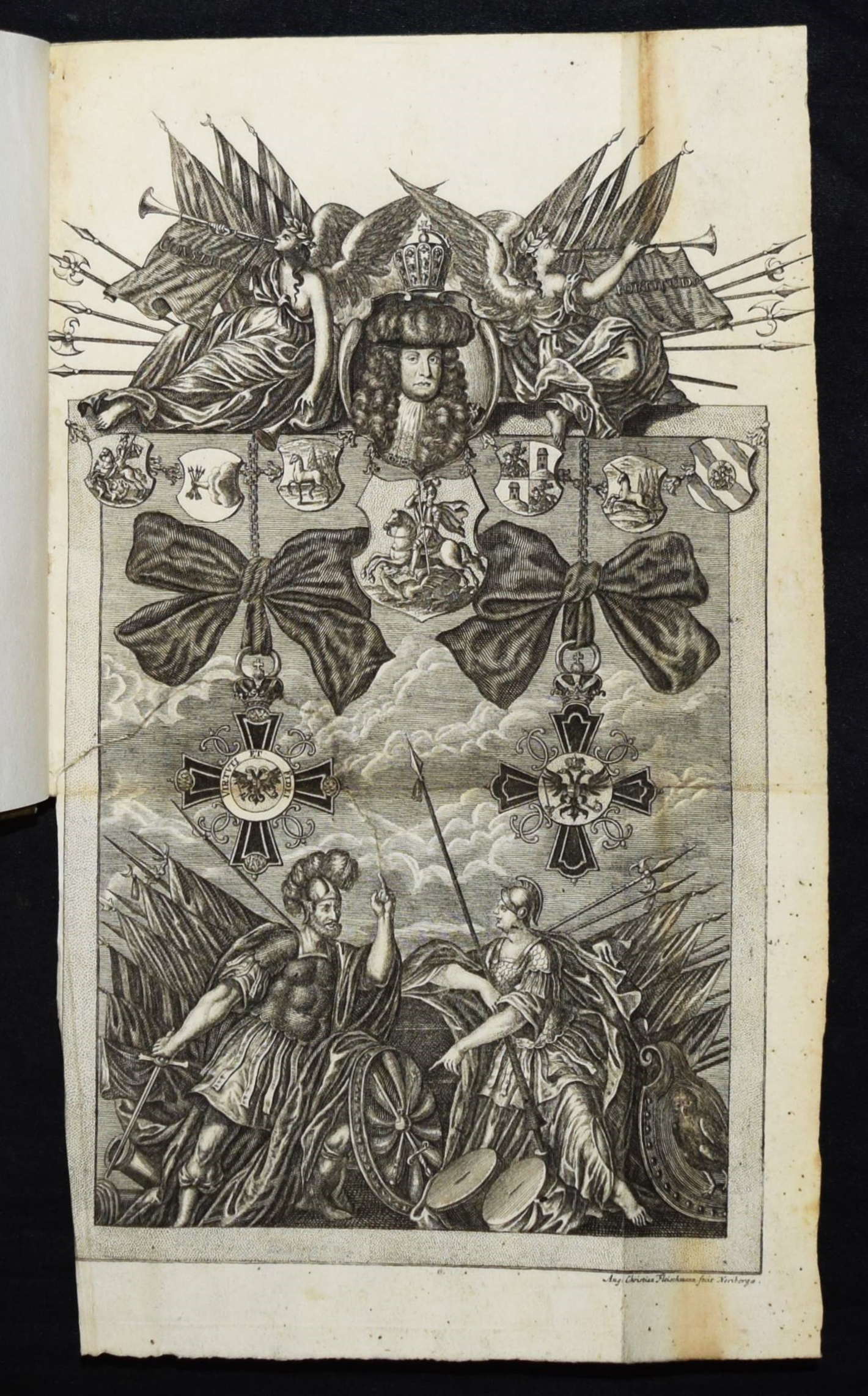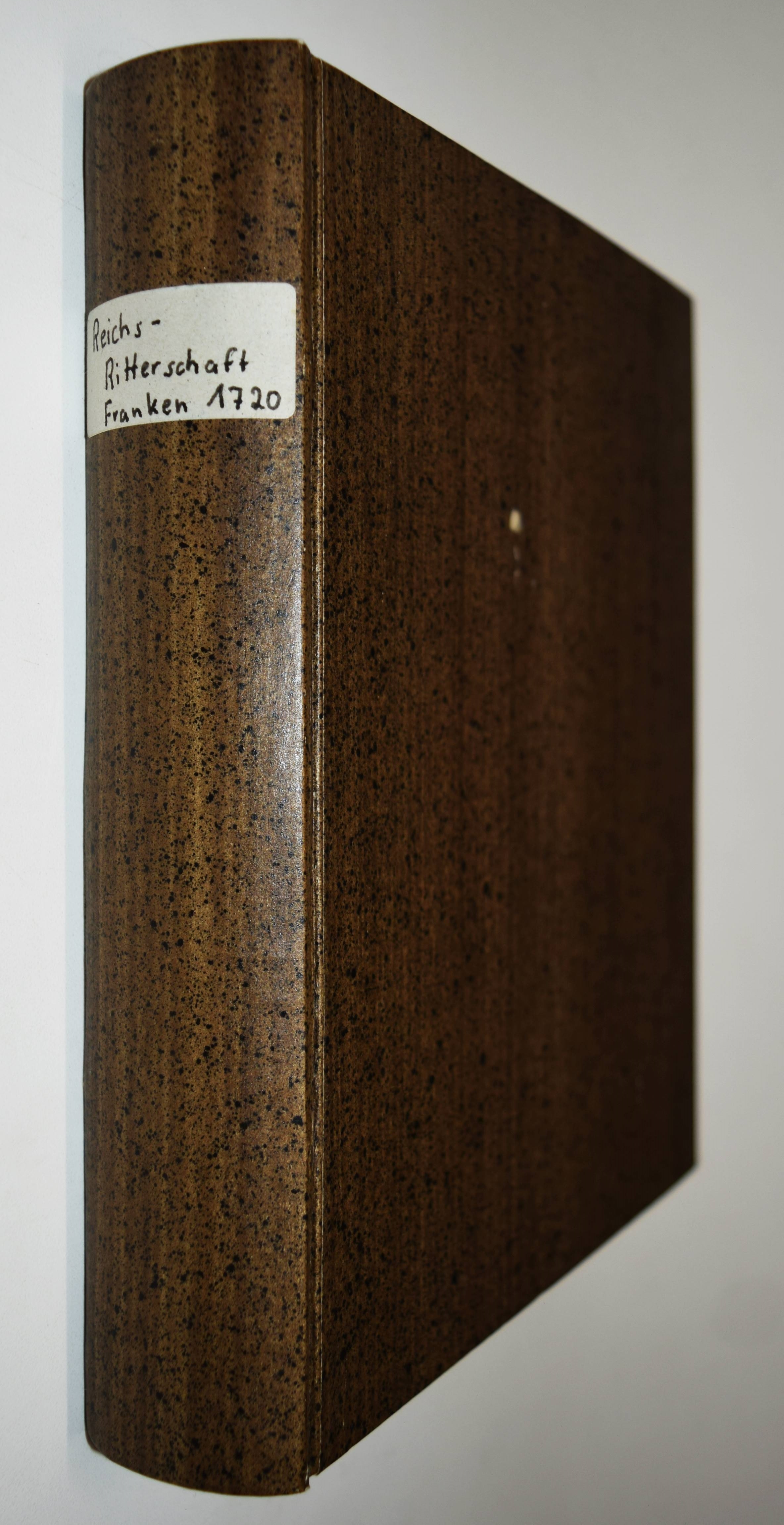 (Burgermeister, Johann Sephan). Des Heiligen Römischen Reichs ohnmittelbahr-freyer Ritterschafft, der sechs Ort in Francken erneuert-, vermehrt- und confirmirte Ordnungen, samt deroselben … Privilegien, und Befreyungs-Brieffen, auch Kayserlichen Rescripten. (Nürnberg) 1720. Gr.-8°. 331 (recte: 339), 20 S., [20] Bl. mit gestochenem Frontispiz, 1 gefalteten Kupfertafel, gestochener Kopfvignette und Holzschnittvignetten. Moderner Pbd. Pfeiffer 15471. VD18 14692880. – Nach Pfeiffer die fünfte und vorletzte Ausgabe, gegenüber der ersten Auflage von 1645 stark erweitert. Enthält außer den Satzungen und Ordnungen die der Reichsritterschaft im Ritterkreis Franken gewährten Privilegien und Befreiungsbriefe sowie Verträge mit anderen Reichsständen. Mit dem Anhang „verschiedener Kayserl. Mandaten, die Differentien zwischen dem Stifft Fulda, und der Reichs-freyen Ritterschafft in Francken, Buchischen Viertels, betreffend“. – Der in Geislingen geborene, vielseitig gebildete Jurist wirkte als Rechtskonsulent, Syndikus der Reichsritterschaft und kayserlicher Rat in Ulm. – „Er war der eifrigste Vertheidiger der Privilegien der freien Reichsritterschaft. Diesen Gegenstand betreffen fast alle seine, deutsch abgefaßten Schriften“ (ADB III, 601). – Die gefaltete Tafel mit restauriertem Einriss und etwas fleckig, sonst sehr gutes und sauberes Exemplar.