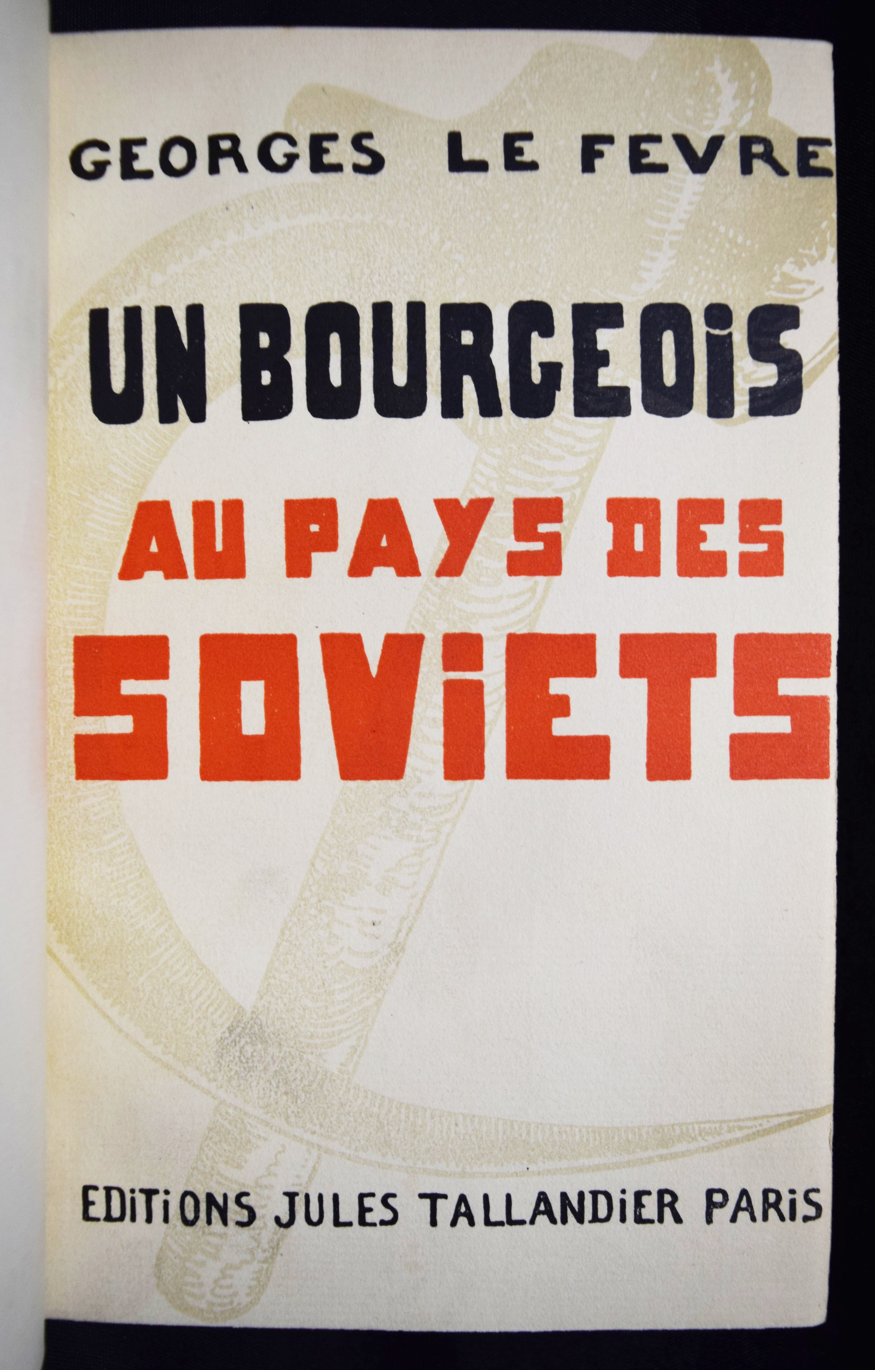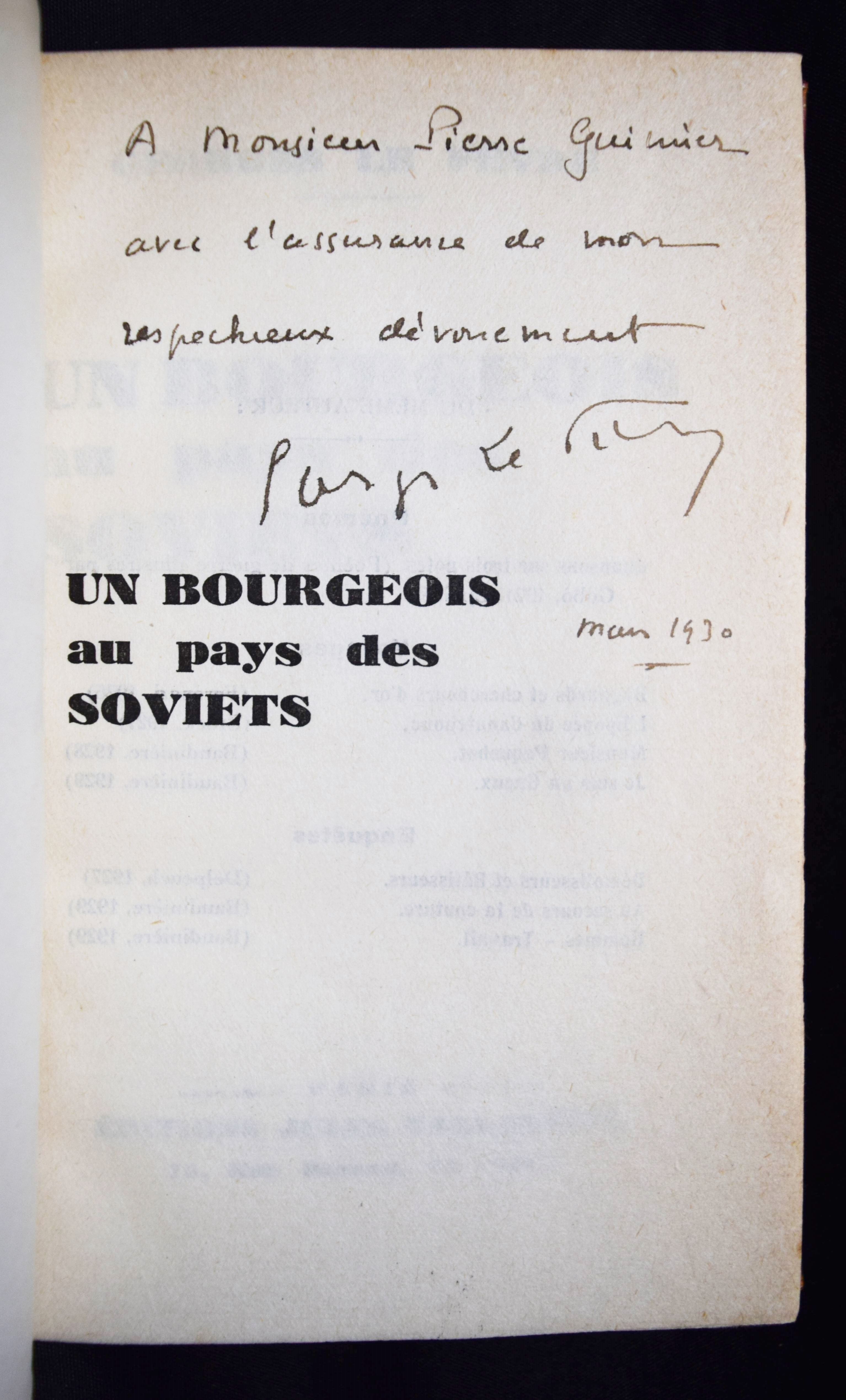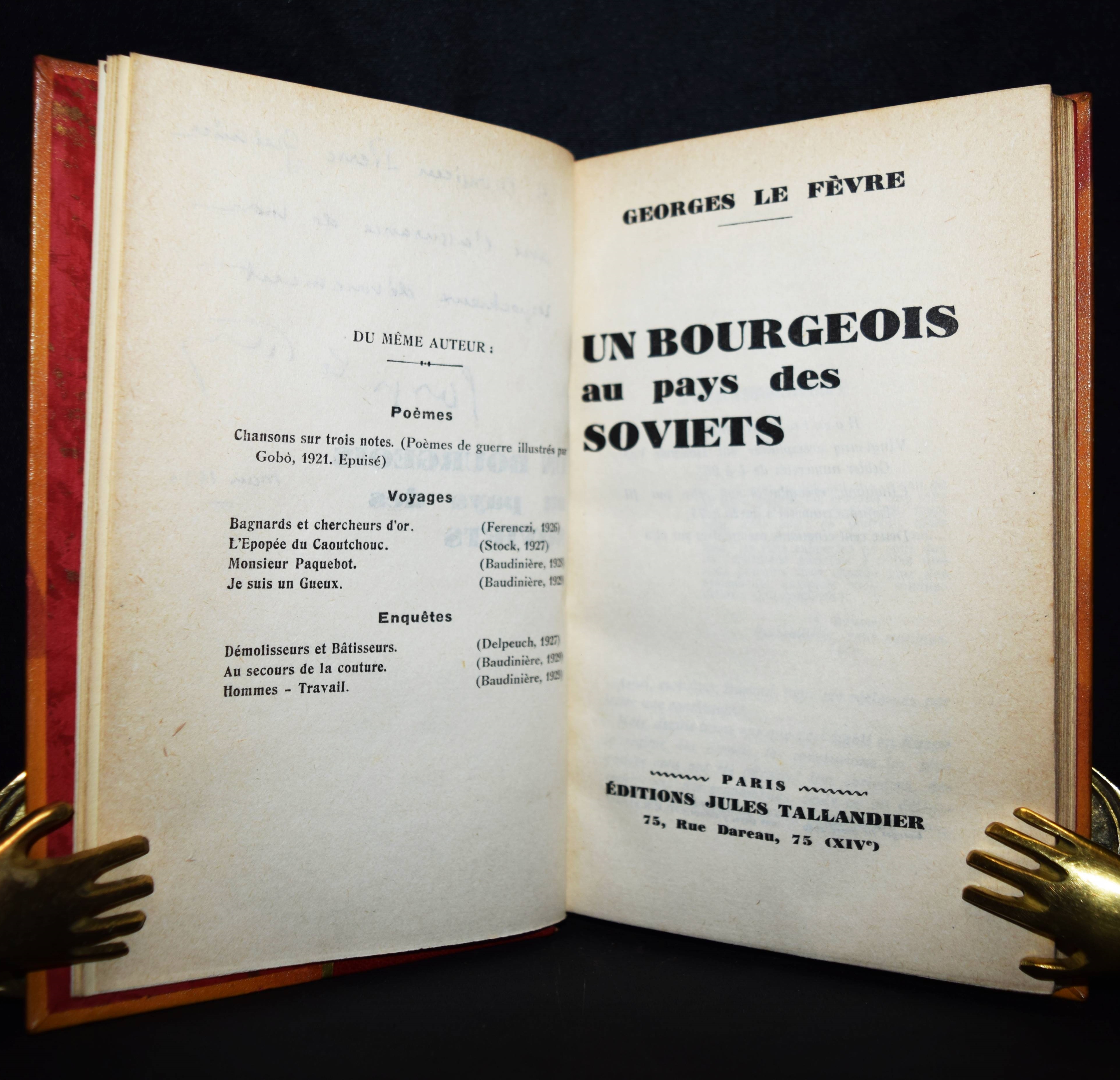 Le Fèvre, Georges. Un bourgeois au pays des Soviets. Paris, Éditions Jules Tallandier (1929). 8°. 256 S. Weinroter Hldr. d. Zt. mit goldgepr. Rückentitel (illustr. Orig.-Umschlag beigebunden). Erste Ausgabe. – Mit eigenhändiger Widmung von G. Le Fevre „A monsieur Pierre Guimier avec l’assurance … George Le Fevre“. – Der franz. Journalist und Historiker G. Le Fevre (1892-1968) wurde international bekannt als Teilnehmer und Chronist der Citroen-Zentralasien-Expedition (″La croisière jaune“). 1932 wurde er als Ritter der Ehrenlegion ausgezeichnet. – Der Widmungsempfänger P. Guimier (1887-1956) war seit 1934 Chef-Redakteur von „Le Journal“. – Schönes dekorativ gebundenes Exemplar.