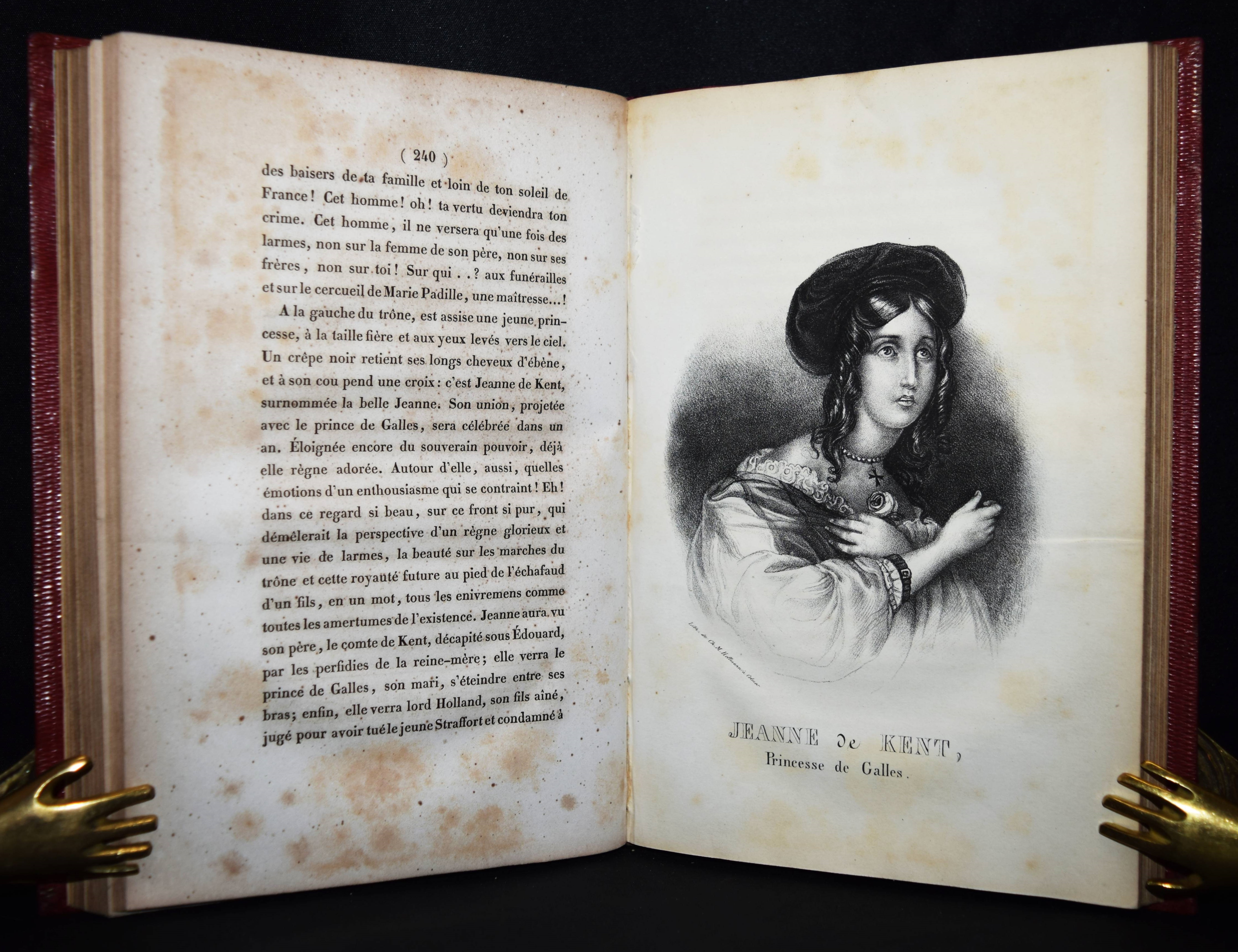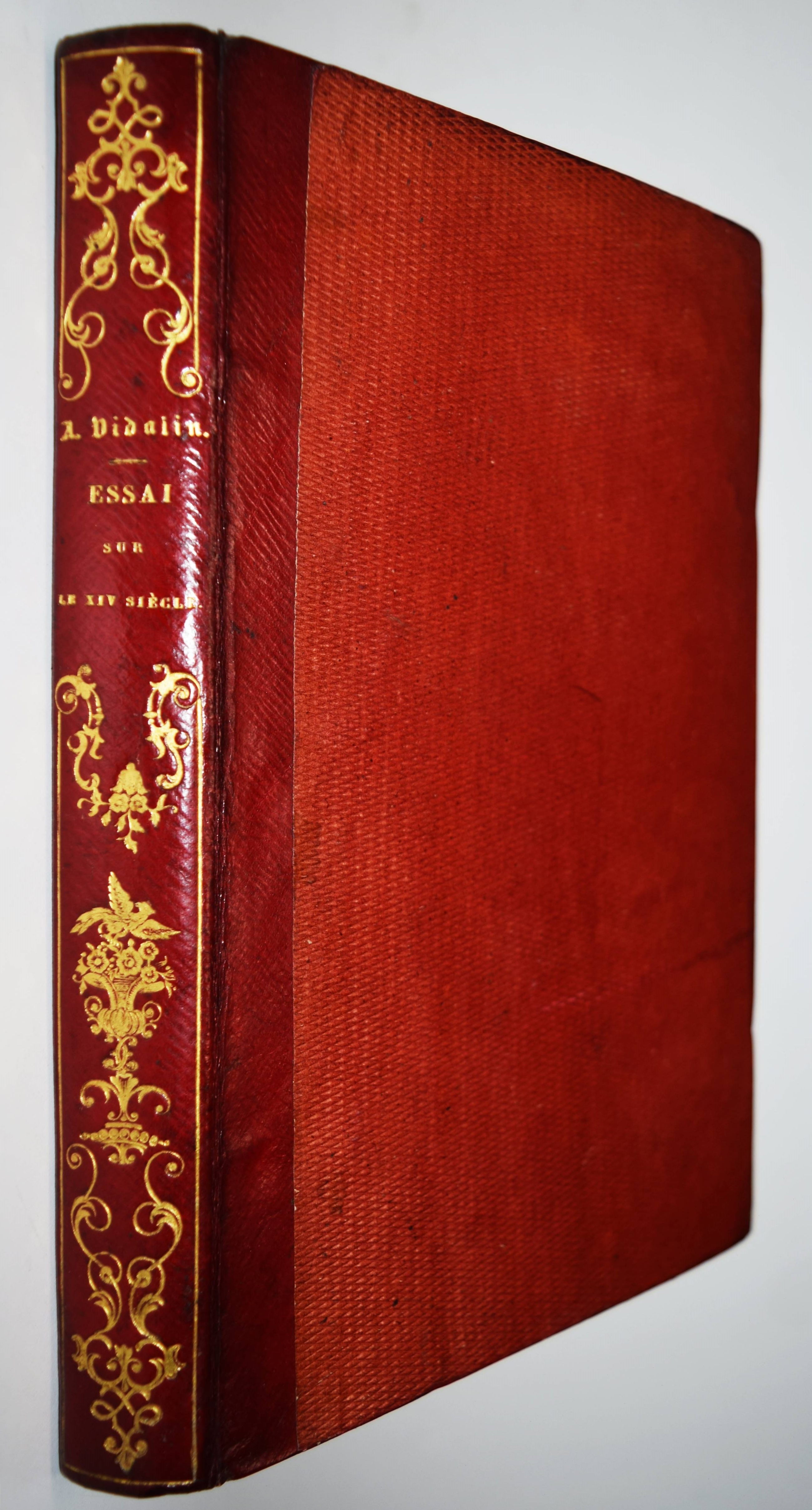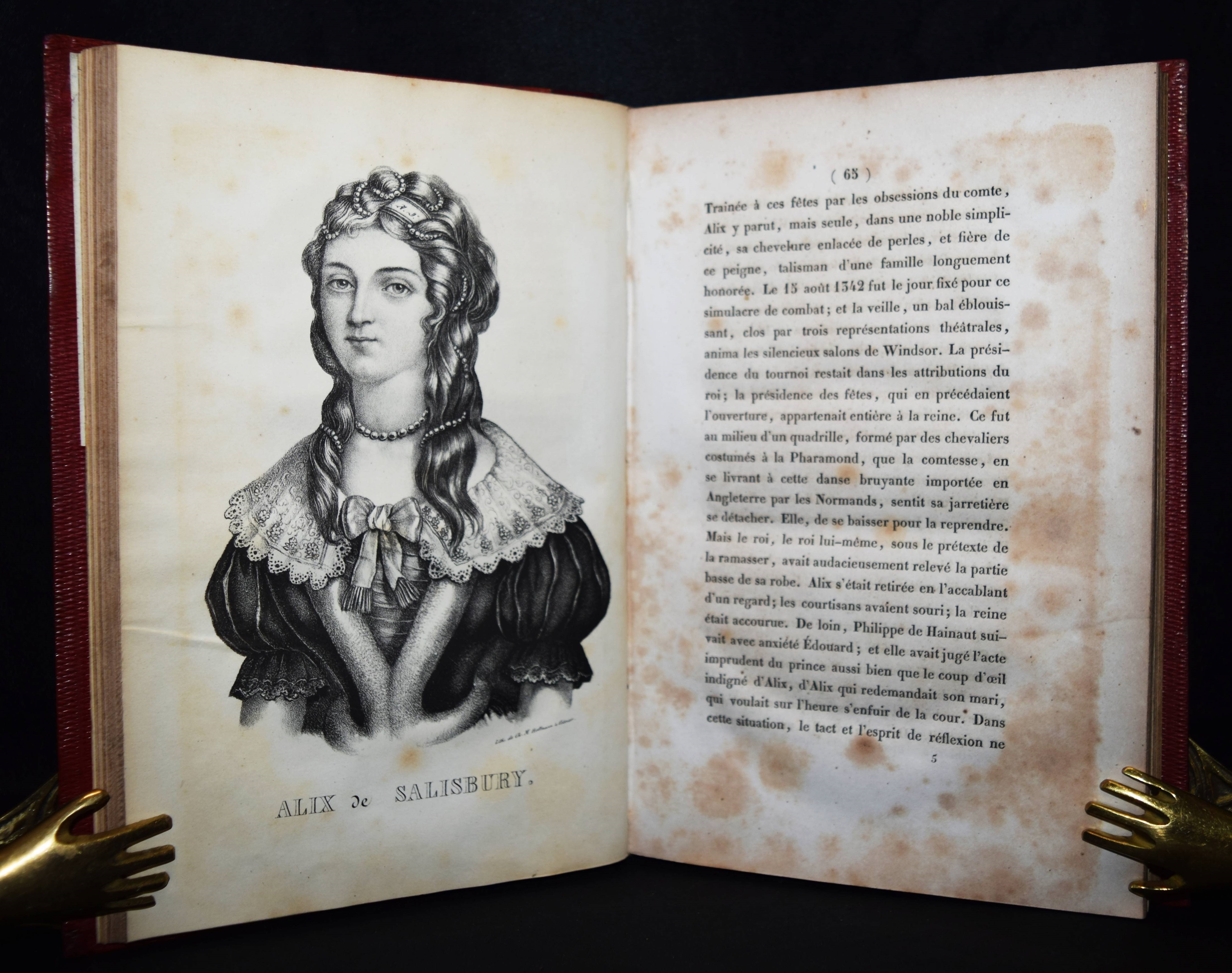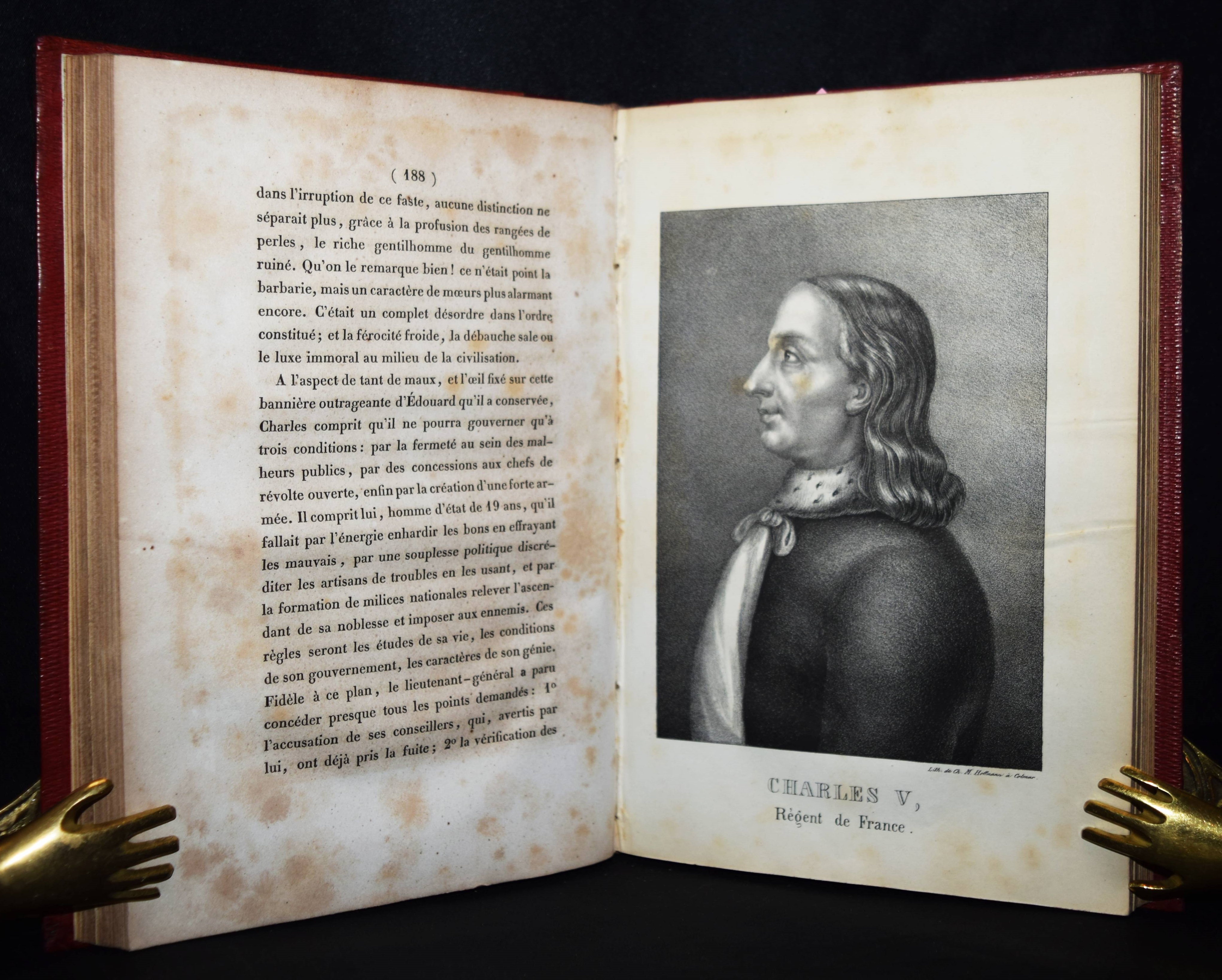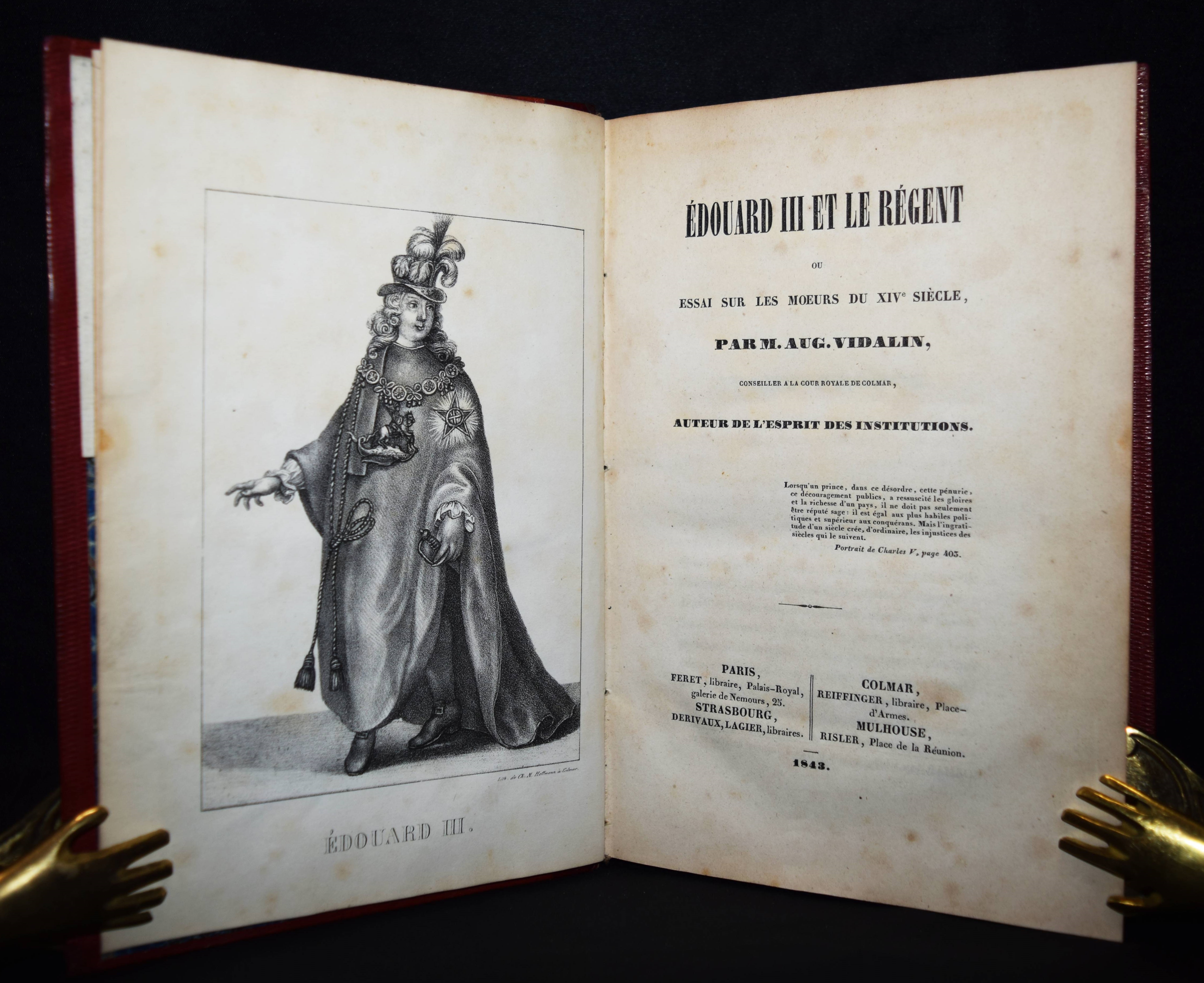 Edward III., König von England – Vidalin, Aug(uste). Edouard III et le régent, ou essai sur les moeurs du XIVè siècle. Paris, Colmar, Strasbourg, Mulhouse, Feret, Reiffinger, Derivoux, Lagier, Risler 1843. Gr.-8°. XIX, (1), 406 S. mit lithogr. Frontispiz u. 3 lithogr. Portraits. Weinroter Hldr. d. Zt. mit goldgepr. Rückentitel u. Romantikervergoldung. Erste Ausgabe. – Wichtige Biographie des franz. Historikers Jean Auguste Vidalin (1797-1861). – Mit Portraits von Edward III., Alix de Salisbury, Charles V., König von Frankreich und Jeanne de Kent. – „König Eduard III. (1312–1377) gilt als einer der bedeutendsten Herrscher des englischen Mittelalters. Nicht nur weil er sein Land während seiner 50-jährigen Herrschaft zu einer leistungsfähigen Militärmacht ausbaute, mit der er 1337 den Hundertjährigen Krieg gegen Frankreich eröffnete. Sondern Eduard fand auch Mittel und Wege, den Adel Englands für das große Ziel zu begeistern: den französischen Thron zu gewinnen, auf den Eduard als Enkel Philipps IV. belastbare Ansprüche geltend machen konnte. Denn dessen Nachfolger Karl IV. war ohne männlichen Erben verstorben“ (M. Dannoritzer in Die Welt am 1. 2. 2021). – Durchgehend teils stärker stockfleckig, gestoch. Wappen-Exlibris „Jean Baptis. Peyer im Hoff Seigneur de Fontenelle“, schönes dekorativ gebundenes Exemplar.