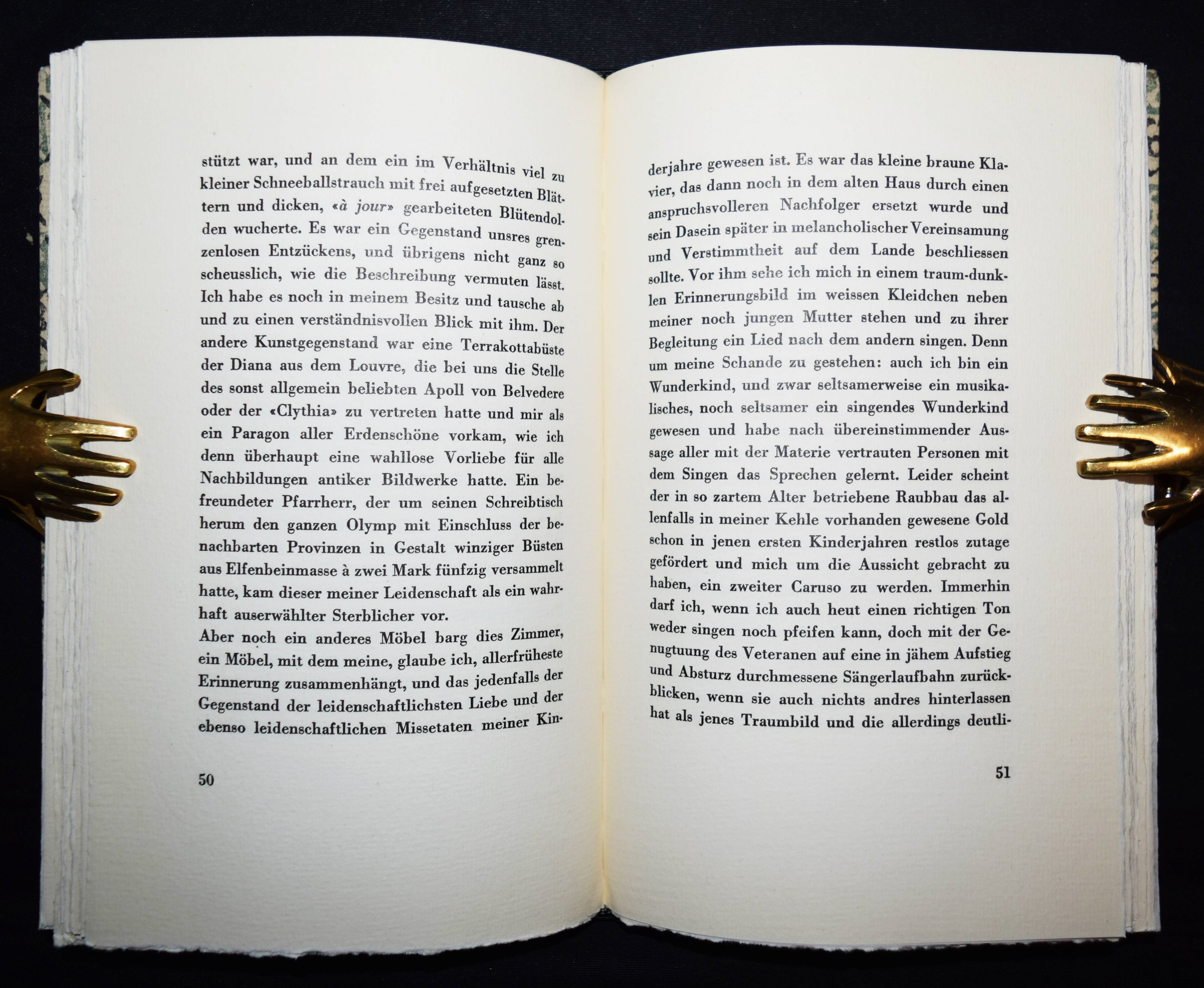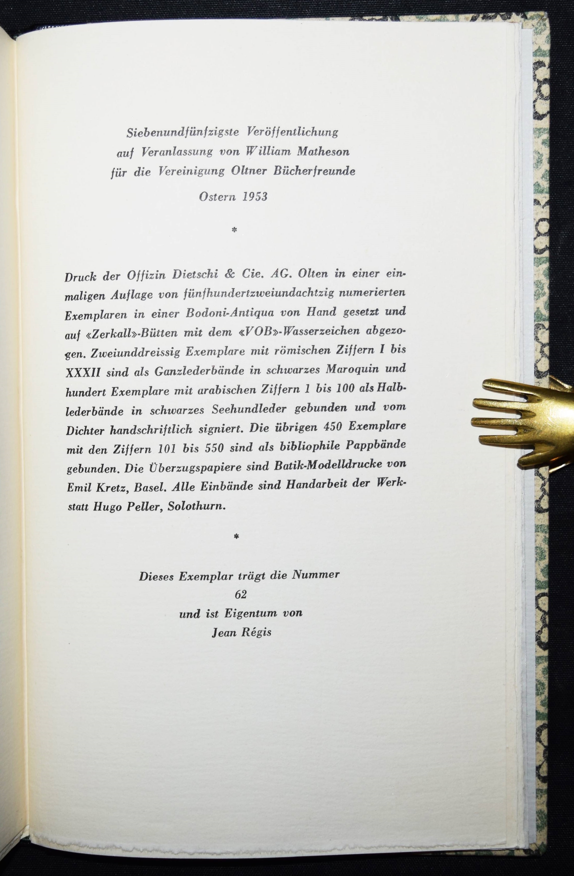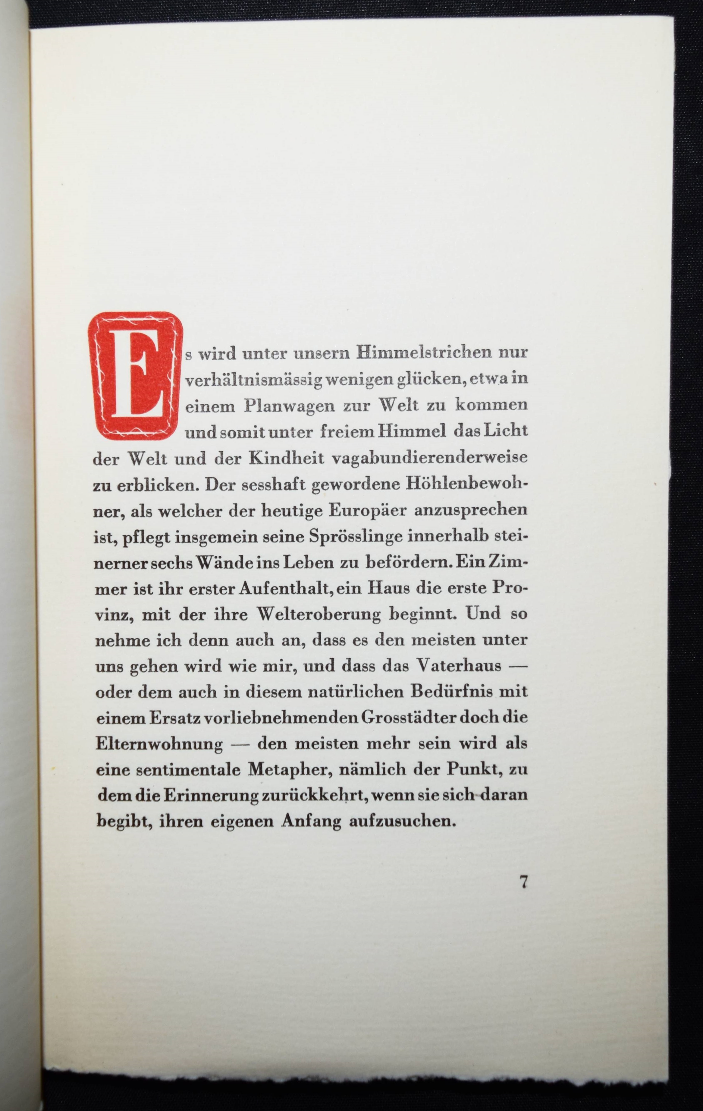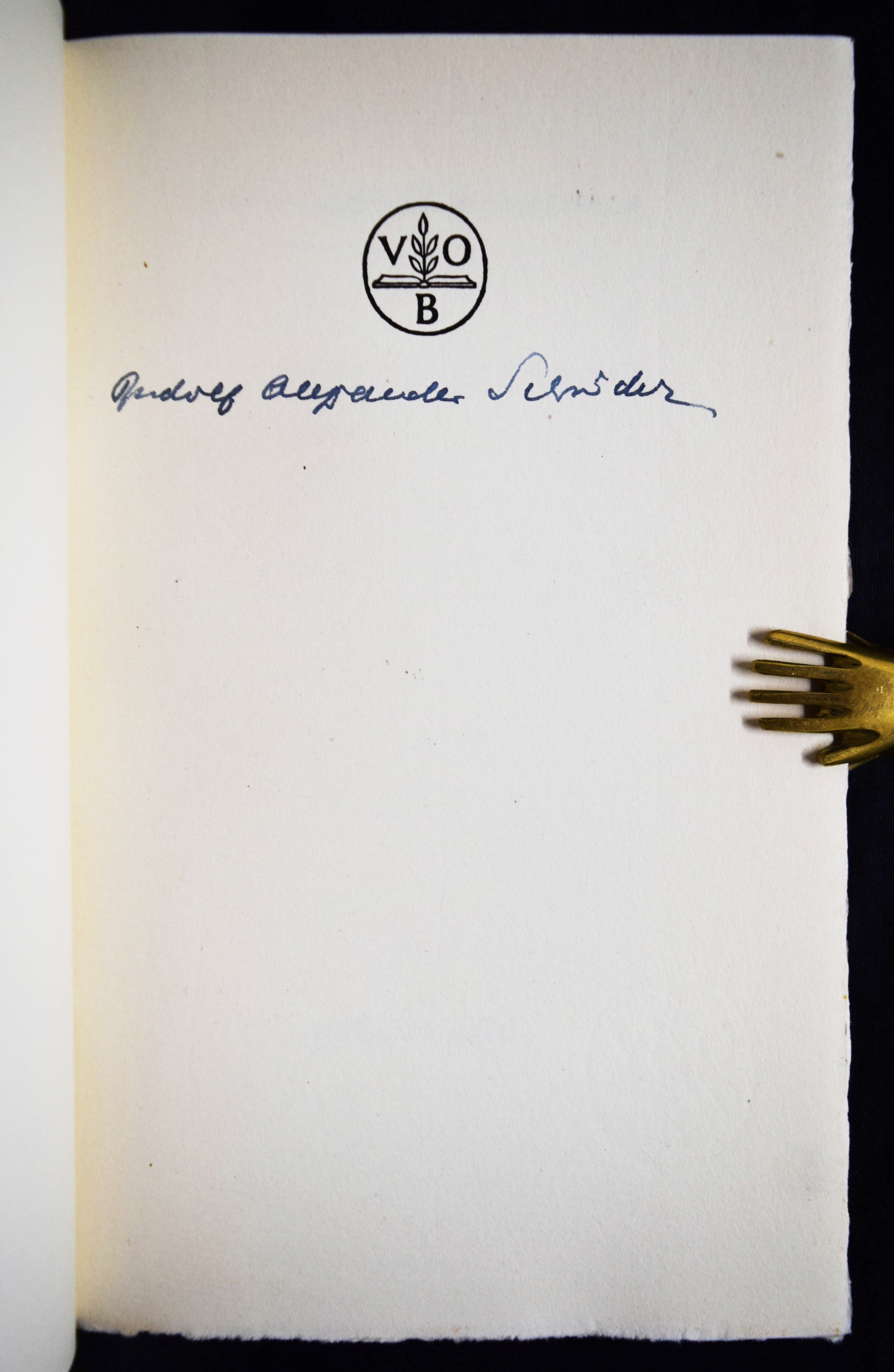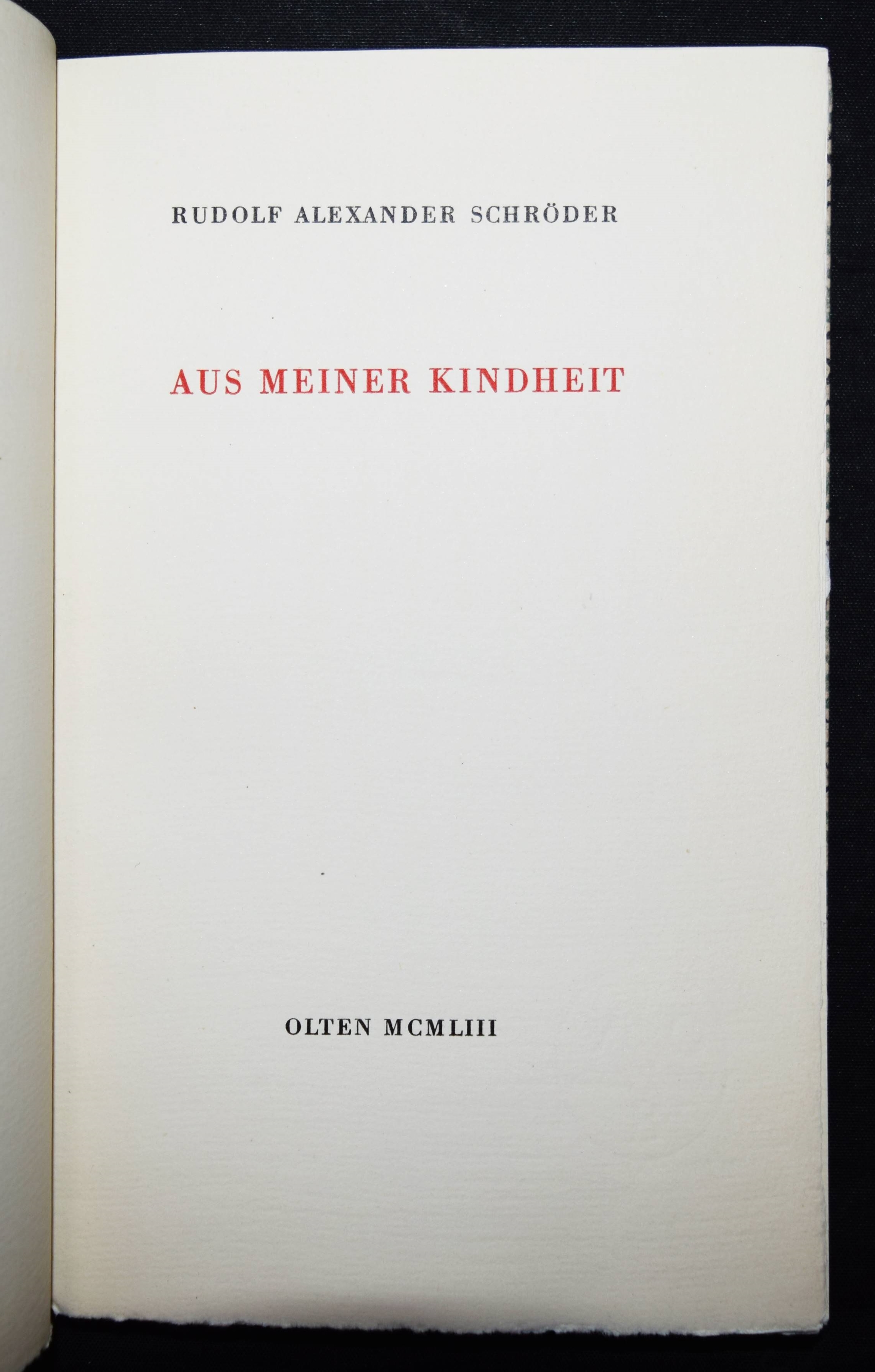 Schröder, Rudolf Alexander. Aus meiner Kindheit. Olten, Vereinigung Oltner Bücherfreunde (VOB) 1953. 8°. 93 S., [1] Bl. Schwarzer OHldr. mit goldgepr. Rückentitel, Linienvergoldung u. Kopfgoldschnitt (von Hugo Peller, Solothurn). (Veröffentlichung der Vereinigung Oltner Bücherfreunde, Band 57). W.-G.² 155. – Erste Ausgabe. – Eines von 100 num. Exemplaren in Halbmaroquin auf Zerkall-Bütten (GA 550 Exemplare); von R. A. Schröder auf dem Vortitel signiert. – Schönes sauberes Exemplar.