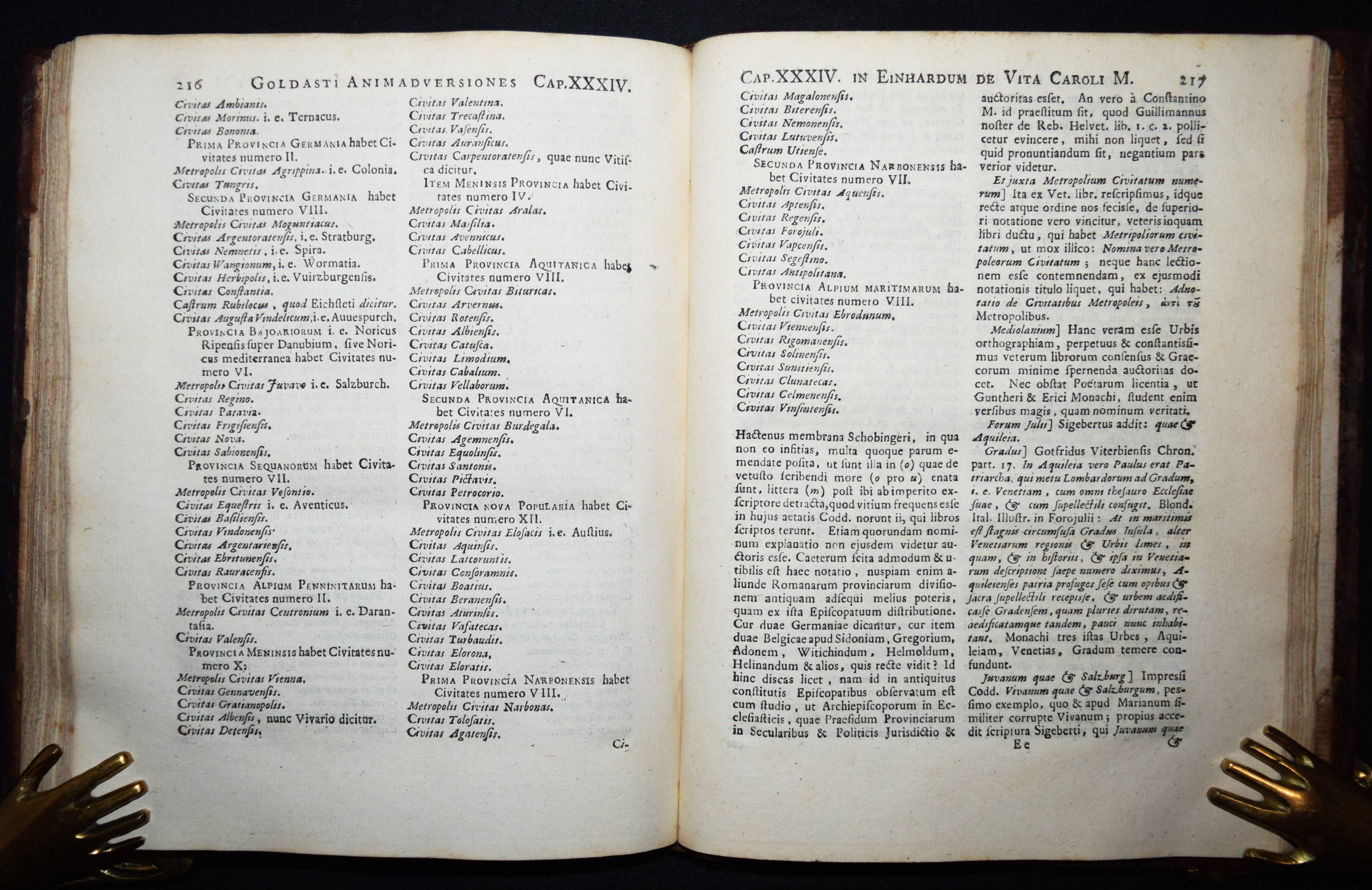Karl der Große – Eginhartus (Einhart). De vita et gestis Caroli Magni. Cum commentario Joh(ann) Friederici Besselii et notis Johannis Bollandi. Access. Melch(ior) Hamenveltonis Goldasti. Animadversiones ineditae cum variis dissertationibus quarum index in praestione exhiteur curante Joh(ann) Herm(ann) Schminckio. Trajecti ad Rhenum (Utrecht), Wilhelm Vande Water 1711. Gr.-8°. [21] Bl., 248 S., [9] Bl. mit Titel in Rot u. Schwarz, 1 mehrfach gefalt. Kupfertafel u. 1 gefalt. Stammtafel. Hldr. d. Zt. mit goldgepr. Rückenschild u. Linienvergoldung. Ebert I, 6627. Graesse II, 465. NDB XXIII, 231 f. – Erste Ausgabe der Schminck’schen Edition. – „Neue treffliche Recession nach frühern Ausgaben und 5 Manuskripten“ (Ebert). – Für den hessischen Historiker J. H. Schminck (1684-1743) „stand seine „pragmatische“ Geschichtsschreibung ganz im Dienste der staatlichen Politik. 1711 publizierte er eine Lgf. Karl I. gewidmete Edition der „Vita Karoli Magni“ Einhards, in der er aus der Handschriftenüberlieferung den besten Text zu rekonstruieren versuchte“ (T. Fuchs in NDB). – Die Falttafel mit restauriertem Einriß im Falz, sehr gutes, nahezu fleckenfreies Exemplar.