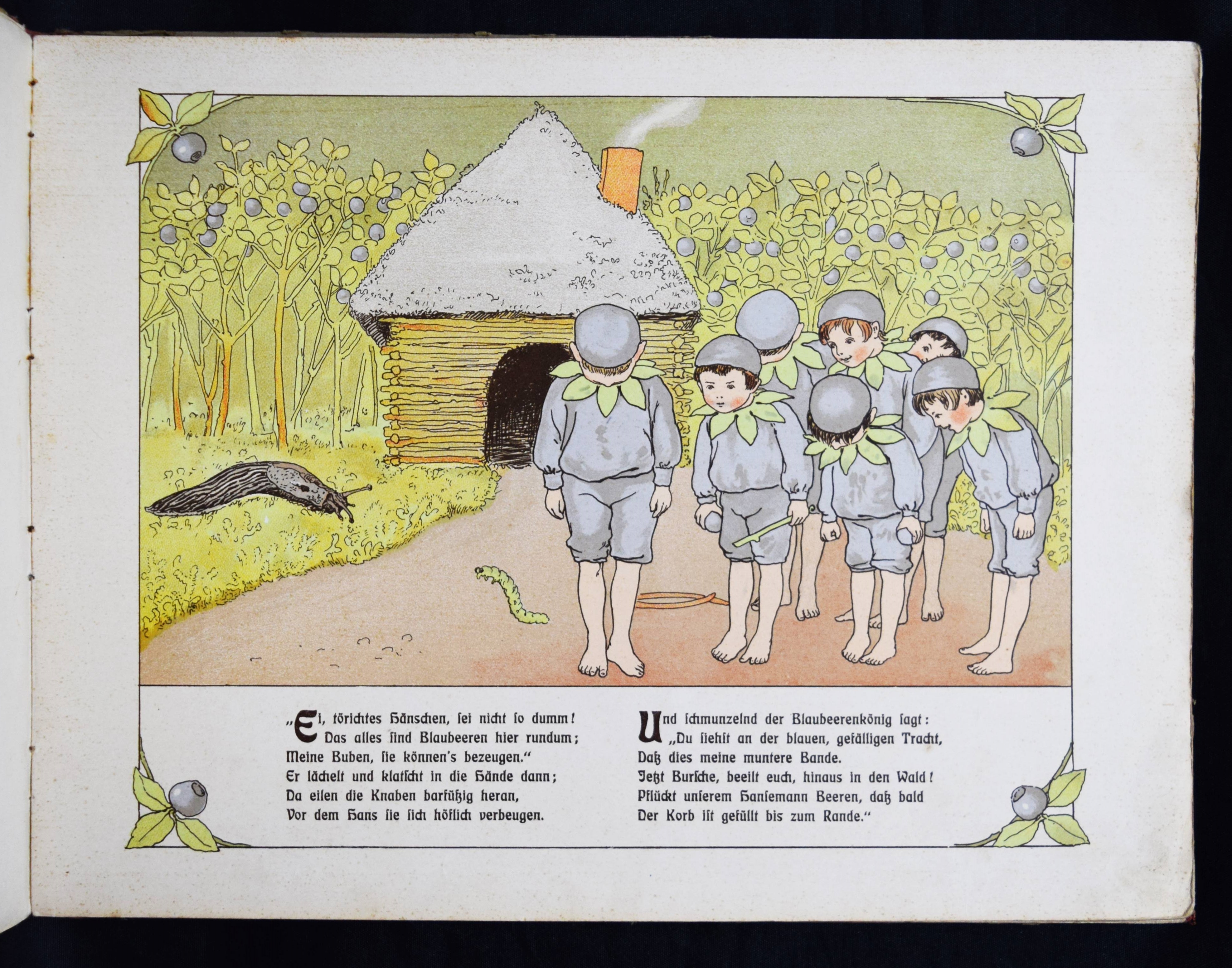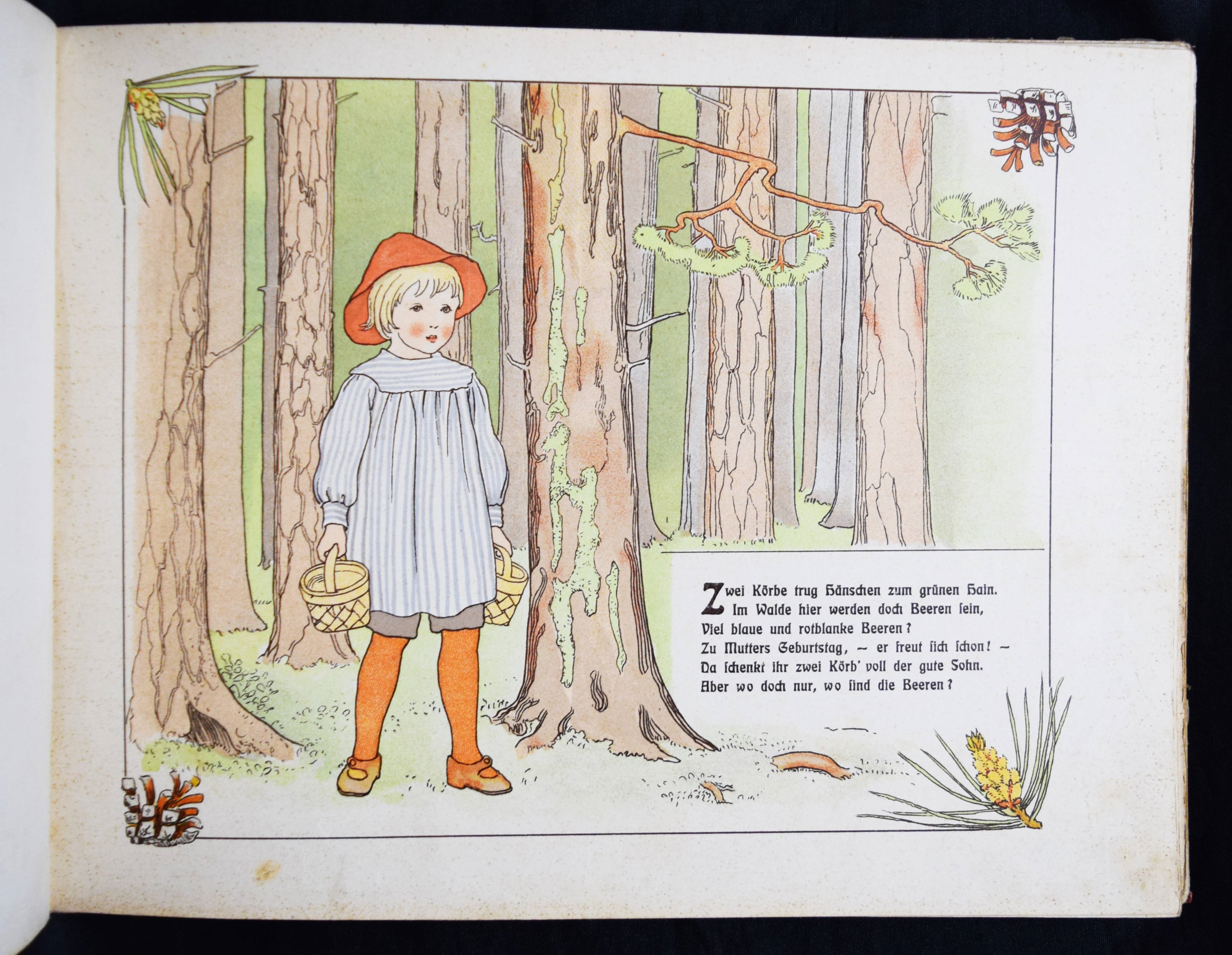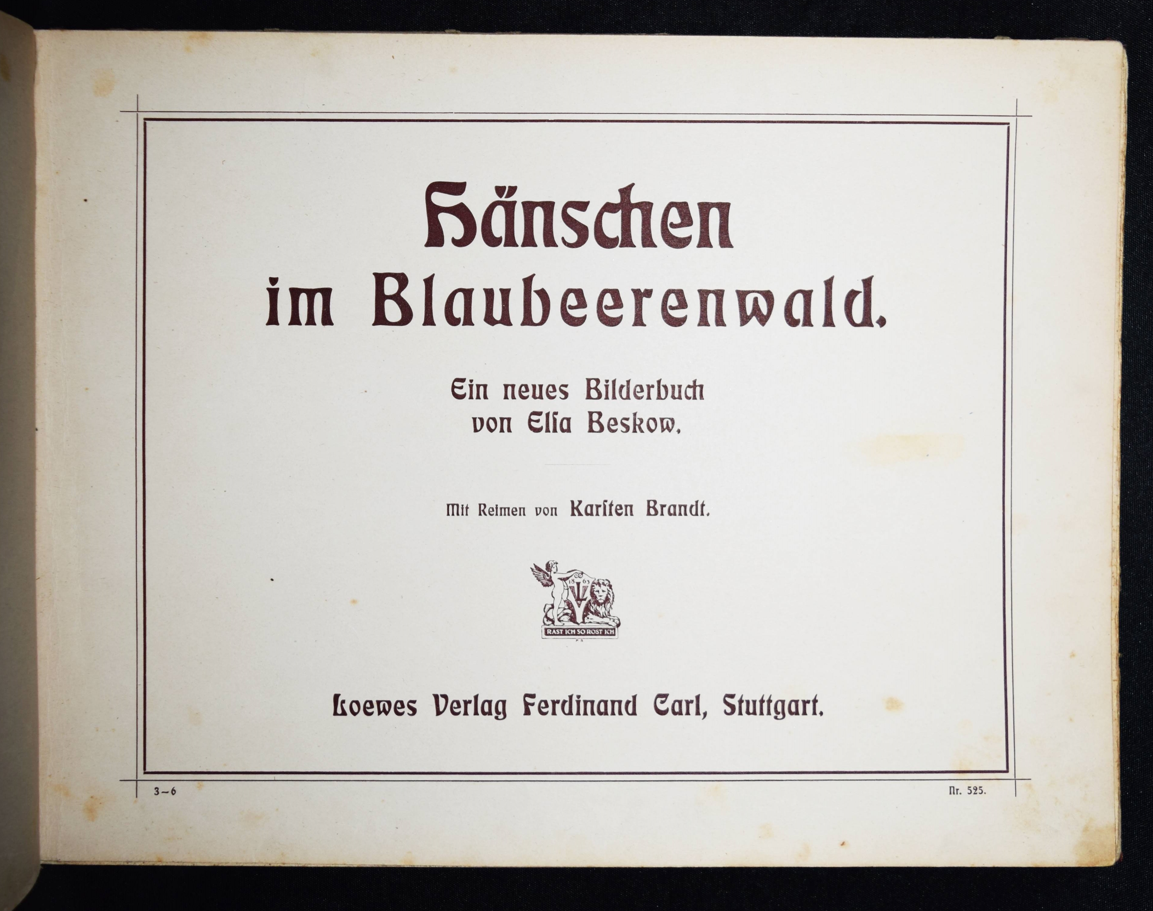 Beskow, Elsa. Hänschen im Blaubeerenwald. Ein neues Bilderbuch von Elsa Beskow. Mit Reimen von Karsten Brandt. Stuttgart, Loewe o. J. (1903). Quer-4°. [17] Bl. mit 16 chromolithogr. Tafeln. Farbig illustr. OHln. (Verlags-Nr. 525). Bilderwelt 2827. Doderer-Müller S. 263 f. LKJ I, 142 f. Ries, 434, 1. Seebaß I, 1750 u. II, 163. Stuck-Villa I, 306 u. II, 140. – Seltene erste deutsche Ausgabe des erfolgreichen Bilderbuchs. Es erschien auch eine Ausgabe auf Karton und als Leporello. 1904 erschien eine „kleine Ausgabe“ in Quer-Oktav und 1909 eine weitere deutsche Übersetzung von J. Schmidt. Die Verlagsnummer ist im unteren Rand auf dem Titelblatt angegeben. – „Elsa Beskow (1874-1955) schuf mehr als dreißig Bilderbücher und illustrierte Märchensammlungen, Lieder- und Lesebücher. Ihre Illustrationen sind von der dekorativen Formensprache des „Art Nouveau“ und dem Jugendstil geprägt. Angeregt durch die nordischen Troll- und Elfensagen verwandelt sie Blumen, Pilze und Früchte häufig in Gestalten mit menschlichen Gesichtern und Körpern (vgl. LKJ Bd. I)“ (G. Ricke in Bilderwelt). – Einband berieben und etwas bestoßen, zeitgenöss. Besitzvermerk a. V. (dat. Januar 1915), Klammern angerostet, dadurch Buchblock in der Mitte gebrochen, Heftung teils gelockert und eine Lage lose, im Blattrand etwas angestaubt und fleckig, insgesamt noch gutes Exemplar.