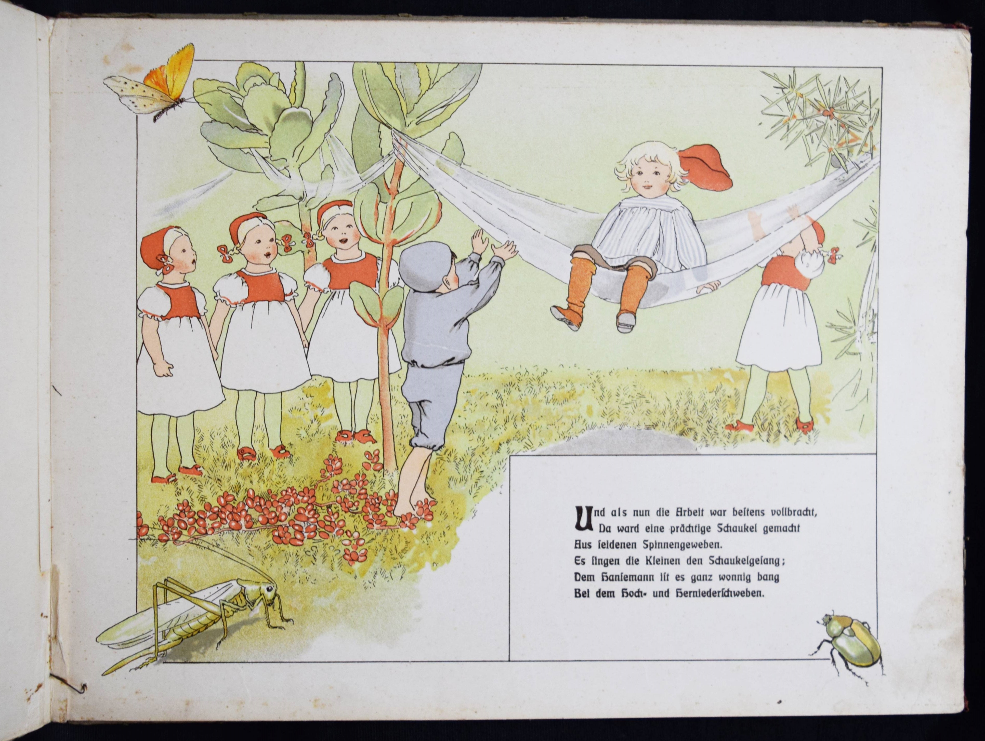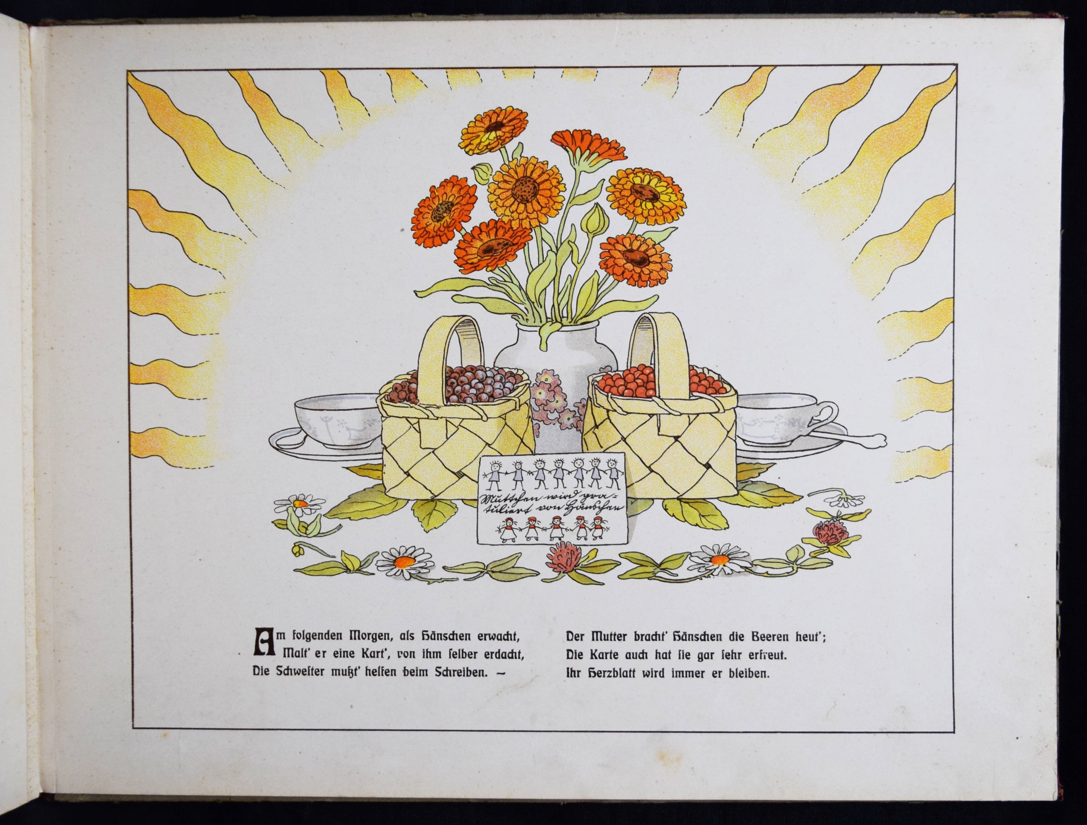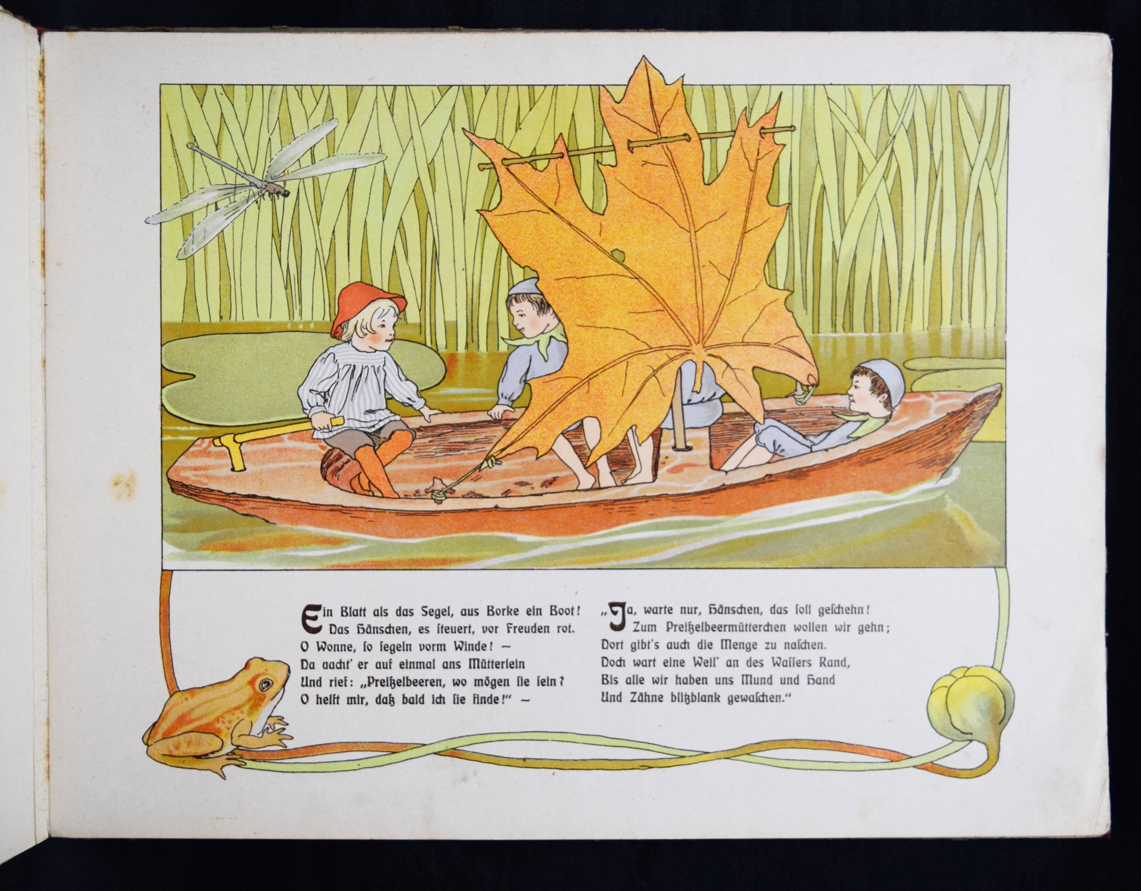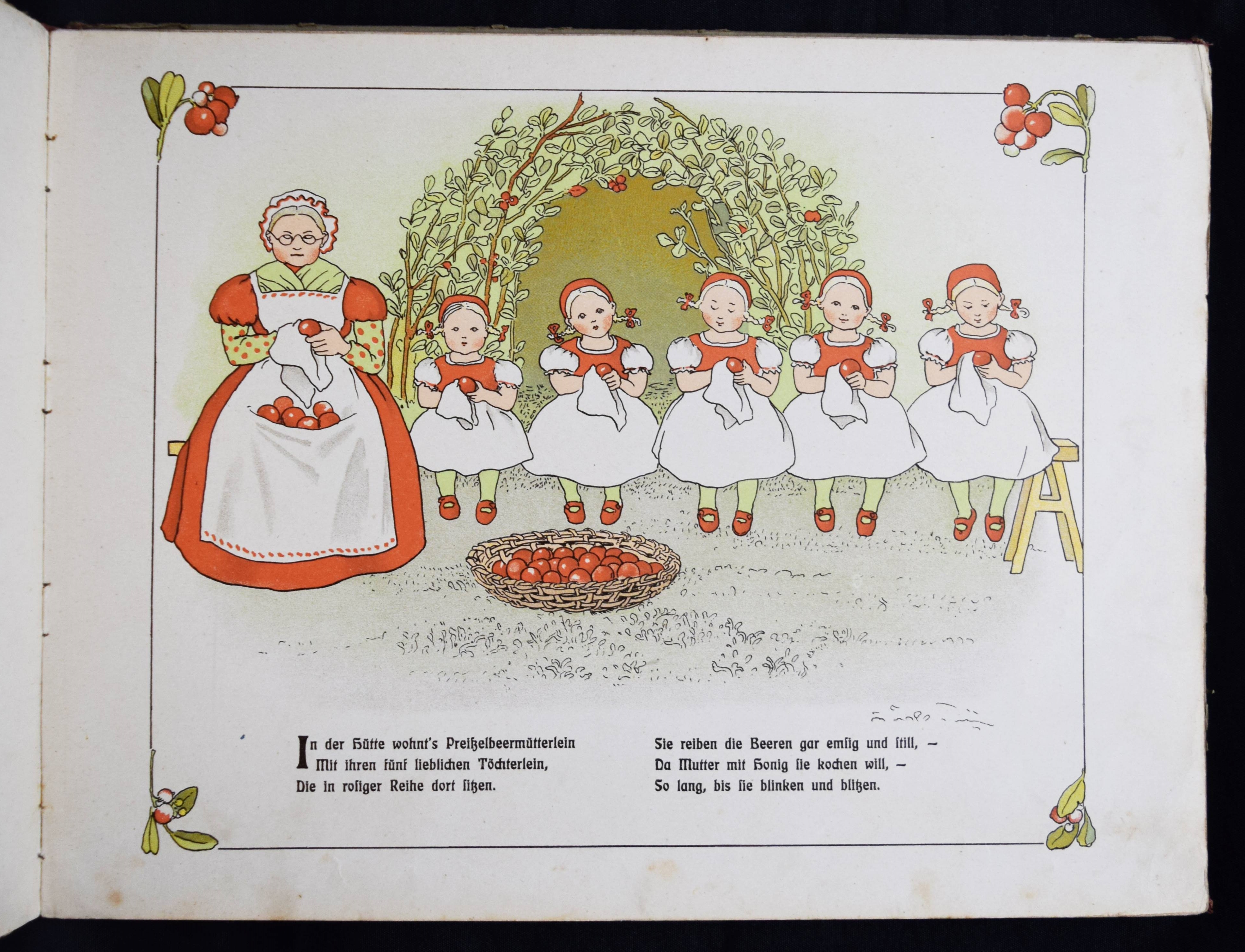 Beskow, Elsa. Hänschen im Blaubeerenwald. Ein neues Bilderbuch von Elsa Beskow. Mit Reimen von Karsten Brandt. Stuttgart, Loewe o. J. (1903). Quer-4°. [17] Bl. mit 16 chromolithogr. Tafeln. Farbig illustr. OHln. (Verlags-Nr. 525). Bilderwelt 2827. Doderer-Müller S. 263 f. LKJ I, 142 f. Ries, 434, 1. Seebaß I, 1750 u. II, 163. Stuck-Villa I, 306 u. II, 140. – Seltene erste deutsche Ausgabe des erfolgreichen Bilderbuchs. Es erschien auch eine Ausgabe auf Karton und als Leporello. 1904 erschien eine „kleine Ausgabe“ in Quer-Oktav und 1909 eine weitere deutsche Übersetzung von J. Schmidt. Die Verlagsnummer ist im unteren Rand auf dem Titelblatt angegeben. – „Elsa Beskow (1874-1955) schuf mehr als dreißig Bilderbücher und illustrierte Märchensammlungen, Lieder- und Lesebücher. Ihre Illustrationen sind von der dekorativen Formensprache des „Art Nouveau“ und dem Jugendstil geprägt. Angeregt durch die nordischen Troll- und Elfensagen verwandelt sie Blumen, Pilze und Früchte häufig in Gestalten mit menschlichen Gesichtern und Körpern (vgl. LKJ Bd. I)“ (G. Ricke in Bilderwelt). – Einband berieben und etwas bestoßen, zeitgenöss. Besitzvermerk a. V. (dat. Januar 1915), Klammern angerostet, dadurch Buchblock in der Mitte gebrochen, Heftung teils gelockert und eine Lage lose, im Blattrand etwas angestaubt und fleckig, insgesamt noch gutes Exemplar.