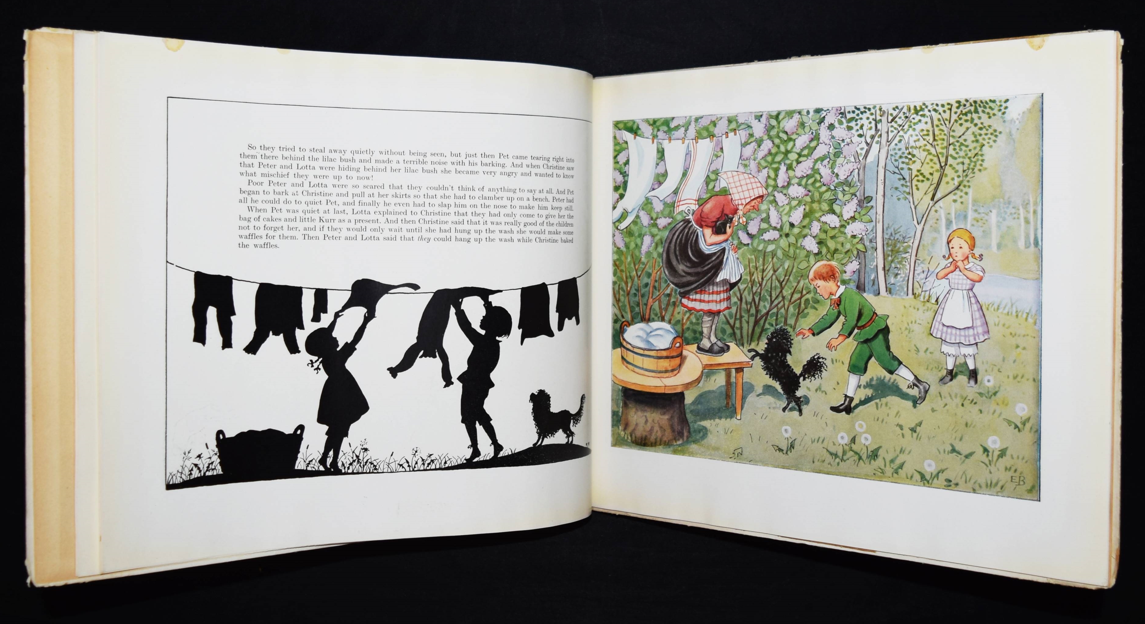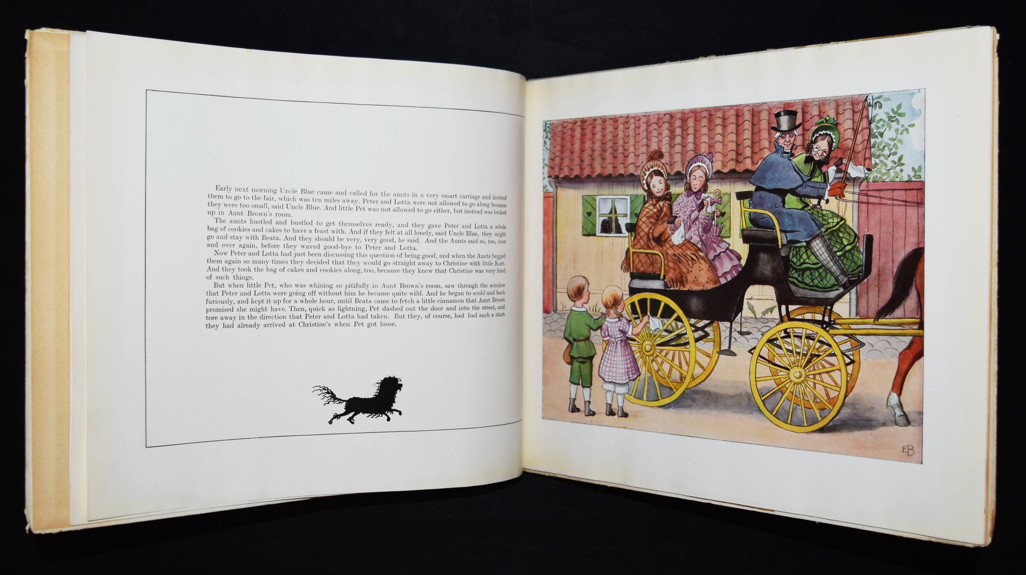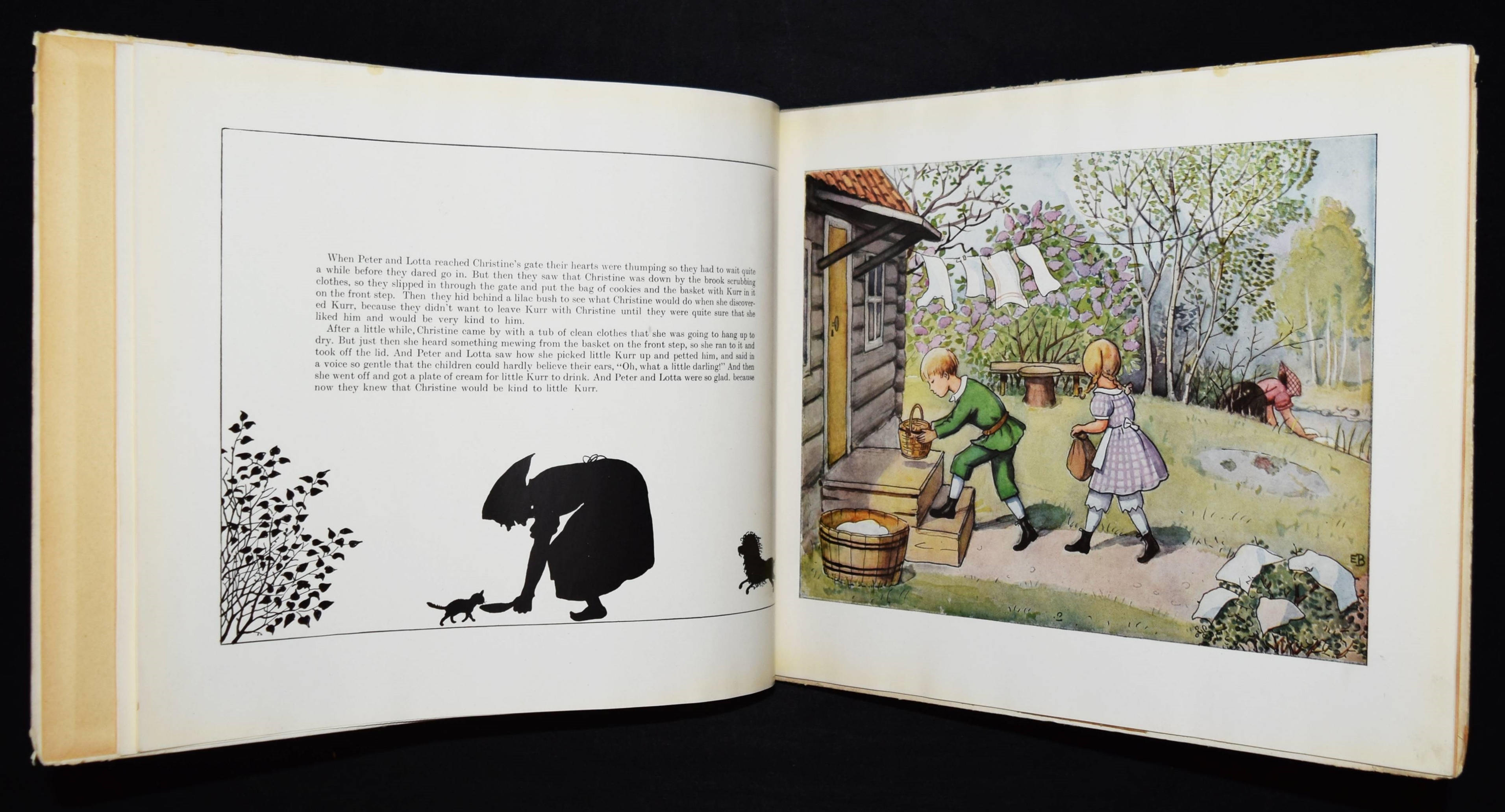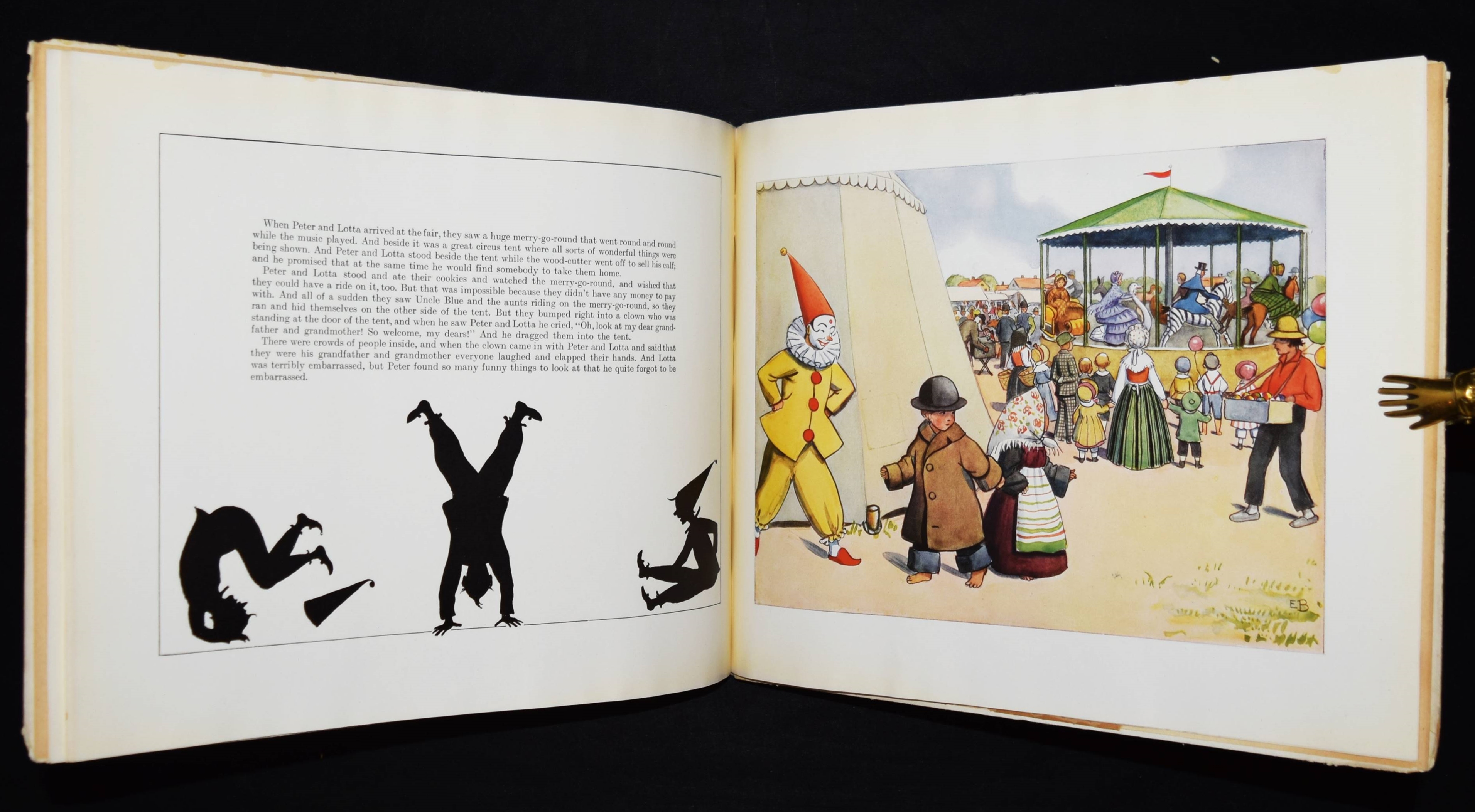 Beskow, Elsa The Adventures of Peter and Lotta. A story told and illustrated. New York, Harper & Brothers o. J. (1931). Quer-4°. [16] Bl. mit farbig illustr. Titel u. 15 (14 ganzs.) farb. Illustrationen u. Schattenbilder im Text. Farbig illustr. OHln. LKJ I, 142 f. – Erste amerikanische Ausgabe von „Petter och Lotta pa äventyr“ (Stockholm 1929). – „Verbesserte Druckverfahren und das relativ junge Alter der schwedischen Literatur für Kinder und Jugendliche sicherten ihr rasch eine beherrschende Position. Entscheidend für diese Stellung war jedoch ihr künstlerisches Vermögen, schwedische Kinder im Kreis der Familie, im Ablauf des Jahres und ihrer Umwelt überzeugend zu zeichnen. Viele ihrer Arbeiten wurden ins Englische, Amerikanische, Polnische, Russische, Tschechische, Holländische und Deutsche übersetzt und beeinflußten in den ersten Jahrzehnten des 20. Jh.s die Bilderbuchkunst dieser Länder“ (H. Künnemann in LKJ). – Deckel berieben, Exlibris einer öffentlichen amerikanischen Bücherei, Titelblatt und das folgende Bl. mit gelochtem Namenszug der Bücherei, sonst gut erhalten.