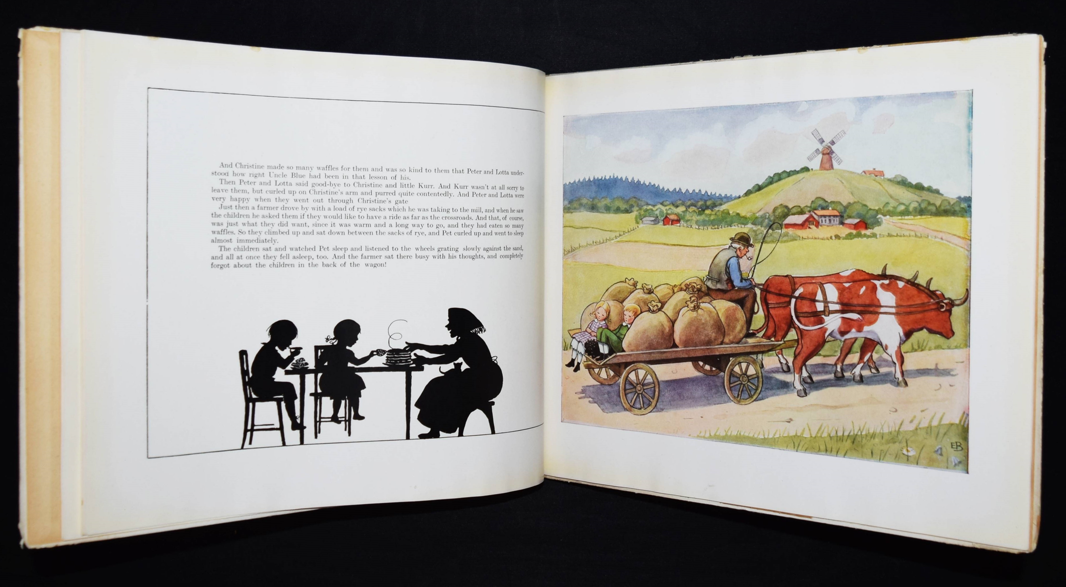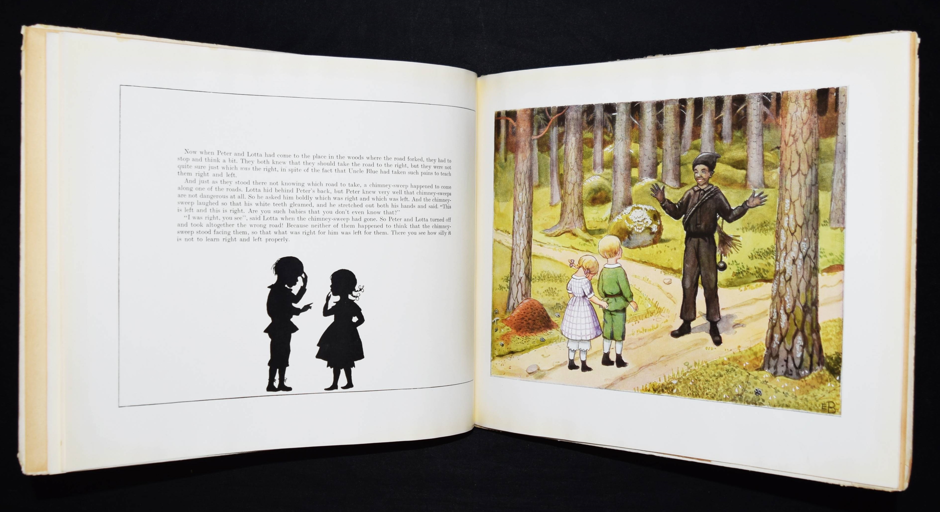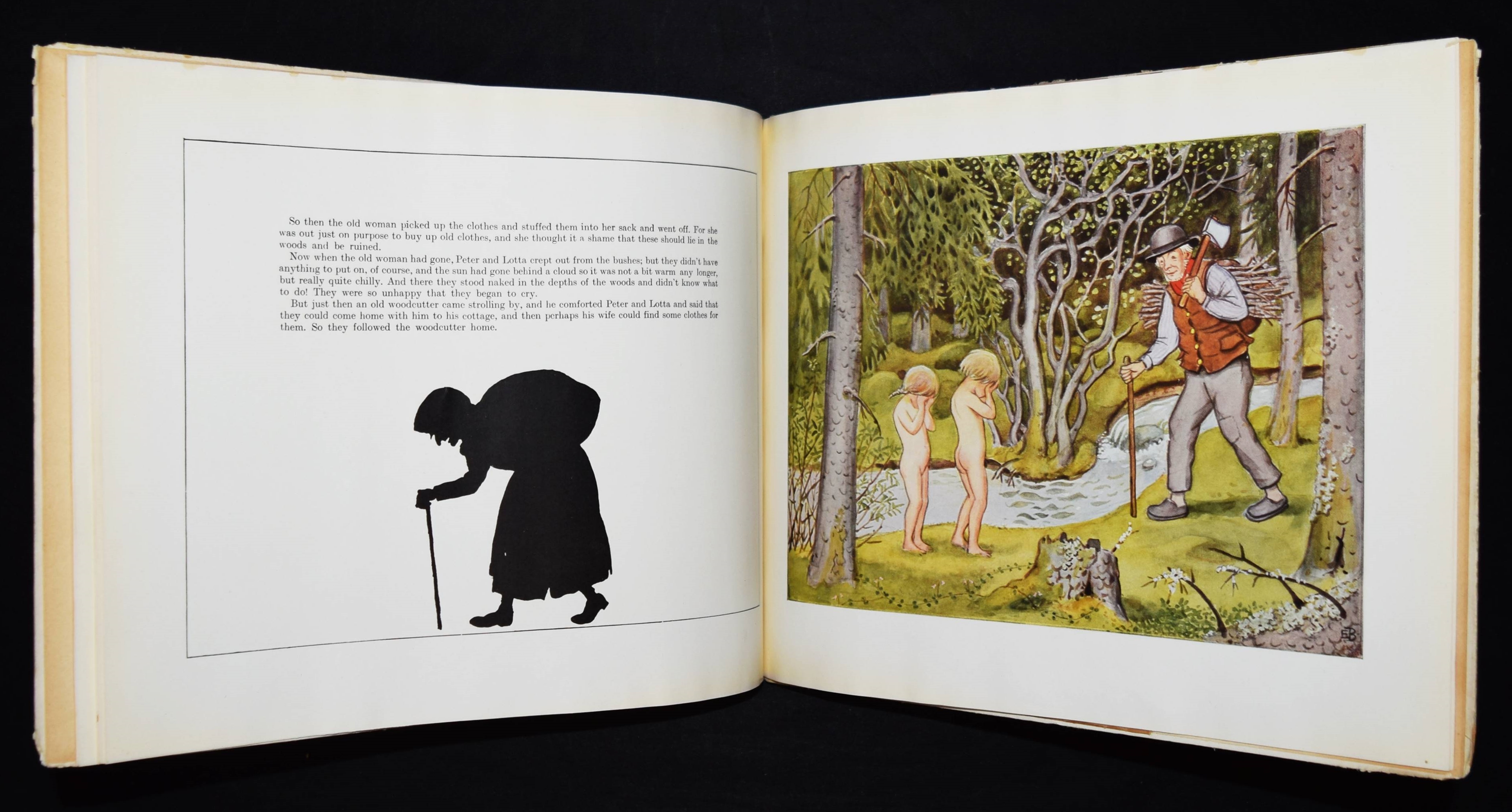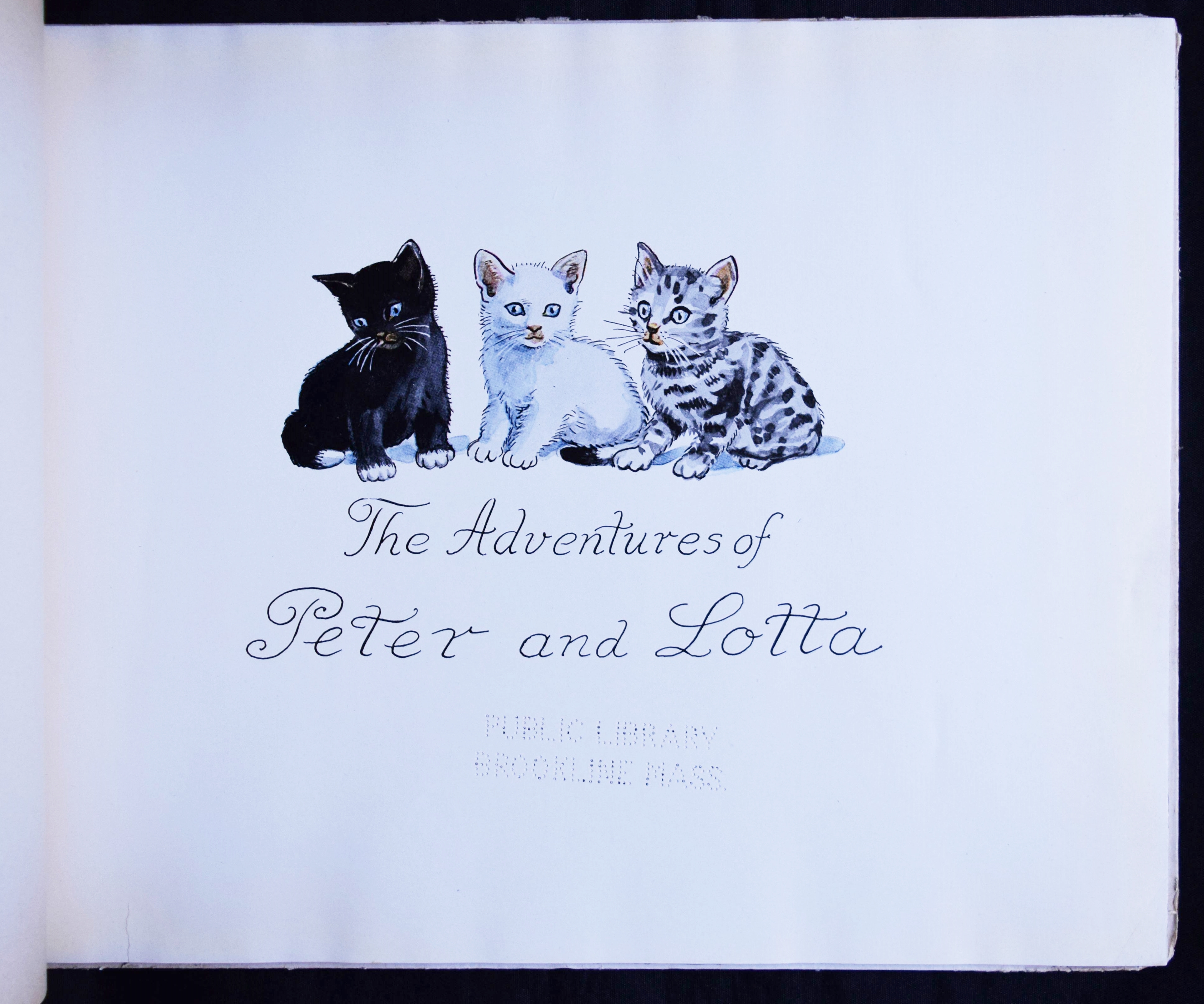 Beskow, Elsa The Adventures of Peter and Lotta. A story told and illustrated. New York, Harper & Brothers o. J. (1931). Quer-4°. [16] Bl. mit farbig illustr. Titel u. 15 (14 ganzs.) farb. Illustrationen u. Schattenbilder im Text. Farbig illustr. OHln. LKJ I, 142 f. – Erste amerikanische Ausgabe von „Petter och Lotta pa äventyr“ (Stockholm 1929). – „Verbesserte Druckverfahren und das relativ junge Alter der schwedischen Literatur für Kinder und Jugendliche sicherten ihr rasch eine beherrschende Position. Entscheidend für diese Stellung war jedoch ihr künstlerisches Vermögen, schwedische Kinder im Kreis der Familie, im Ablauf des Jahres und ihrer Umwelt überzeugend zu zeichnen. Viele ihrer Arbeiten wurden ins Englische, Amerikanische, Polnische, Russische, Tschechische, Holländische und Deutsche übersetzt und beeinflußten in den ersten Jahrzehnten des 20. Jh.s die Bilderbuchkunst dieser Länder“ (H. Künnemann in LKJ). – Deckel berieben, Exlibris einer öffentlichen amerikanischen Bücherei, Titelblatt und das folgende Bl. mit gelochtem Namenszug der Bücherei, sonst gut erhalten.