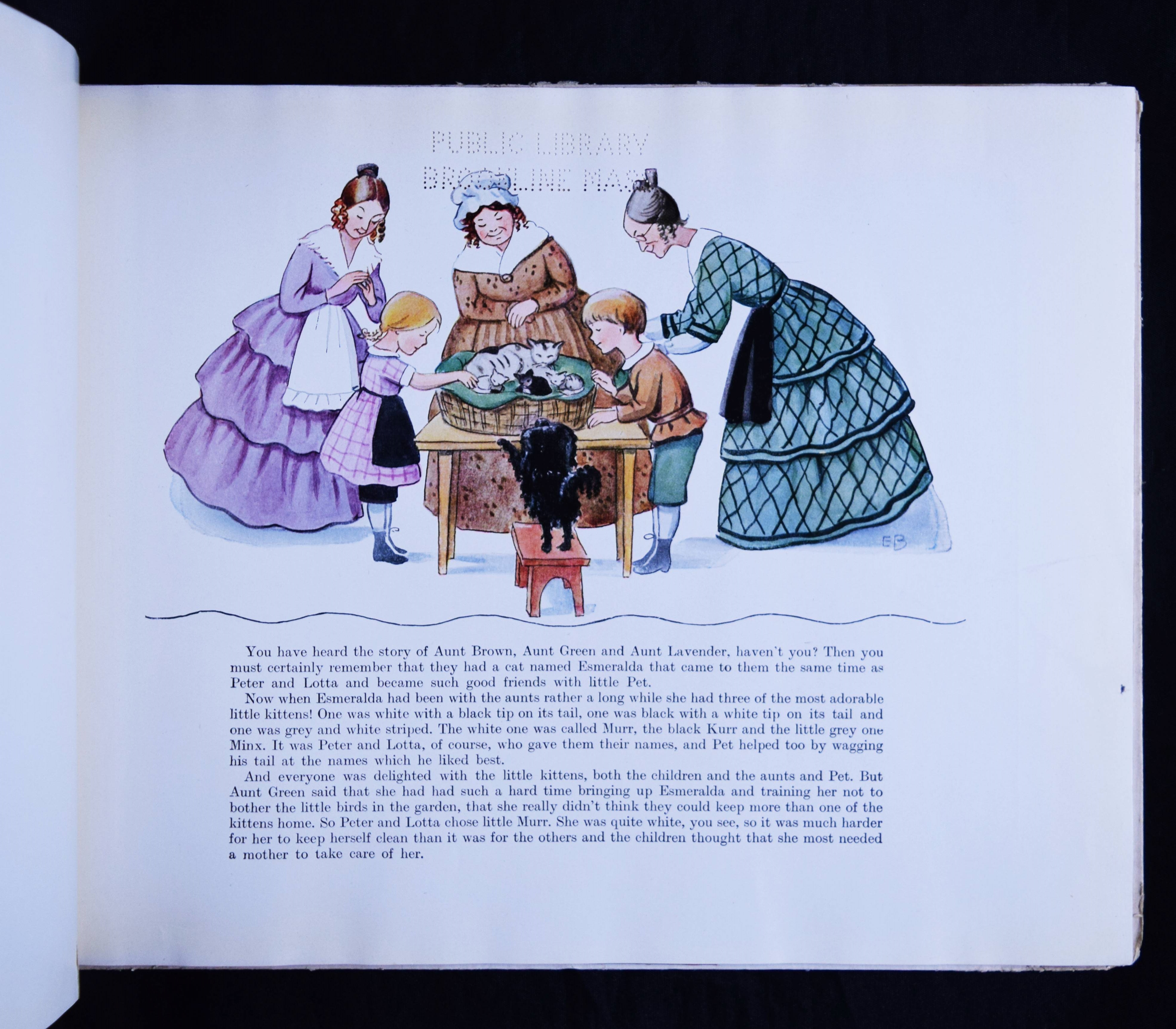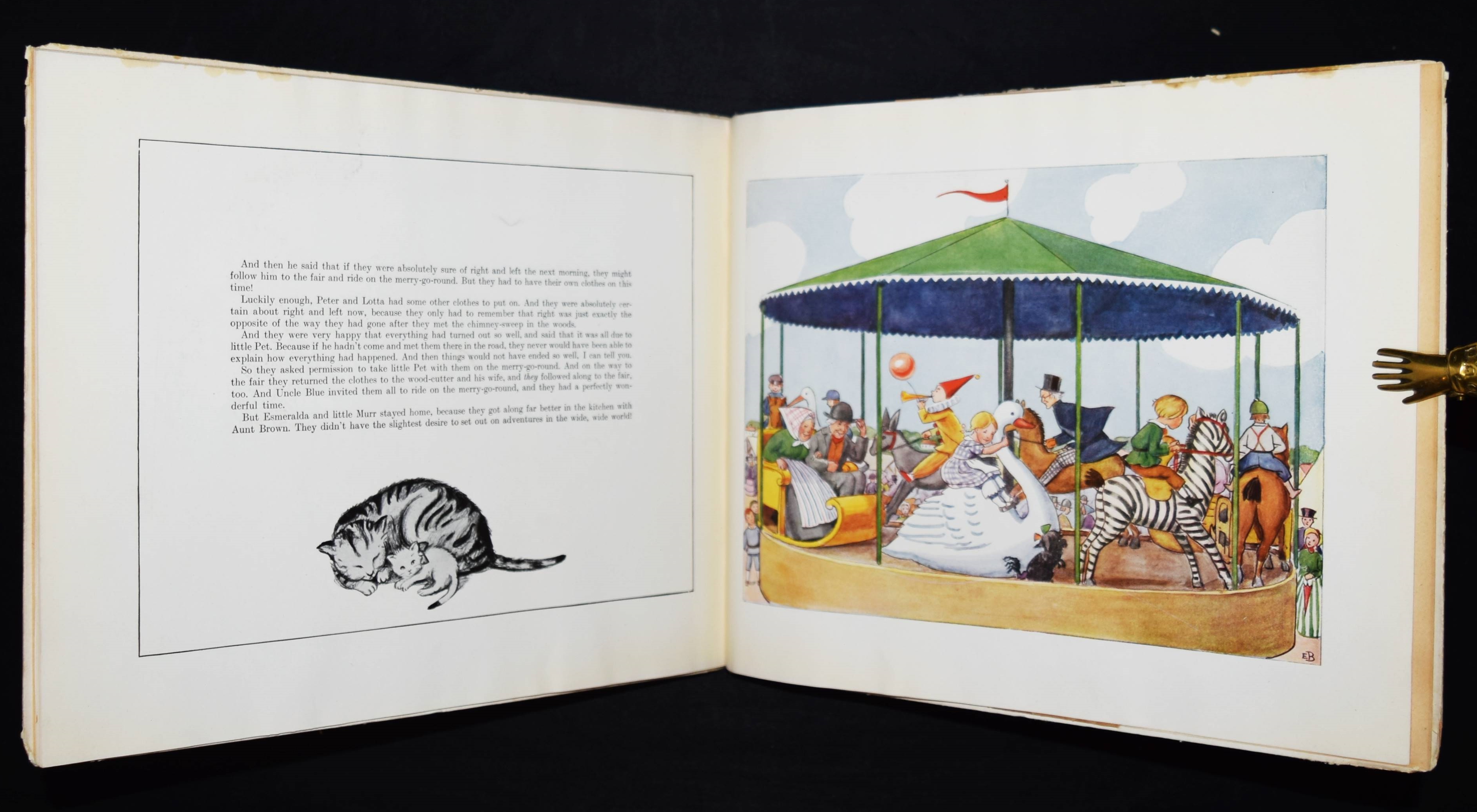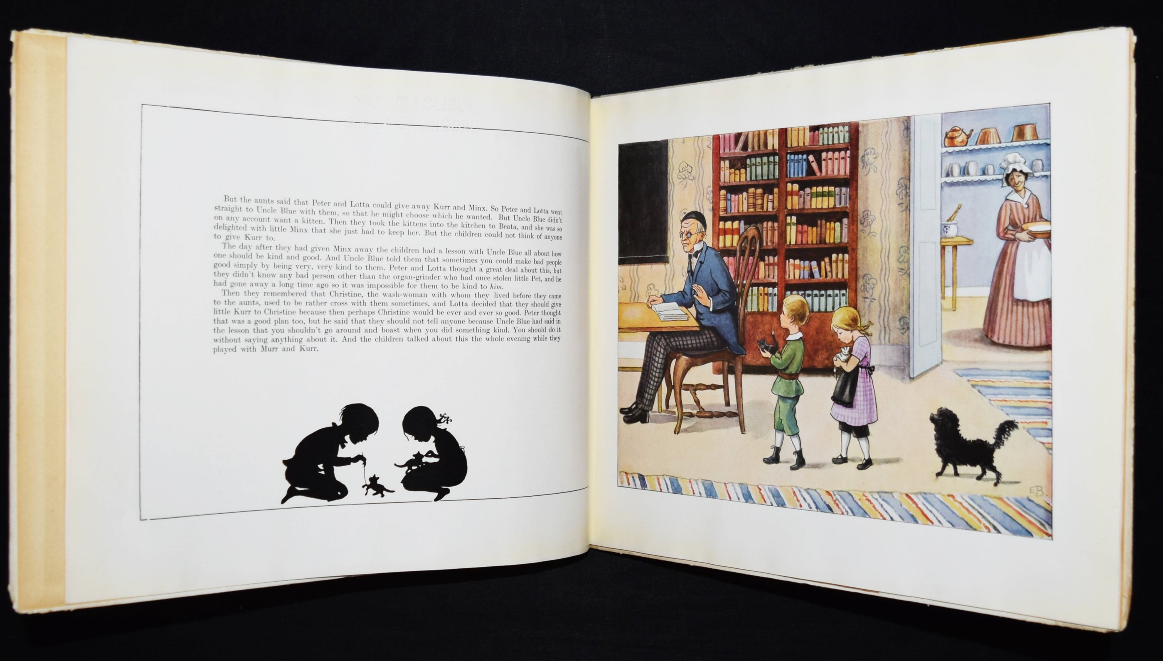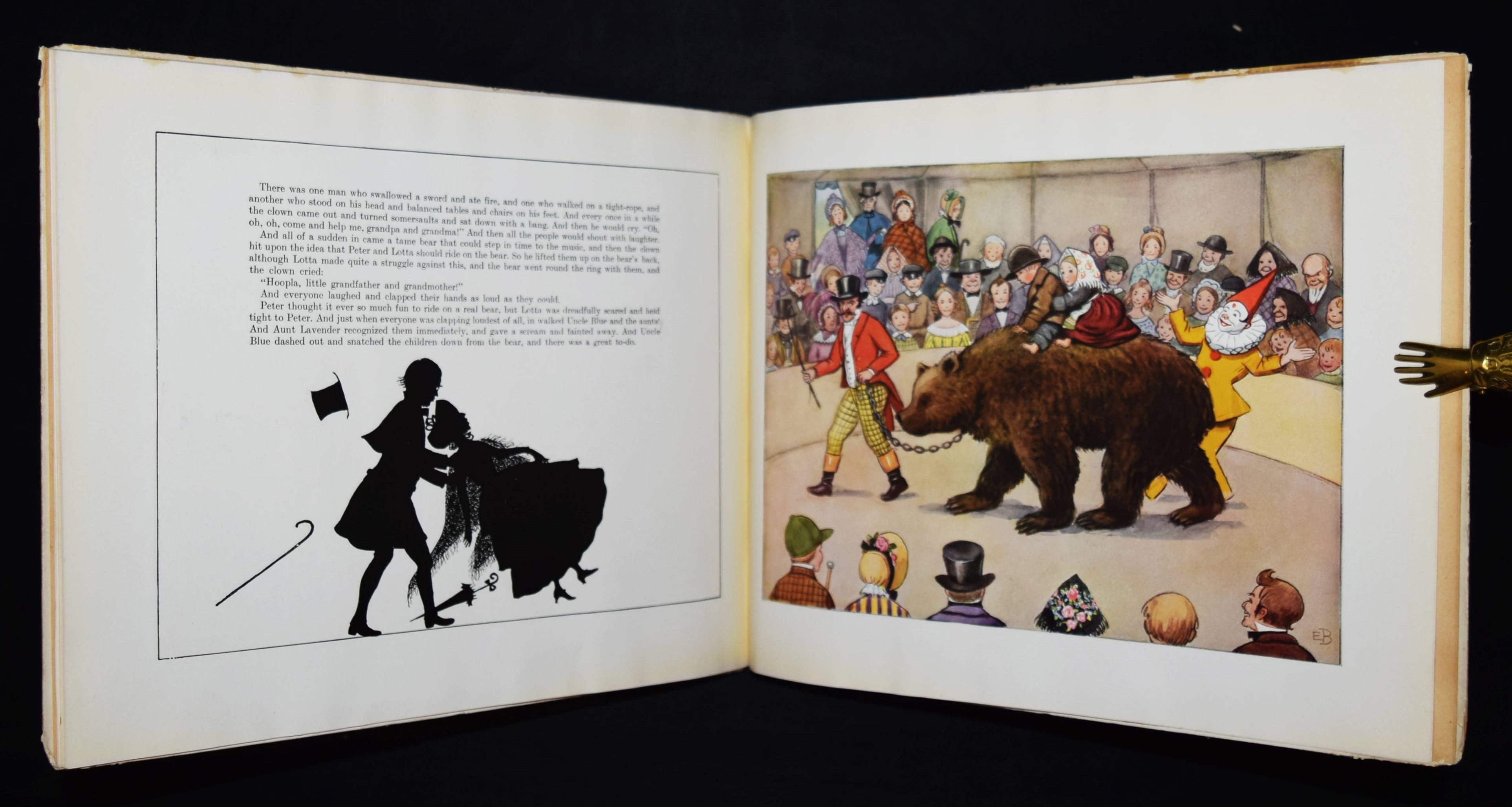 Beskow, Elsa The Adventures of Peter and Lotta. A story told and illustrated. New York, Harper & Brothers o. J. (1931). Quer-4°. [16] Bl. mit farbig illustr. Titel u. 15 (14 ganzs.) farb. Illustrationen u. Schattenbilder im Text. Farbig illustr. OHln. LKJ I, 142 f. – Erste amerikanische Ausgabe von „Petter och Lotta pa äventyr“ (Stockholm 1929). – „Verbesserte Druckverfahren und das relativ junge Alter der schwedischen Literatur für Kinder und Jugendliche sicherten ihr rasch eine beherrschende Position. Entscheidend für diese Stellung war jedoch ihr künstlerisches Vermögen, schwedische Kinder im Kreis der Familie, im Ablauf des Jahres und ihrer Umwelt überzeugend zu zeichnen. Viele ihrer Arbeiten wurden ins Englische, Amerikanische, Polnische, Russische, Tschechische, Holländische und Deutsche übersetzt und beeinflußten in den ersten Jahrzehnten des 20. Jh.s die Bilderbuchkunst dieser Länder“ (H. Künnemann in LKJ). – Deckel berieben, Exlibris einer öffentlichen amerikanischen Bücherei, Titelblatt und das folgende Bl. mit gelochtem Namenszug der Bücherei, sonst gut erhalten.