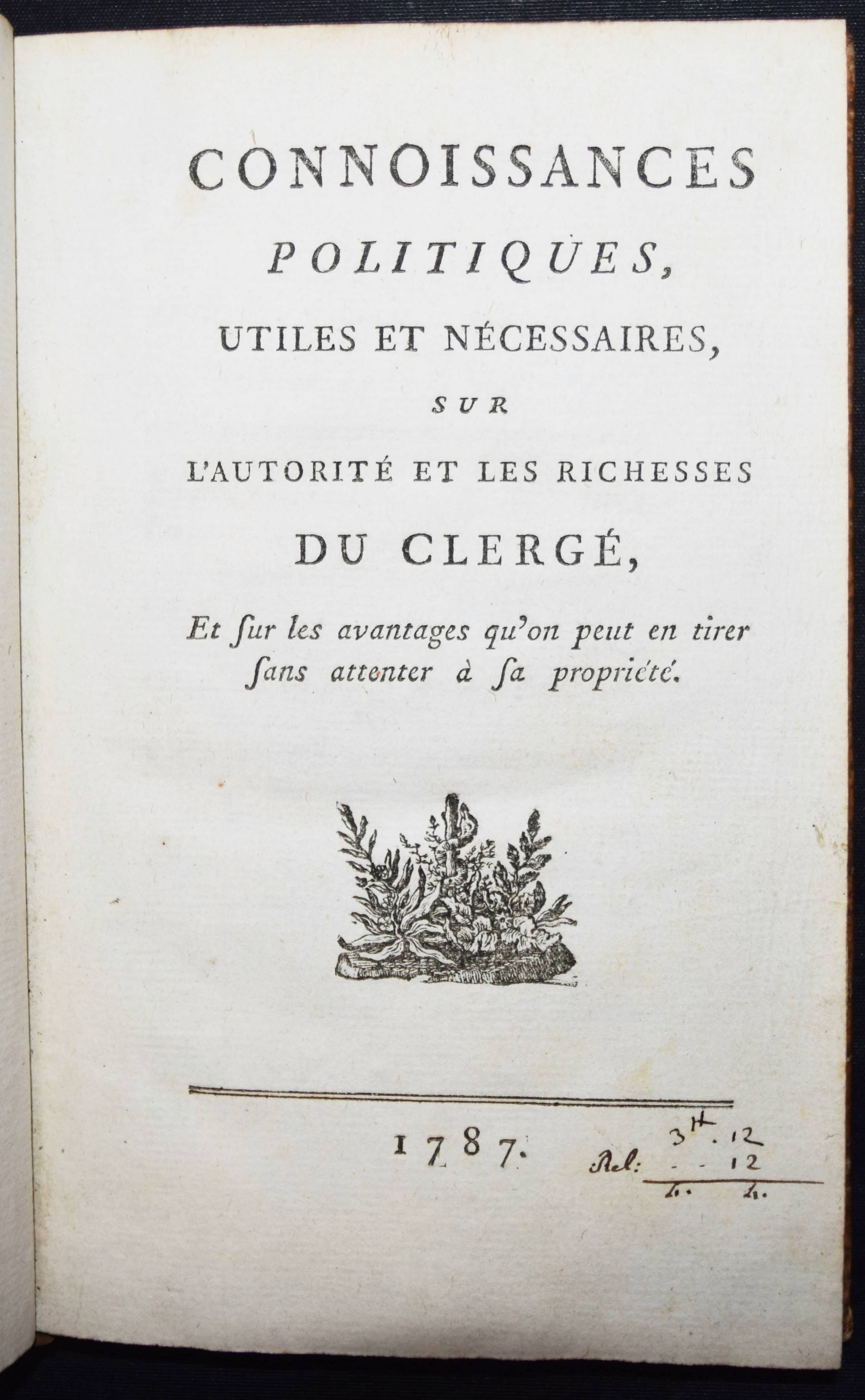 (Goezman de Thun, Louis Valentin de). Connoissances politiques, utiles et nécessaires sur l’autorité des richesses du clergé et sur les avantages qu’on peut en tirer sans attenter à sa propriété. (Introduction par Simon-Nicolas-Henri Linguet). O. O. u. Dr. (Paris ?) 1787. 8°. [2] Bl., 228 S. Hldr. d. Zt. mit goldgepr. Rückenschild u. Rückenvergoldung. Äußerst seltene poltische Streitschrift des Elsässer Juristen und Diplomaten L. V. Goezman de Thun (auch Goetzmann u. Goetsmann, 1729-1794). – „Politisches, nützliches und notwendiges Wissen über die Autorität des Reichtums des Klerus und über die Vorteile, die daraus gezogen werden können, ohne das eigene Eigentum zu verletzen.“ – Goezman war Staatsanwalt am „Maupeou-Parlament“ musste jedoch 1774 aus politischen Gründen sein Amt aufgeben (Affaire Goëzman). Als Geheimagent der Regierung war er seit 1775 für den franz. Marineminister und das Außenministerium in London tätig. Er operierte hier unter dem fingierten Namen Baron von Thun. 1781 verlor er das Vertrauen der englischen Regierung; außerdem wurde ihm die Komplizenschaft mit dem Buchhändler David Boissère vorgeworfen, der in Frankreich verbotene Bücher herausgab. 1783 kehrte er nach Frankreich zurück. Er plante nach Amerika auszuwandern um dort Wein anzubauen und schickte Franklin diesbezüglich ein Schreiben. Des Terrors verdächtigt und während der „Conspiration des prisons“ (Gefängnisverschwörung) wurde vor Gericht gestellt und am 25. Juli 1794 guillotiniert. – „Goëzman, désavoué en Cour et raillé dans l’opinion, entame une nouvelle carrière, celle d’agent secret pour le gouvernement. Il est successivement chargé de diverses « commissions » à Londres par le secrétaire d’État de la Marine puis par les Affaires étrangères, dans le courant de l’année 1775 et pendant une quinzaine d’années. Sous le nom emprunté de baron de Thurn, prétextant de son séjour par la composition d’une Histoire de la Guerre d’Amérique, il se livre à l’espionnage et au renseignement. Il surveille les mouvements des bâtiments britanniques et tente d’apprécier la situation économique et politique du royaume, en particulier la chute attendue du ministère North. Il se charge de diverses missions secrètes, transmet des extraits d’ouvrages et de journaux londoniens à Versailles. Il est aussi chargé de diverses missions de surveillance des „mauvais français“ installés à Londres, à l’instar de Simon-Nicolas-Henri Linguet. C’est sous les noms de Lerchenberg, de baron de Thurn ou de John Williams qu’il signe des dépêches, apparemment prisées dans un premier temps, puis avec le temps, considérées comme vagues et imprécises. Son correspondant principal est le maréchal de camp Baudouin. Pendant la guerre d’Indépendance, il séjourne un moment à Ostende, craignant pour sa sécurité. Dans ses voyages, son fils Georges, formé au régiment de Royal-Bavière, l’accompagne. Mais à partir de l’été 1781, la confiance du gouvernement en ses bons services vacille, Lenoir ainsi juge sa conduite suspecte : on lui prête des liaisons malhonnêtes avec lord Shelburne et avec Charles James Fox. Au-delà, il est accusé de complicité avec le libraire David Boissière qui distribue des ouvrages clandestins en France. Mais on continue à lui verser une pension. Durant l’été 1783, son retour en France est évoqué et au même moment, il livre un Mémoire à Franklin pour l’informer de son projet de s’établir en Amérique pour y cultiver la vigne. Apparemment, il devait regagner la France seulement quelques années plus tard, tout en continuant probablement de servir sous les ordres du comte de Montmortin. Suspecté sous la Terreur, jugé lors de la « conspiration des prisons », il meurt guillotiné à Paris, le 7 thermidor an II (25 juillet 1794)“ (Wikipedia). – Sehr schönes sauberes und dekorativ gebundenes Exemplar.