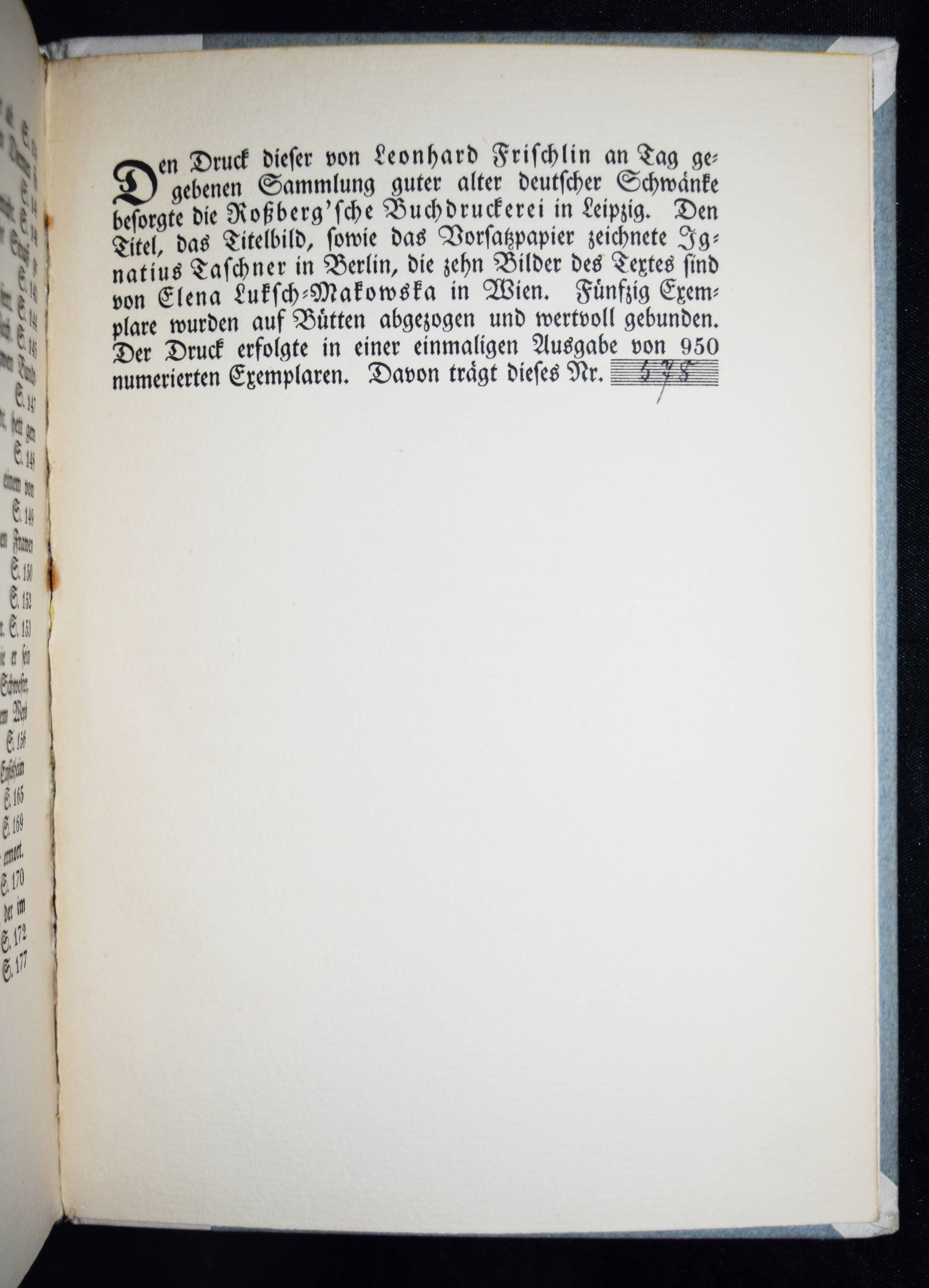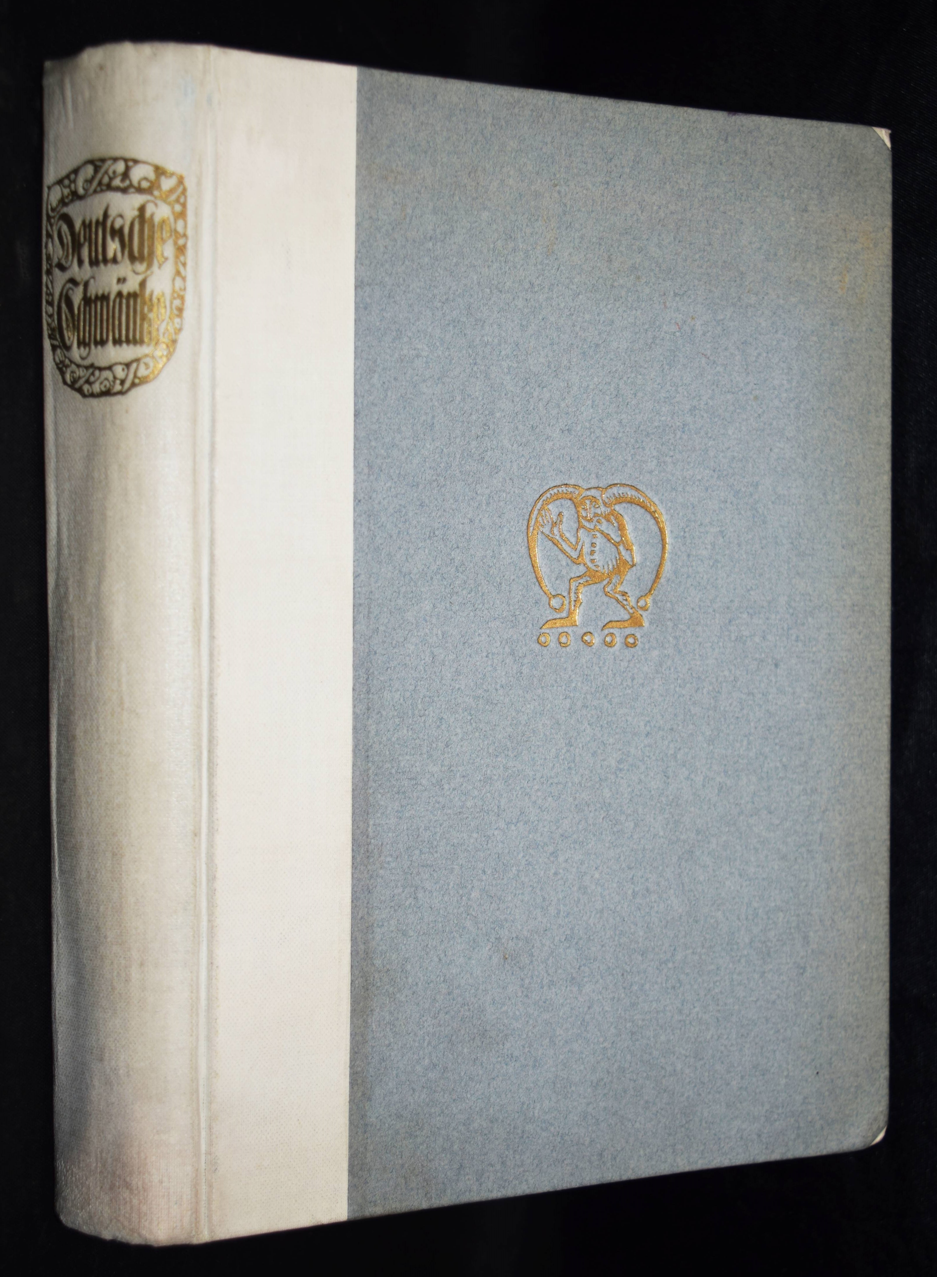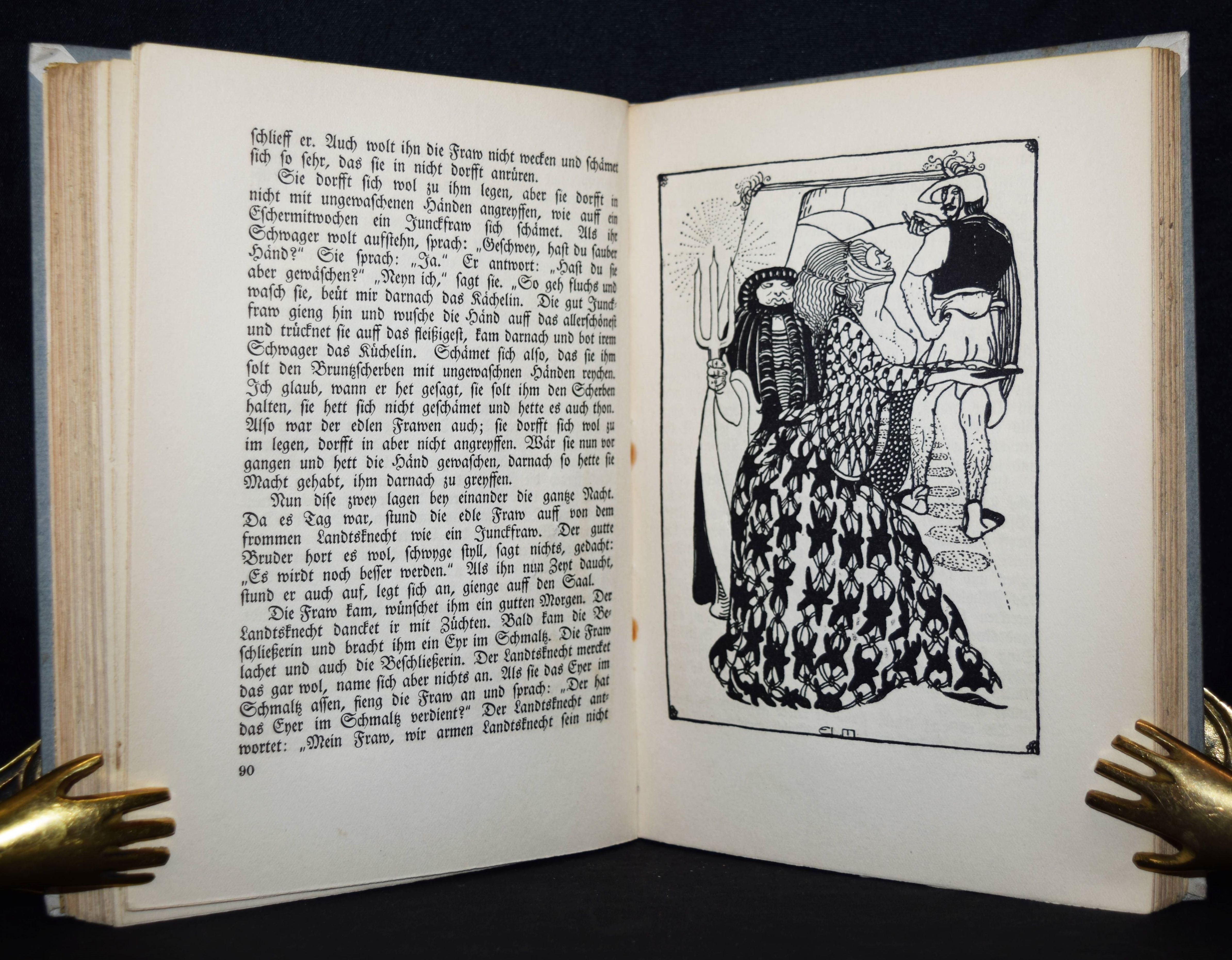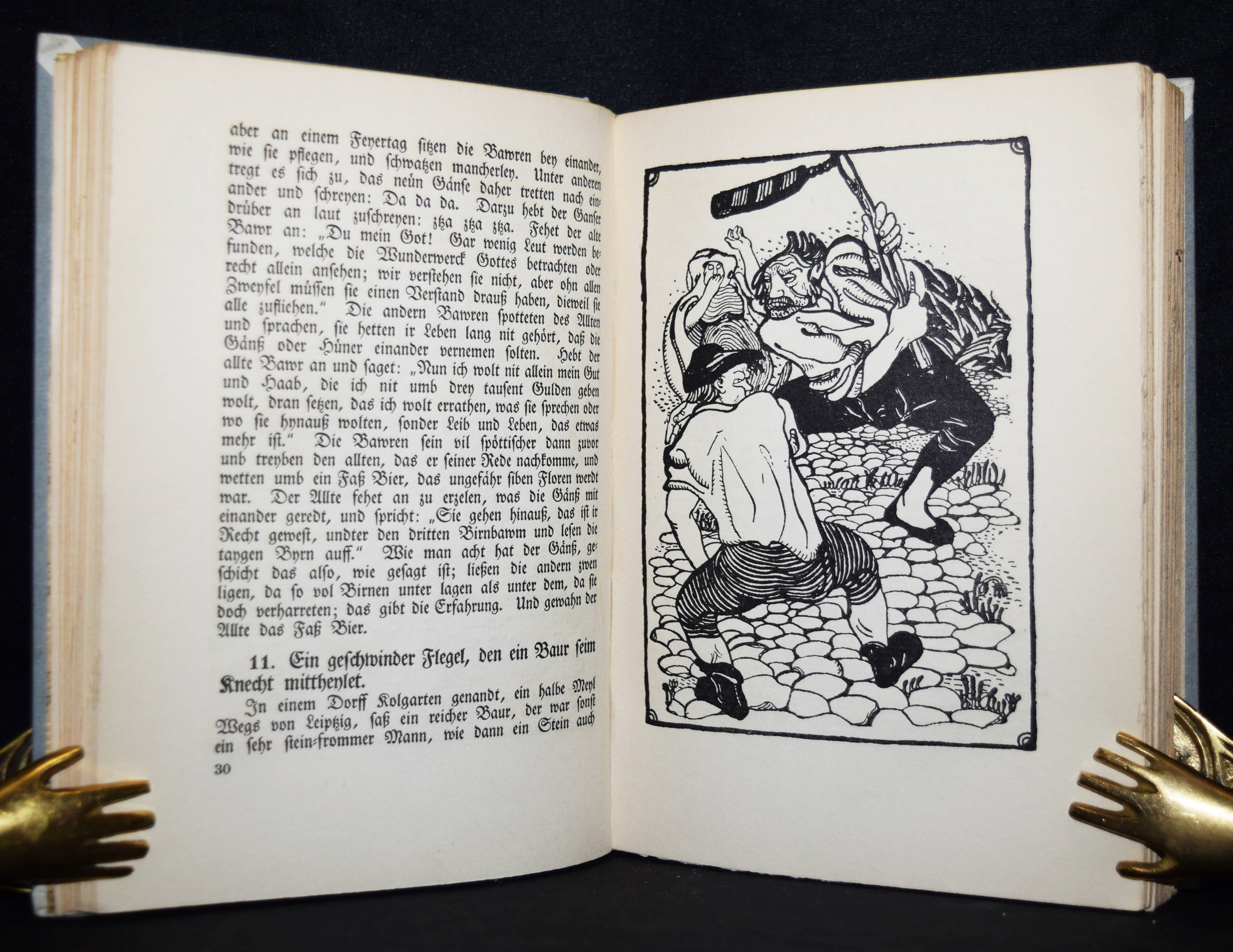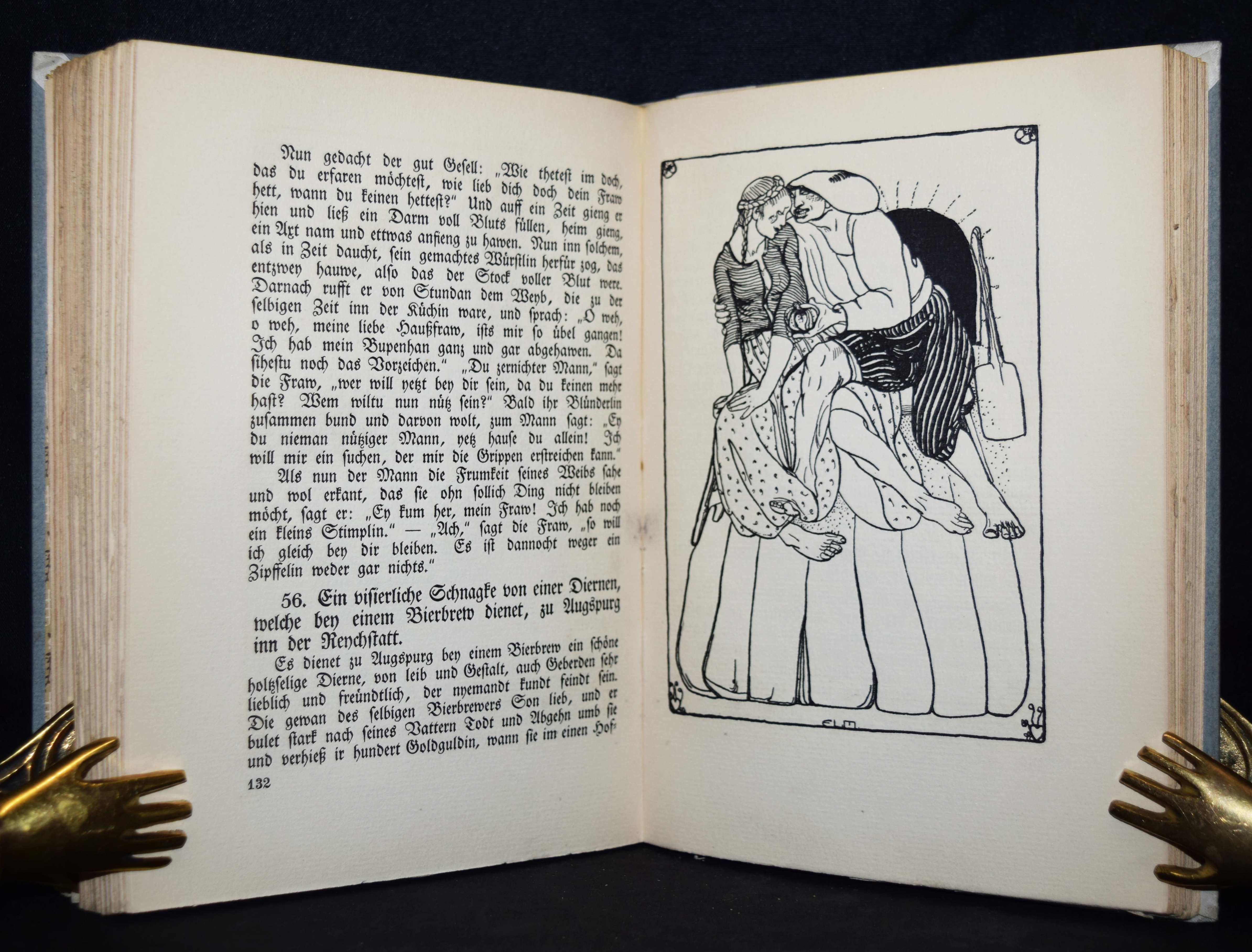 Frischlin, Leonhart (Auswahl). Deutsche Schwänke. 79 kurtzweylig Schwenck- und Fatzbossen gesammlet. Leipzig, Zeitler 1906. 8°. 190 S., 1 Bl. mit Titelbild von Ignatius Taschner u. 10 ganzs. Illustrationen von Elena Luksch-Makowska. OHln. d. Zt. mit goldgepr. Rückentitel u. Deckelvignette. Erste Ausgabe. – Nr. 335 von 950 num. Exemplaren. – Gutes Exemplar.