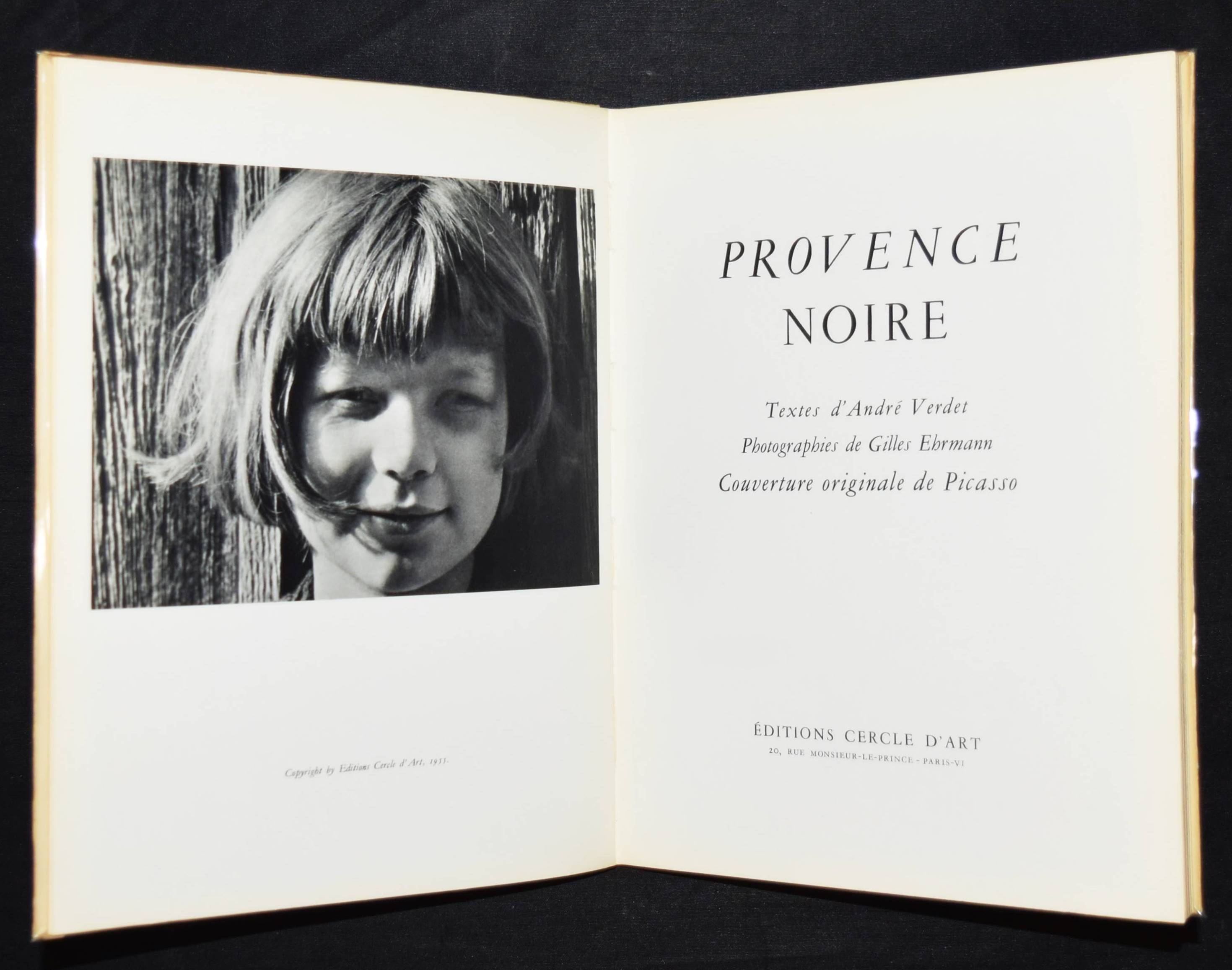 Ehrmann – Verdet, André. Provence noire. Photographies de Gilles Ehrmann. Couverture originale de Picasso. Paris, Éditions Cercle d’Art (1955). 8°. 142 S., [1] Bl. mit meist ganzs. Abb. OKart. mit illustr. OU. Erste Ausgabe. – Der franz. Schauspieler und Fotograf G. Ehrmann (1928-2005) studierte 1946 bis 1949 an der École nationale supérieure des arts décoratifs in Paris und gründete die Avantgarde-Theatergruppe „Ceux-là“. Während dieser Zeit lernte er auch einige Vertreter des Surrealismus kennen. 1950 begann er zu fotografieren. Er porträtierte Chagall, Picasso und andere Künstler und lernte den Schriftsteller, Maler und Bildhauer Anré Verdet (1913-2004) kennen. – A. Verdet war mit vielen bedeutenden Malern (Georges Braque, Marc Chagall, Hans Hartung, Fernand Léger, Henri Matisse und Pablo Picasso) befreundet. 1977 traf er Bill Wyman von den Rolling Stones und Jon Anderson, den Lead-Sänger von Yes. Verdet gründete daraufhin eine eigene Gruppe und nannte sie Bételgeuse. – Schutzumschlag am Rücken etwas gebräunt, Kanten und Gelenke etwas berieben, gutes Exemplar.