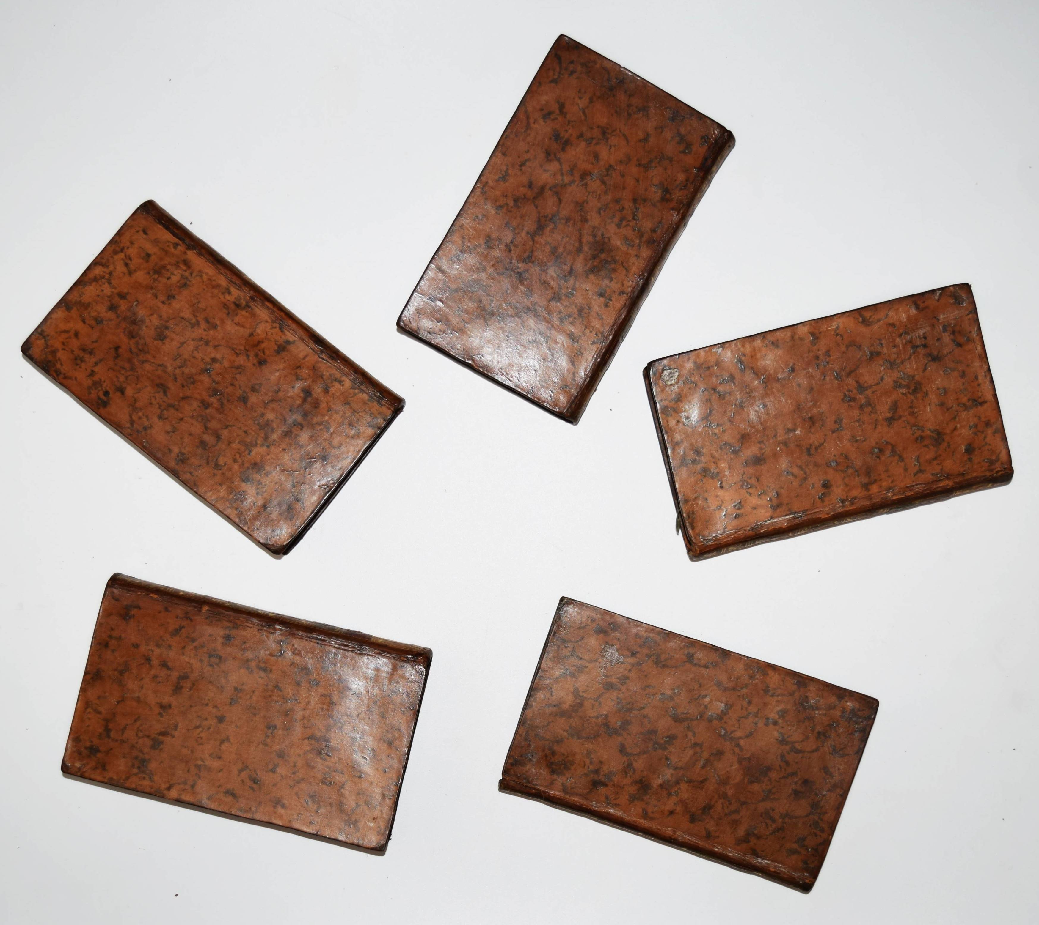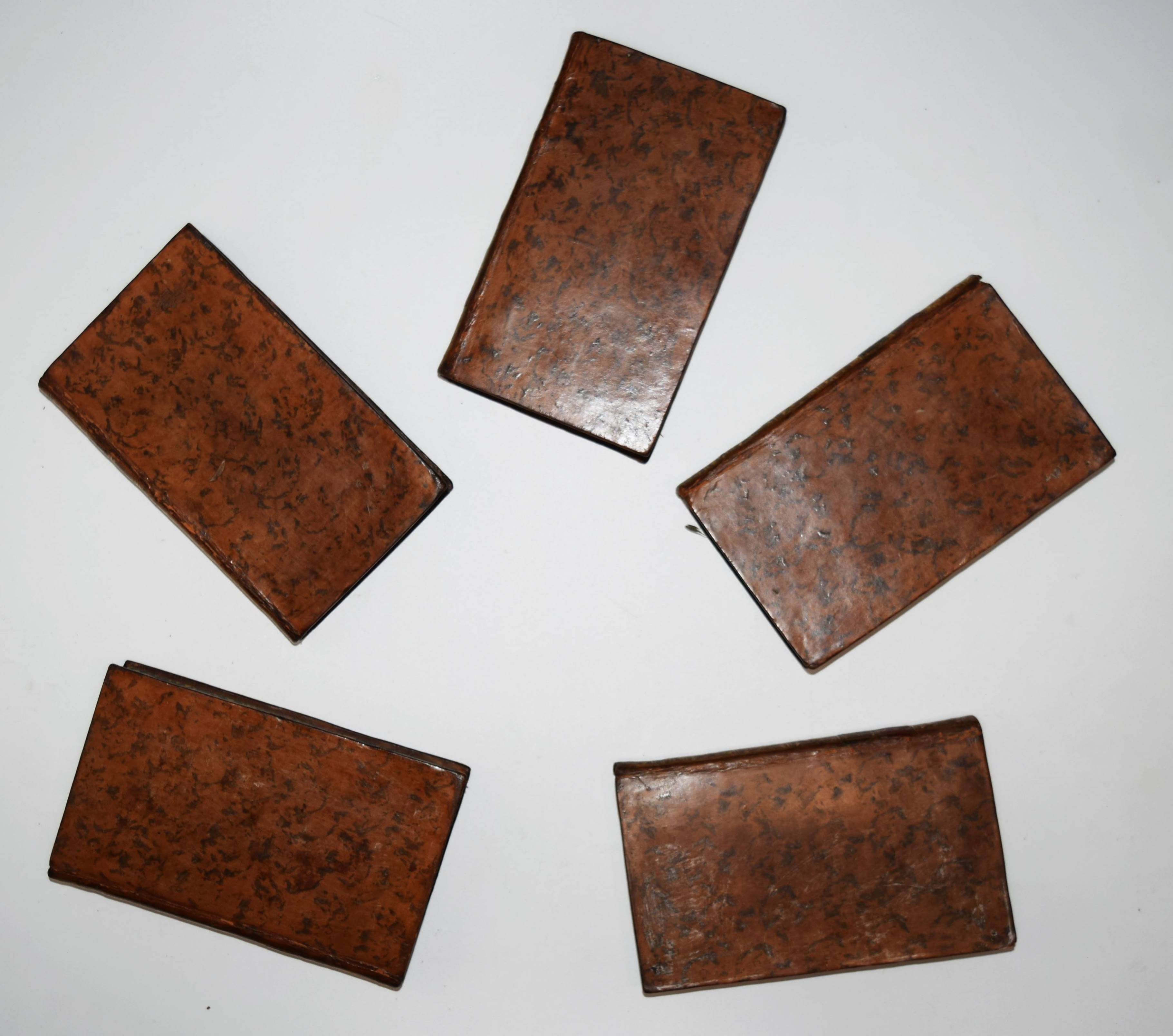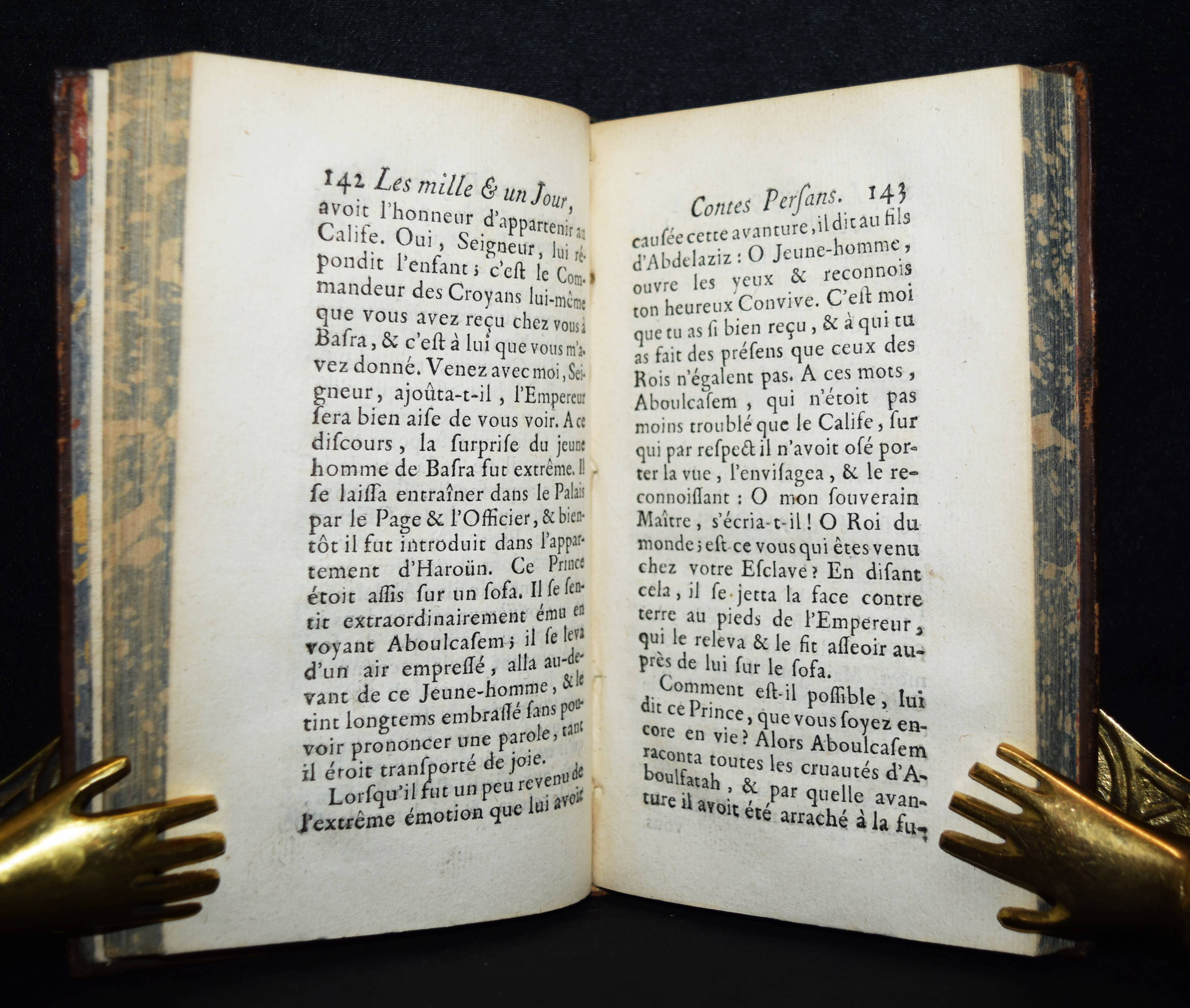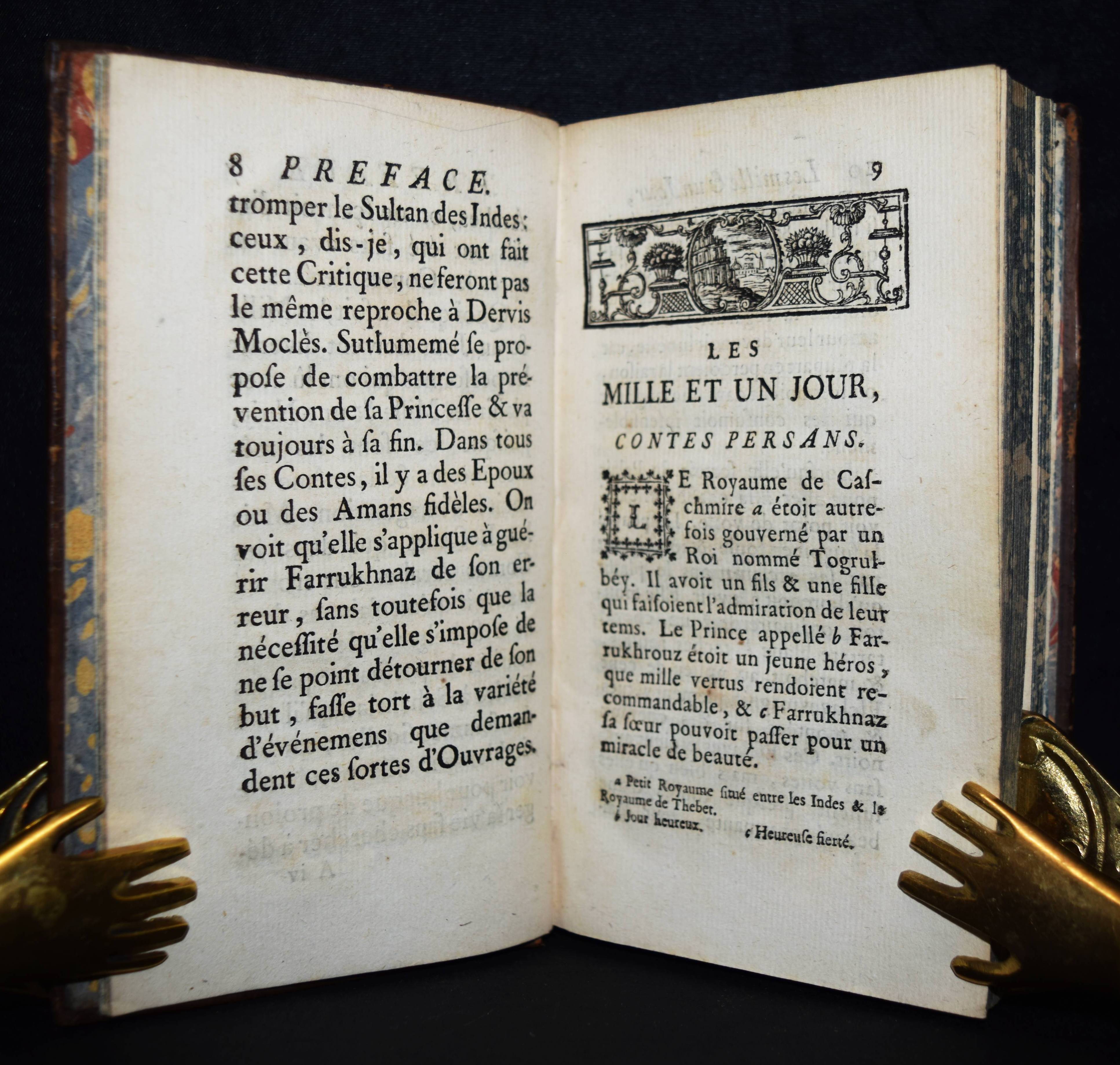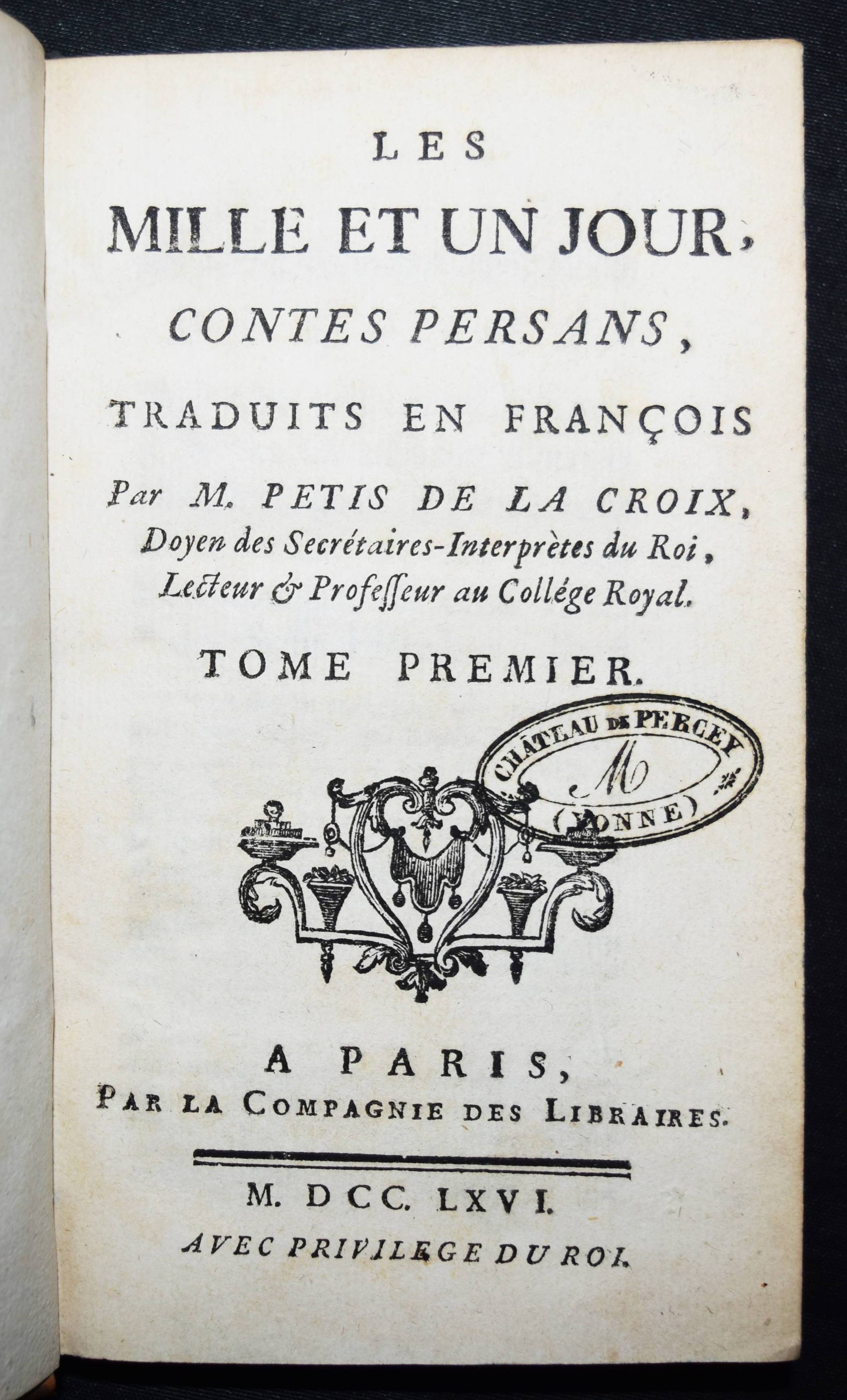 Tausend und eine Nacht – Pétis de la Croix, (Francois). Les mille et un jour (sic), contes persans. 5 Bände. Paris, Compaigne des Librairies 1766. Kl.-8°. Kalbslederbände der Zeit mit goldgepr. Rückensch. u. floraler Rückenvergoldung. Barbier III, 300. Chauvin IV, 312. Cioranescu 49661. Graesse IV, 525. Quérard VII, 85. – Erschien zuerst 1711 in Amsterdam. – Seltene Adaption des franz. Orientalisten F. Pétis de la Croix (1653-1713). Es handelt sich dabei um eine eigenständige Dichtung von Pétis de la Croix, wobei dieser verschiedene orientalische Quellen benutzte. Im Vorwort behauptet der Autor es handele sich um eine Übersetzung aus dem Persischen eines „derviche Fidèle“ von Hazâr Yêk Roûz (Tausend und ein Tag). – F. Pétis de la Croix, wie sein Vater arabischer Übersetzer am französischen Hof, war Sekretär des französischen Botschafters in Marokko und Übersetzer der französischen Streitkräfte in Algerien. Nach seiner Rückkehr nach Frankreich erhielt er 1692 einen Lehrstuhl für Orientalistik am Collège Royal de France. – Band III am Kapital und Fuß restauriert, St.a.T. (″Chateau de Percey, Yonne“), nur vereinzelt leicht braunfleckig, schönes dekorativ gebundenes Exemplar aus einer Schloßbibliothek.
