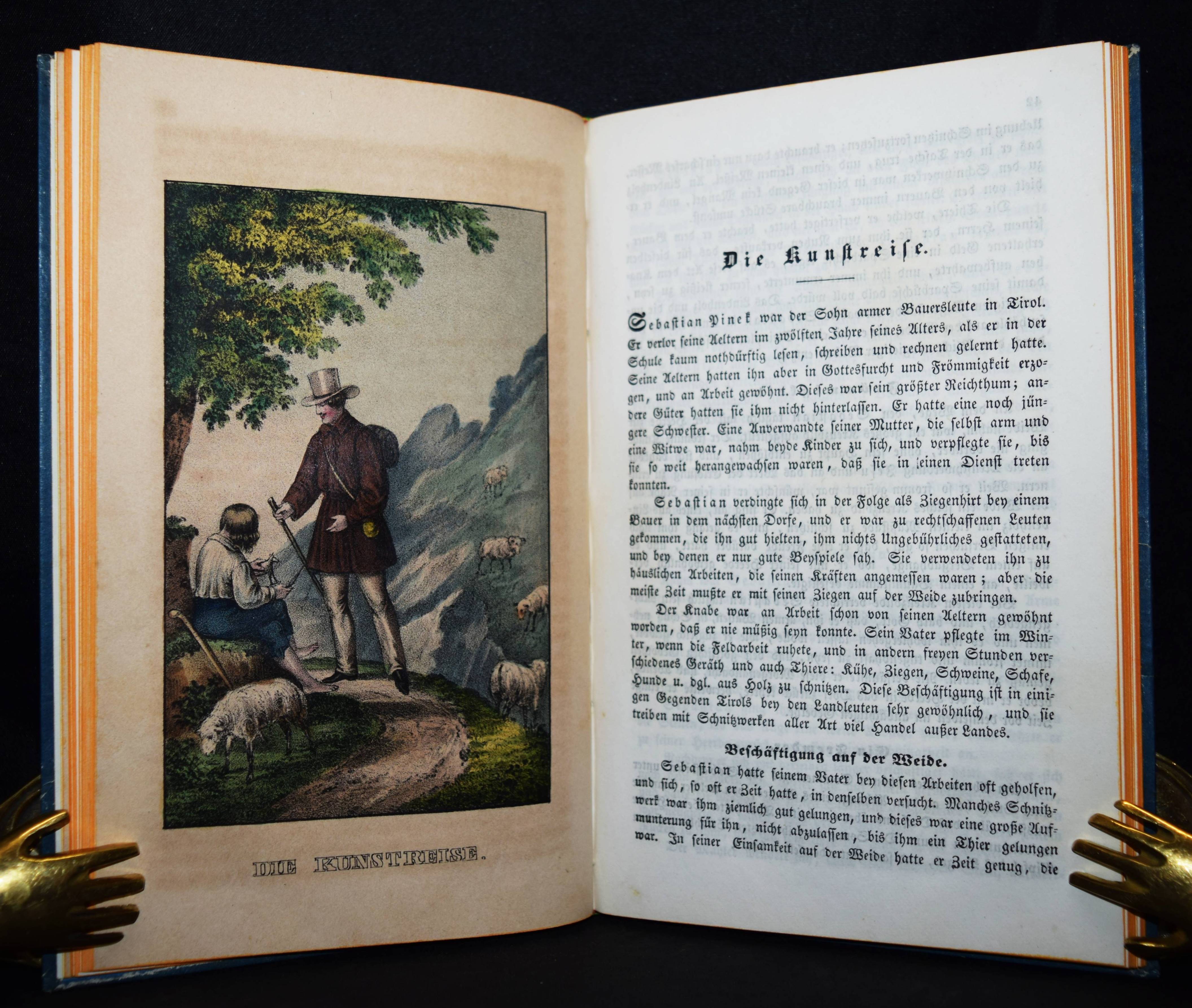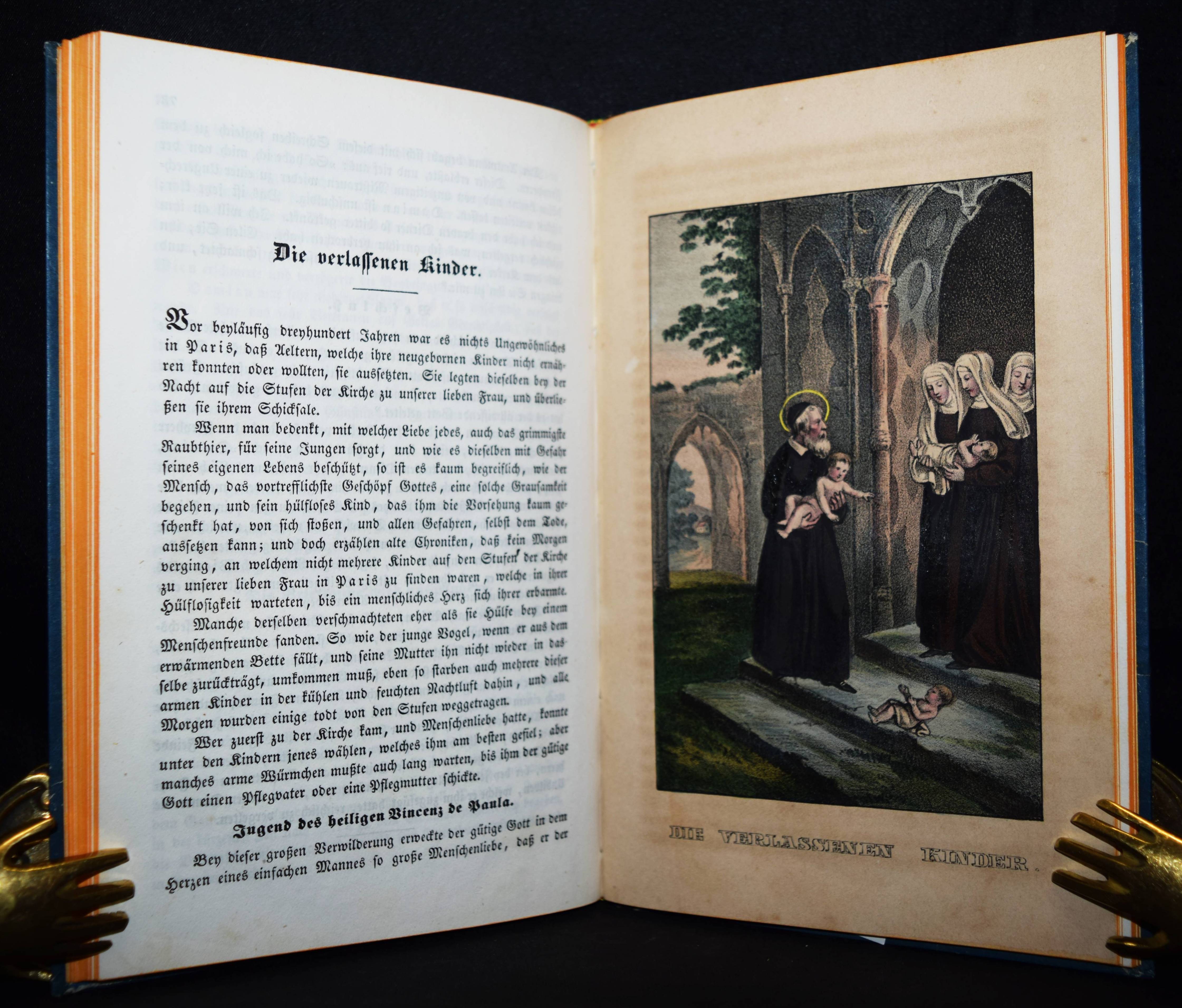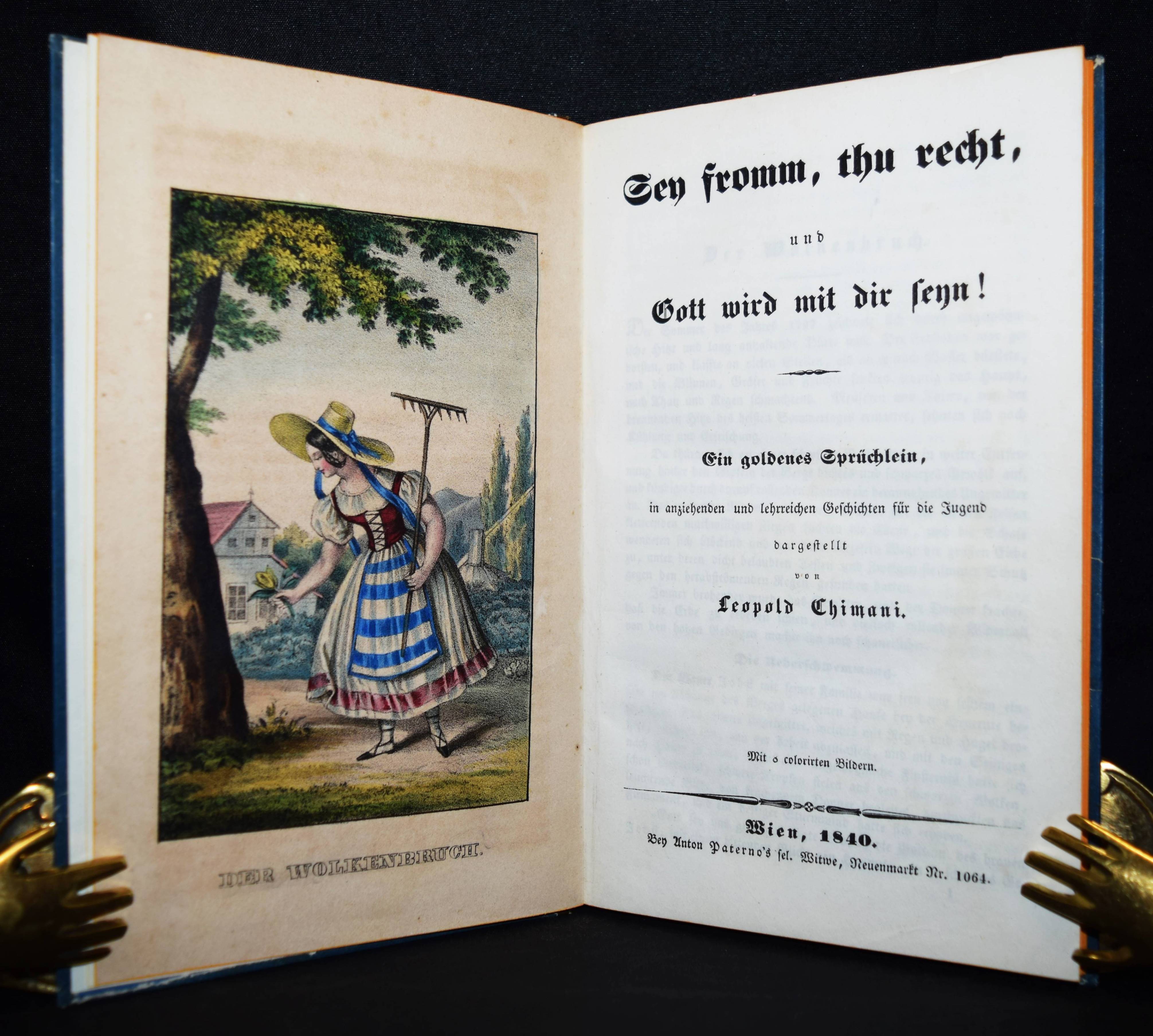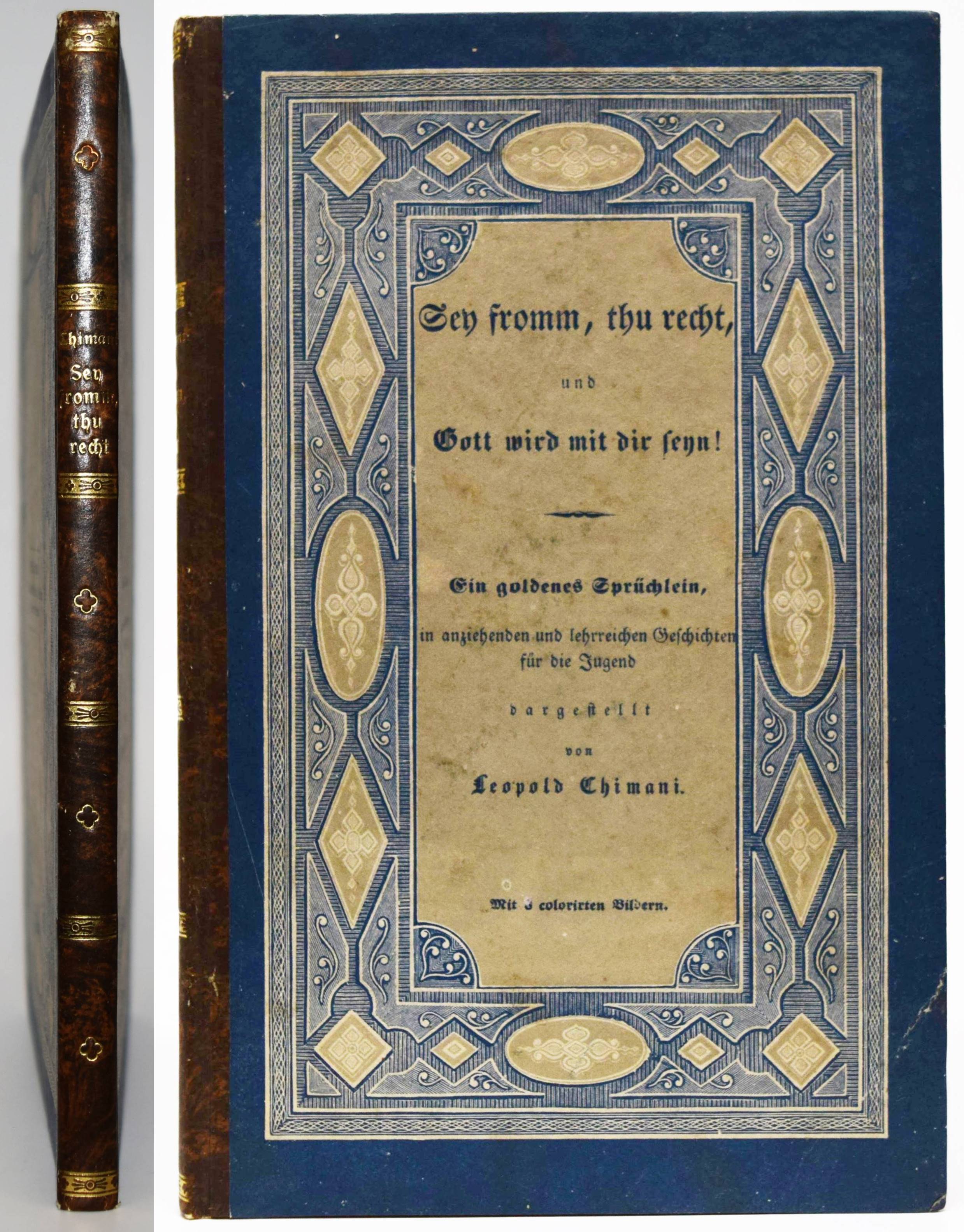 Chimani, Leopold. Sey fromm, thu recht, und Gott wird mit dir seyn! Ein goldenes Sprüchlein, in anziehenden und lehrreichen Geschichten für die Jugend dargestellt. Wien, Anton Paterno seel. Wittwe 1840. 8°. Titel, 94 (statt 98) S., [1] Bl. mit 6 handkol. lithogr. Tafeln. Typogr. OPbd. mit goldgepr. Rückentitel u. Rückenvergoldung. Vgl. LKJ IV, 116 ff. – Zweite veränderte Ausgabe; die erste Ausgabe erschien 1831 mit dem Titel „Sey fromm, fleißig und ehrlich und Gott wird Dir helfen: in lehrreichen Geschichten dargestellt zur Erbauung und Nachahmung für Jung und Alt“ bei Mausberger in der Reihe „Der erzählende Kinderfreund im Kreise guter und wißbegieriger Söhne und Töchter“ (Band 3). – Die schönen teils mit Eiweiß gehöhten Tafeln zu den Geschichten „Der Wolkenbruch“, „Cölestin“, „Das Mädchen ohne Mutter“, „Die Kunstreise“, „Verdacht und Ehrenrettung“ und „Die verlassenen Kinder“. – 2 Blatt (S. 49/50 u. 79/80) fehlen, die Tafeln papierbedingt gebräunt, sonst außergewöhnlich gut erhalten.