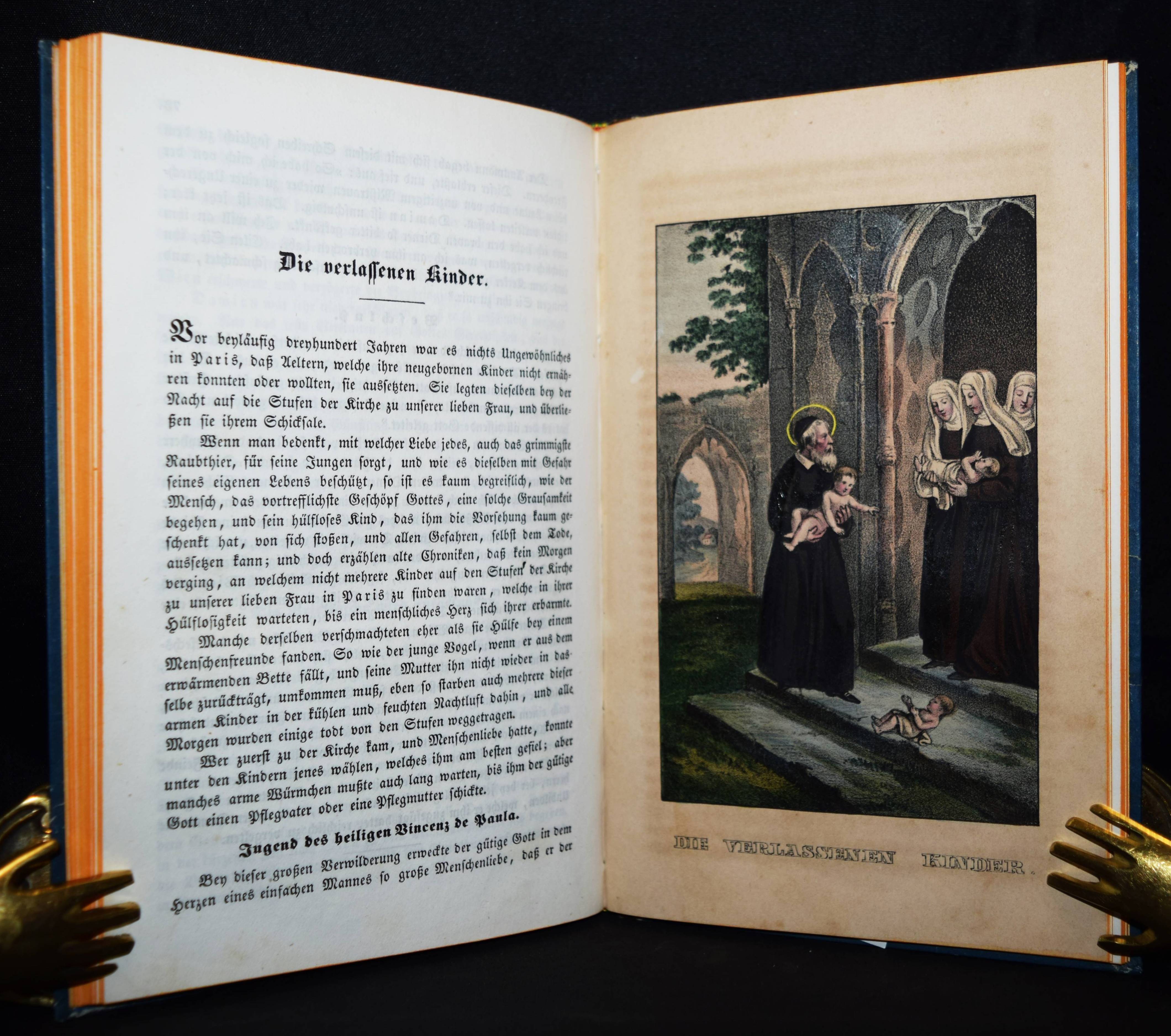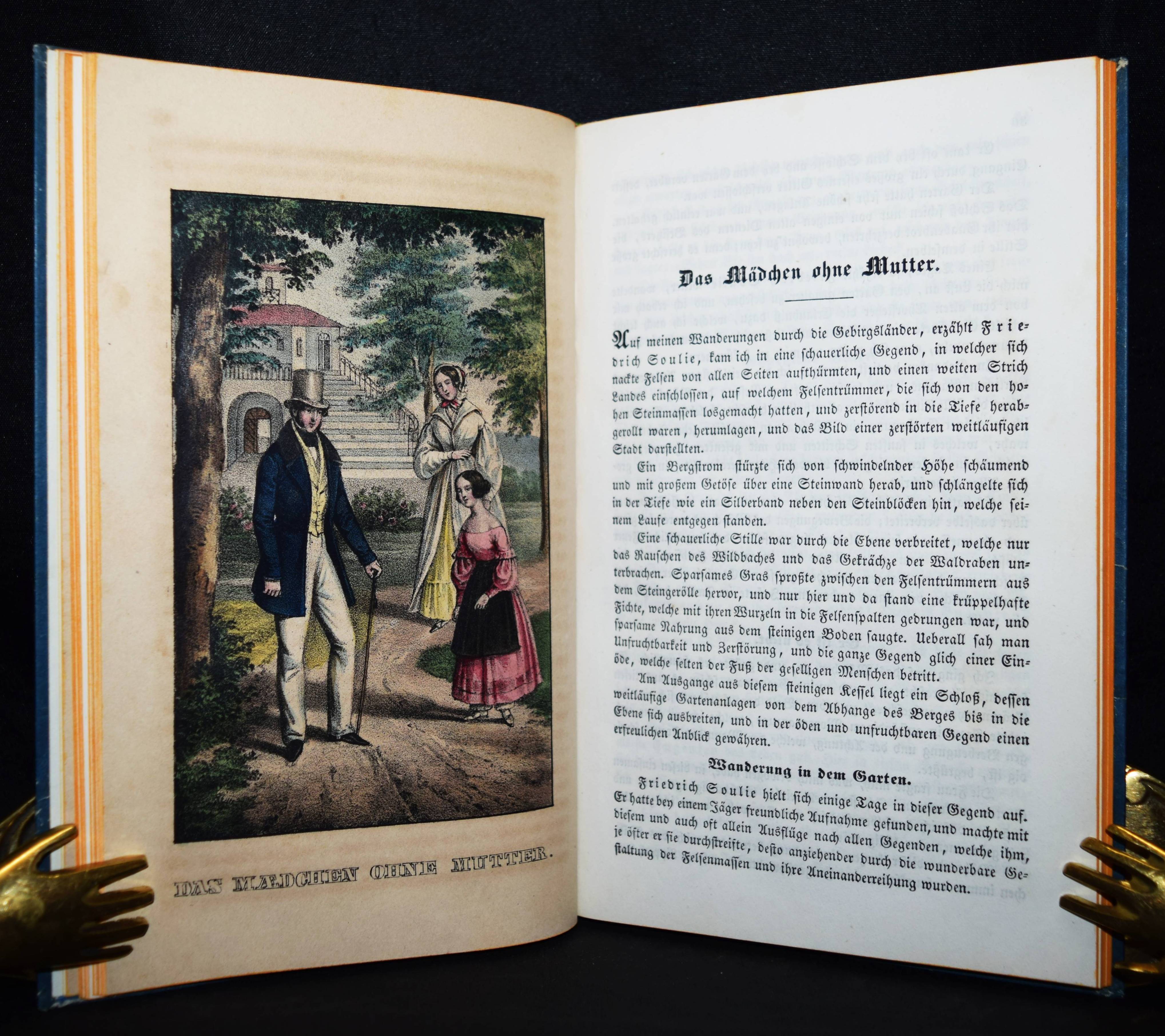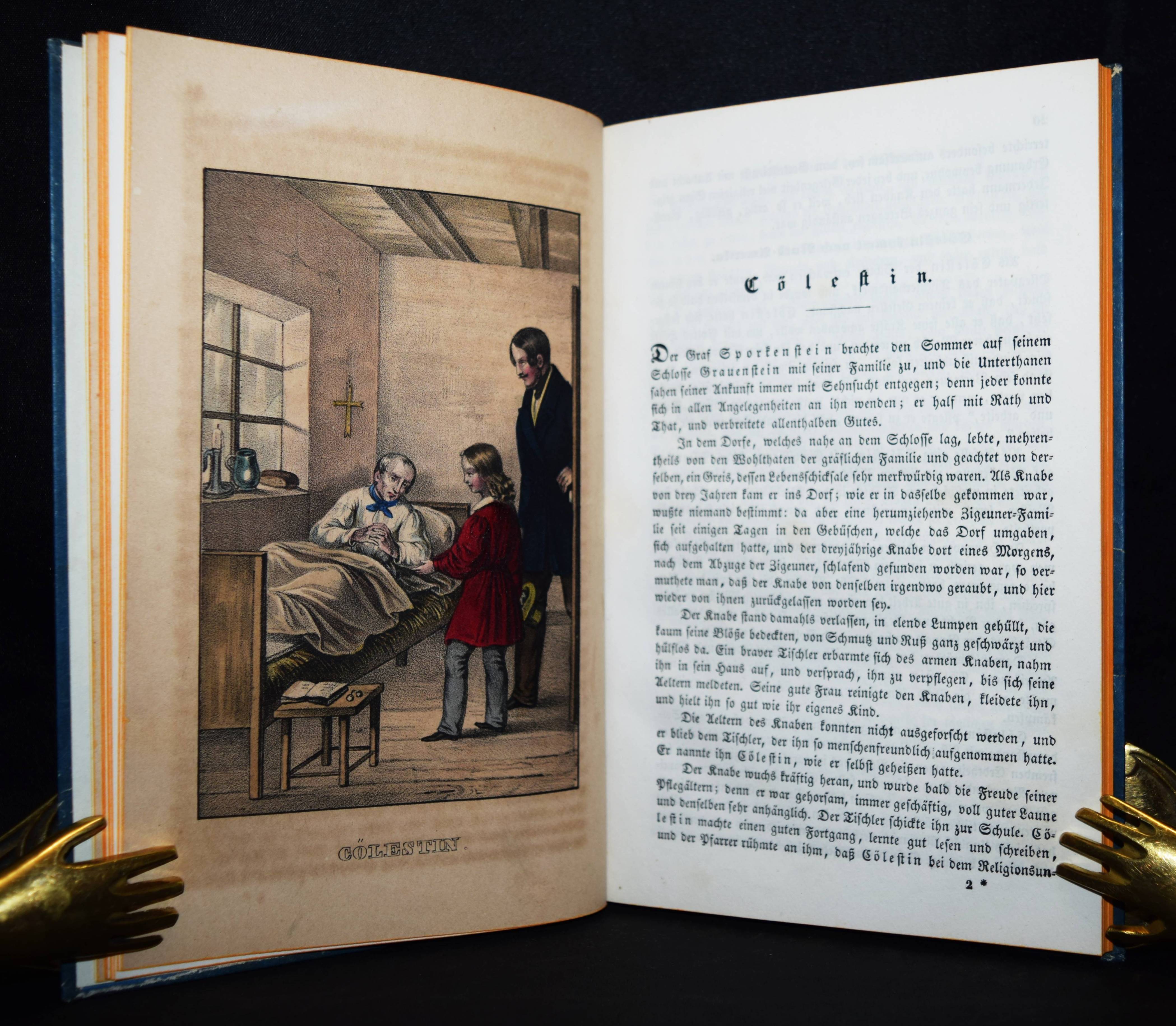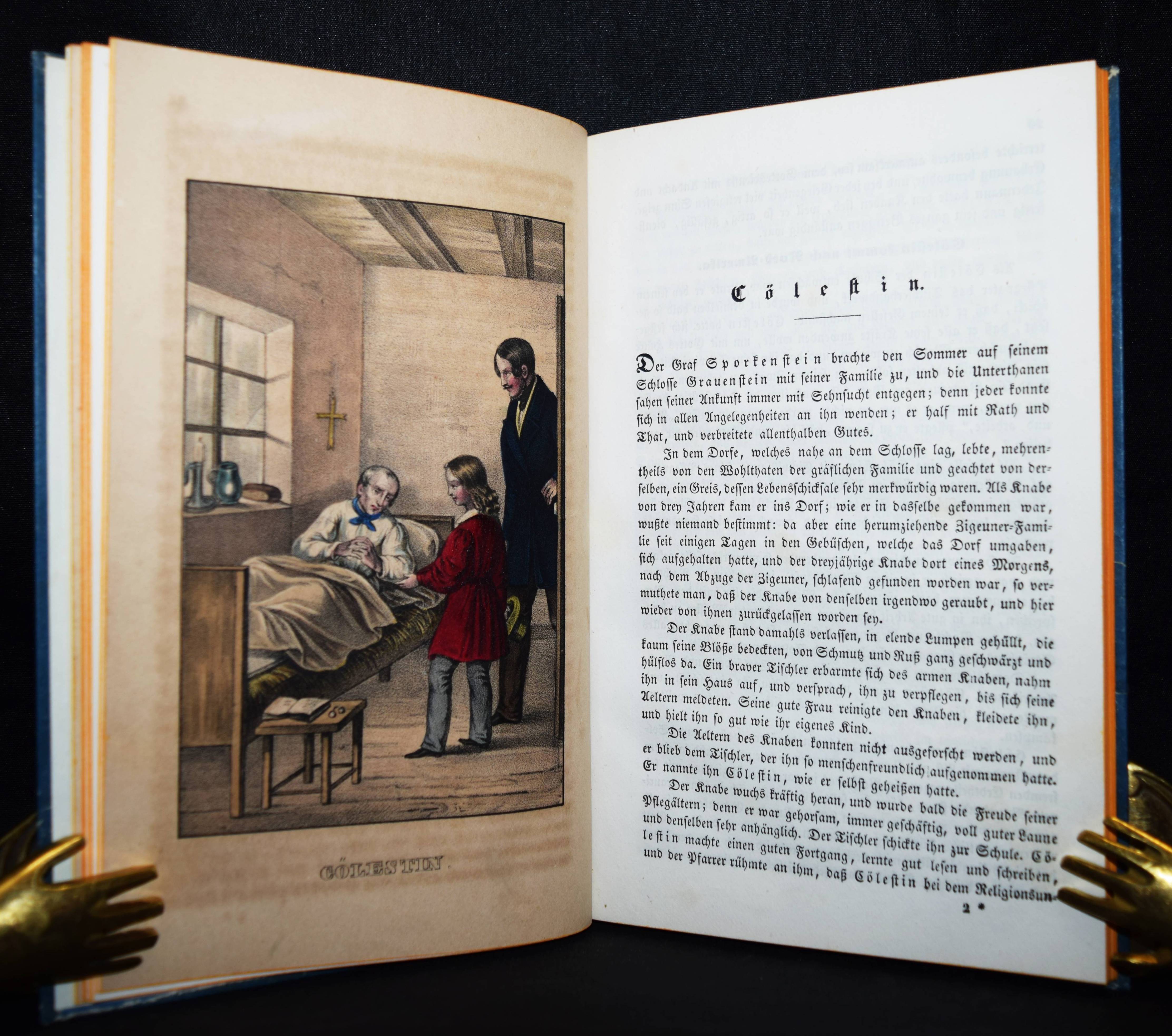 Chimani, Leopold. Sey fromm, thu recht, und Gott wird mit dir seyn! Ein goldenes Sprüchlein, in anziehenden und lehrreichen Geschichten für die Jugend dargestellt. Wien, Anton Paterno seel. Wittwe 1840. 8°. Titel, 94 (statt 98) S., [1] Bl. mit 6 handkol. lithogr. Tafeln. Typogr. OPbd. mit goldgepr. Rückentitel u. Rückenvergoldung. Vgl. LKJ IV, 116 ff. – Zweite veränderte Ausgabe; die erste Ausgabe erschien 1831 mit dem Titel „Sey fromm, fleißig und ehrlich und Gott wird Dir helfen: in lehrreichen Geschichten dargestellt zur Erbauung und Nachahmung für Jung und Alt“ bei Mausberger in der Reihe „Der erzählende Kinderfreund im Kreise guter und wißbegieriger Söhne und Töchter“ (Band 3). – Die schönen teils mit Eiweiß gehöhten Tafeln zu den Geschichten „Der Wolkenbruch“, „Cölestin“, „Das Mädchen ohne Mutter“, „Die Kunstreise“, „Verdacht und Ehrenrettung“ und „Die verlassenen Kinder“. – 2 Blatt (S. 49/50 u. 79/80) fehlen, die Tafeln papierbedingt gebräunt, sonst außergewöhnlich gut erhalten.
