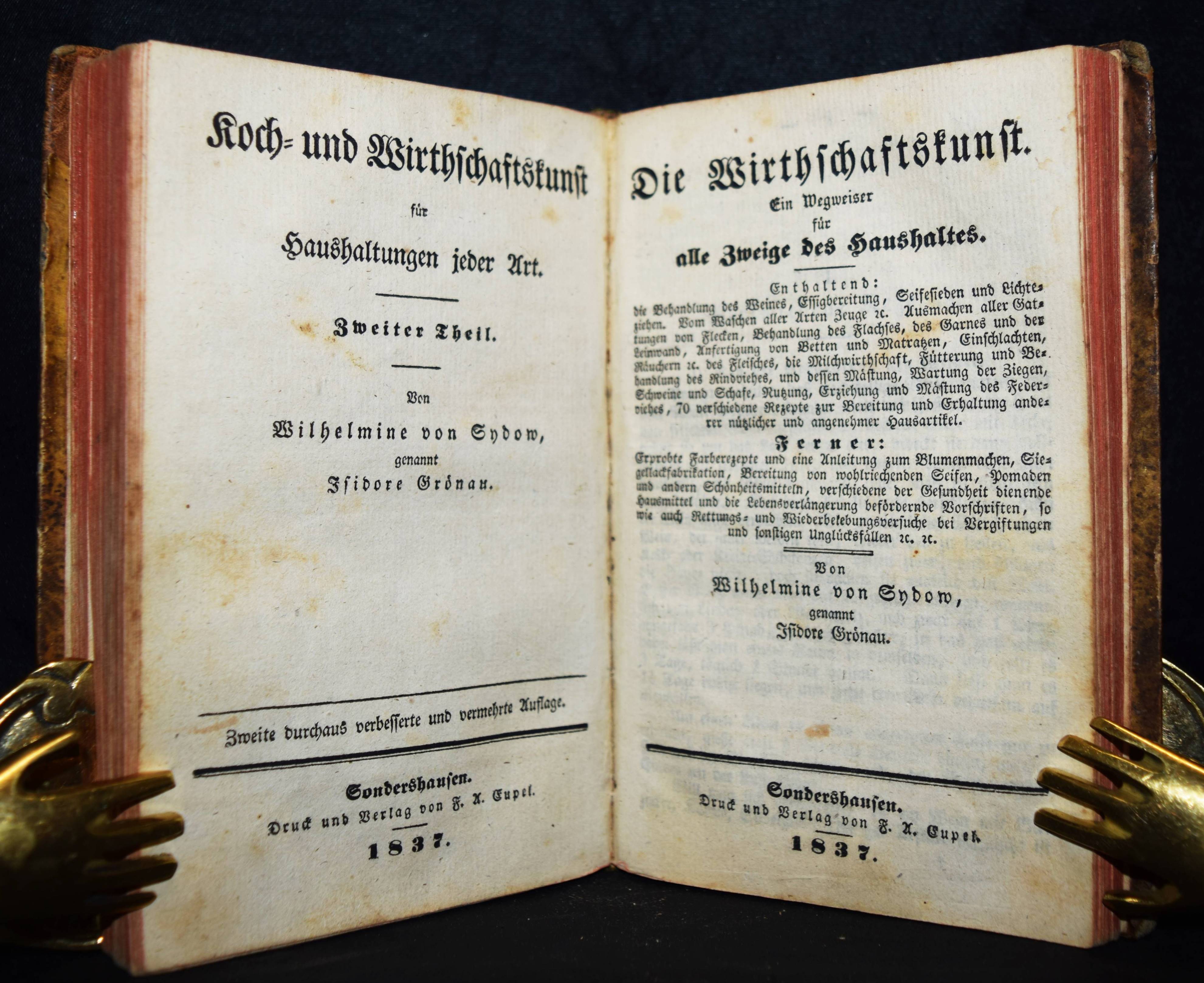Sydow, Wilhelmine v. (gen. Isidore Grönau). Koch- und Wirthschaftskunst für Haushaltungen jeder Art. 2. verb. u. verm. Aufl. 2 Teile in 1 Band. Sondershausen, F. X. Eupel 1837. Kl.-8°. 341, (1) S.; [3] Bl., 176, 10 S. Hldr. d. Zt. mit goldgepr. Rückenschild. Methler 5546. Weiss 3786. Vgl. Georg 1373 (erste Ausgabe von 1834). – I. Die Kochkunst in der Stadt wie auf dem Lande … für Freunde kräftiger Hausmannskost so wie für Feinschmecker. – II. Die Wirthschaftskunst. Ein Wegweiser für alle Zweige des Haushaltes. – Behandelt u.a. Wein, Essig, Seife, Schlachten u. Räuchern, Haltung des Viehs, Kosmetika, Arzneimittel u.v.a. – „Wilhelmine von Sydows (1789-1867) „Koch- und Wirthschaftsbuch“ besteht aus einer Sammlung selbst erprobter Rezepte, wechselnder „Führung der verschiedenartigen großen und kleinen Haushaltungen in der Stadt wie auf dem Lande“ entstammend, bereichert um die besten und vorzüglichsten Kochvorschriften aus anderen Werken“ (W. Methler). – Einband teils stärker berieben und etwas bestoßen, stellenweise braun- u. fingerfleckig.