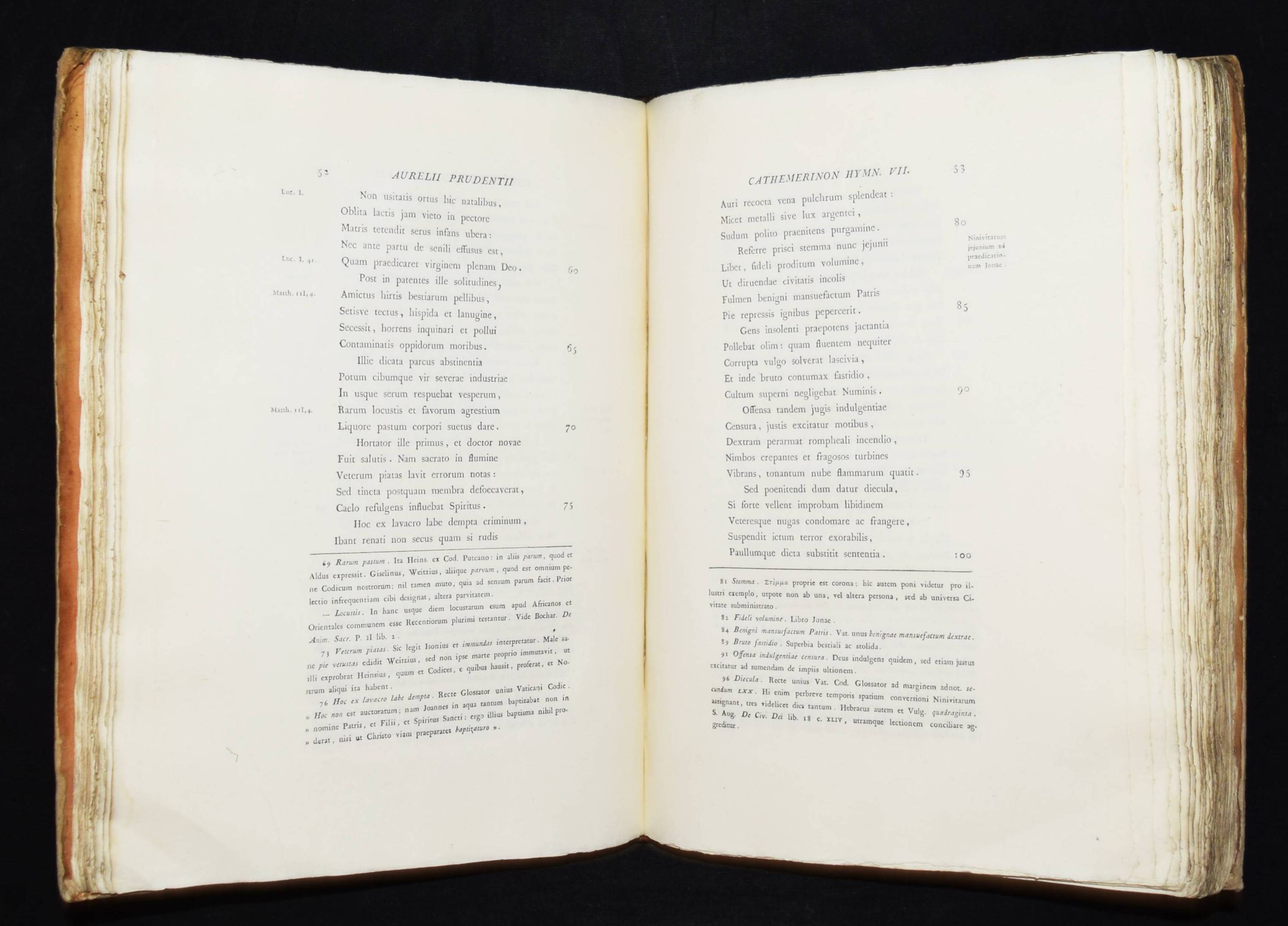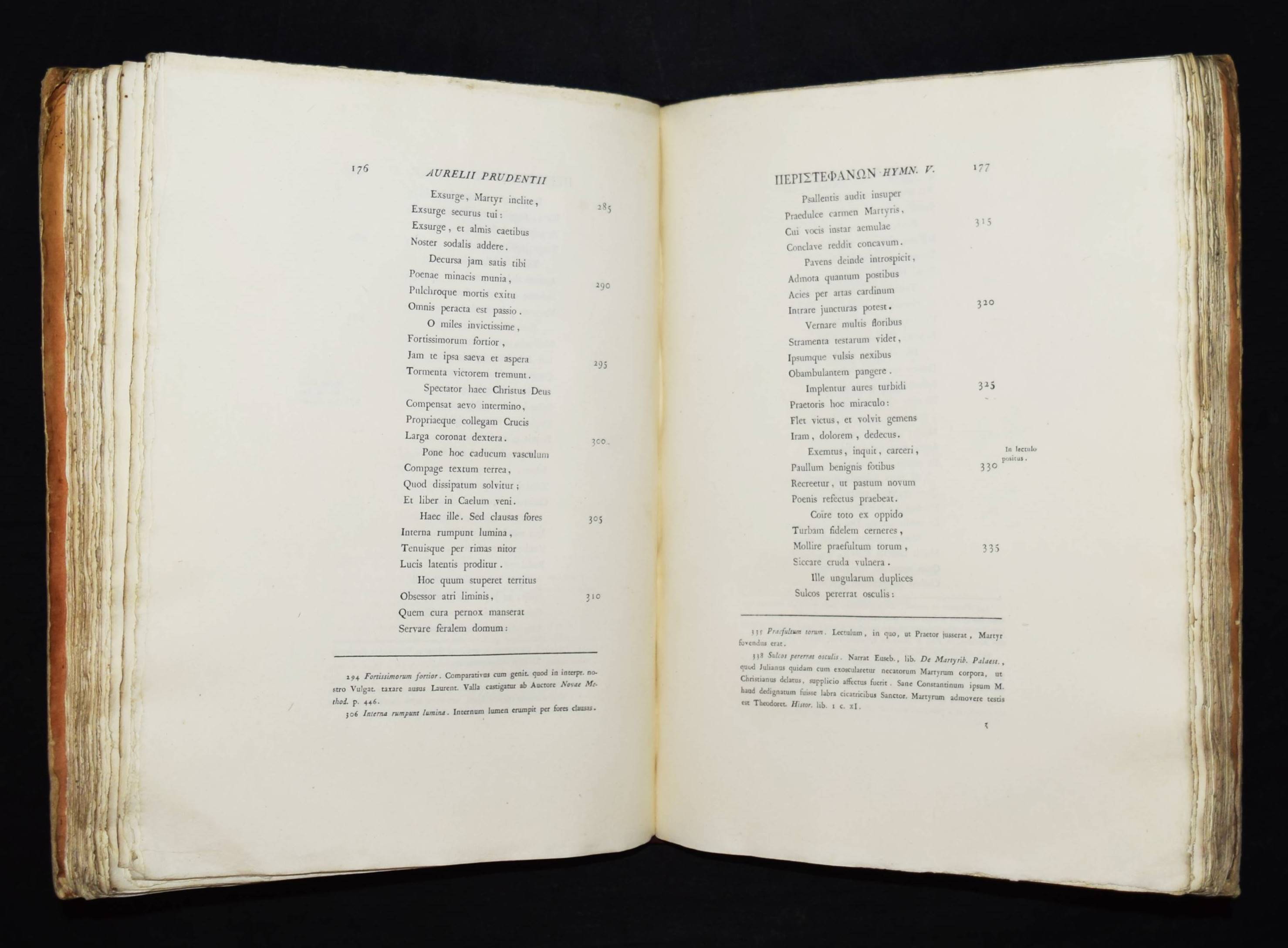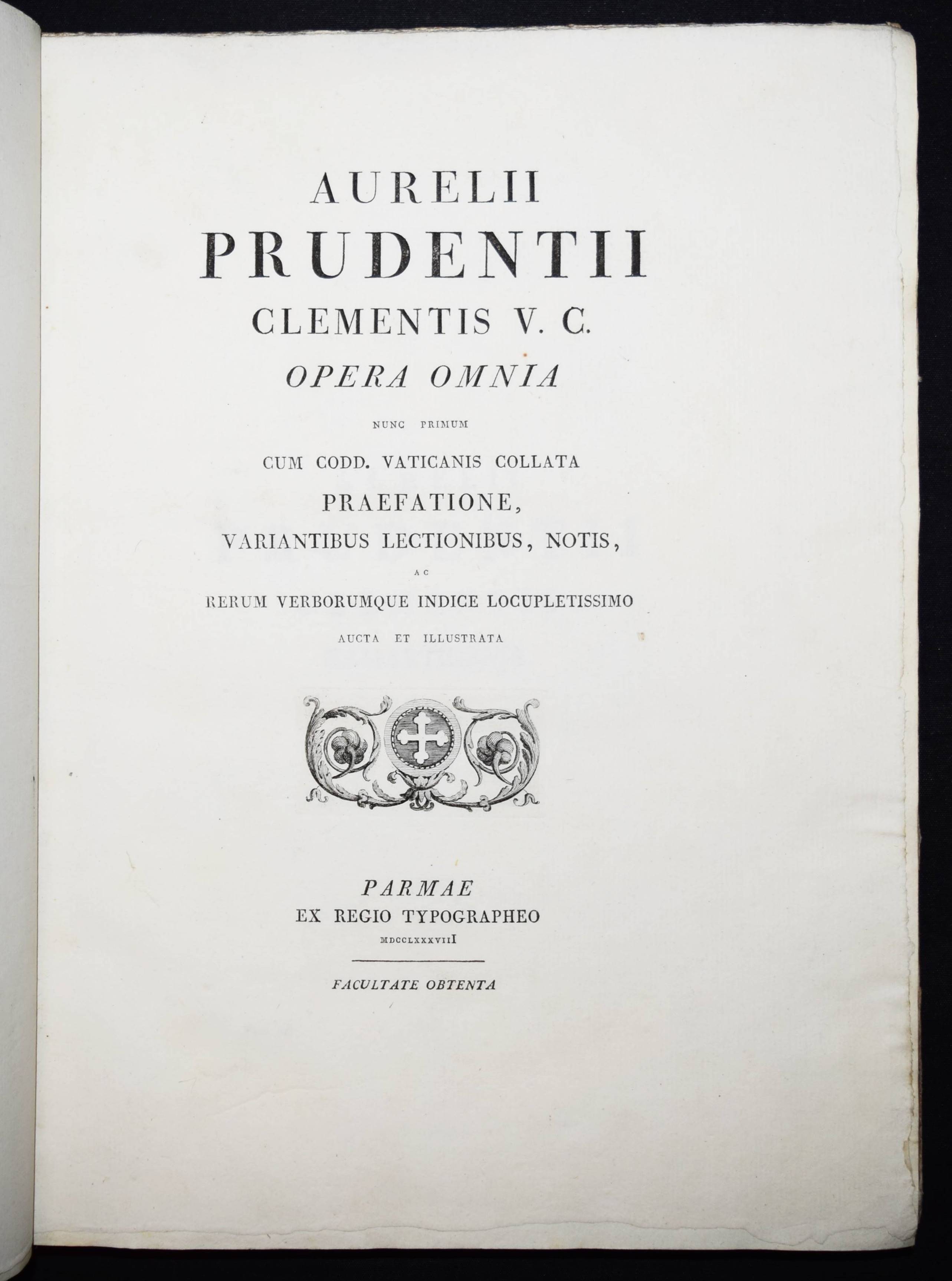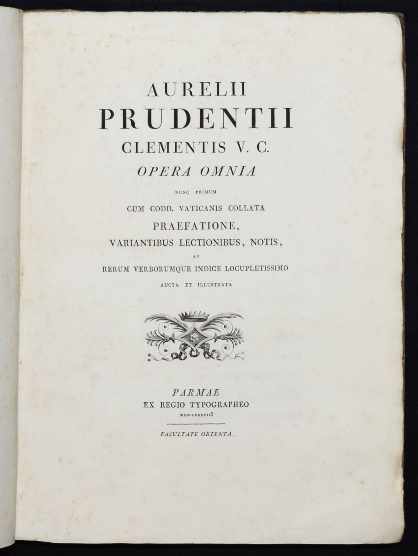 Bodoni – Prudentius (Aurelius P. Clemens). Opera omnia. Nunc primum cum codd. Vaticanis collata. Praefatione, variantibus lectionibus, notis, rerum verborimque indice locupletissimo aucta et illustrata (di Joseph Teoli). 2 Bände. Parma, Ex Regio typographeo (Johann Baptist Bodoni) 1788. 4° (31 x 23,5 cm.). [5] Bl., 71, (1) S., [1] Bl., 361 S.; [2] Bl., 284 S., [1] Bl. (Errata) Weinrote Halb-Maroquinlederbände der Zeit mit goldgepr. Rückensch. und floraler Rückenvergoldung. Brooks 361. Brunet IV, 916: „Édition fort belle“. De Lama II, 52. Weiß 101. – „Edizione sorvegliata da Bodoni e ben lo scorge chi ne esamina i pregi tipografici“ (Brooks). – Die hervorragende Leistung des Druckers Bodoni wird vom Herausgeber Joseph Teoli in seiner Widmung an Joseph Nicolaus Azara, dem kaiserlichen Legaten am päpstlichen Hofe, der die Publikation großzügig unterstützt hatte, explizit hervorgehoben: „Opus in lucem protrahere libentissime suscepisti. Neque id solum; sed etiam Typographum omnium praestantissimum elegisti, Johann. Baptistam Bodonium, ut nihil omnino quod ad Operis dignitatem splendoremque conferret, desideraretur“ (Bl. IV). – Prudentius (348- ca. 405), „aus Spanien (wahrscheinlich Tarragona), der größte christliche lateinische Dichter der Antike. Nach öffentlicher Wirksamkeit wandte er sich, wohl von Ambrosius angeregt, der Poesie zu. Seine (sämtlich erhaltenen) Werke sind: „Tageszeitenbuch“ (Cathemerinon liber), 10 Gedichte für die einzelnen Abschnitte des Tages, dazu 2 Festlieder (für Weihnachten und Epiphanias); „Über die Märtyrerkronen“ (Peristephanon), 14 Gedichte über Leiden und Tod einzelner Heiliger; „Apotheosis“, die katholische Lehre von der Dreifaltigkeit; „Ursprung der Sünde“ (Hamartigenia), gegen den Dualismus Markions, am Schluß die erste erhaltene poetisch bedeutende Schilderung von Hölle und Paradies: „Der Kampf um die Seele“ (Psychomachia), die Überwindung der heidnischen Laster durch die christlichen Tugenden, das in der Folgezeit wegen seiner Allegorien beliebteste Werk des P.; ferner ein Gedicht gegen Symmachus, den Verteidiger des alten Glaubens, und die „Doppelte Erquickung (oder: Speise)“ (Dittochaeon, vielleicht handschriftlich verdorben aus Ditropheum), Erläuterungen zu Bildern nach Szenen des Alten und Neuen Testaments in je 4 Hexametern. In P.’Dichtung verbinden sich harmonisch klassische Form und christlicher Geist“ (Tusculum Lexikon). – Deckel teils stärker berieben und etwas angestaubt, sehr schönes sauberes, breitrandiges und dekorativ gebundenes Exemplar.