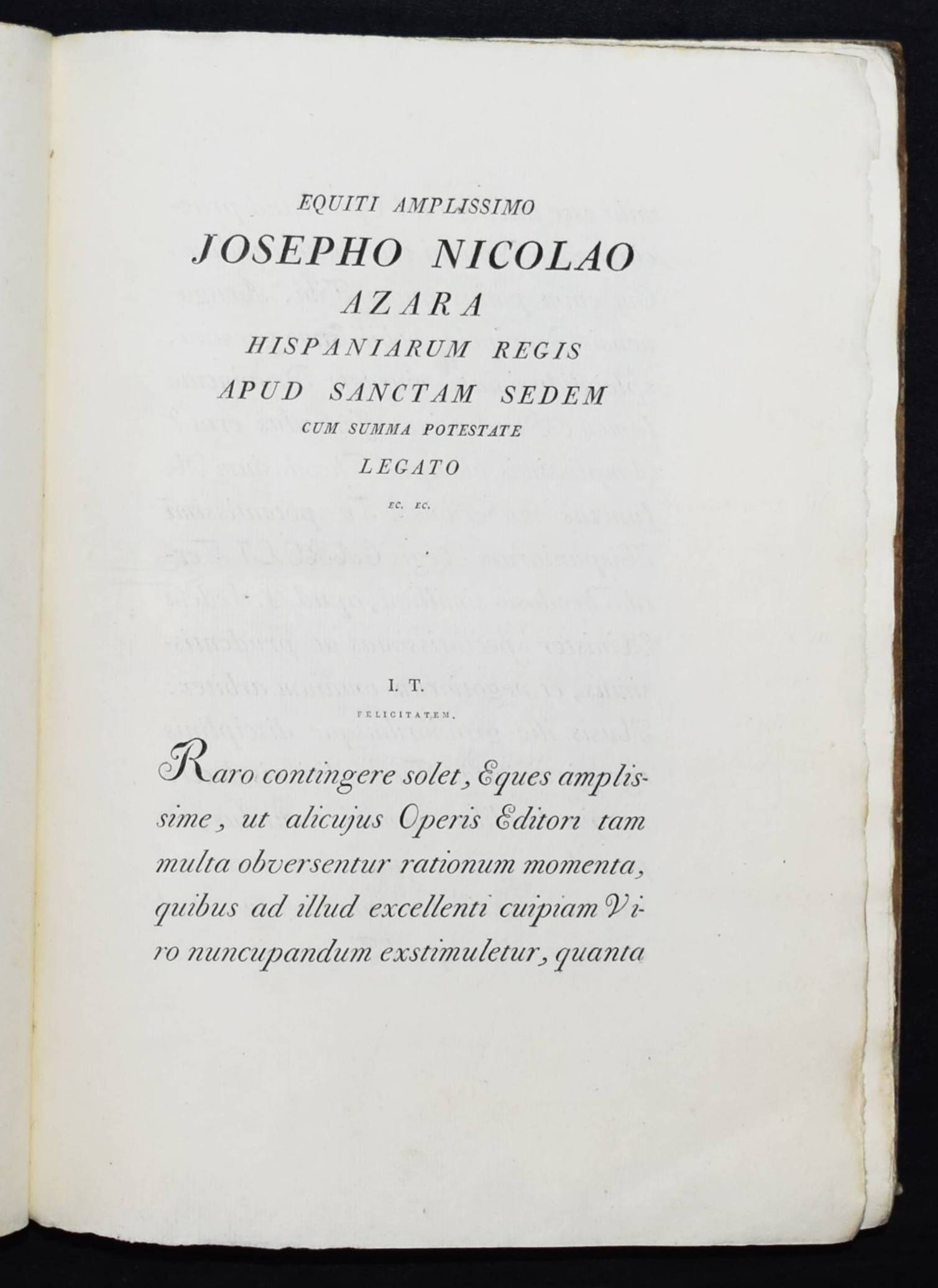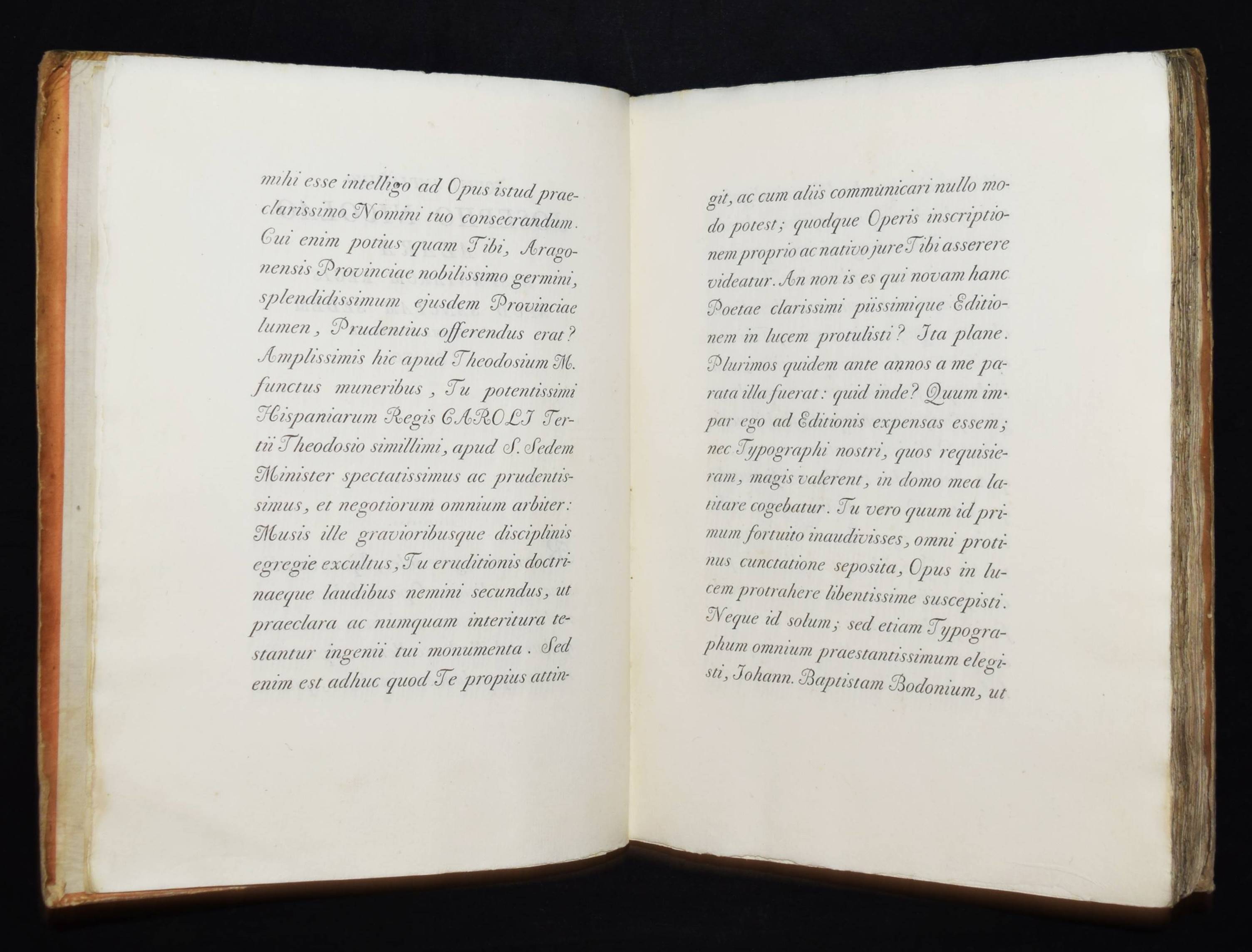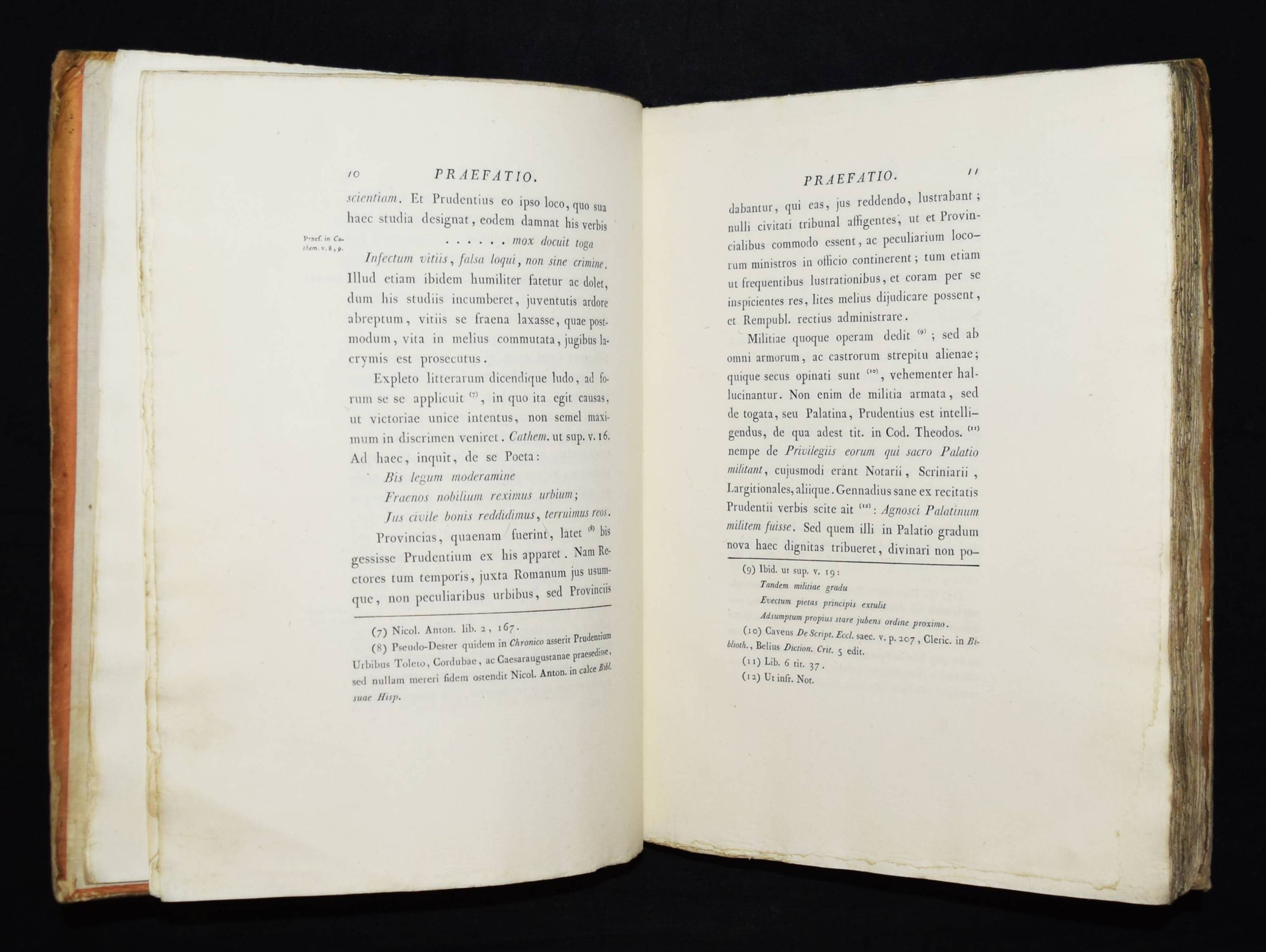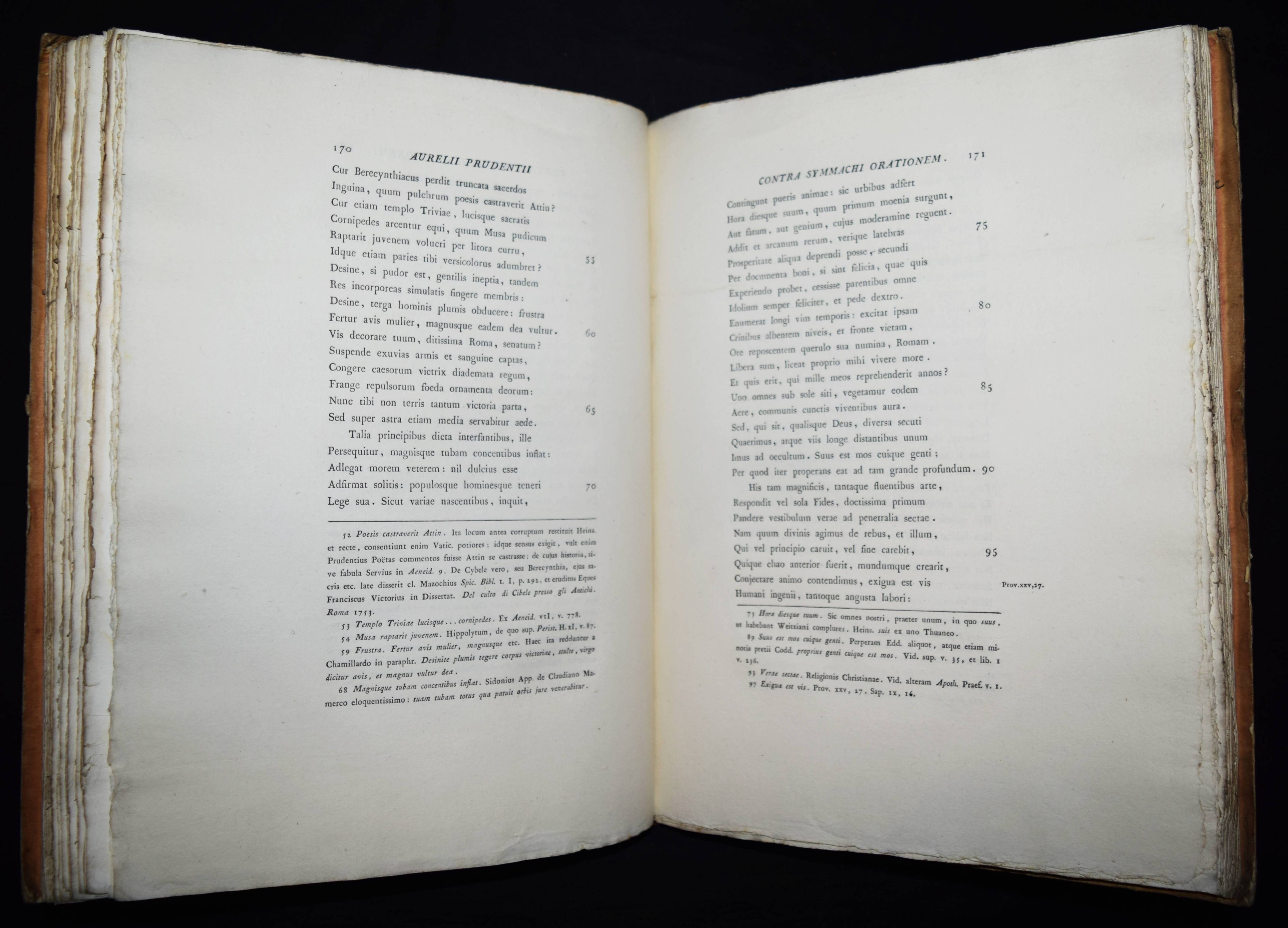 Bodoni – Prudentius (Aurelius P. Clemens). Opera omnia. Nunc primum cum codd. Vaticanis collata. Praefatione, variantibus lectionibus, notis, rerum verborimque indice locupletissimo aucta et illustrata (di Joseph Teoli). 2 Bände. Parma, Ex Regio typographeo (Johann Baptist Bodoni) 1788. 4° (31 x 23,5 cm.). [5] Bl., 71, (1) S., [1] Bl., 361 S.; [2] Bl., 284 S., [1] Bl. (Errata) Weinrote Halb-Maroquinlederbände der Zeit mit goldgepr. Rückensch. und floraler Rückenvergoldung. Brooks 361. Brunet IV, 916: „Édition fort belle“. De Lama II, 52. Weiß 101. – „Edizione sorvegliata da Bodoni e ben lo scorge chi ne esamina i pregi tipografici“ (Brooks). – Die hervorragende Leistung des Druckers Bodoni wird vom Herausgeber Joseph Teoli in seiner Widmung an Joseph Nicolaus Azara, dem kaiserlichen Legaten am päpstlichen Hofe, der die Publikation großzügig unterstützt hatte, explizit hervorgehoben: „Opus in lucem protrahere libentissime suscepisti. Neque id solum; sed etiam Typographum omnium praestantissimum elegisti, Johann. Baptistam Bodonium, ut nihil omnino quod ad Operis dignitatem splendoremque conferret, desideraretur“ (Bl. IV). – Prudentius (348- ca. 405), „aus Spanien (wahrscheinlich Tarragona), der größte christliche lateinische Dichter der Antike. Nach öffentlicher Wirksamkeit wandte er sich, wohl von Ambrosius angeregt, der Poesie zu. Seine (sämtlich erhaltenen) Werke sind: „Tageszeitenbuch“ (Cathemerinon liber), 10 Gedichte für die einzelnen Abschnitte des Tages, dazu 2 Festlieder (für Weihnachten und Epiphanias); „Über die Märtyrerkronen“ (Peristephanon), 14 Gedichte über Leiden und Tod einzelner Heiliger; „Apotheosis“, die katholische Lehre von der Dreifaltigkeit; „Ursprung der Sünde“ (Hamartigenia), gegen den Dualismus Markions, am Schluß die erste erhaltene poetisch bedeutende Schilderung von Hölle und Paradies: „Der Kampf um die Seele“ (Psychomachia), die Überwindung der heidnischen Laster durch die christlichen Tugenden, das in der Folgezeit wegen seiner Allegorien beliebteste Werk des P.; ferner ein Gedicht gegen Symmachus, den Verteidiger des alten Glaubens, und die „Doppelte Erquickung (oder: Speise)“ (Dittochaeon, vielleicht handschriftlich verdorben aus Ditropheum), Erläuterungen zu Bildern nach Szenen des Alten und Neuen Testaments in je 4 Hexametern. In P.’Dichtung verbinden sich harmonisch klassische Form und christlicher Geist“ (Tusculum Lexikon). – Deckel teils stärker berieben und etwas angestaubt, sehr schönes sauberes, breitrandiges und dekorativ gebundenes Exemplar.