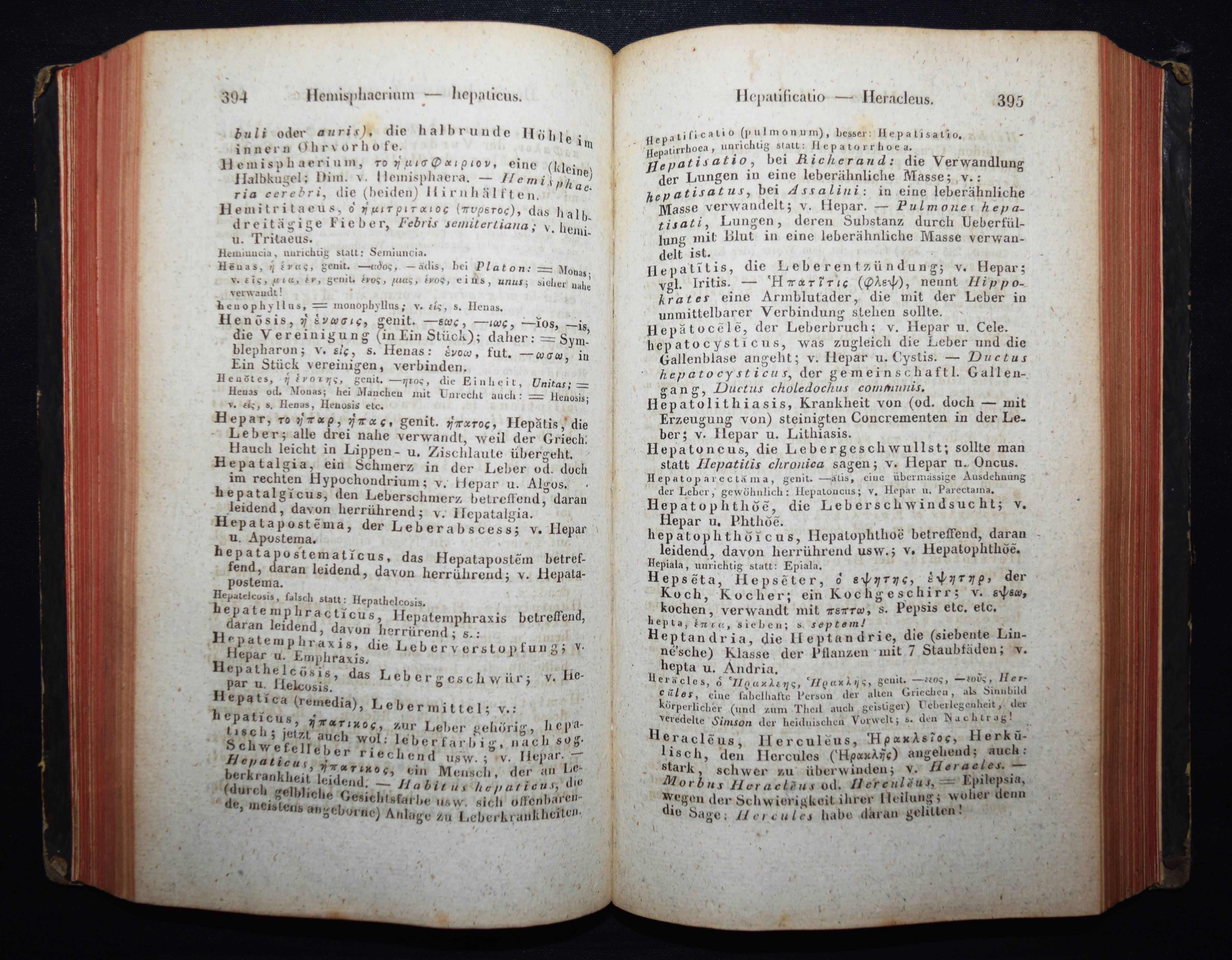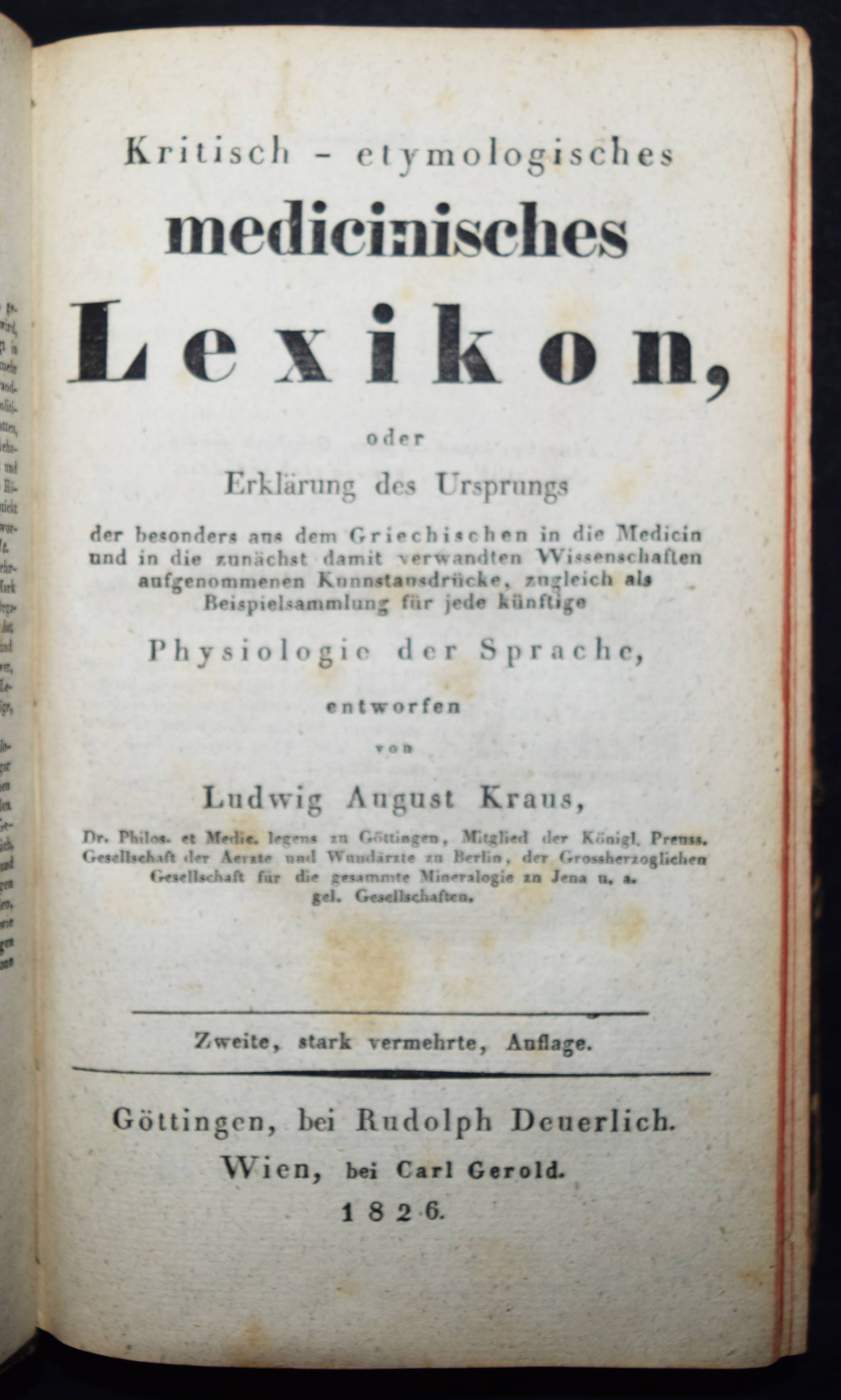 Kraus, Ludwig August. Kritisch-etymologisches medicinisches Lexikon. Oder Erklärung des Ursprungs der besonders aus dem Griechischen in die Medicin und in die zunächst damit verwandten Wissenschaften aufgenommenen Kunstausdrücke, zugleich als Beispielsammlung für jede künftige Physiologie der Sprache, entworfen. 2., stark verm. Aufl. Göttingen, Rudolph Deuerlich und Wien, Carl Gerold 1826. 8°. XVI, 880 S. Pbd. d. Zt. mit goldgepr. Rückenschild u. Linienvergoldung. Hirsch-Hüb. III, 605. Wellcome III, 412. Zischka 194. – Vorletzte Auflage des weitverbreiteten Wörterbuchs der aus dem Griechischen, dem Lateinischen und den orientalischen Sprachen übernommenen Fachausdrücke. – „Sein etymologisches Lexikon gilt als schönste Frucht seiner grossen literarischen Tätigkeit. Es fand weite Verbreitung und dokumentiert die umfassenden philologischen und medizinischen Kenntnisse des gelehrten Verfassers“ (Hirsch-Hüb.). – Einband etwas berieben und bestoßen, stellenweise etwas braunfleckig, gutes Exemplar.