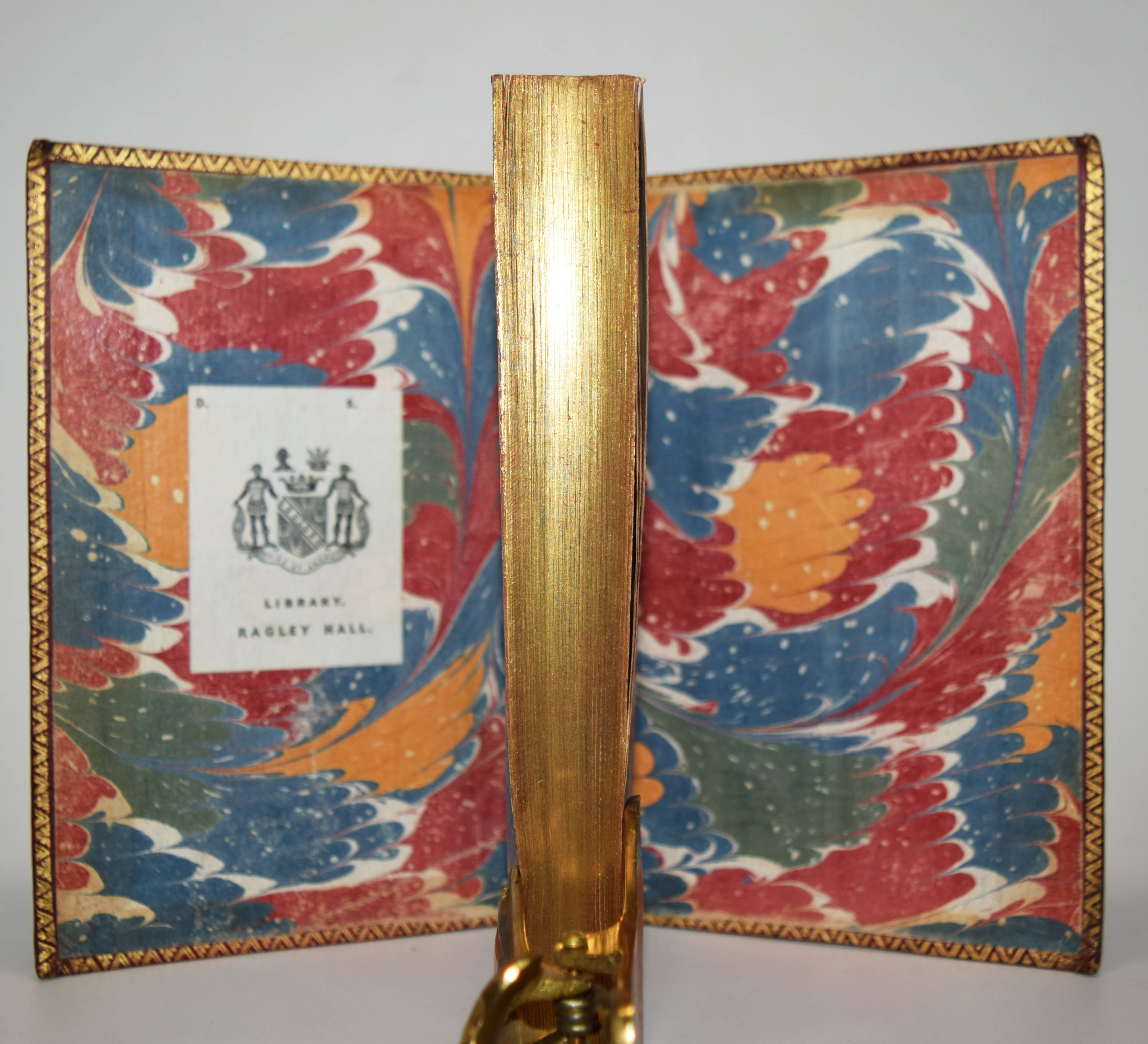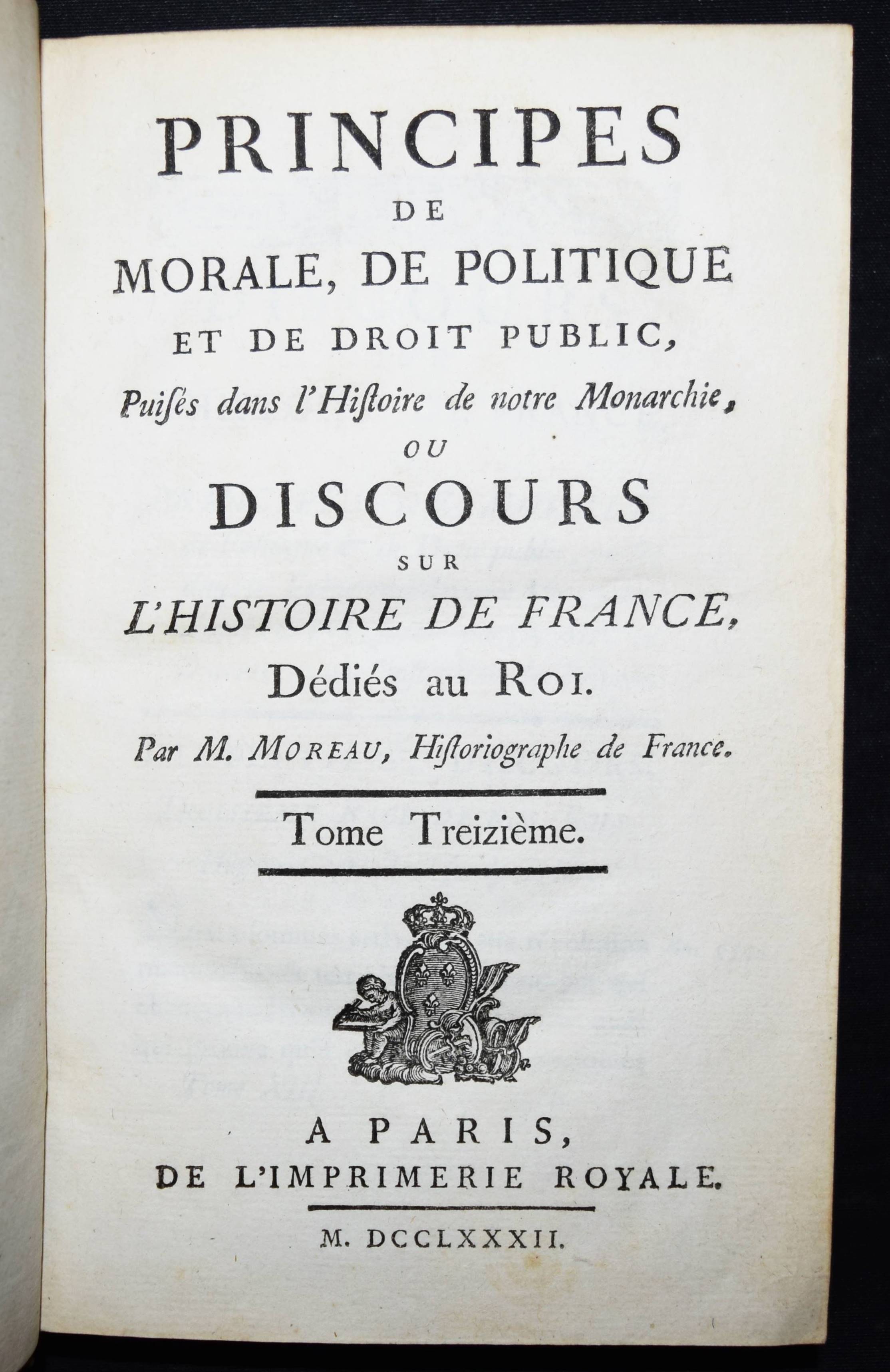 Moreau, (Jacob Nicolas). Principes de morale, de politique et de droit public, puisés dans l’histoire de notre monarchie, ou discours sur l’histoire de France, dédiés au Roi. Tome treizième (de 21). Paris, l’Imprimerie royale 1782. 8°. Titel, 446, XVI, (2) S. Weinroter Maroquineinband mit goldgepr. Rückenschild, reicher floraler Rückenvergoldung, dreifachen Deckelfiletten, goldgepr. Deckel- Monogramm „E.D“, Innenkantenvergoldung u. Goldschnitt. 13. Band der 21-teiligen Publikation (Paris 1777-1789) zur Politik und zum Staatsrecht des Ancient Regime. – Sehr schönes prachtvoll gebundenes Exemplar aus der englischen Schloß-Bibliothek Ragley Hall (Warwickshire, nähe Alcester und Stratford-upon-Avon), das Schloß diente als Filmkulisse für die Fernsehversion von „Das scharlachrote Siegel“ und wurde in der britischen Science-Fiction-Serie „Doctor Who“ (2006) als Kulisse (Schloß Versailles) verwendet.