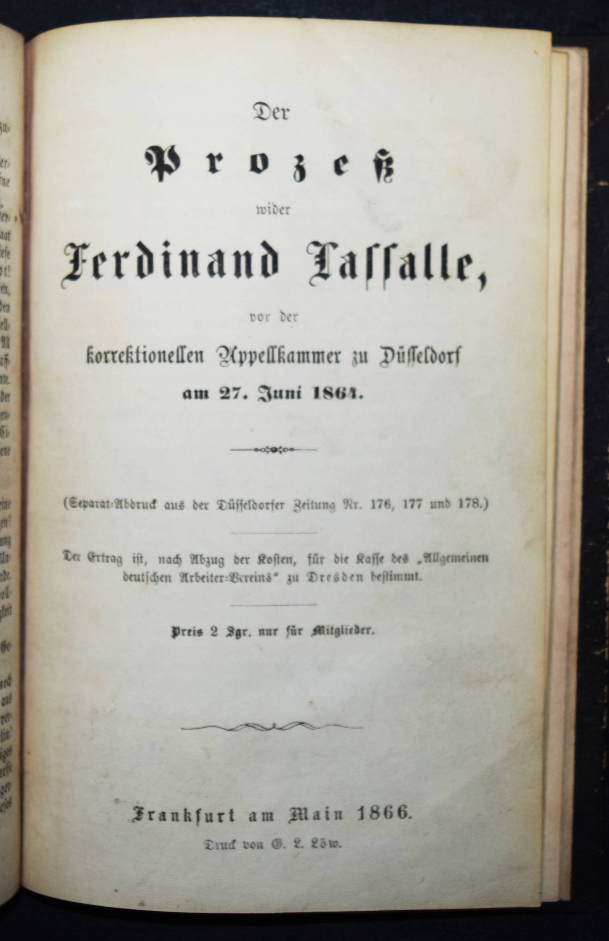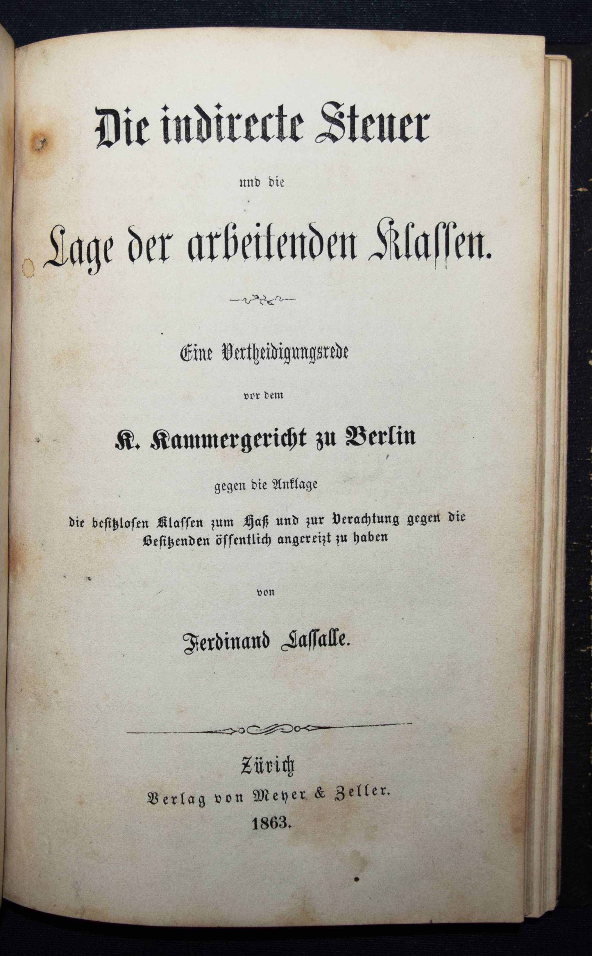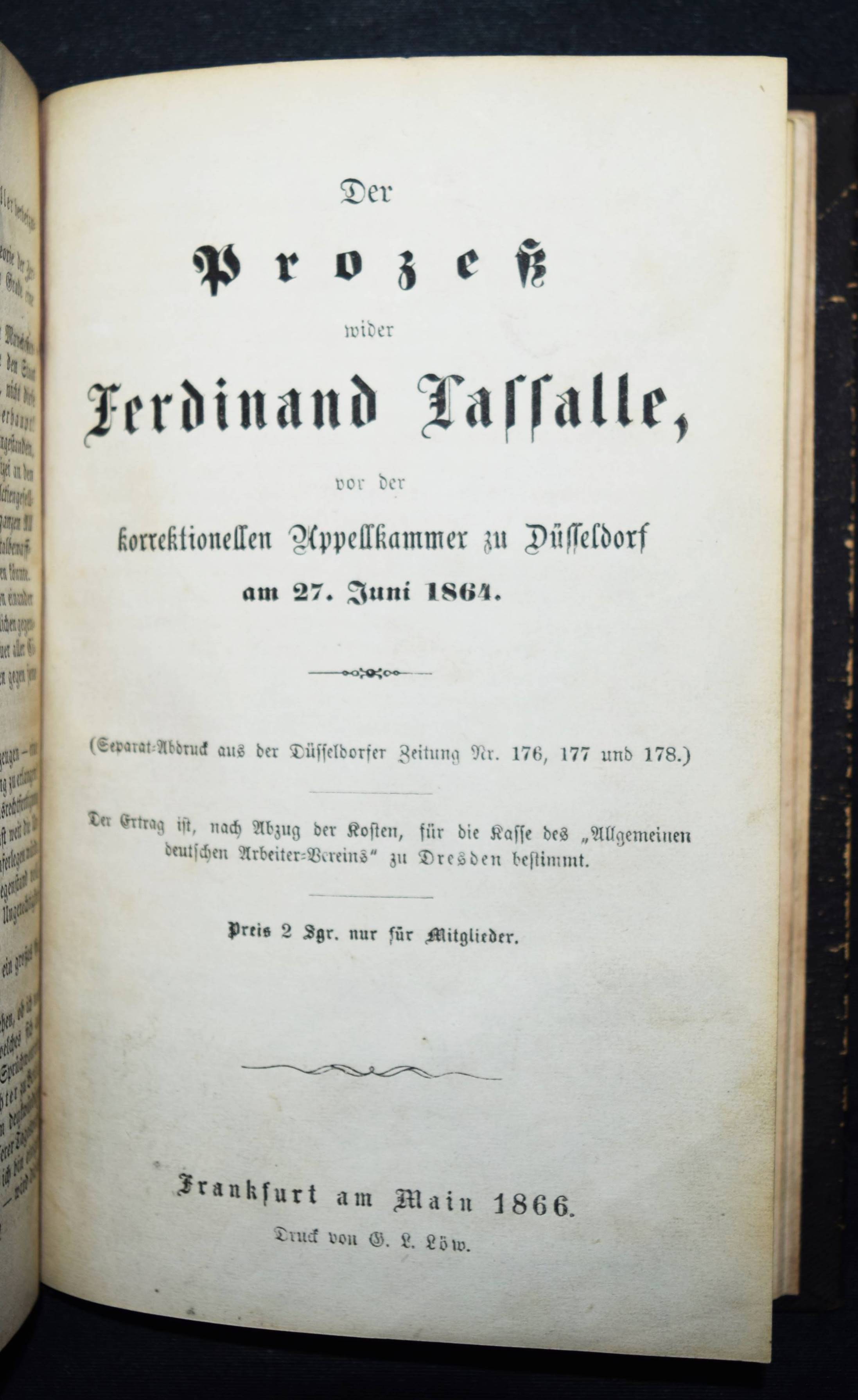 Lassalle, Ferdinand. Sammelband mit 6 Schriften. Chicago, Charles Ahrens (d. i. Düsseldorf, Schaub) u. Zürich, Meyer & Zeller 1863 ff. 8°. Hln. d. Zt. mit goldgepr. Rückentitel. Frühe bzw. erste Ausgaben. Die „Chicagoer“ Drucke sind Stammhammer unbekannt. – Enthält: Arbeiterprogramm. Ueber den besondern Zusammenhang der gegenwärtigen Geschichtsperiode mit der Idee des Arbeiterstandes. Chicago, Ahrens (Düsseldorf, Schaub) o. J. 36 S. – Die Wissenschaft und die Arbeiter. Eine Vertheidigungsrede vor dem Berliner Criminalgericht gegen die Anklage die besitzlosen Klassen zum Haß und zur Verachtung gegen die Besitzenden öffentlich angereizt zu haben. Ebda. o. J. 44 S. – Der Lassallesche Criminalprozeß. Zweites Heft. Die mündliche Verhandlung nach dem stenographischen Bericht. Zürich, Meyer & Zeller 1863. 52 S. – Der Lassallesche Criminalprozeß. Drittes Heft. Das Urtheil erster Instanz mit kritischen Randnoten zum Zweck der Appellationsrechtfertigung. Ebda. 1863. 79 S. – Die indirecte Steuer und die Lage der arbeitenden Klassen. Eine Vertheidigungsrede vor dem K. Kammergericht zu Berlin gegen die Anklage die besitzlosen Klassen zum Haß und zur Verachtung gegen die Besitzenden öffentlich angereizt zu haben. Ebda. 1863. 1 Bl., 136 S. – Der Prozeß wider Ferdinand Lassalle, vor der korrektionellen Appellkammer zu Düsseldorf am 27. Juni 1864. SA aus der Düsseldorfer Zeitung, Ffm. 1866. 31 S. – Deckel etwas berieben, stellenweise etwas fleckig, sonst gut erhalten.