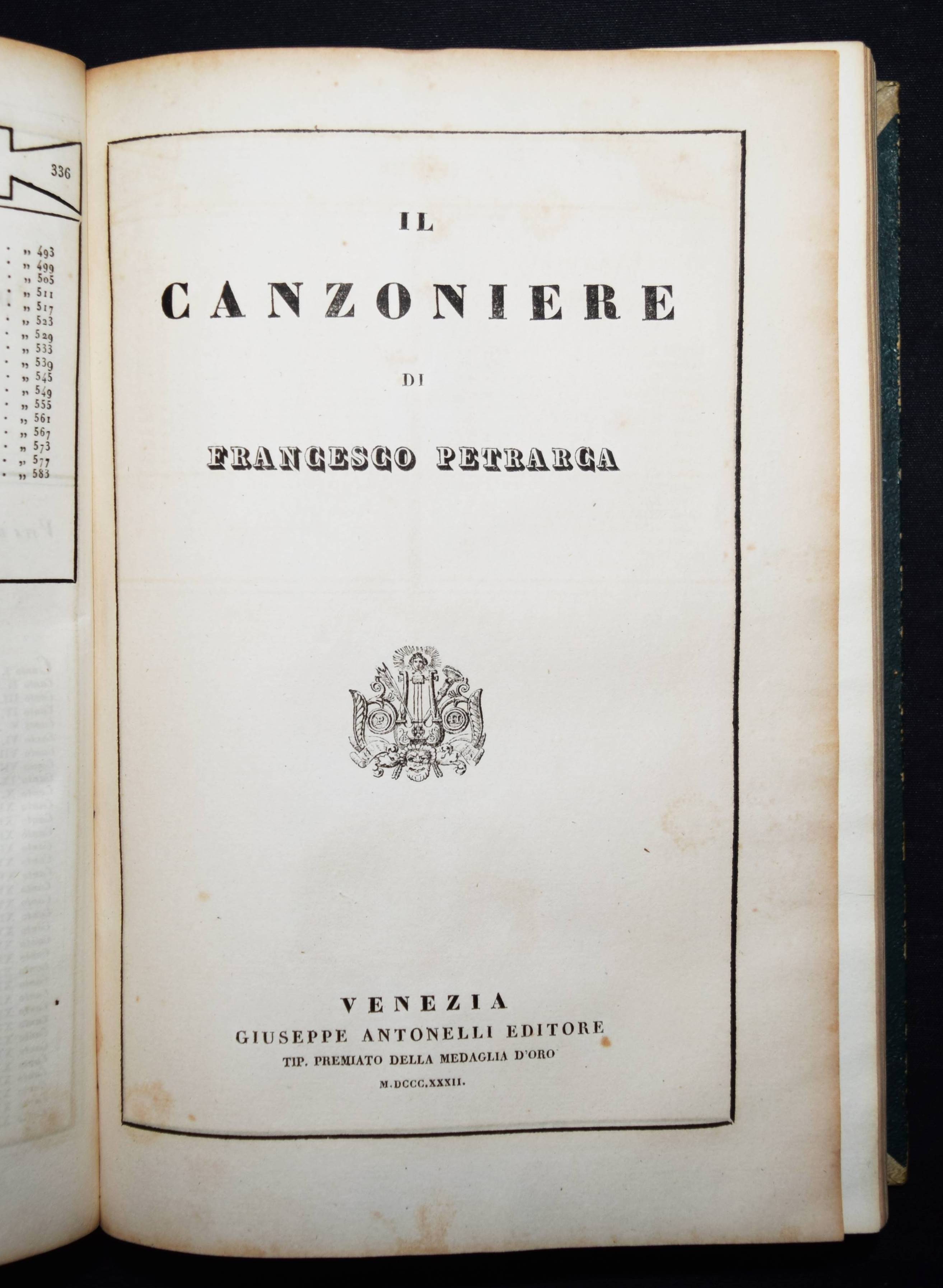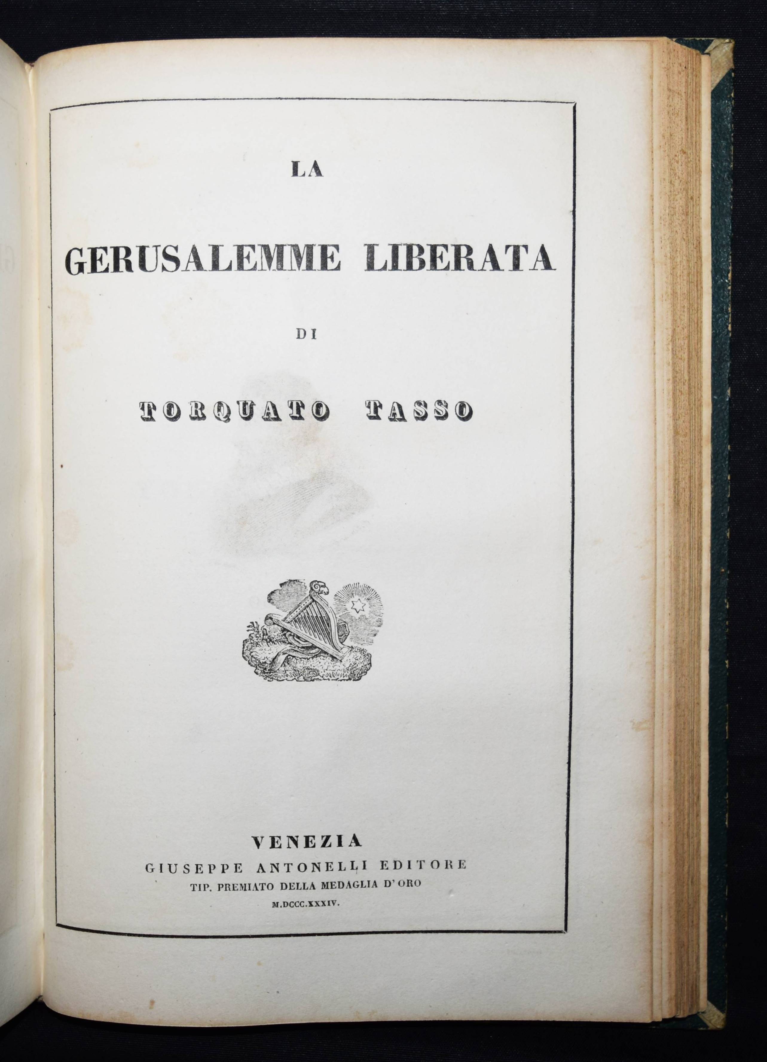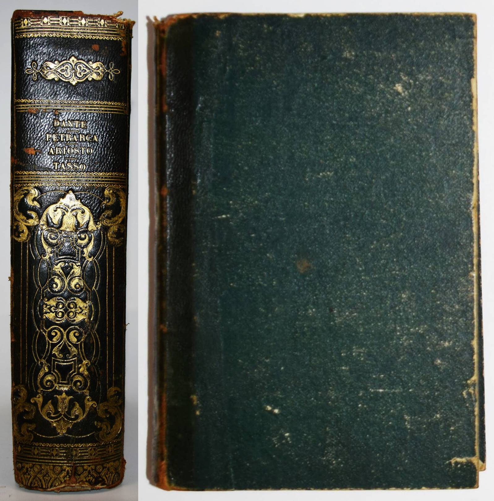 Parnaso italiano volume primo. Dante (La divina commedia); Petrarca (Rime); Ariosto (L’Orlando Furioso); Tasso (La gerusalemme liberata). 4 Werke in 1 Band. Venedig, Antonelli 1832. Gr.-8°. Mit gestoch. illustr. Titel, 4 gestoch. Porträts u. 3 gestoch. Tafeln. OHldr. mit goldgeprägtem Rückentitel und Romantikervergoldung. Einband teils stärker berieben, Rücken am Fuß mit kleineren Fehlstellen, sonst gutes Exemplar.