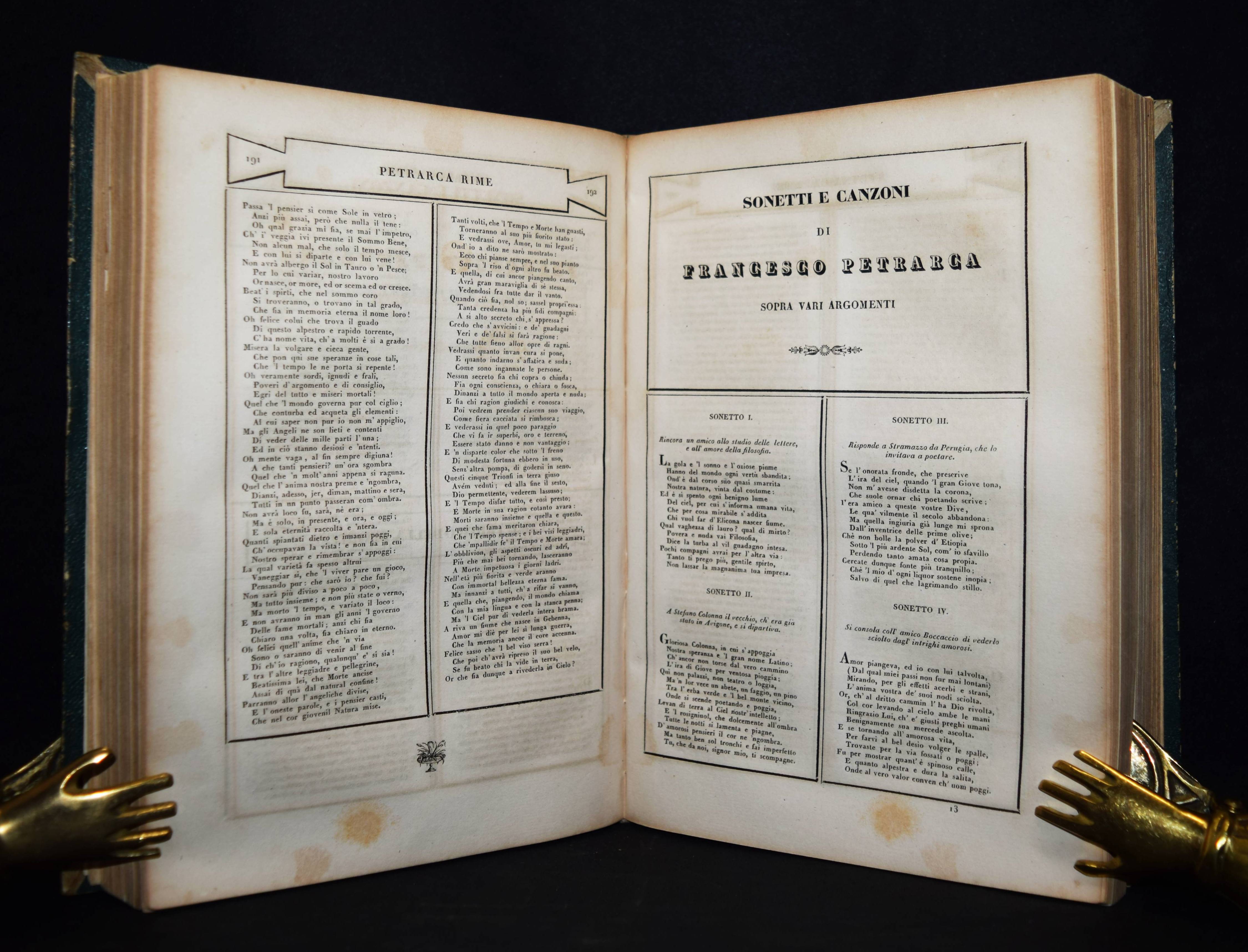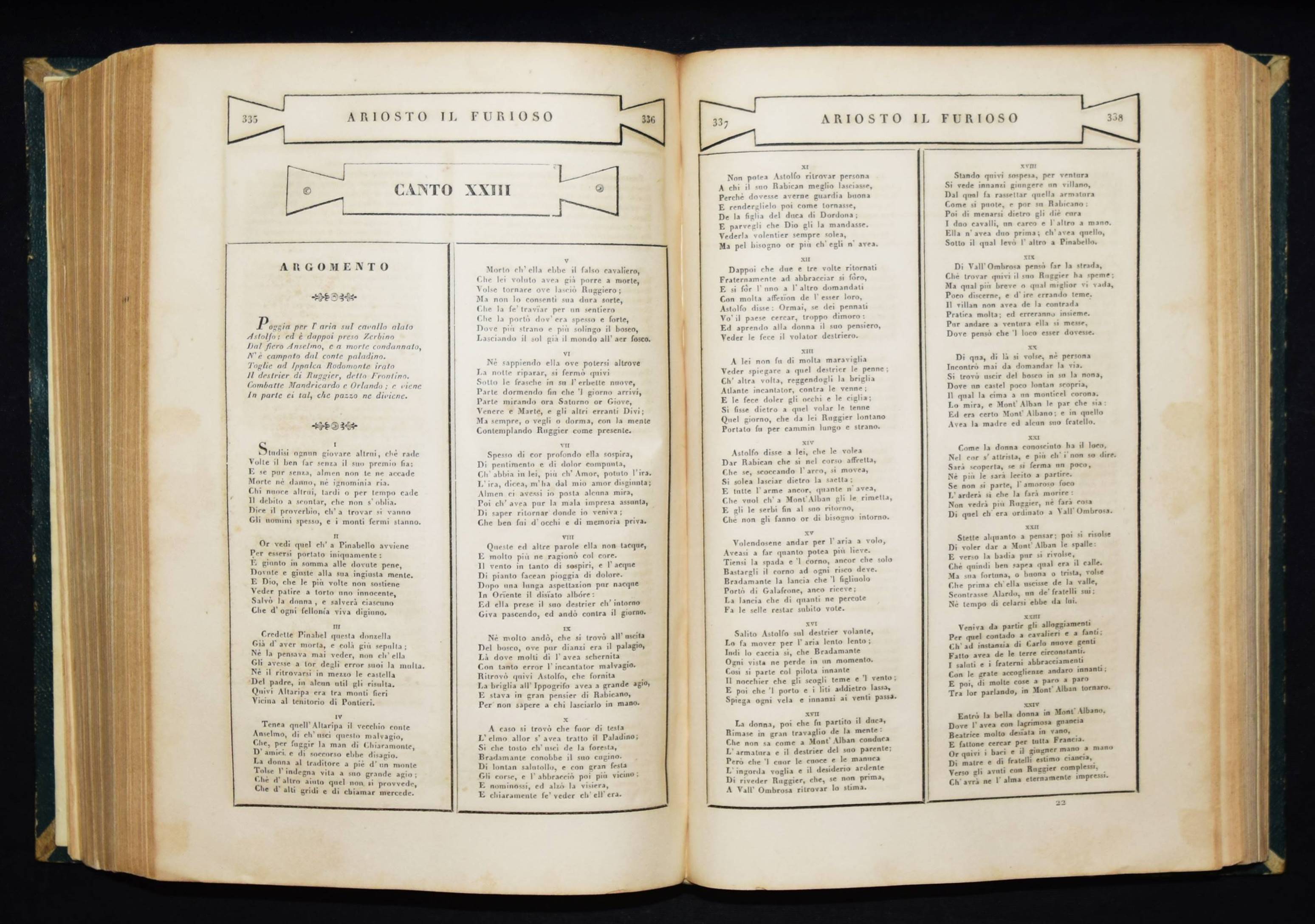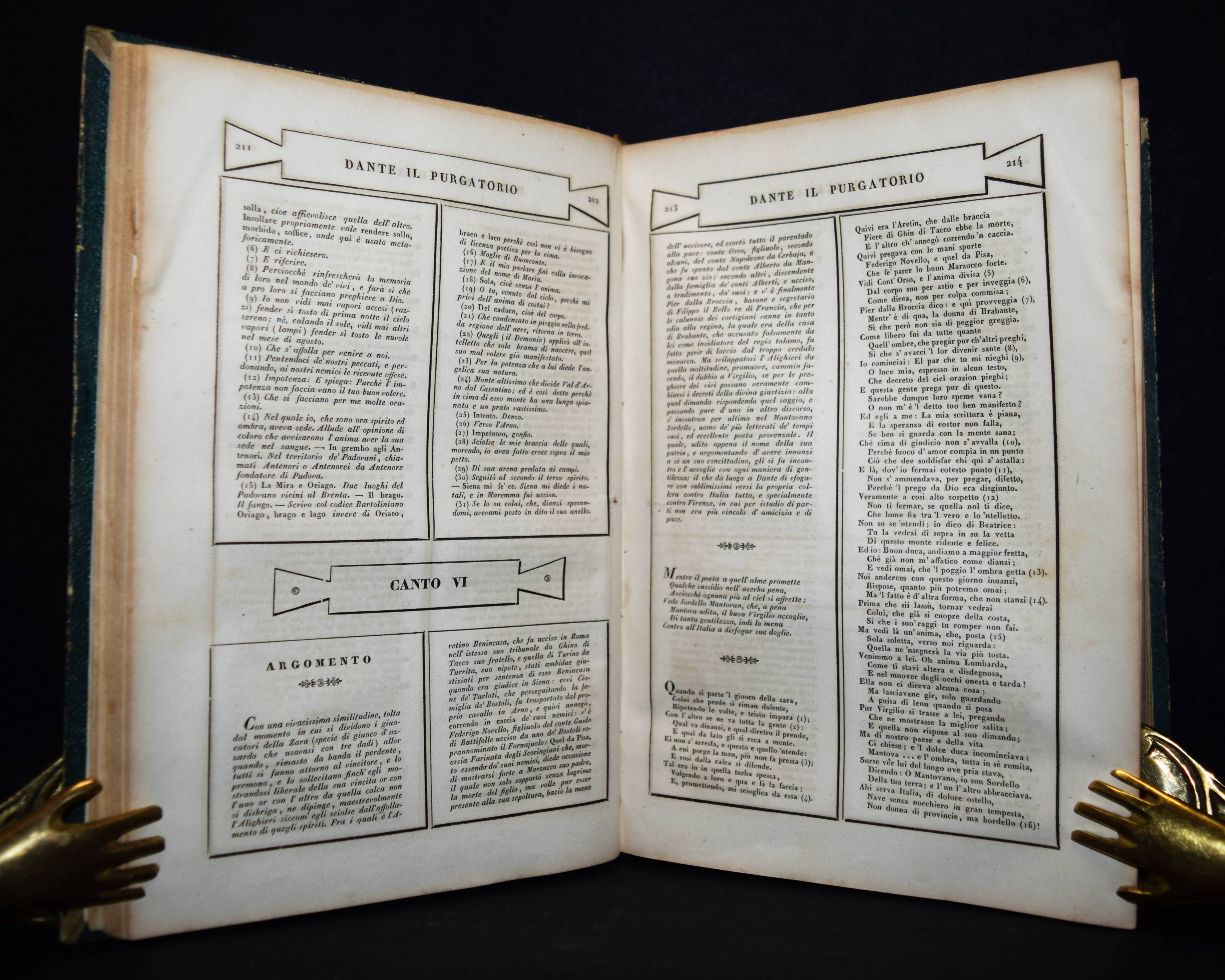 Parnaso italiano volume primo. Dante (La divina commedia); Petrarca (Rime); Ariosto (L’Orlando Furioso); Tasso (La gerusalemme liberata). 4 Werke in 1 Band. Venedig, Antonelli 1832. Gr.-8°. Mit gestoch. illustr. Titel, 4 gestoch. Porträts u. 3 gestoch. Tafeln. OHldr. mit goldgeprägtem Rückentitel und Romantikervergoldung. Einband teils stärker berieben, Rücken am Fuß mit kleineren Fehlstellen, sonst gutes Exemplar.
