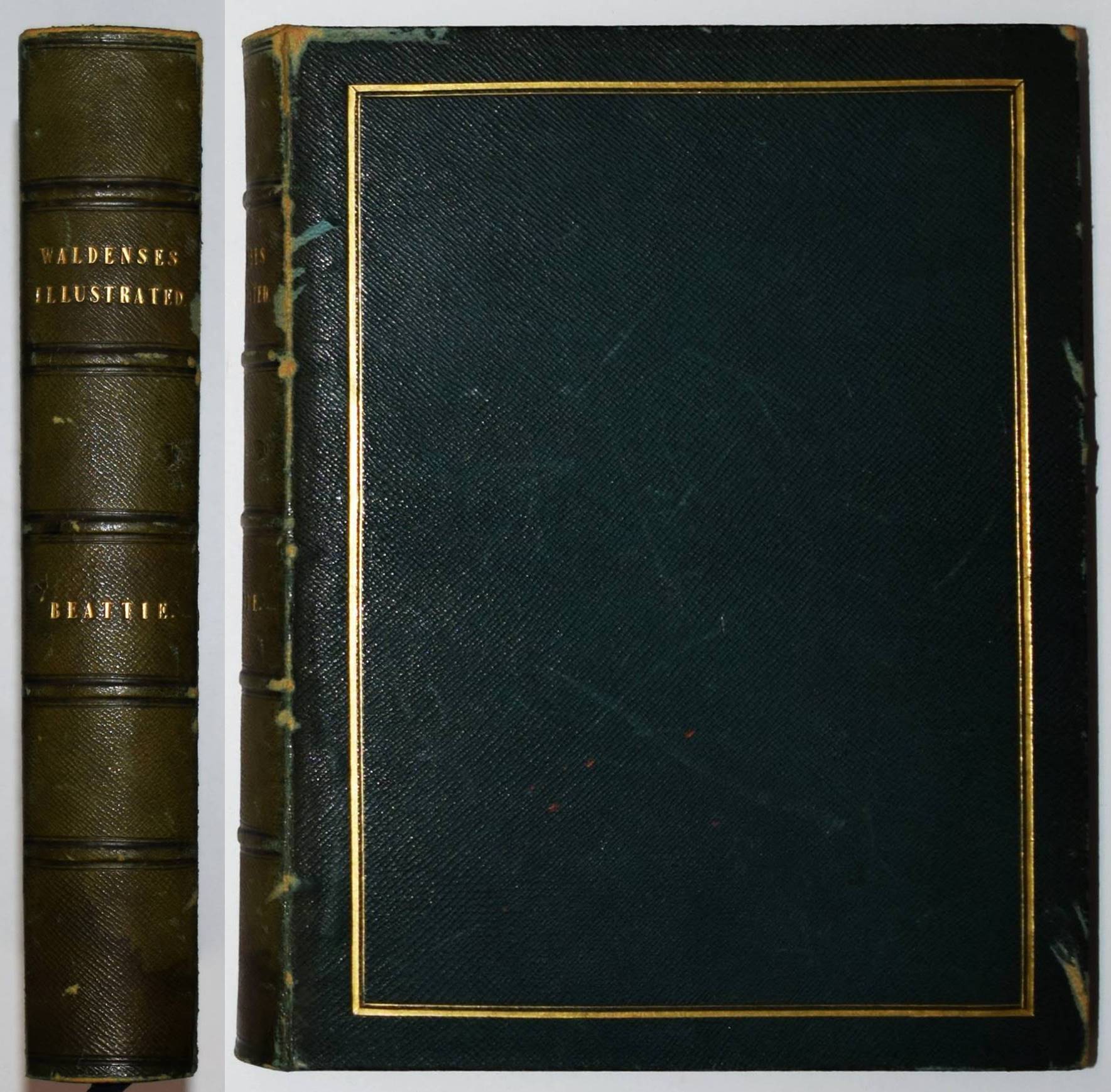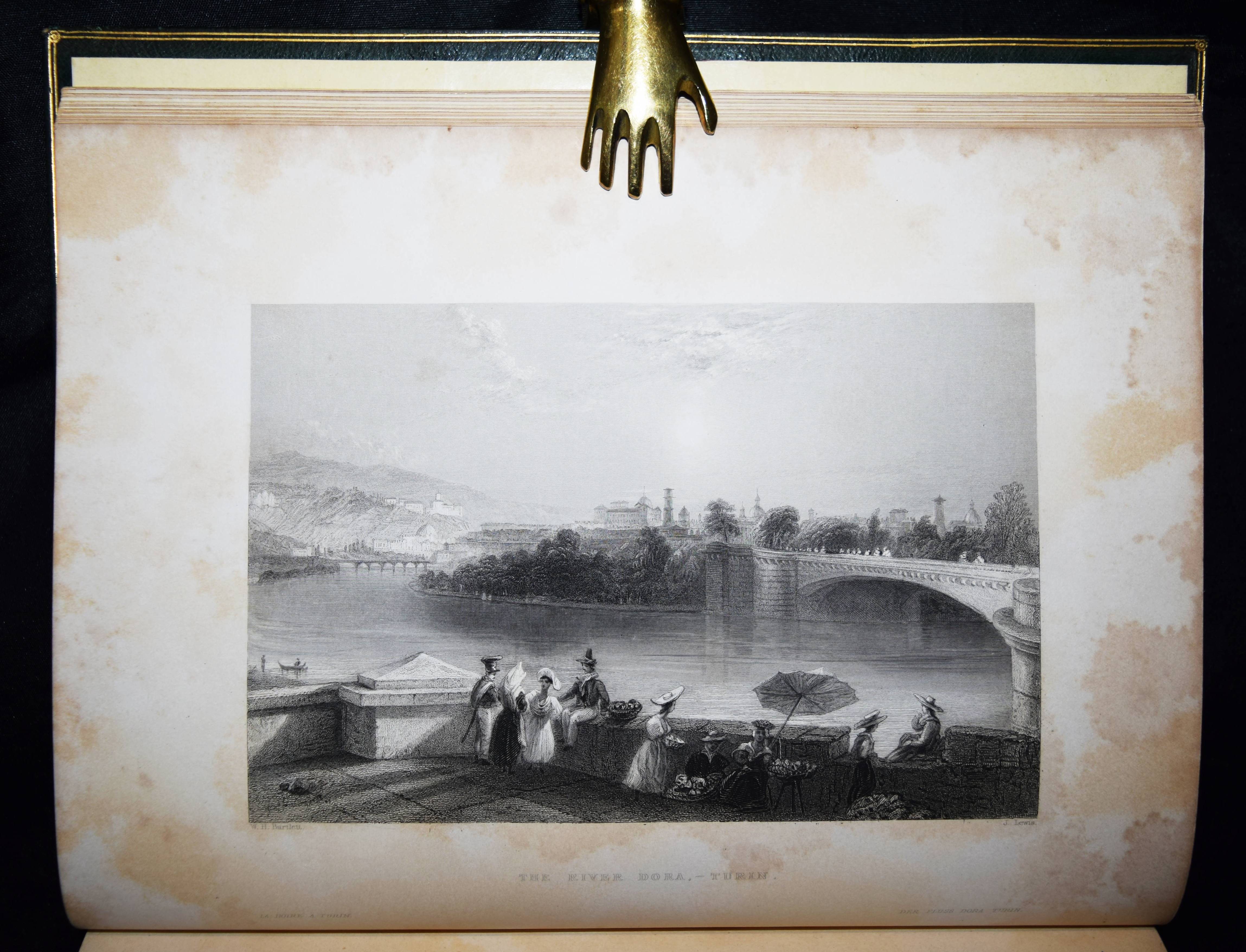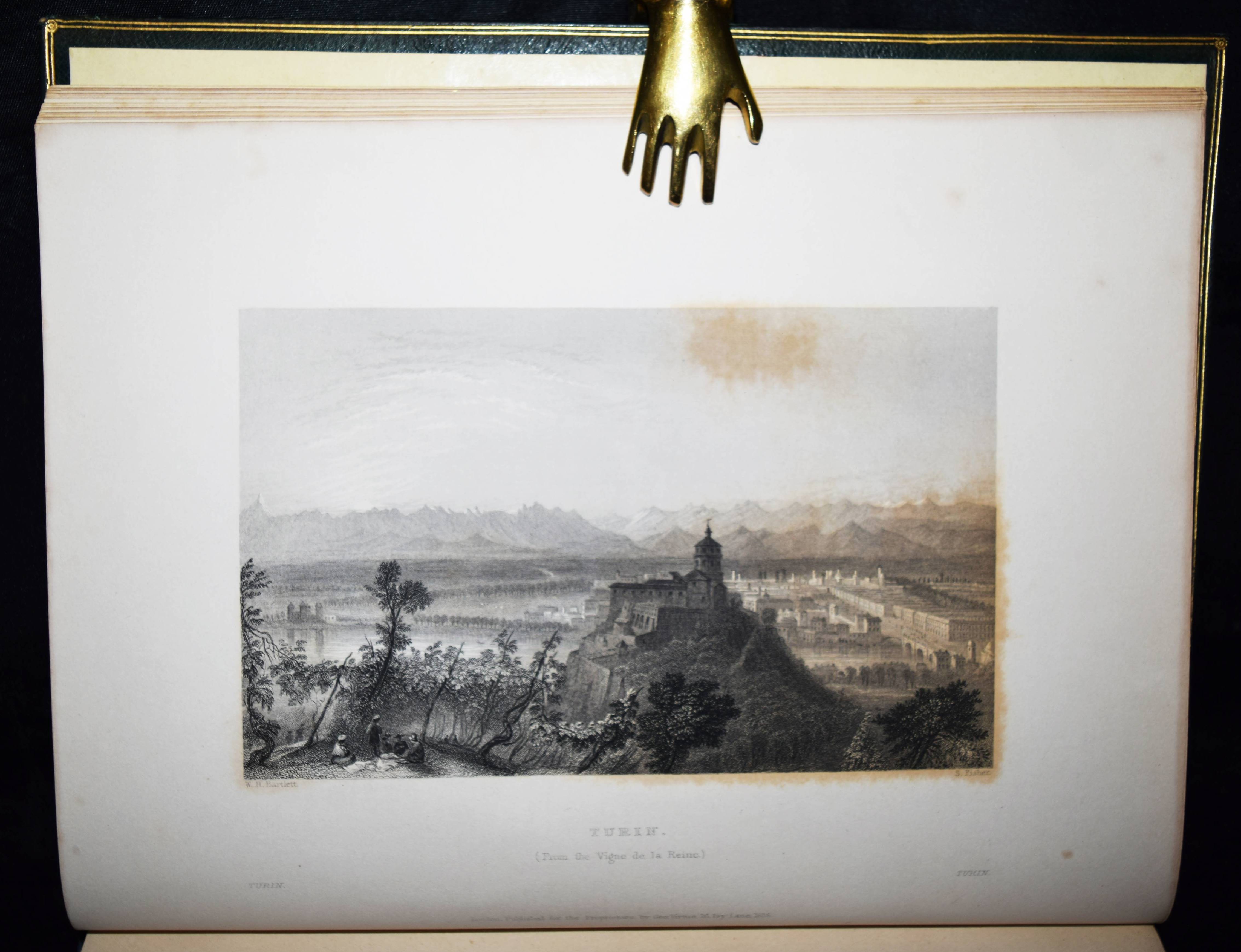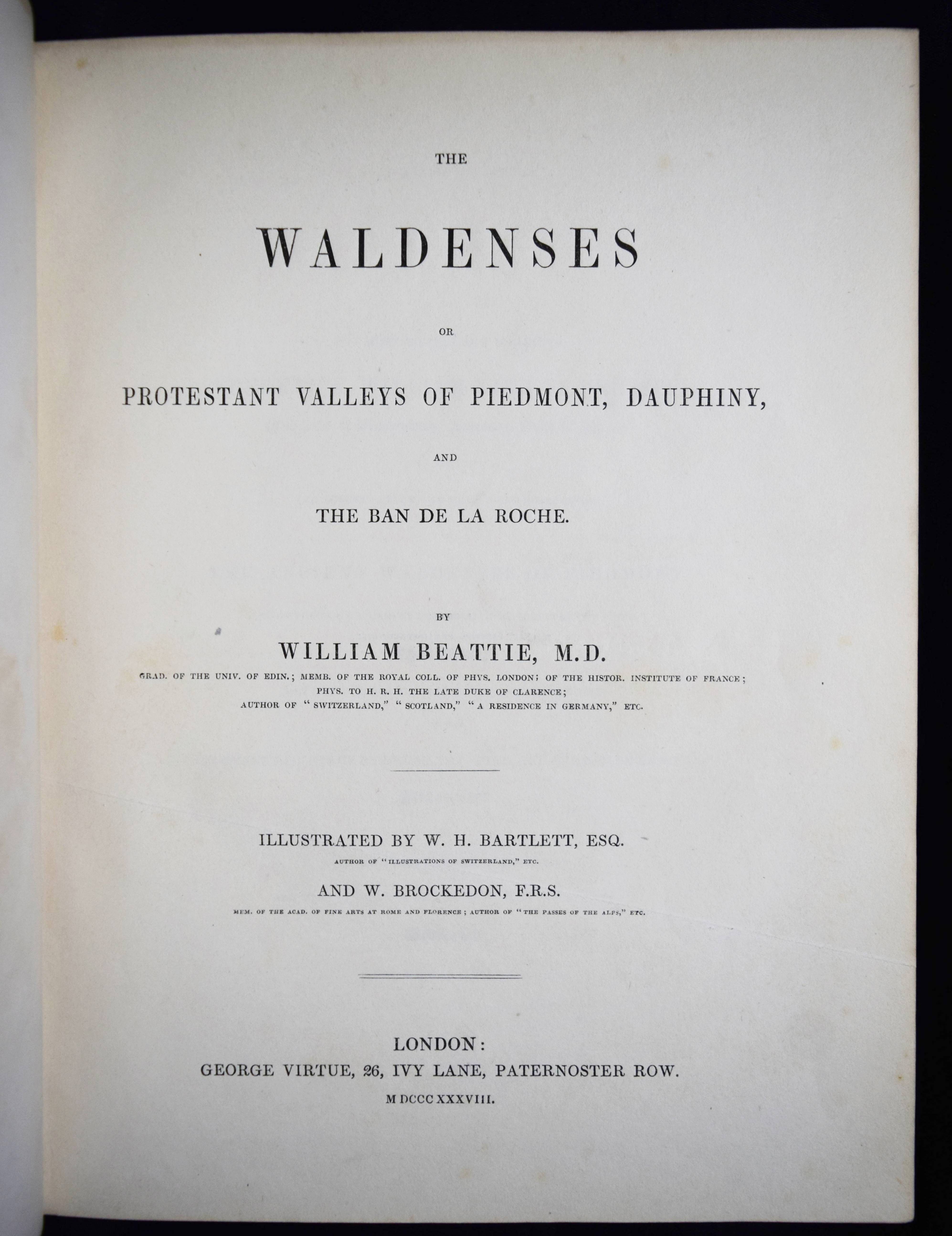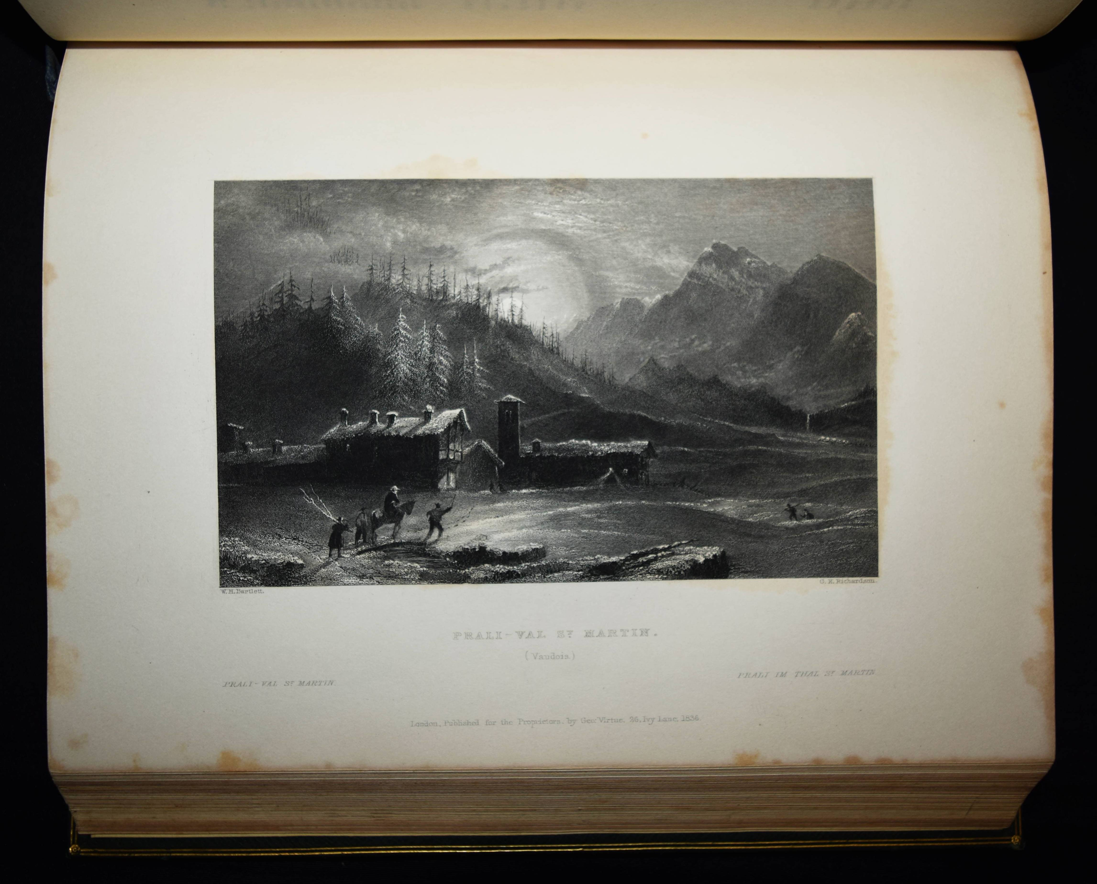 Beattie, William. The Waldenses or Protestant Valleys of Piedmont and Dauphiny. Illustrated in a series of views taken on the spot expressly for this work by W H Bartlett and W Brockedon. London, Geo. Virtue 1836. VI, 216 S., [1] Bl. mit gestoch. Portrait, gestoch. illustr. Titel, 70 Stahlstich-Ansichten u. 1 gefalt. gestoch. Karte. Grüner Ldr. d. Zt. mit goldgepr. Rückentitel, Deckelfiletten, Innenkantenvergoldung u. Goldschnitt. Pine-Coffin, Bibliography of British and American travel in Italy to 1860, 838, 6. – Erste Ausgabe. – Mit einem geschichtlichen Abriss über die Entstehung, Verfolgung und der damaligen Situation der Glaubensgemeinschaft der Waldenser. Die Ansichten, meist mit figürlicher und auf die historischen Begebenheiten bezugnehmender Staffage, von Turin, Pignerol, Luzern, Savoyen, Chateau Queyraz, Straßburg, Genfer See, Mont Blanc u. a. – Rücken etwas aufgehellt und berieben, Frontispiz und Titelblatt braunfleckig, sonst nur im Blattrand etwas fleckig, gutes Exemplar.