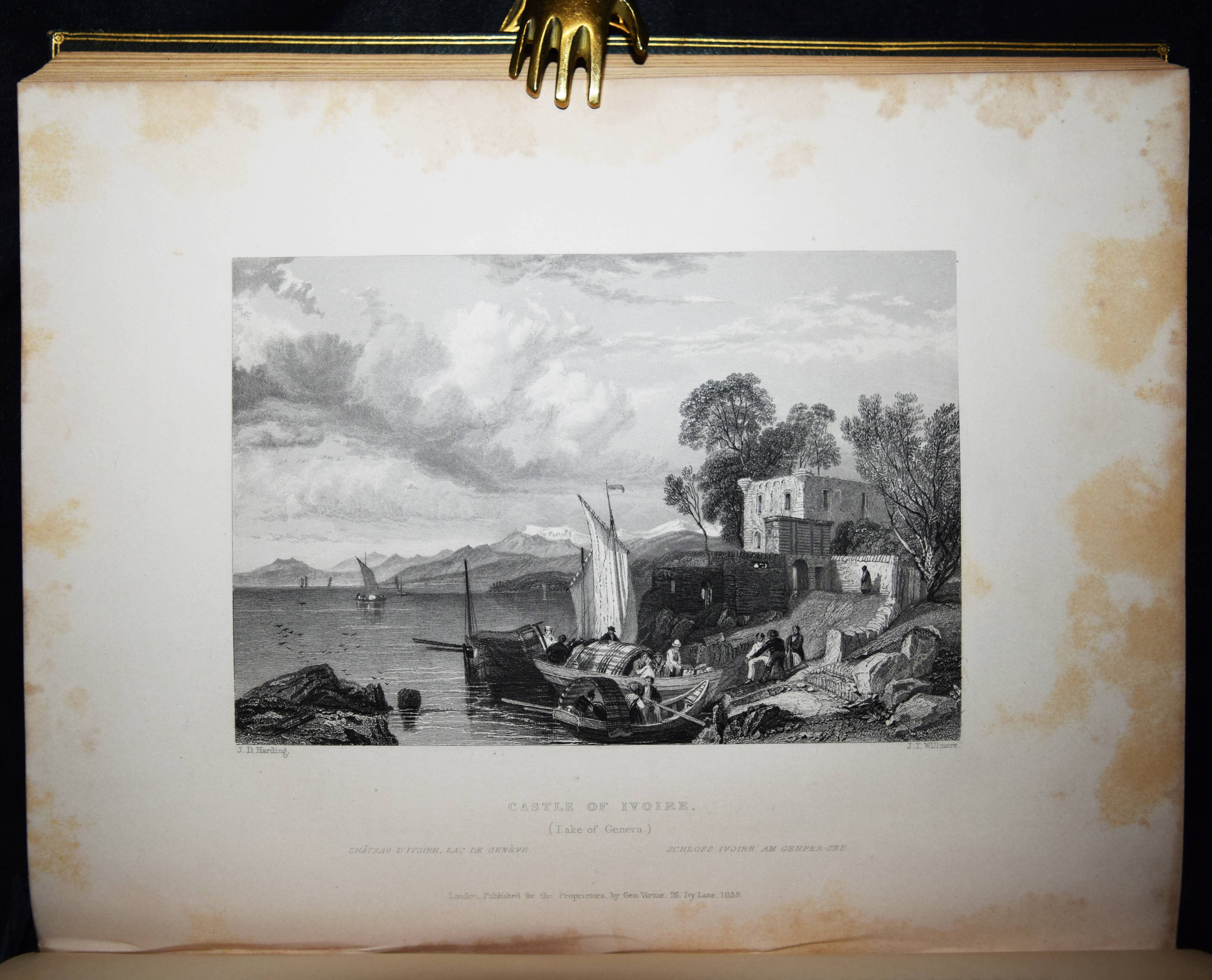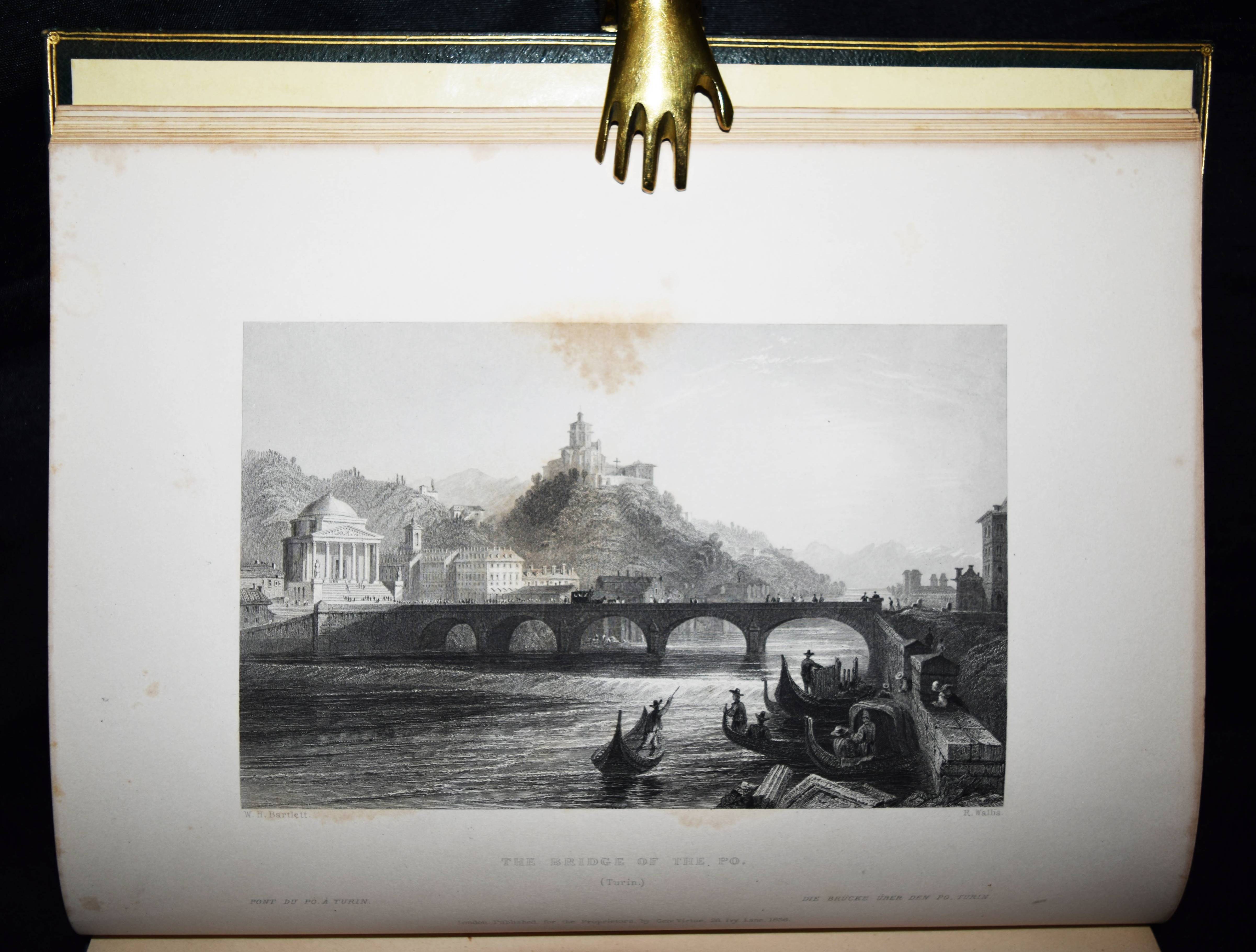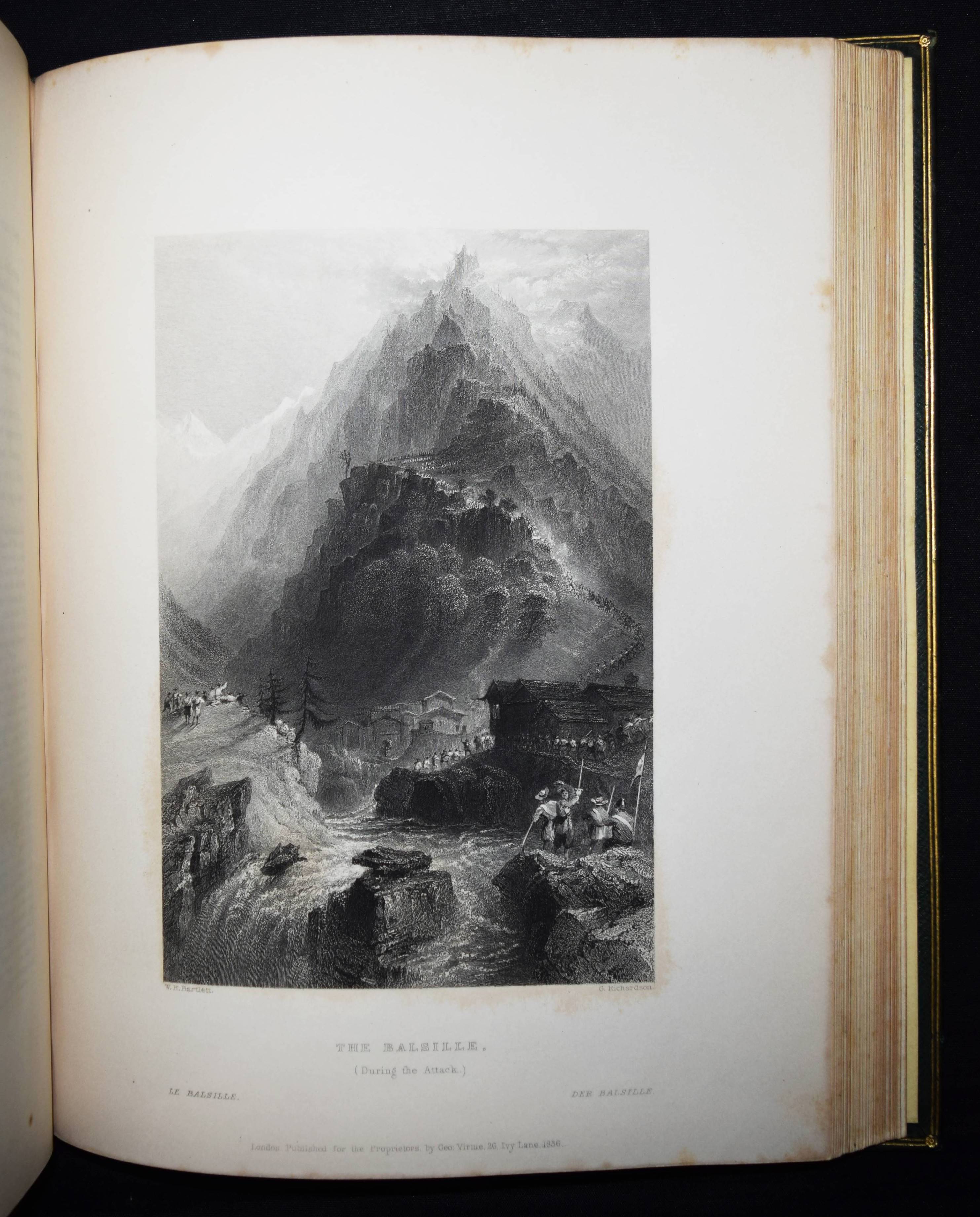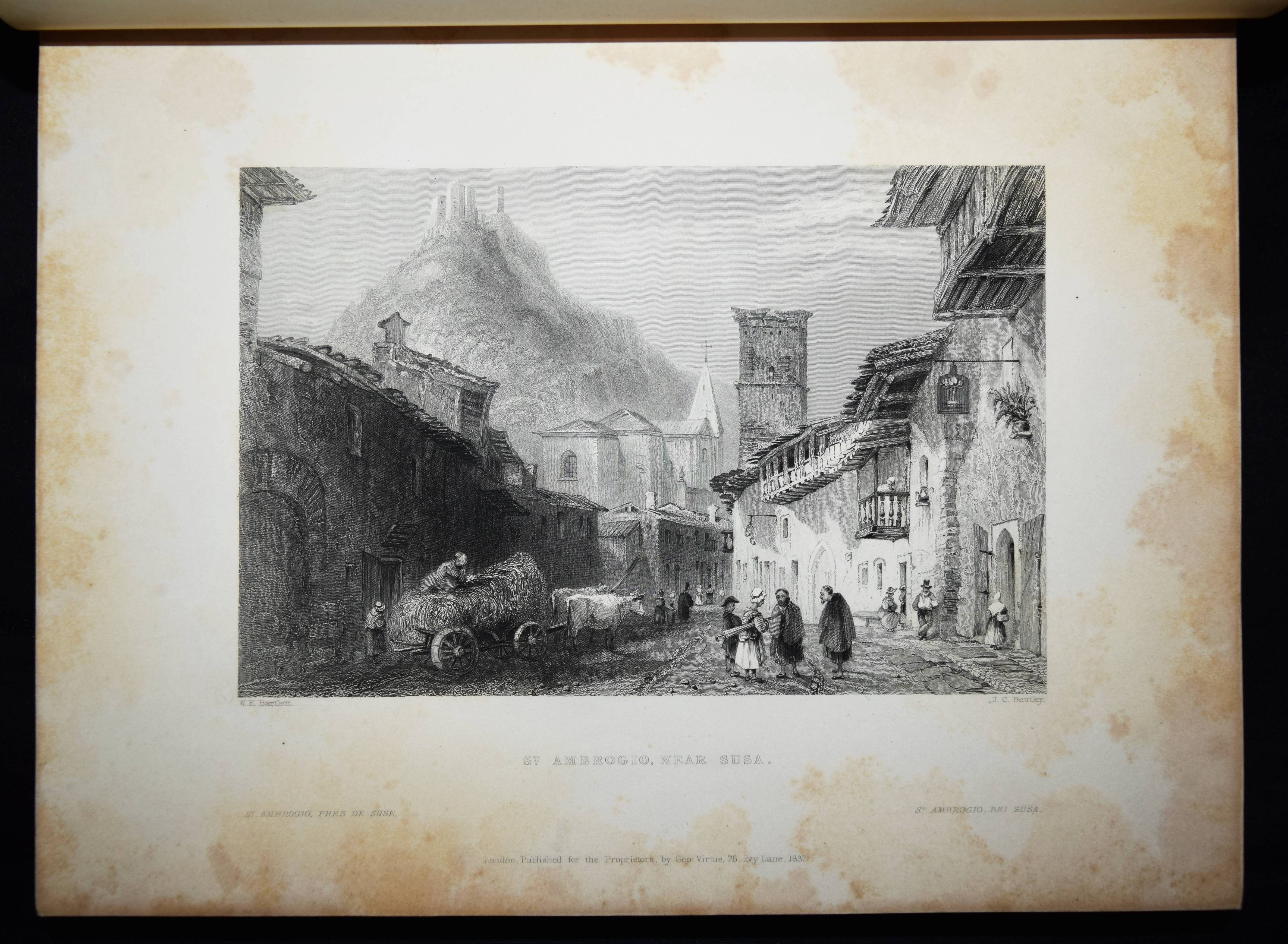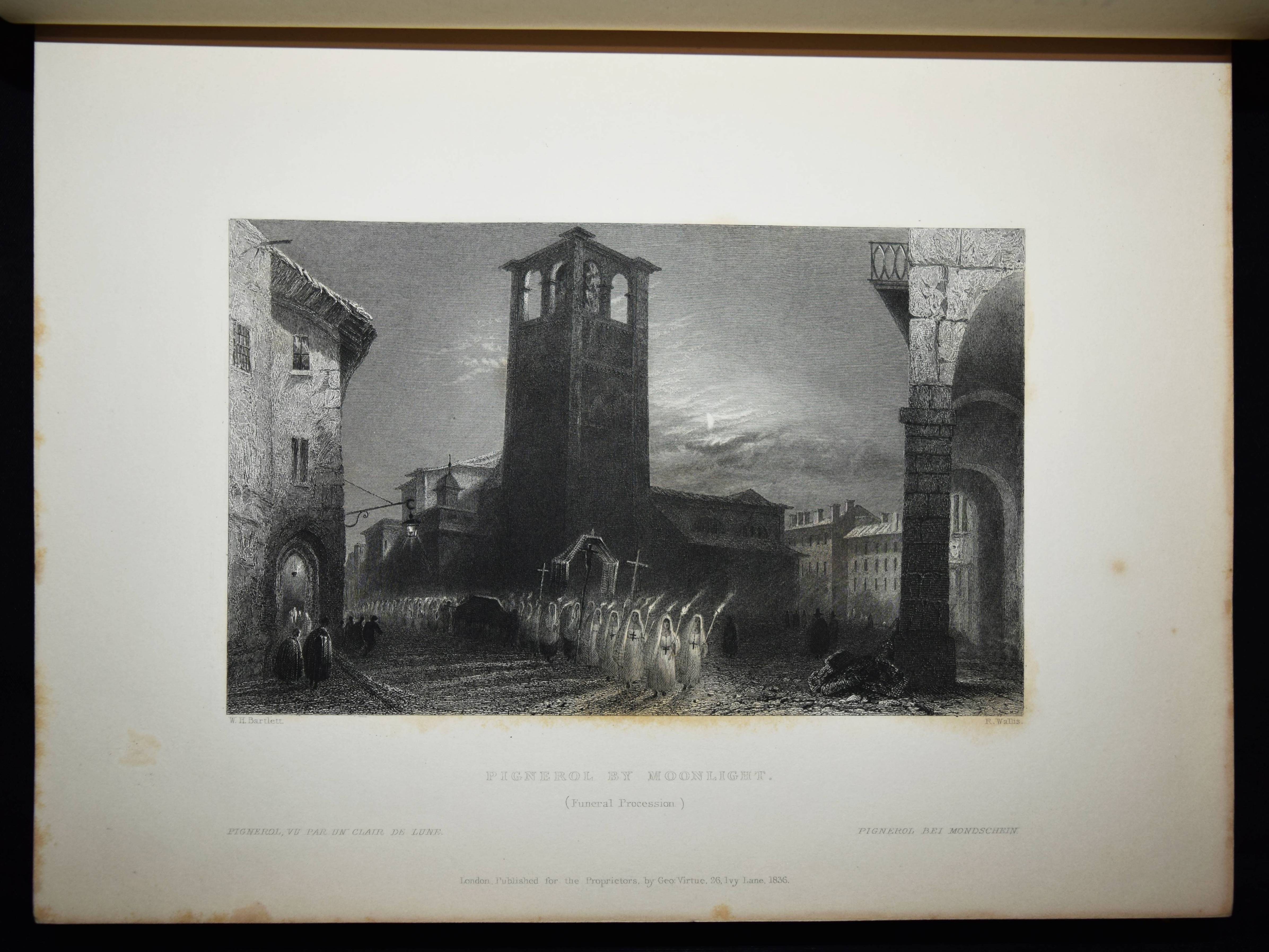Beattie, William. The Waldenses or Protestant Valleys of Piedmont and Dauphiny. Illustrated in a series of views taken on the spot expressly for this work by W H Bartlett and W Brockedon. London, Geo. Virtue 1836. VI, 216 S., [1] Bl. mit gestoch. Portrait, gestoch. illustr. Titel, 70 Stahlstich-Ansichten u. 1 gefalt. gestoch. Karte. Grüner Ldr. d. Zt. mit goldgepr. Rückentitel, Deckelfiletten, Innenkantenvergoldung u. Goldschnitt. Pine-Coffin, Bibliography of British and American travel in Italy to 1860, 838, 6. – Erste Ausgabe. – Mit einem geschichtlichen Abriss über die Entstehung, Verfolgung und der damaligen Situation der Glaubensgemeinschaft der Waldenser. Die Ansichten, meist mit figürlicher und auf die historischen Begebenheiten bezugnehmender Staffage, von Turin, Pignerol, Luzern, Savoyen, Chateau Queyraz, Straßburg, Genfer See, Mont Blanc u. a. – Rücken etwas aufgehellt und berieben, Frontispiz und Titelblatt braunfleckig, sonst nur im Blattrand etwas fleckig, gutes Exemplar.