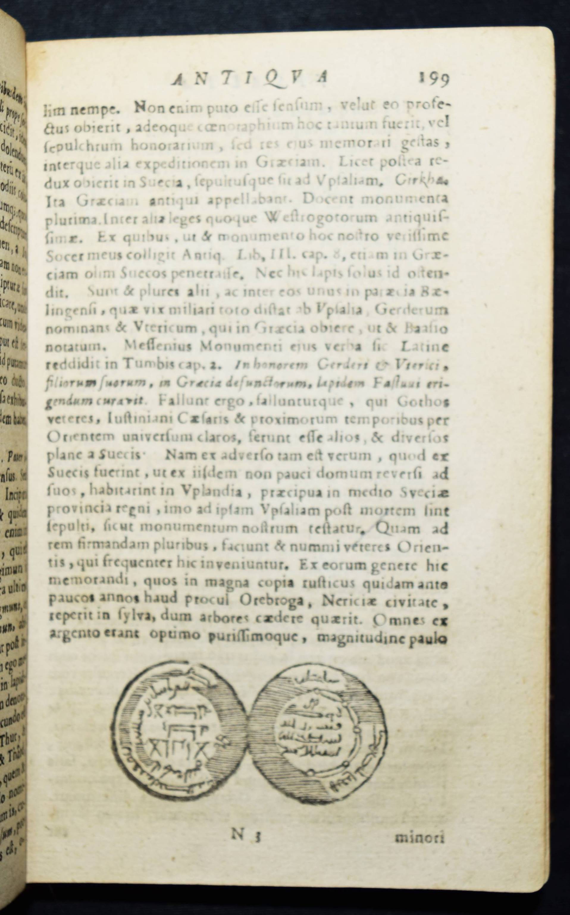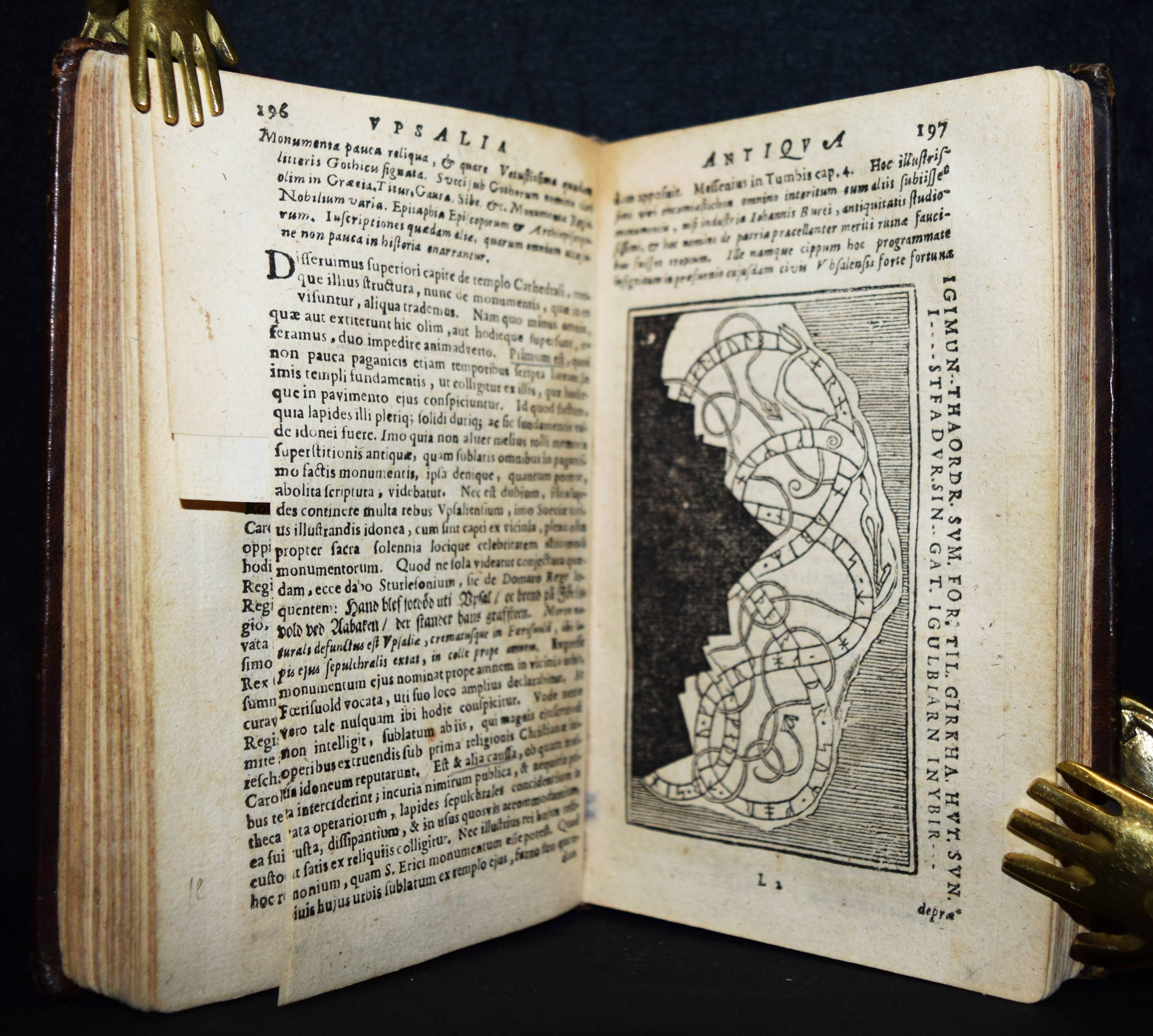 Scheffer, Johannes (Gerhard). Upsalia. Cujus occasione plurima in religione, sacris, festis, regum electionibus … explicantur. Upsala, Henricus Curio 1666. Kl.-8°. [6] Bl., 406 S. mit Druckermarke u. 3 (1 fast ganzs.) Holzschnitten. Ldr. d. Zt. ADB XXX, 680 f. – Sehr seltene erste Ausgabe. – Der deutsch-schwedische Humanist J. Scheffer, geboren am 2. Februar 1621 in Straßburg, führte seine Abstammung den Mainzer Buchdrucker Peter Schöffer (um 1425-um 1503) zurück. Scheffer studierte ab 1637 an der Universität Straßburg Philologie bei Johan Henrik Boekler. Danach bereiste er Holland, die Schweiz und Leiden. „In Straßburg erschienen seine ersten wissenschaftlichen Arbeiten, die Dissertation „de varietate navium apud veteres“, 1643; „Agrippa Liberator s. de novis tabulis“, 1645; die „Epistola de triremibus“, 1646 und die Ausgabe der „Variae historiae“ des Aelian, 1647. – Die Kriegsunruhen veranlaßten ihn, die Heimath zu verlassen; er wandte sich 1648 nach Schweden und fand am Hofe der Königin Christina, der seine Schriften bekannt geworden waren, ehrenvolle Aufnahme. Noch in demselben Jahre ernannte ihn die Königin – gleichzeitig mit seinem Lehrer Boekler – zum Skyttischen Professor der Beredsamkeit und der Politik in Upsala; später wurde er daselbst auch königlicher Honorarprofessor für Natur- und Völkerrecht, sowie Assessor im königlichen Collegium der Alterthümer, zuletzt auch Bibliothekar der Universitätsbibliothek. Er starb in Upsala am 26. März 1679. – Scheffer’s wissenschaftliche und schriftstellerische Thätigkeit war eine sehr ausgedehnte; ein Theil seiner Arbeiten bezog sich auf die Geschichte und Länderkunde von Schweden, wie die Ausgabe von „Gotrichi et Rolfi Westrogothiae Regum historia“, 1664; die „Upsalia antiqua“, 1666; die „Memorabilia Suecicae gentis exempla“, 1671; die „Lapponia“, 1673; die nach seinem Tode, 1680, von Joh. Moller herausgegebene „Suecia literata“ und viele andere kleinere Schriften“ (R. Hoche in ADB). – Kapital mit Fehlstelle am Rückendeckel, Gelenke teils etwas angeplatzt, Titelblatt gebräunt, einige Blatt mit ausgeschnittenen Anmerkungen im w. Rand (kein Textverlust), sonst gut erhalten.