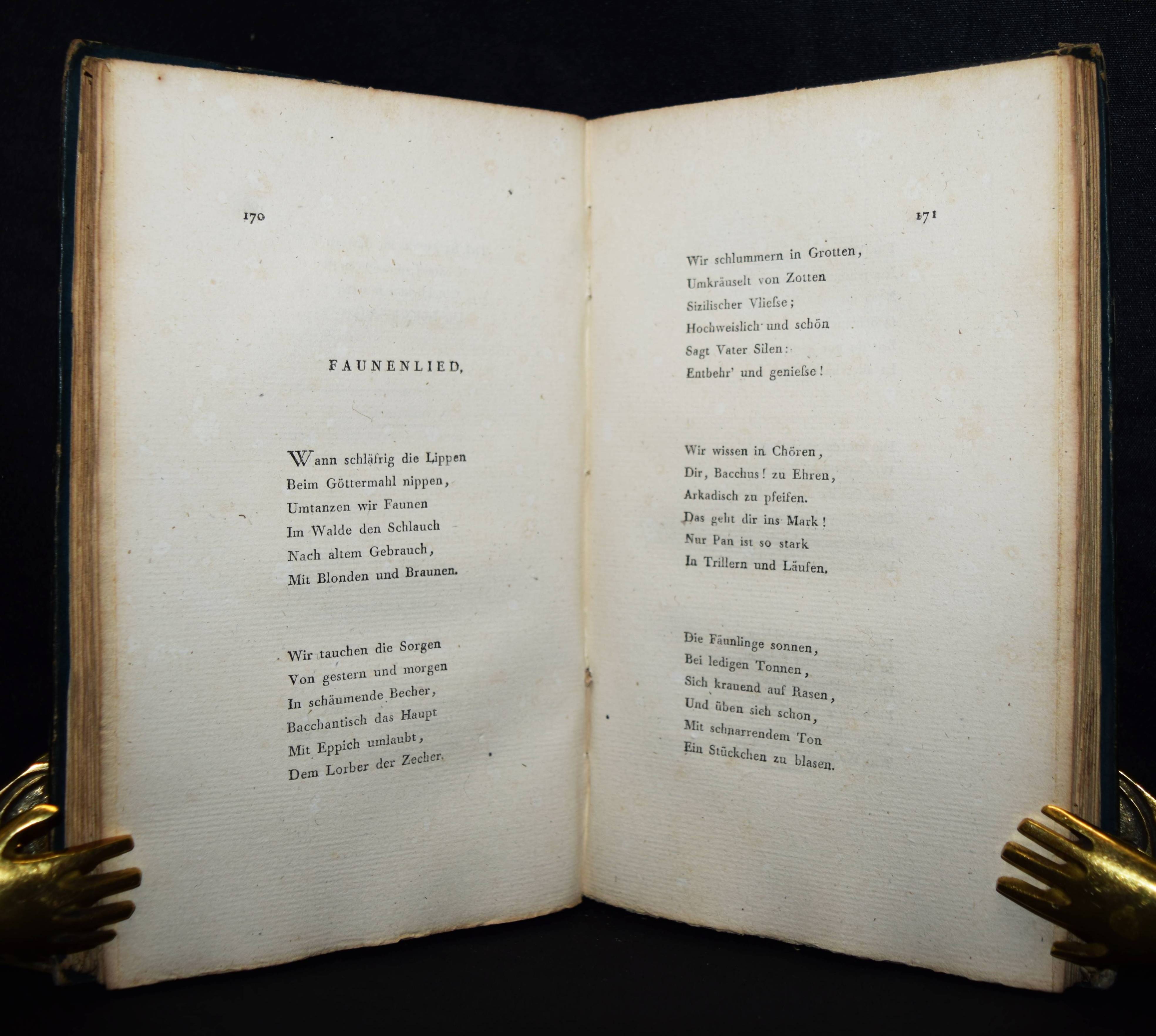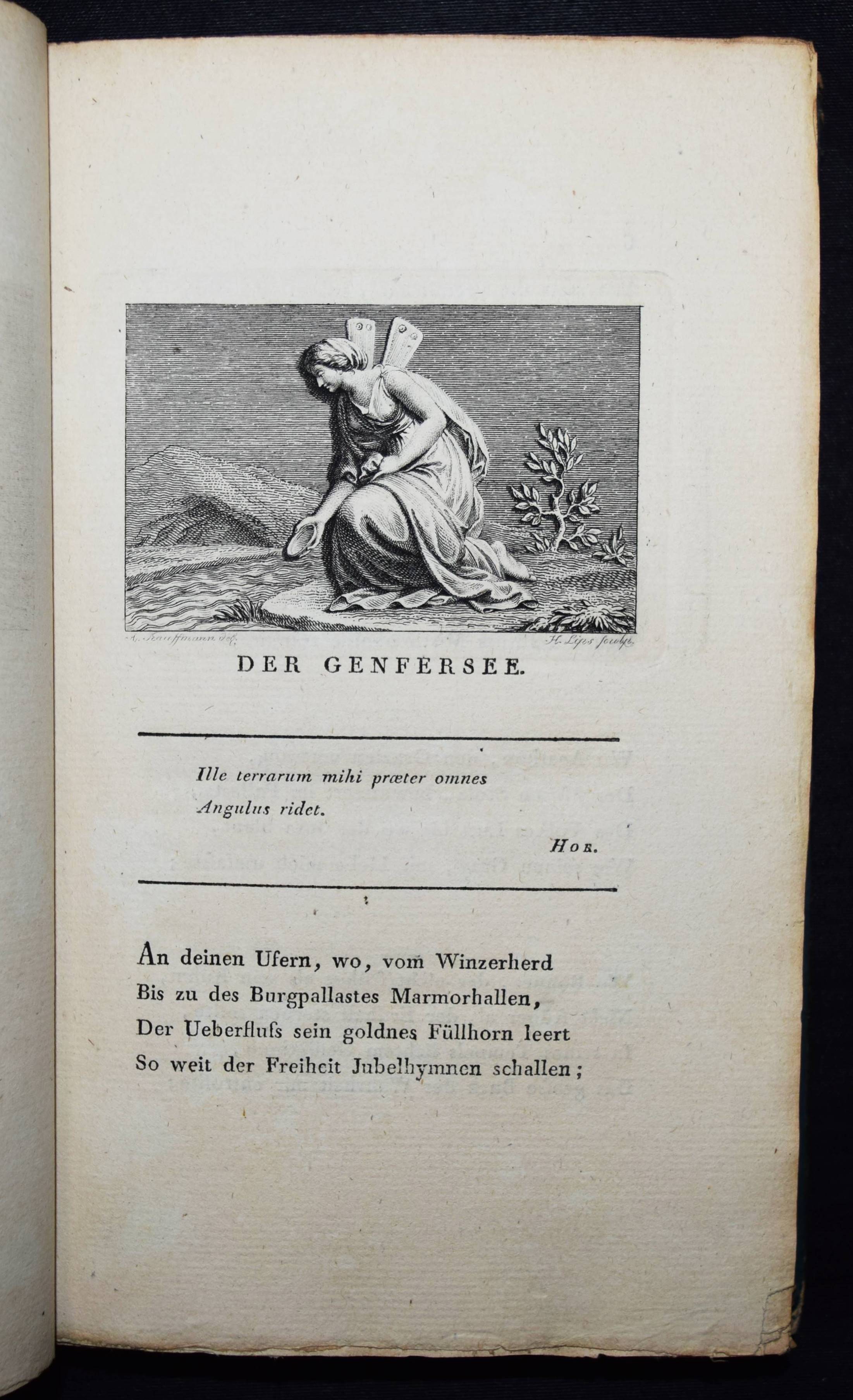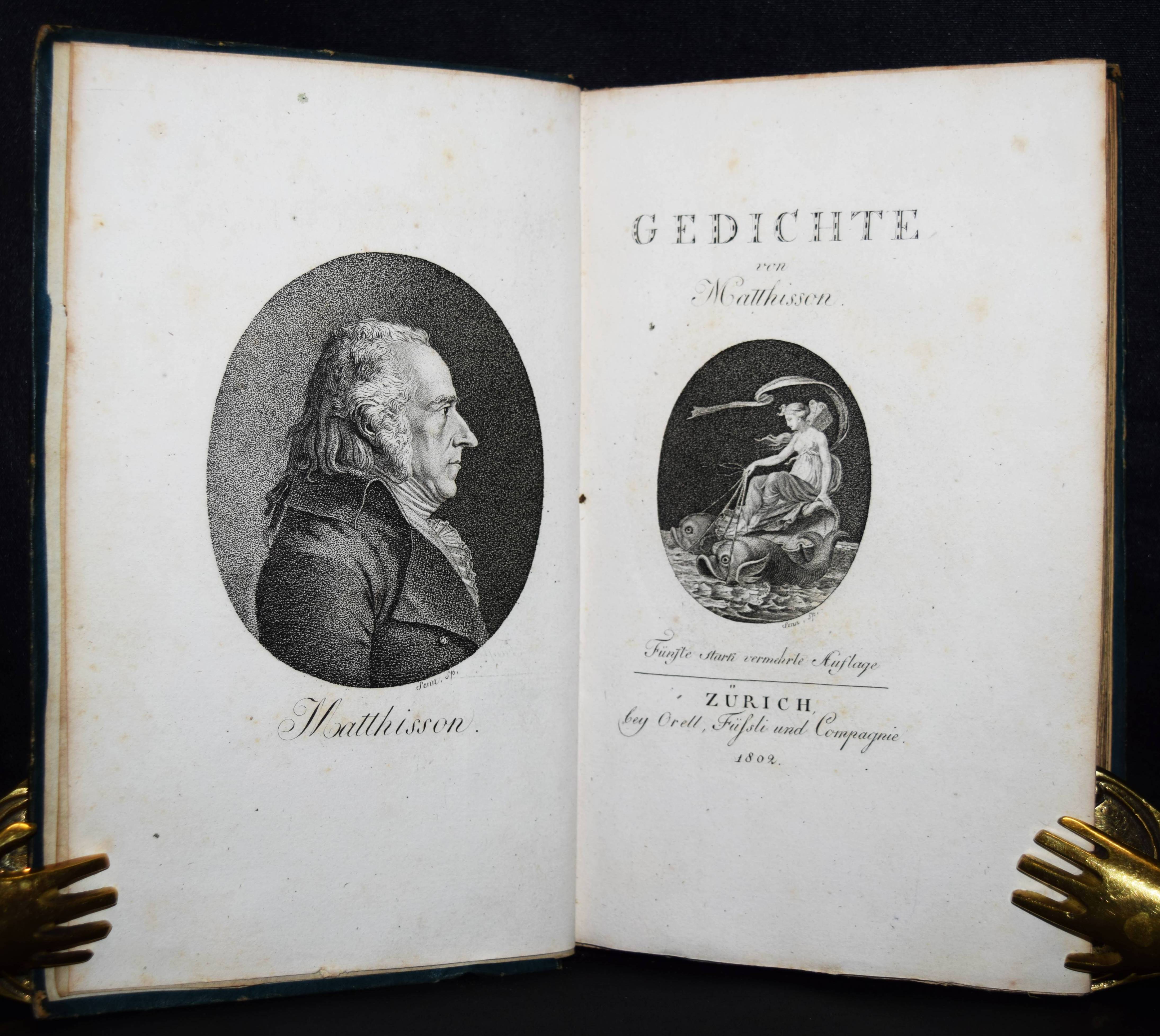 Matthisson, (Friedrich v.). Gedichte. 5. stark verm. Aufl. Zürich, Orell, Füssli u. Compagnie 1802. 8°. Titel, 332 S. mit gestoch. Portrait, gestoch. illustr. Titel u. 1 gestoch. Vignette zu dem Gedicht „Der Genfersee“. Hldr. d. Zt. mit goldgepr. Rückenschild u. Linienvergoldung. W.-G.² 21. – Vermehrte Neuausgabe der zuerst 1794 erschienenen Sammlung. – Deckel und Kanten etwas berieben, nur vereinzelt leicht braunfleckig, gutes Exemplar.