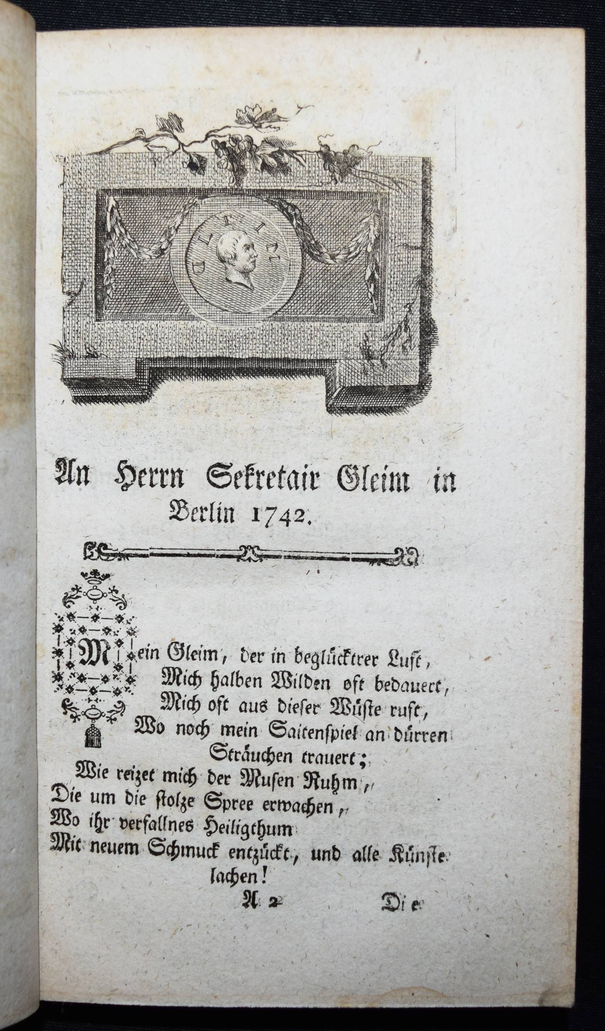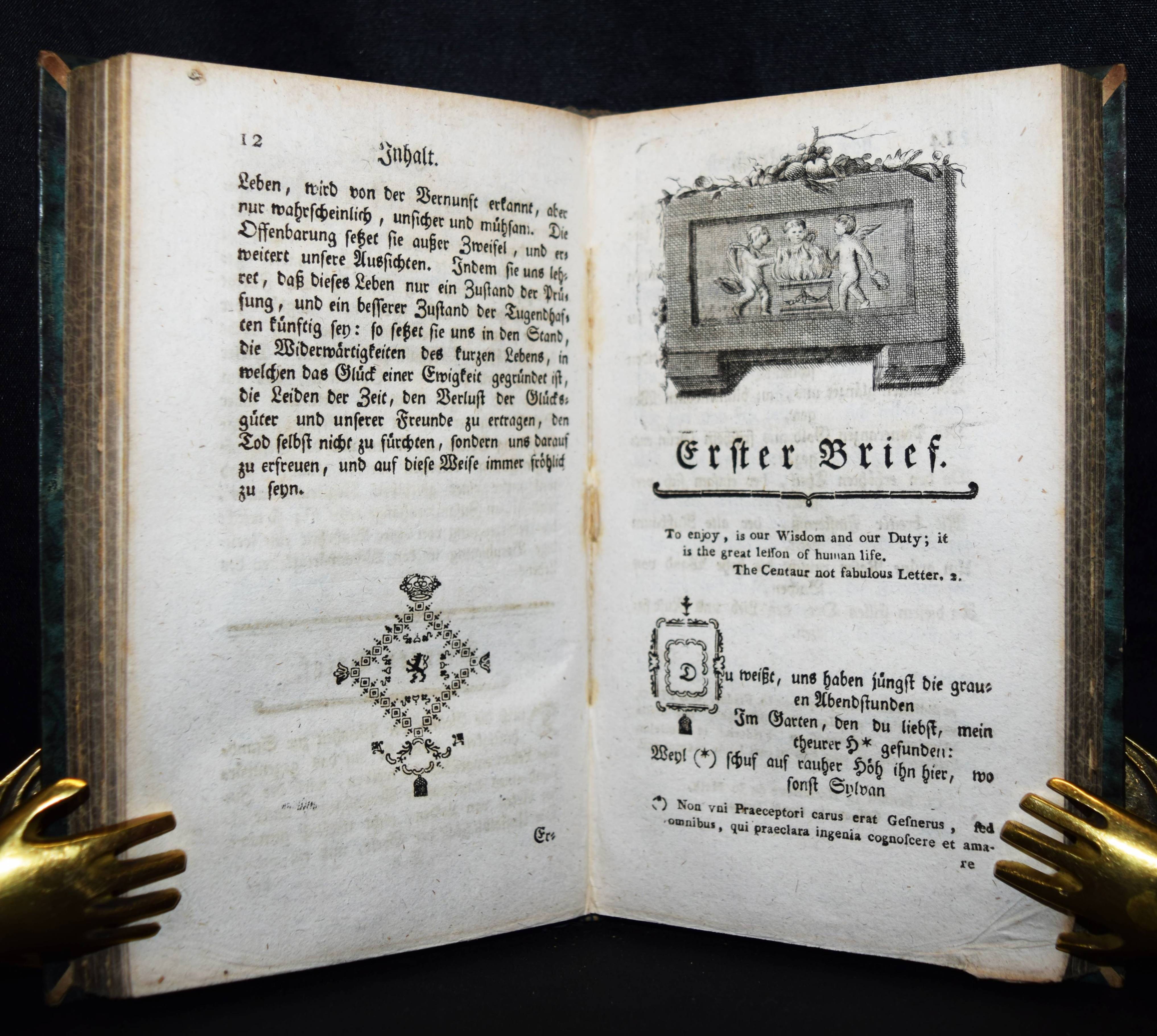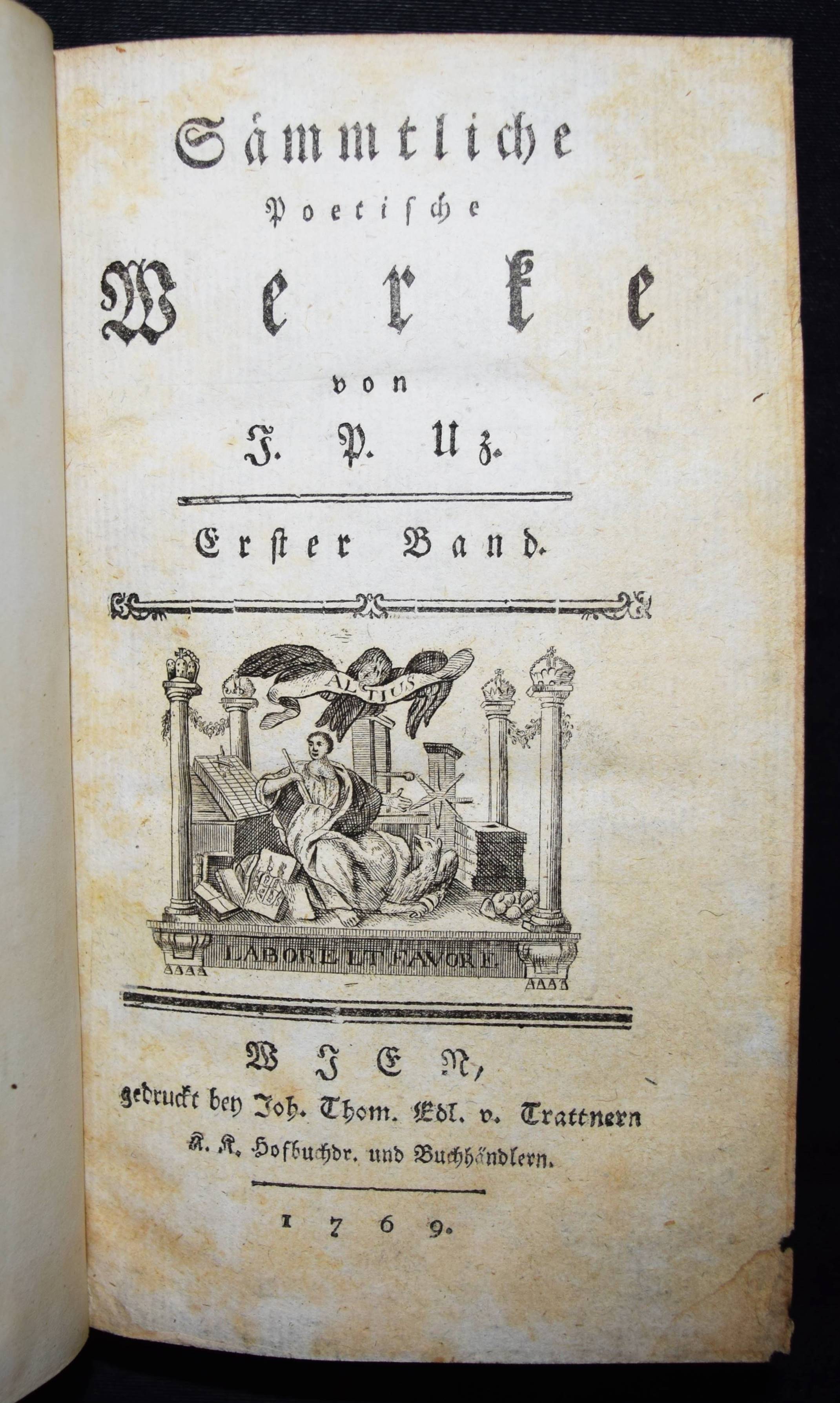 Uz, J(ohann) P(eter). Sämmtliche poetische Werke. Erster (und) zweyter Band. 2 Bände in 1. Wien, Trattner 1769. Kl.-8°. [6] Bl., 269 S.; [2] Bl., 275, (1) S. mit wdh. Titelvignette u. 6 gestoch. Kopfvignetten. Hldr. d. 19. Jahrhunderts mit goldgepr. Rückensch. u. Rückenvergoldung. VD18 80226612. Vgl. Goedeke IV/1, 90, 7a. Hayn-Gotendorf VIII, 57. – Wiener Nachdruck der ersten Gesamtausgabe der Gedichte (Leipzig 1768). Der zweite Band mit den Briefen (S. 195 ff.). – Stellenweise etwas braunfleckig, gutes dekorativ gebundenes Exemplar.