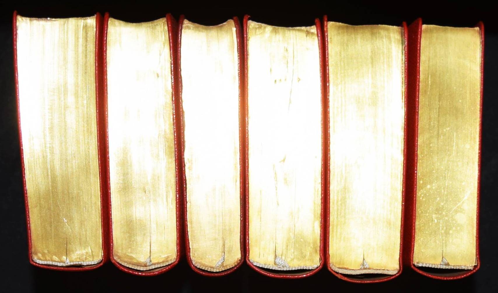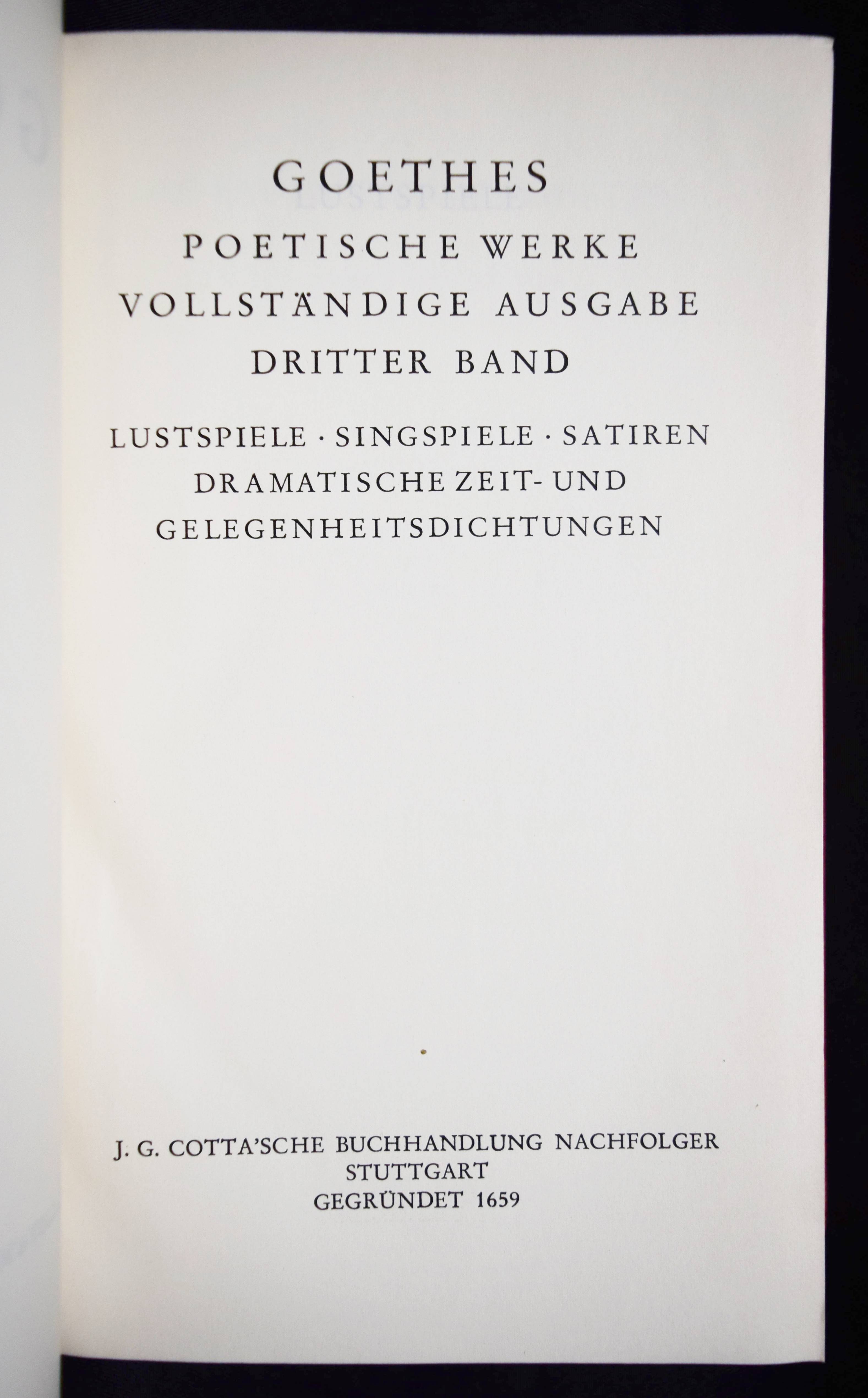 Goethe, (Johann Wolfgang v.). Gesammelte Werke. I. Gedichte. – III. Lustspiele, Singspiele, Satiren, dramatische Zeit- und Gelegenheitsdichtungen. – IV. Frühe Dramen, Bruchstücke, Übersetzungen und Bearbeitungen. – V. Die großen Dramen. – VII. Erzählende Dichtungen, zweiter Teil. Und. XIV. Übertragungen. Herausgegeben von Karl Maurer. (GA, Vierzehnter Band). Mischaufl. Zus. 6 Bände. Stuttgart, Cotta (1953-1963). 8°. Weinrote Orig.-Saffianlederbände mit goldgepr. Rückentitel u. Kopfgoldschnitt. (Gesamtausgabe der Werke und Schriften in zweiundzwanzig Bänden, Band I, III, IV, V, VII u. XIV). Dünndruck-Ausgabe. – Buchausstattung: Richard Herre. – Sehr gute Exemplare der wertvollen Ganzlederausgabe.
