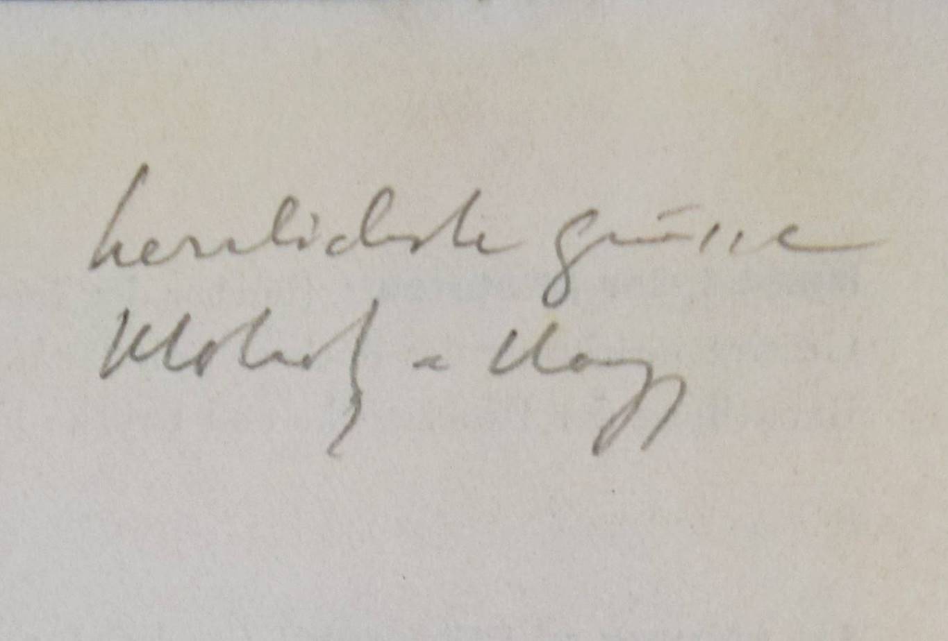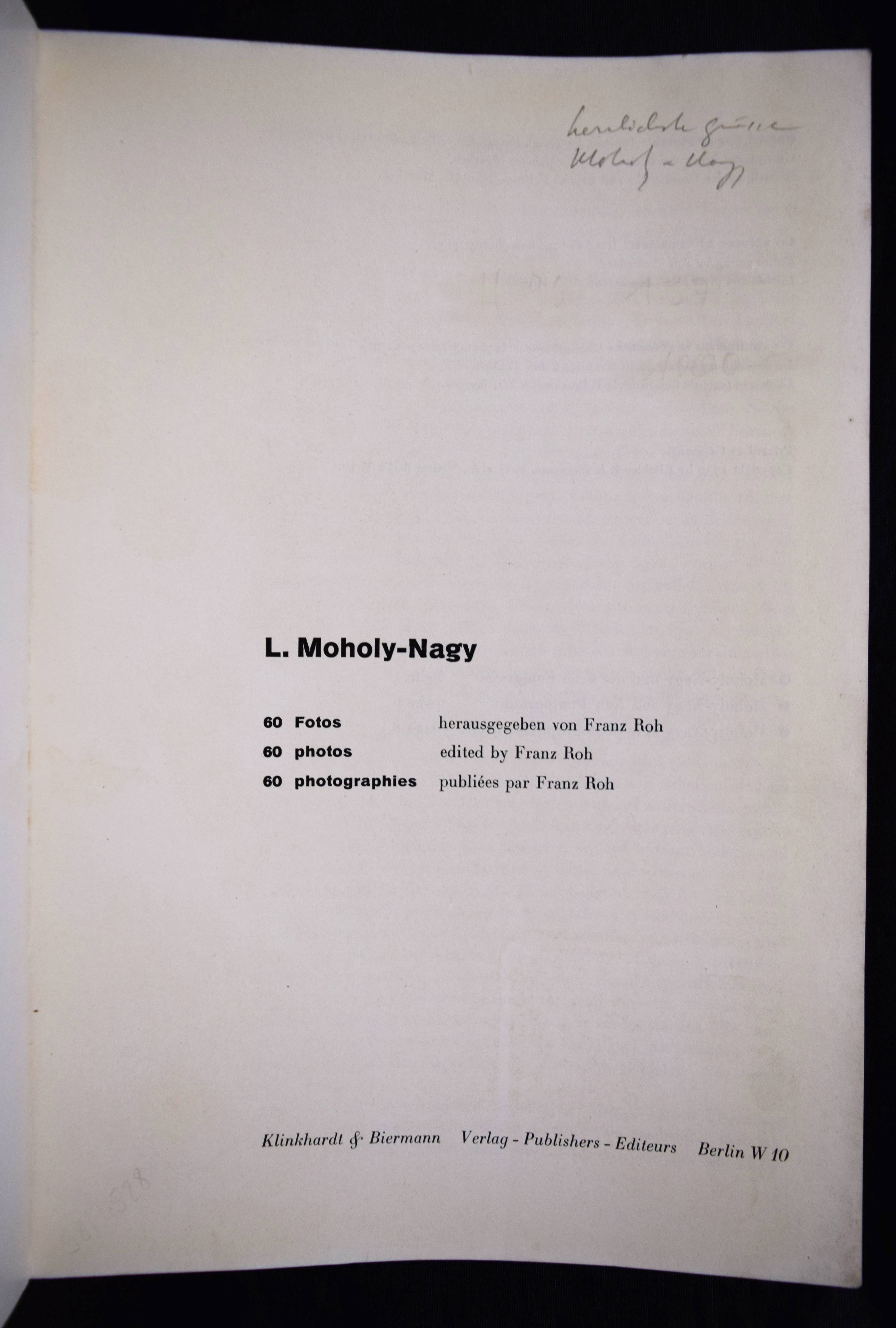 Moholy-Nagy, L(ászló). 60 Fotos. 60 photos. 60 photographies. Herausgegeben von Franz Roh. Berlin, Klinkhardt & Biermann 1930. Gr.-8°. 60 S., [2] Bl. mit 60 Abb. auf Tafeln. Illustr. OKart. (Fototek, Band 1). Auer 158. Dokumentations-Bibliothek VI, 307. Heidtmann 5508. Heiting/Jaeger I, 332 ff. (mit mehreren Abb.). Koetzle 276 (mit Abb.). – Erste Ausgabe. – Mit eigenhändiger Widmung von László Moholy-Nagy „herzliche Grüsse Moholy-Nagy″. – Buchgestaltung und Typographie: Jan Tschichold. – Mit Einführungen in Deutsch, Englisch und Französisch von F. Roh: „Moholy-Nagy und die neue Fotografie“ und „Der literarische Foto-Streit“. – I. „Hervorragender Querschnitt durch das photographische Werk Moholy-Nagys“ (H. Bolliger). – „Moholys künstlerisches Credo stellte auch die Fotografie absolut in den Rahmen seiner pädagogischen Absicht des ‚Neuen Sehens‘“ (A. Haus in Koetzle). – Moholy wollte die herkömmliche „natürliche“ Wahrnehmung durch den industriellen Blick der Fotografie ersetzen. Die Welt zeigt sich aus bis dahin fast unbekannten Perspektiven, die abgebildeten Gegenstände ordnen sich zu abstrakten Rhythmen unter dem neutralen Auge der Kamera“ (J. Fiedler in Bauhaus, S. 295). – Der ungarisch-US-amerikanische Maler, Photograph, Typograph und Bühnenbildner Laszló Moholy-Nagy (1895-1946) war von 1923 bis 1928 Lehrer am Bauhaus. – Rücken stellenweise etwas berieben, Deckel minimal angestaubt, sehr gutes Exemplar.