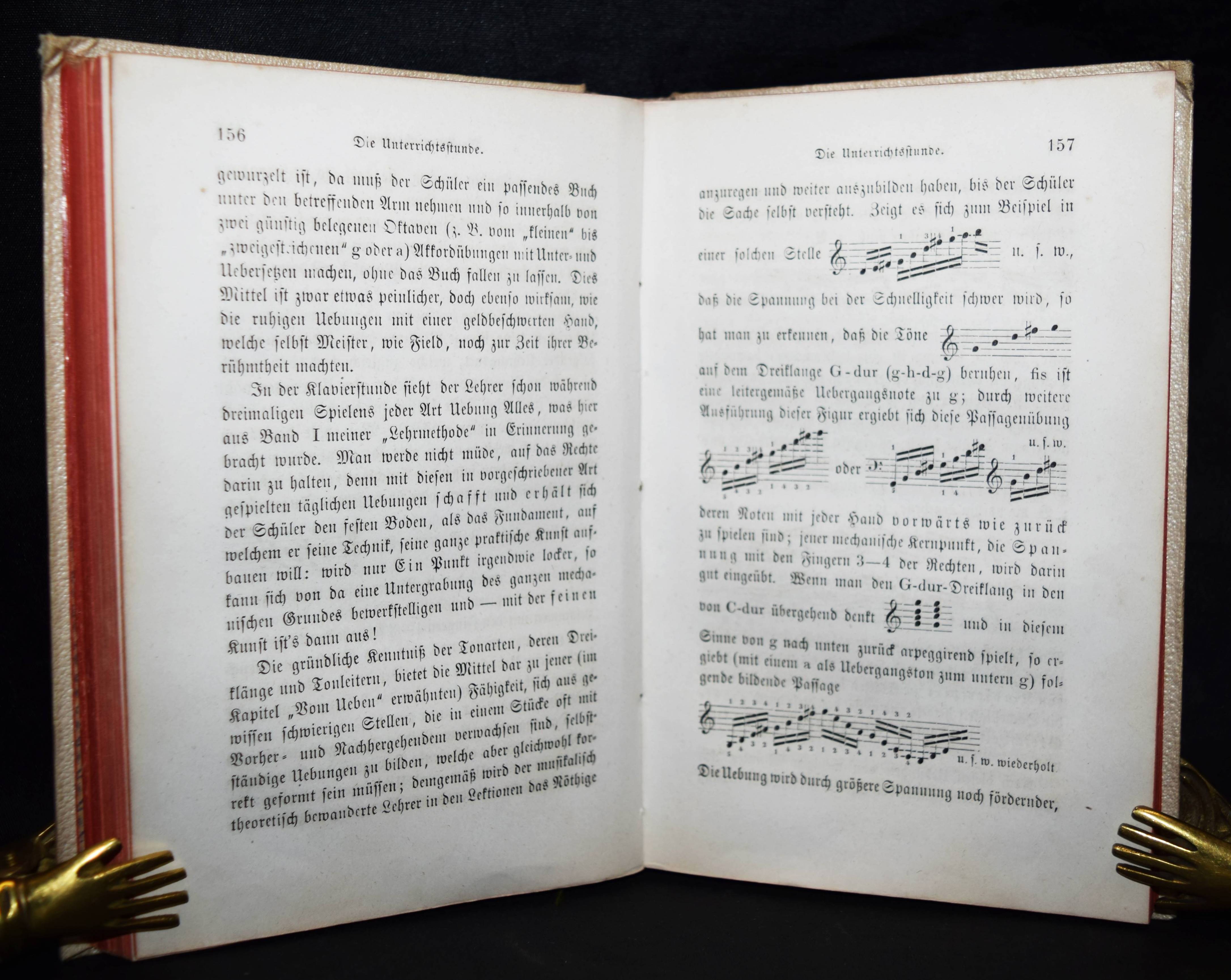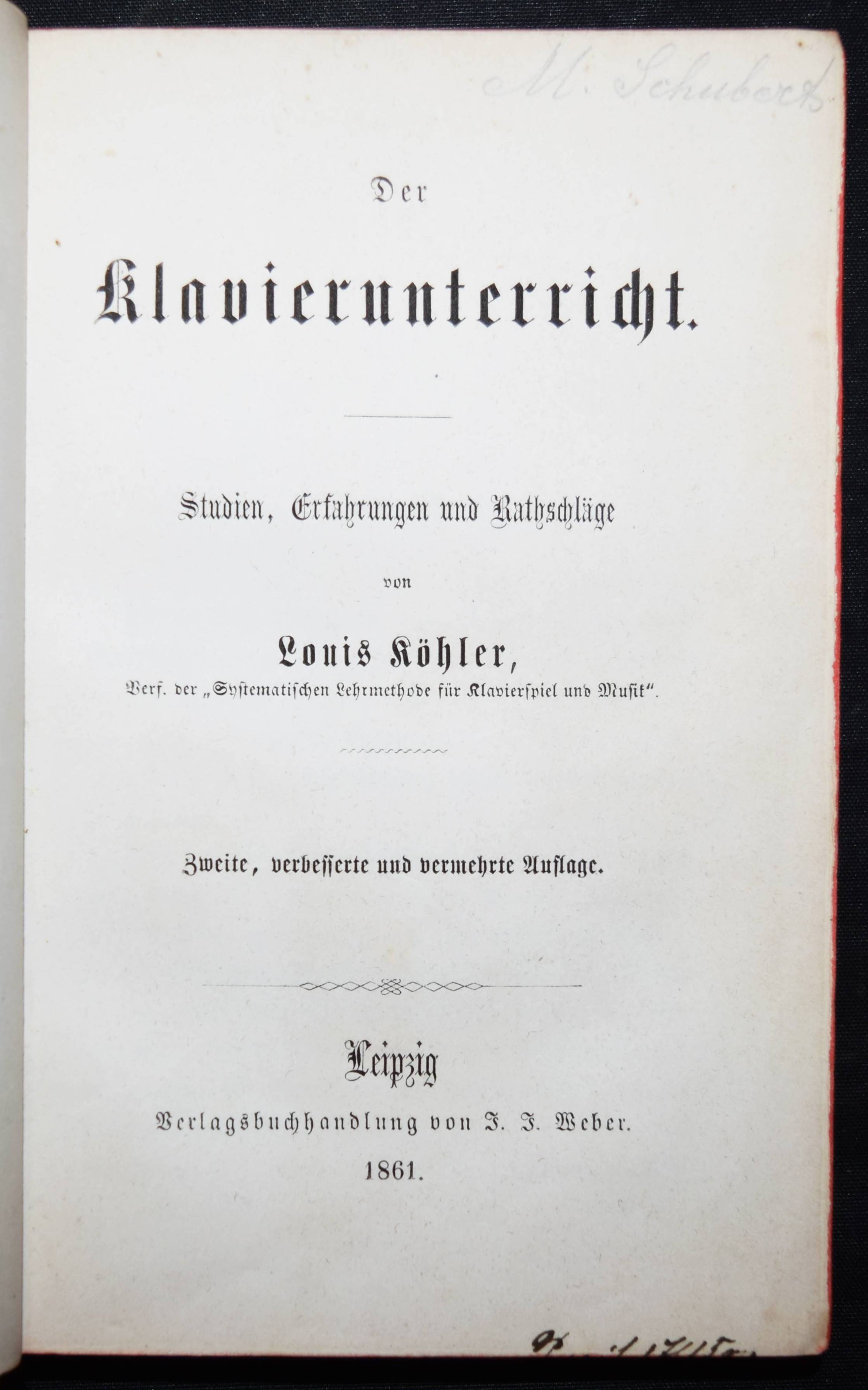 Köhler, Louis. Der Klavierunterricht. Studien, Erfahrungen und Rathschläge. 2., verbesserte und vermehrte Auflage. Leipzig, J. J. Weber 1861. Kl.-8°. XII, 300 S. mit Musikbeispielen. Ln. d. Zt. mit goldgepr. Rückenschild. NDB XII, 307 ff. – Erweiterte und verbesserte Ausgabe des interessanten Lehrbuchs. – L. Köhler (1820-1886) „ließ sich 1845 als 2. Dirigent des Stadttheaters und Leiter des Sängervereins in Königsberg nieder. – Hier erkannte K. seine eigentliche Lebensaufgabe als Klavierpädagoge und Musikschriftsteller und konzentrierte sich seit 1847 ausschließlich auf diese Tätigkeiten. Mit seinem Klavierunterricht war er so erfolgreich, daß er ihn bereits seit 1856 in „Zirkeln“ erteilen mußte. Dabei war ihm eine einseitige technische Ausrichtung fremd, vielmehr ging es ihm um eine breite musikalische Ausbildung seiner Schüler, zu denen unter anderem die Komponisten Adolf Jensen, Hermann Goetz und Alfred Reisenauer gehörten“ (T.-M. Langner in NDB). – Einband etwas angestaubt, Rückenschild mit kl. Fehlstellen, gutes Exemplar.