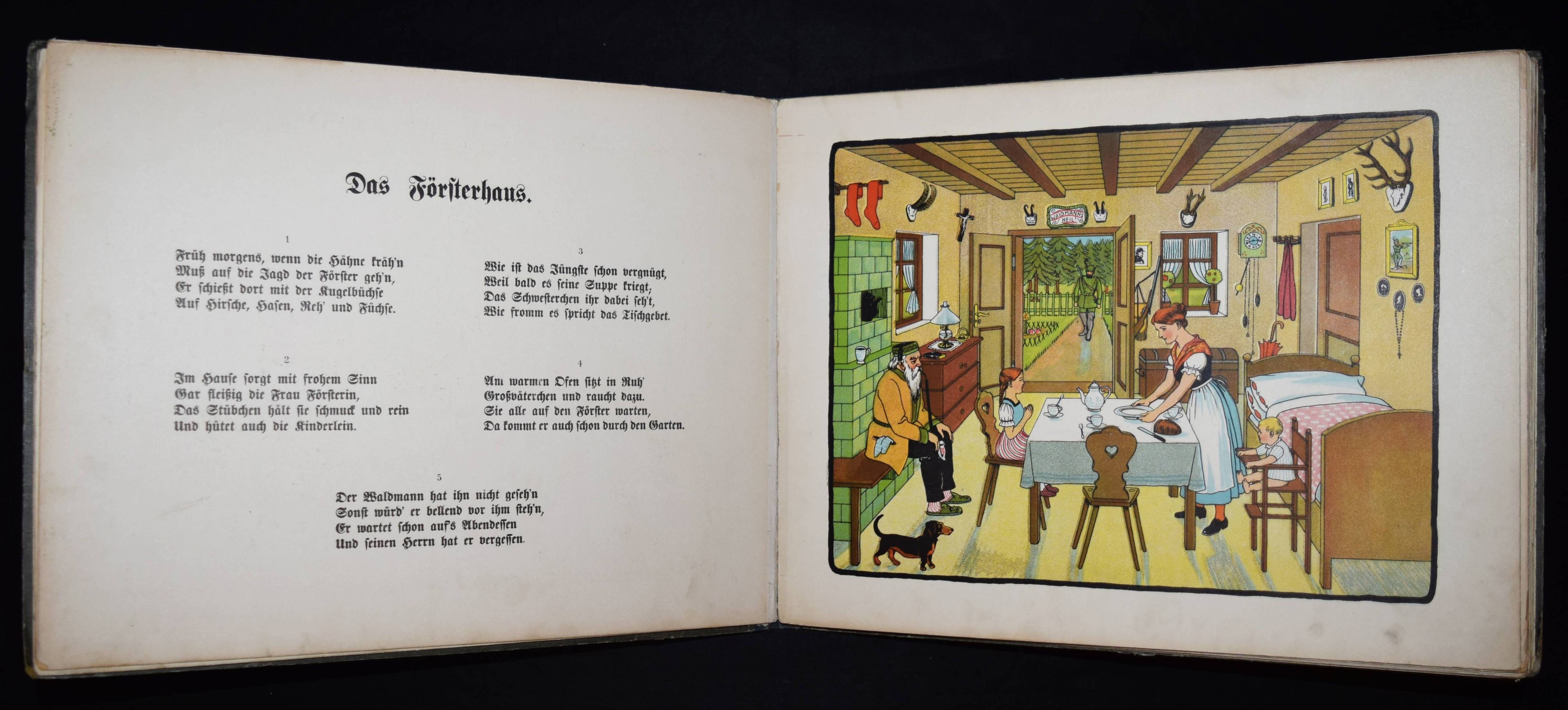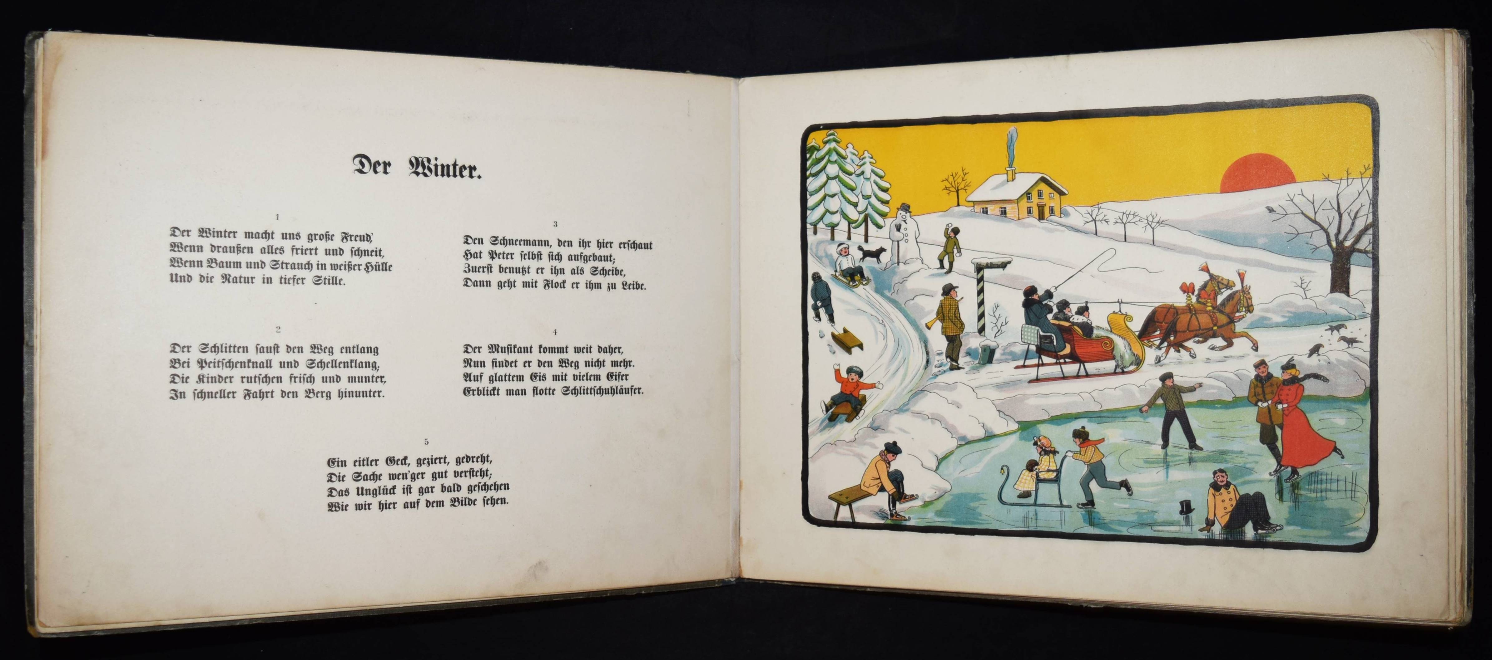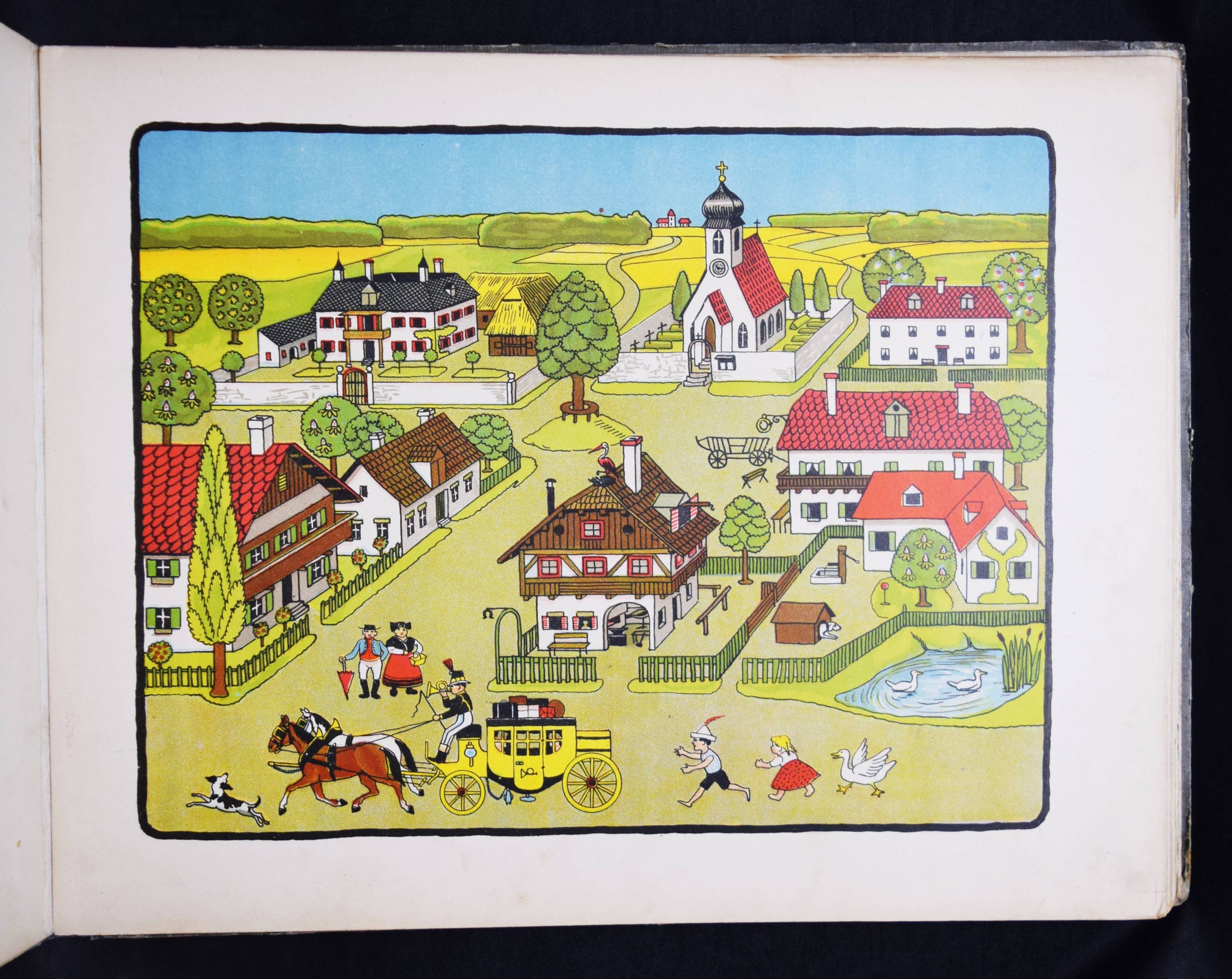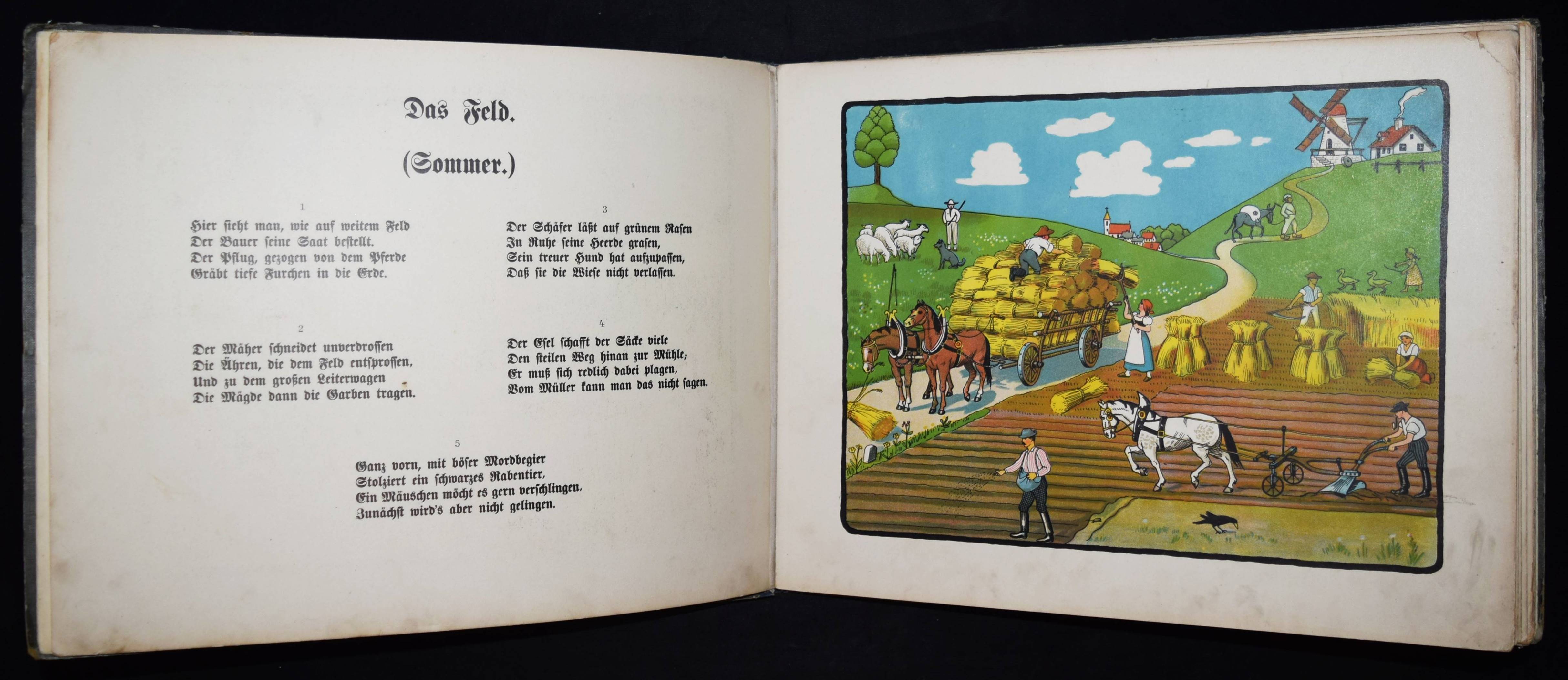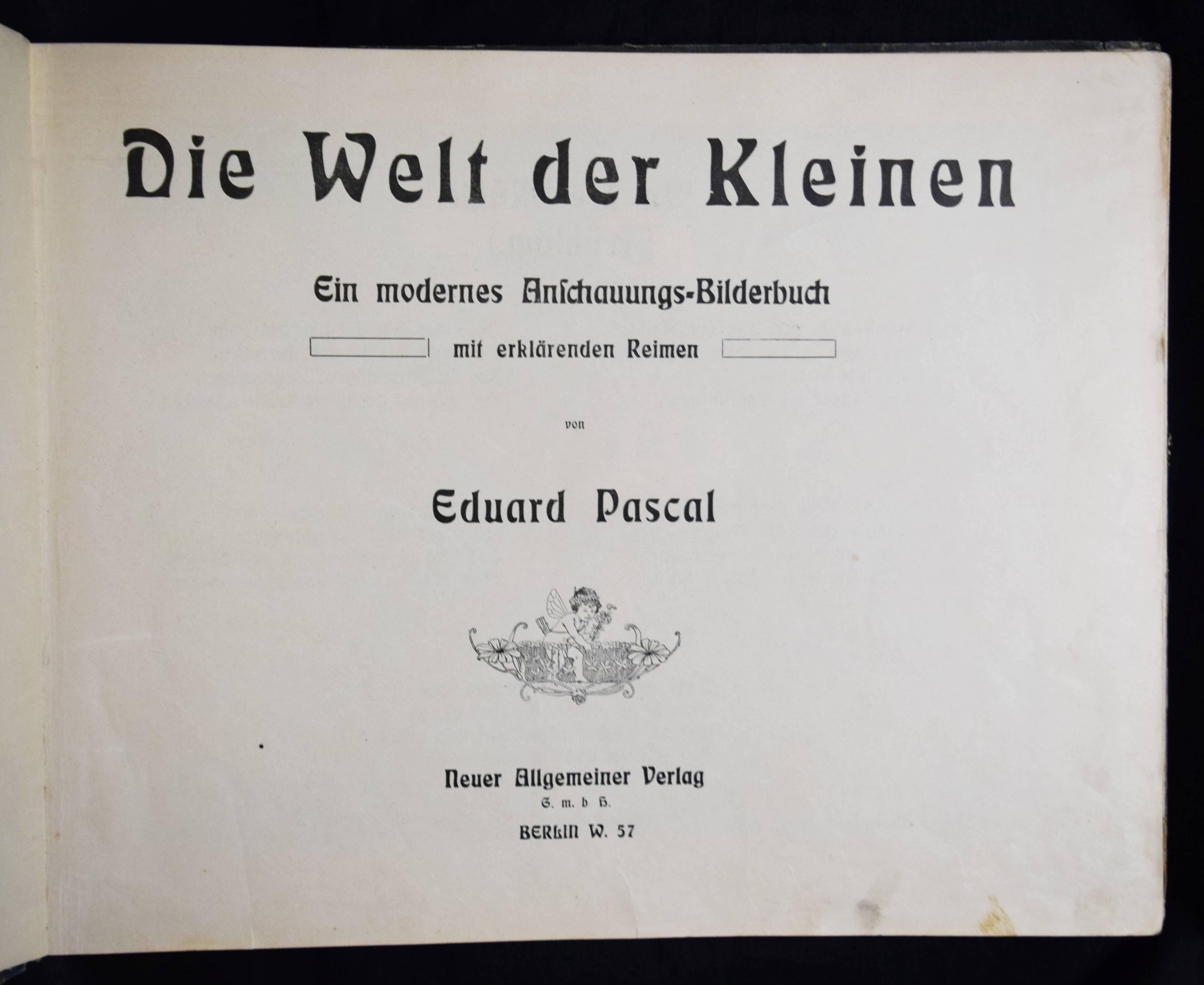 Pascal, Eduard. Die Welt der Kleinen. Ein modernes Anschauungs-Bilderbuch mit erklärenden Reimen. Berlin, Neuer Allgemeiner Verlag o. J. (1905). Quer-Gr.-4° (29 x 37 cm.). Titel u. 16 farblithogr. Tafeln. OHln. mit farblithogr. Deckelbild. Klotz, Bilderbücher 4173/1. Nicht bei Ries. – Einzige Ausgabe, selten. – „Dieses „moderne“ Anschauungs-Bilderbuch unterscheidet sich grundsätzlich von den Titeln, die z. B. J. F. Schreiber in dieser Zeit anbietet. Der Text ist jeweils in Verse gefasst und erklärt nicht nur die Inhalte der Bilder sondern auch die Lebensumstände der dargestellten Personen. Die ersten vier Tafeln zeigen Jahreszeitenbilder: Die Mühle (Frühling), Das Feld (Sommer), Weinernte (Herbst), Schlittenfahrt, Eislauf etc. (Winter). Es folgen Einzeldarstellungen mit reicher Detailzeichnung: Das Försterhaus, Die Jagd, Das Dorf, Der Bauernhof, Das Landhaus, Das Gebirge, Der Strand, Die Wüste, Das Meer, Die Schlacht und die Festwiese“ (W. Geisenheyner, Katalog 84, Nr. 85). – Ecken und Kanten berieben, die Tafeln im w. Rand etwas fingerfleckig, gutes Exemplar.