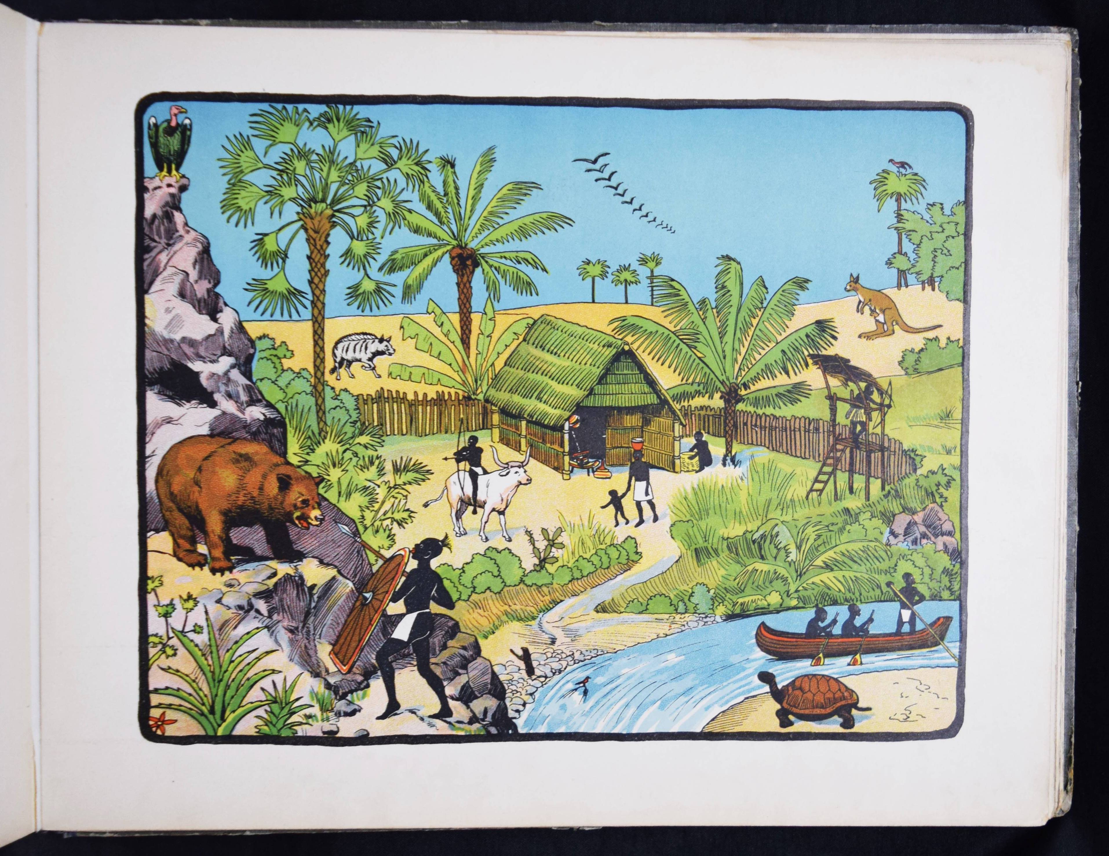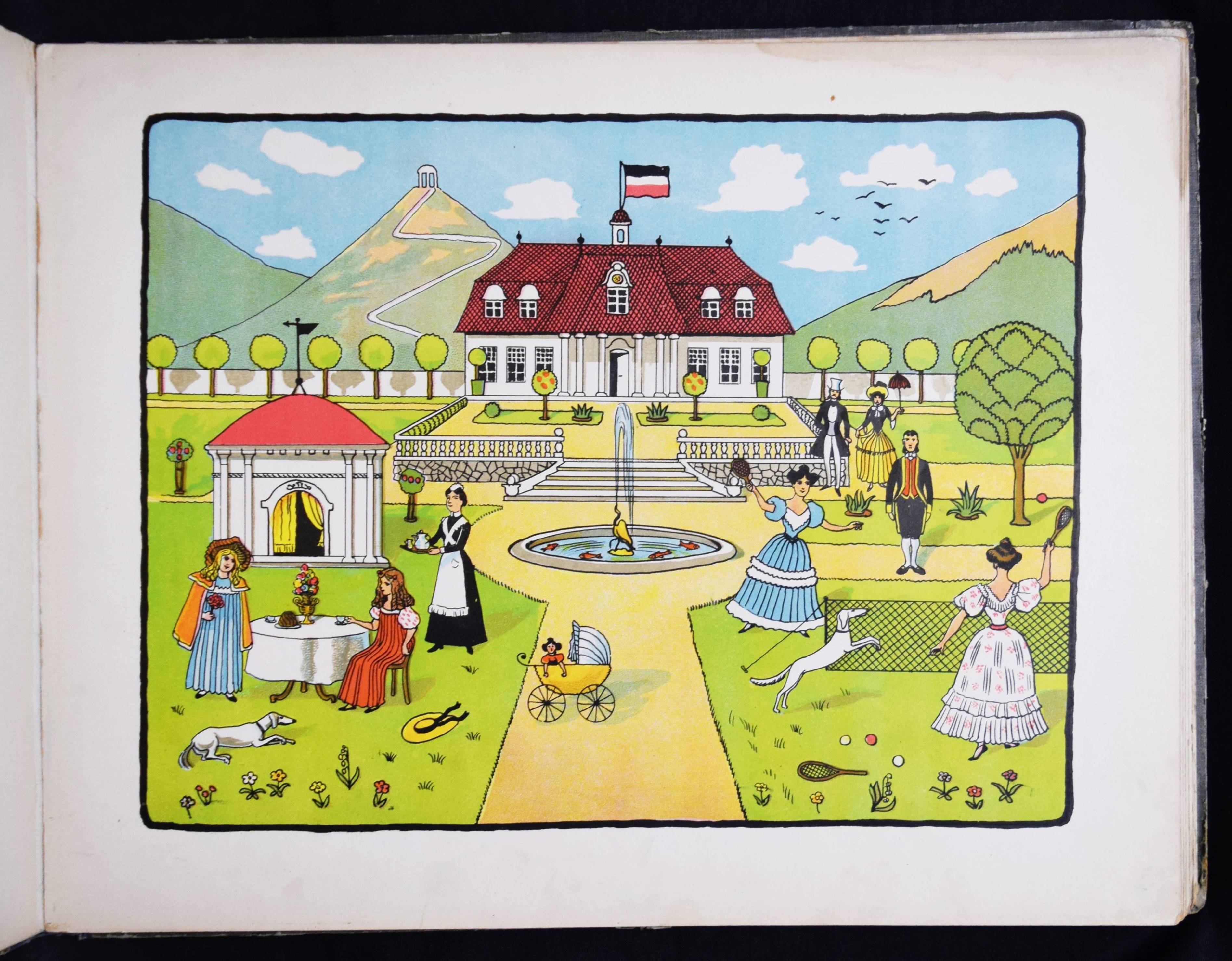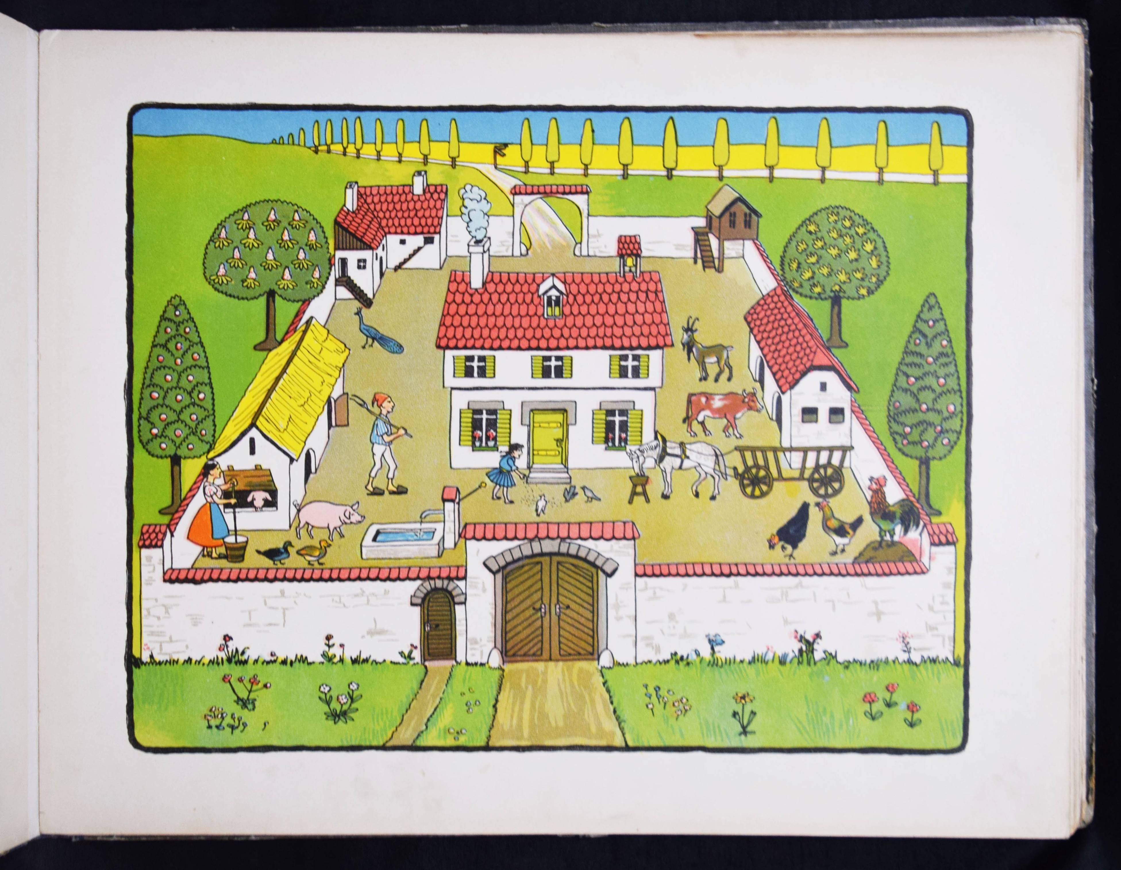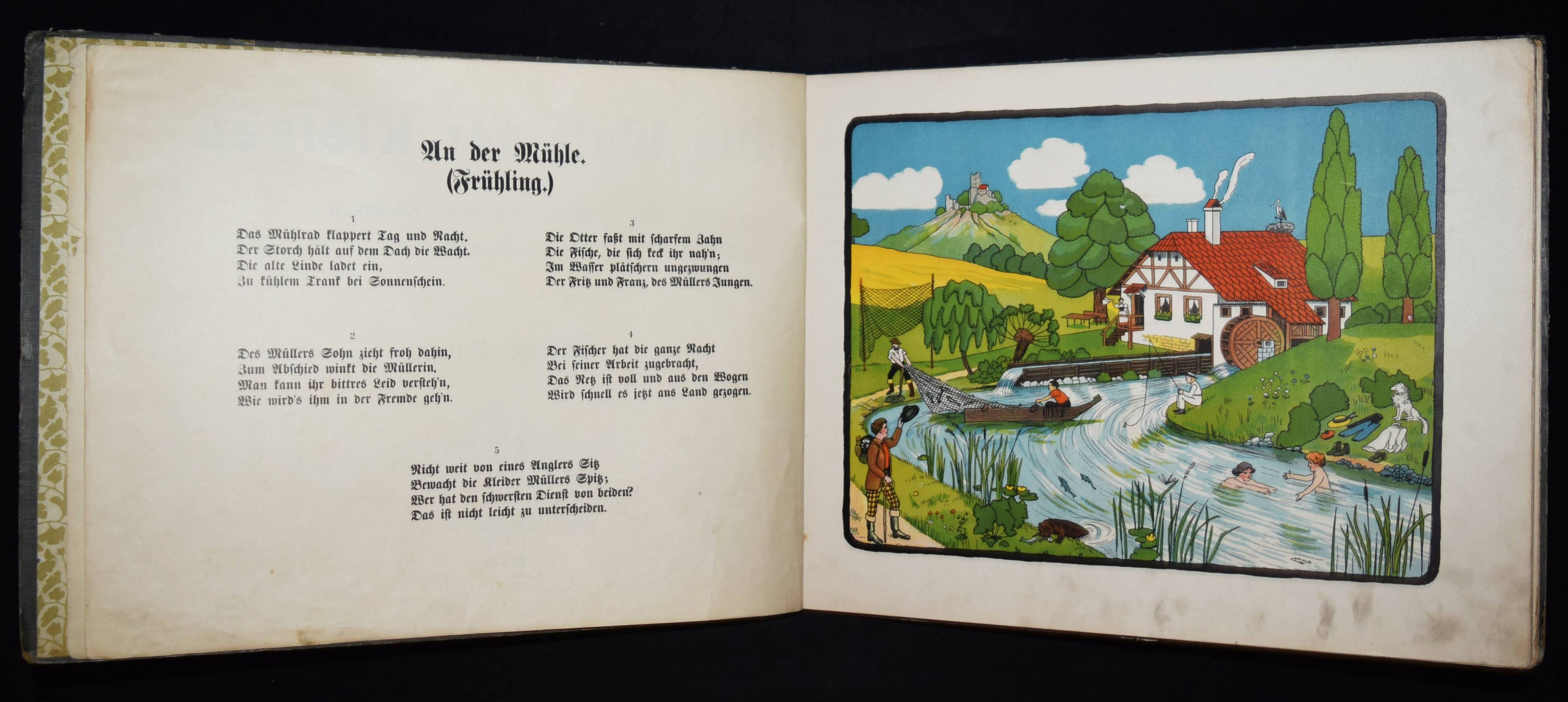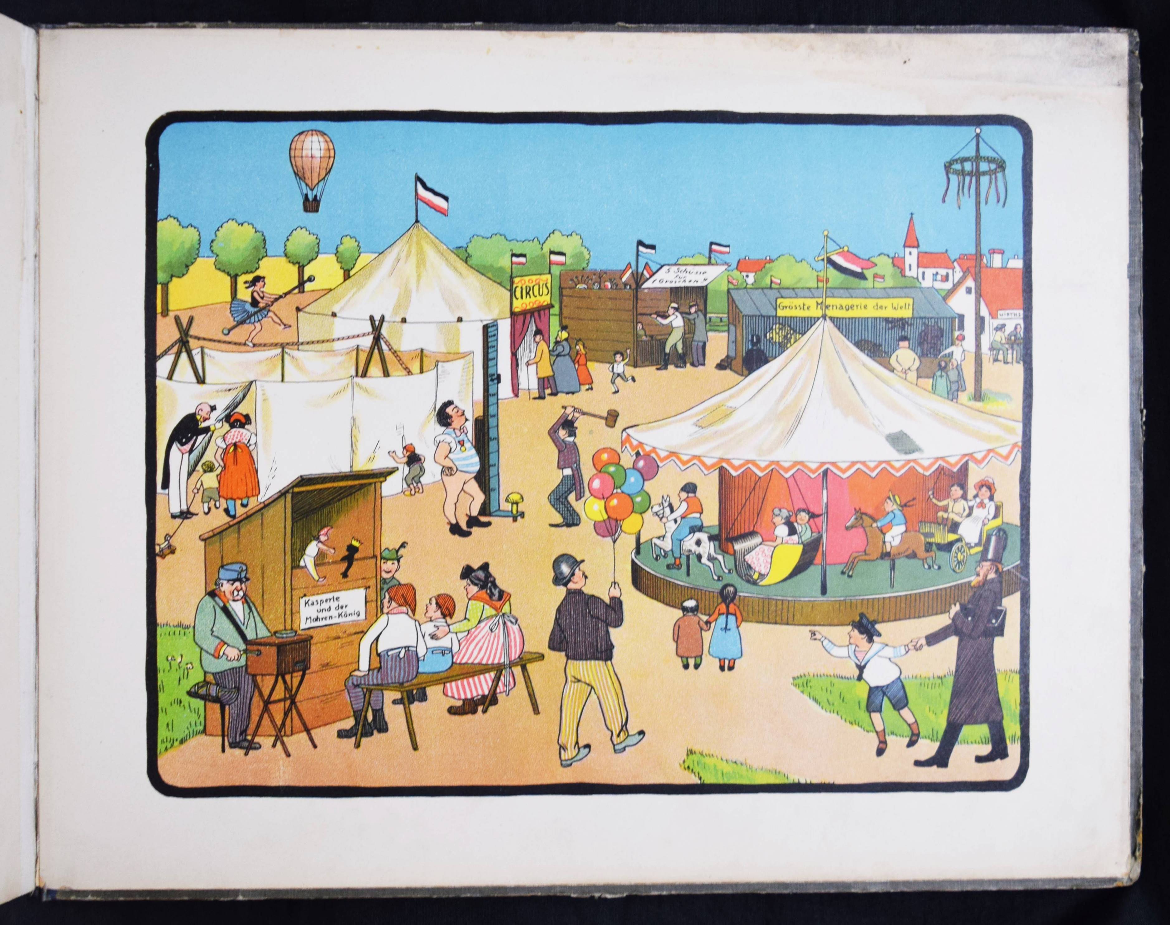 Pascal, Eduard. Die Welt der Kleinen. Ein modernes Anschauungs-Bilderbuch mit erklärenden Reimen. Berlin, Neuer Allgemeiner Verlag o. J. (1905). Quer-Gr.-4° (29 x 37 cm.). Titel u. 16 farblithogr. Tafeln. OHln. mit farblithogr. Deckelbild. Klotz, Bilderbücher 4173/1. Nicht bei Ries. – Einzige Ausgabe, selten. – „Dieses „moderne“ Anschauungs-Bilderbuch unterscheidet sich grundsätzlich von den Titeln, die z. B. J. F. Schreiber in dieser Zeit anbietet. Der Text ist jeweils in Verse gefasst und erklärt nicht nur die Inhalte der Bilder sondern auch die Lebensumstände der dargestellten Personen. Die ersten vier Tafeln zeigen Jahreszeitenbilder: Die Mühle (Frühling), Das Feld (Sommer), Weinernte (Herbst), Schlittenfahrt, Eislauf etc. (Winter). Es folgen Einzeldarstellungen mit reicher Detailzeichnung: Das Försterhaus, Die Jagd, Das Dorf, Der Bauernhof, Das Landhaus, Das Gebirge, Der Strand, Die Wüste, Das Meer, Die Schlacht und die Festwiese“ (W. Geisenheyner, Katalog 84, Nr. 85). – Ecken und Kanten berieben, die Tafeln im w. Rand etwas fingerfleckig, gutes Exemplar.