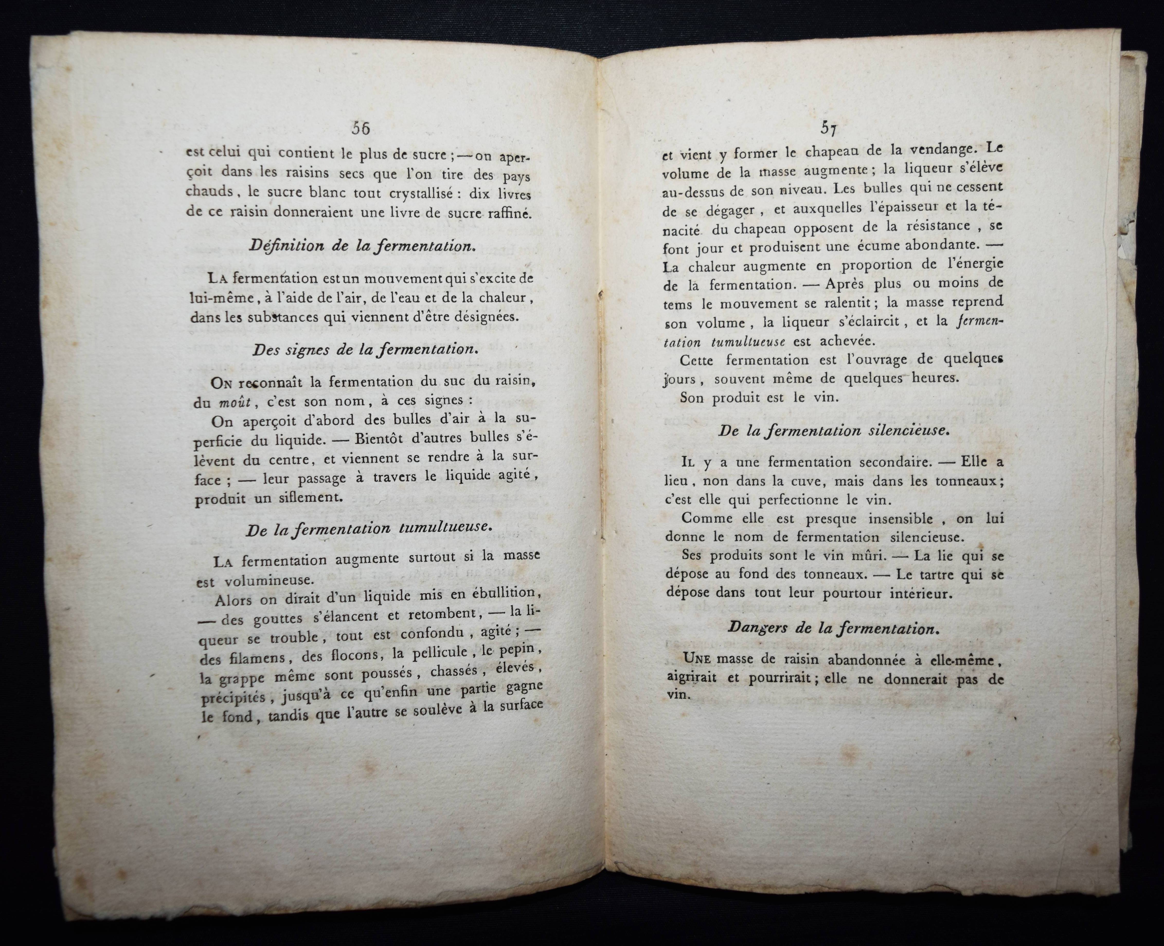 Cadet de Vaux, Antoine Alexis. L’ art de faire le vin d’après la doctrine de Chaptal. Publiée et distribuée par ordre du Gouvernement. Paris, Bureau de la Decade philosophique, littéraire et politique An IX (1800). 8°. VIII, 80 S. Br. d. Zt. Simon S. 18 (2. Ausg. von 1807). Vicaire S. 164 (3. Aufl.). Vgl. Schoene 11107 (deutsche Ausgabe mit dem Titel: „Allgemeinverständliche Anleitung zur Verfertigung des Weines“, Tübingen 1801). – Sehr seltene erste Ausgabe. Zeitgleich erschien auch die Abhandlung „Instruction sur l’art de faire le vin“ von A. A. Cadet de Vaux (1743-1828). Cadet de Vaux, „Chemiker und Landwirt, … war anfangs Apotheker, gründete das „Journal de Paris“, lebte dann als Landwirt und machte sich um die Vervollkommnung der technischen Zweige der Landwirtschaft und um den verbesserten Betrieb des Garten- und Weinbaues verdient. Er lehrte das Herabbiegen der Zweige zur Beförderung der Fruchtbildung, konstruierte einen Milchmesser und empfahl die Dampfwäsche. 1791 und 1792 war er Präsident im Departement Seine-et-Oise, unter der Republik Inspektor der Wohlfahrtspolizei in Paris und später Inspektor des Hospitals Val de Grâce. Seit 1803 fungierte C. als einer der Hauptredakteure des „Journal d’économie rurale et domestique“ und des „Cours complet d’agriculture pratique“.“ (Meyers Konversations-Lexikon 5. Aufl. 1885-1892, III, 717). – Sehr gutes unbeschnittenes Exemplar.