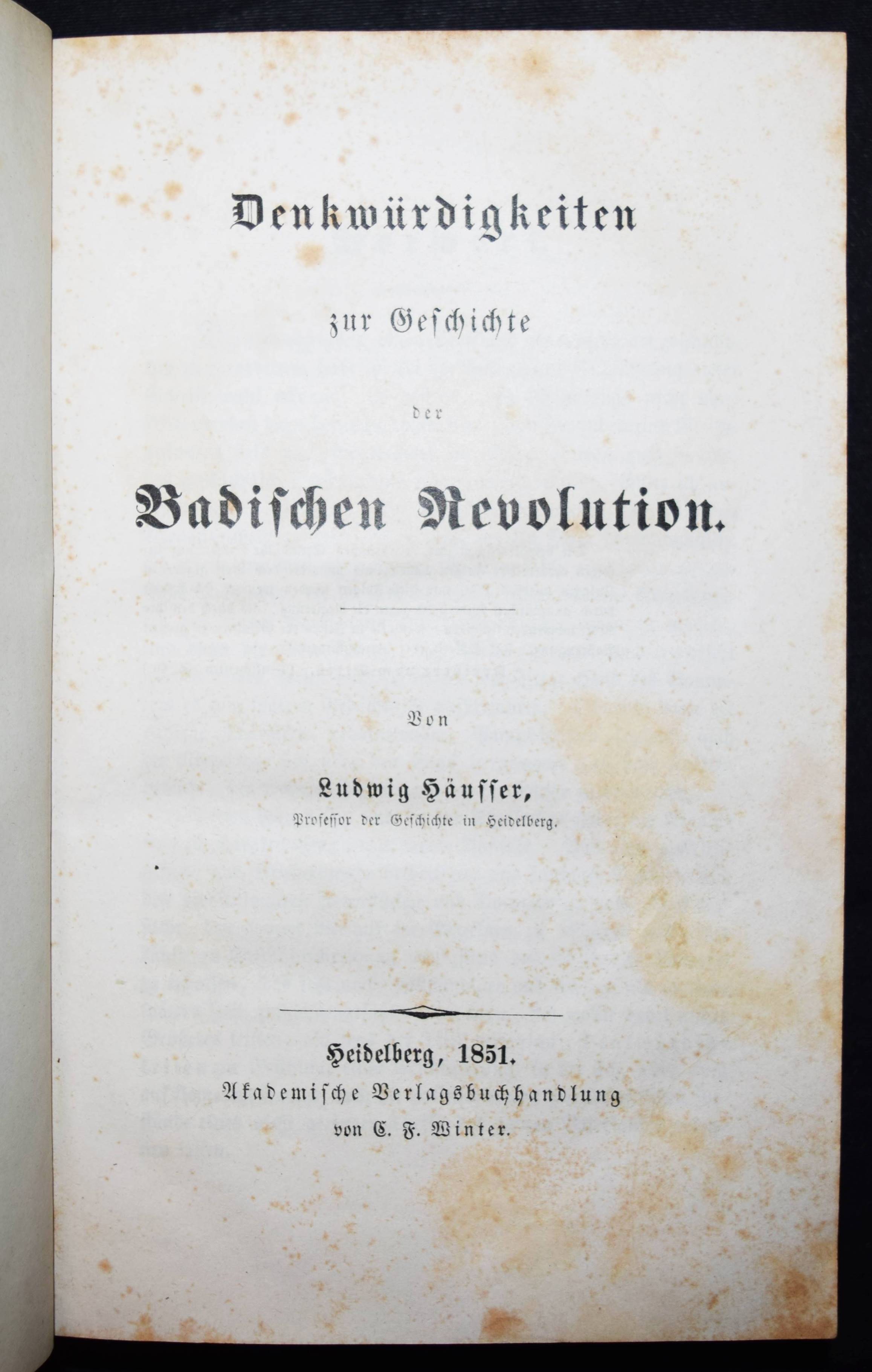 Häusser, Ludwig. Denkwürdigkeiten zur Geschichte der Badischen Revolution. Heidelberg, Winter 1851. 8°. VI, 678 S., 1 Bl. Hldr. d. Zt. mit goldgepr. Rückentitel u. Romantikervergoldung. Dahlmann-Waitz 11704. Lautenschlager 8022. – Erste Ausgabe. – Der Heidelberger Historiker L. Häusser (1818-1867) gehörte zum Kreis um Karl Mathy. Er war 1848 und 1860-65 Abgeordneter der badischen Zweiten Kammer. 1850 Mitglied des Unionsparlaments. Häusser wirkte durch seine Schriften nachhaltig auf die Diskriminierung der republikanischen Bewegung der Jahre 1848/49 im Sinne der Konstitutionellen ein. – Rücken etwas berieben, Titelblatt u. Schnitt etwas braunfleckig, gutes dekorativ gebundenes Exemplar.