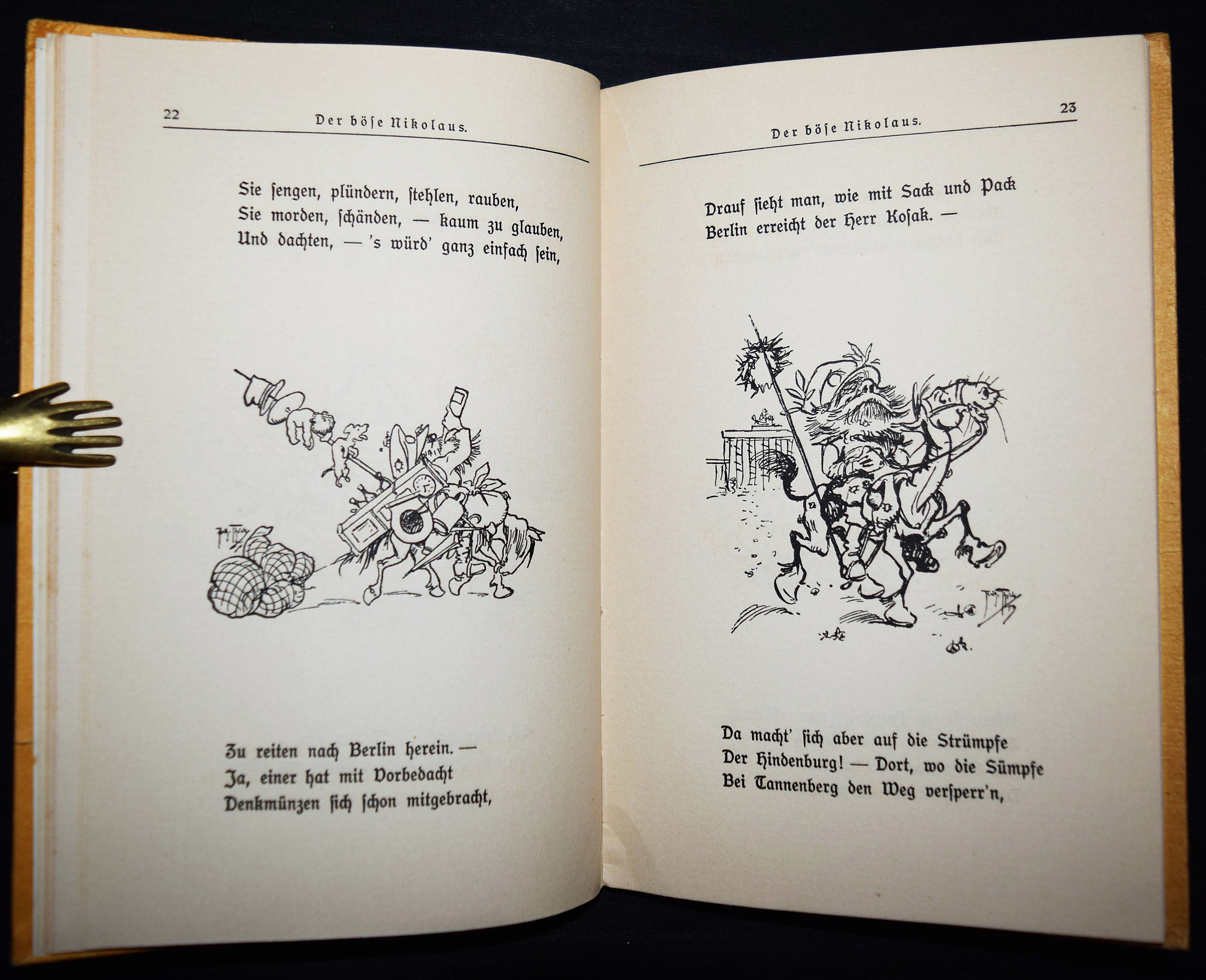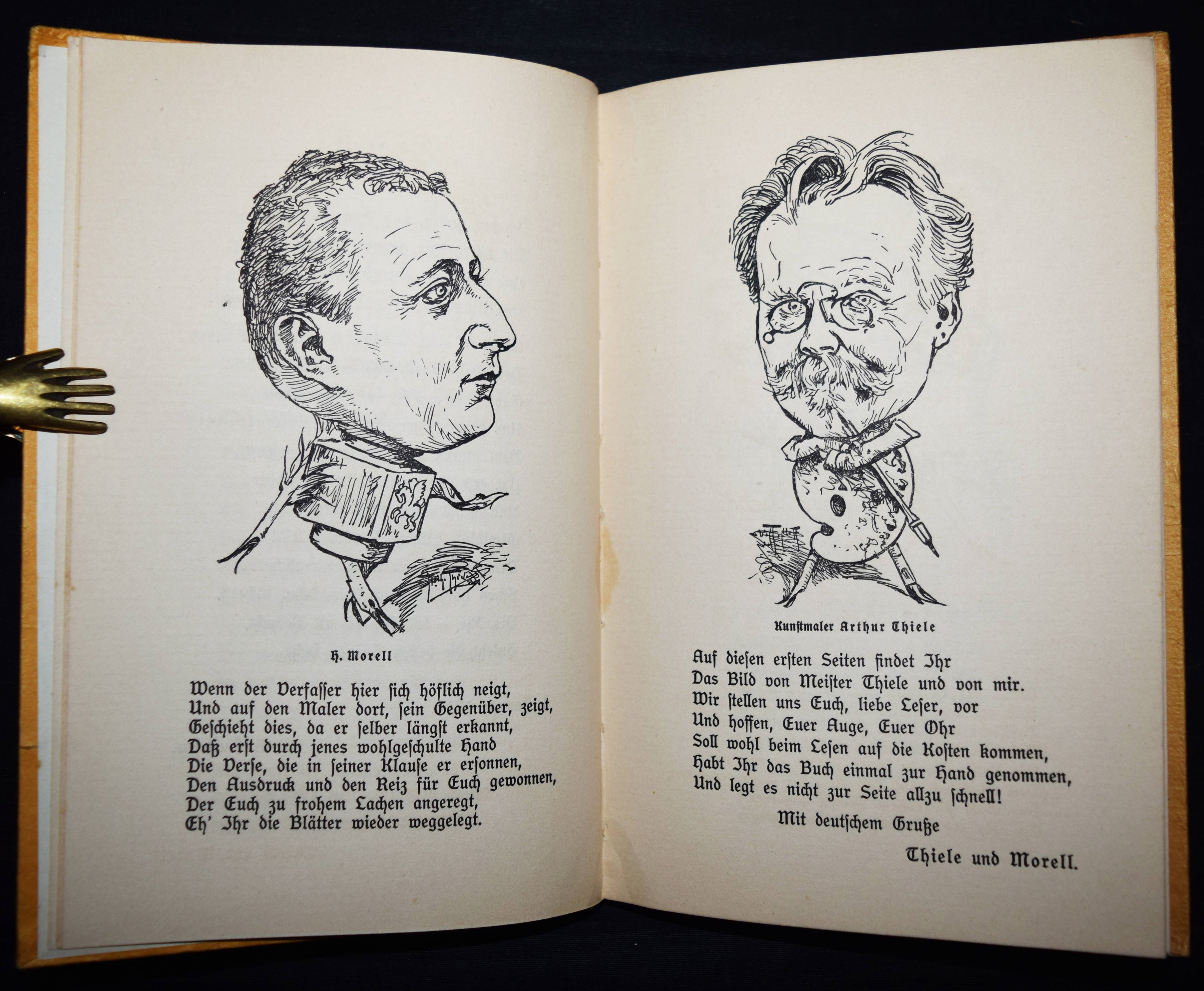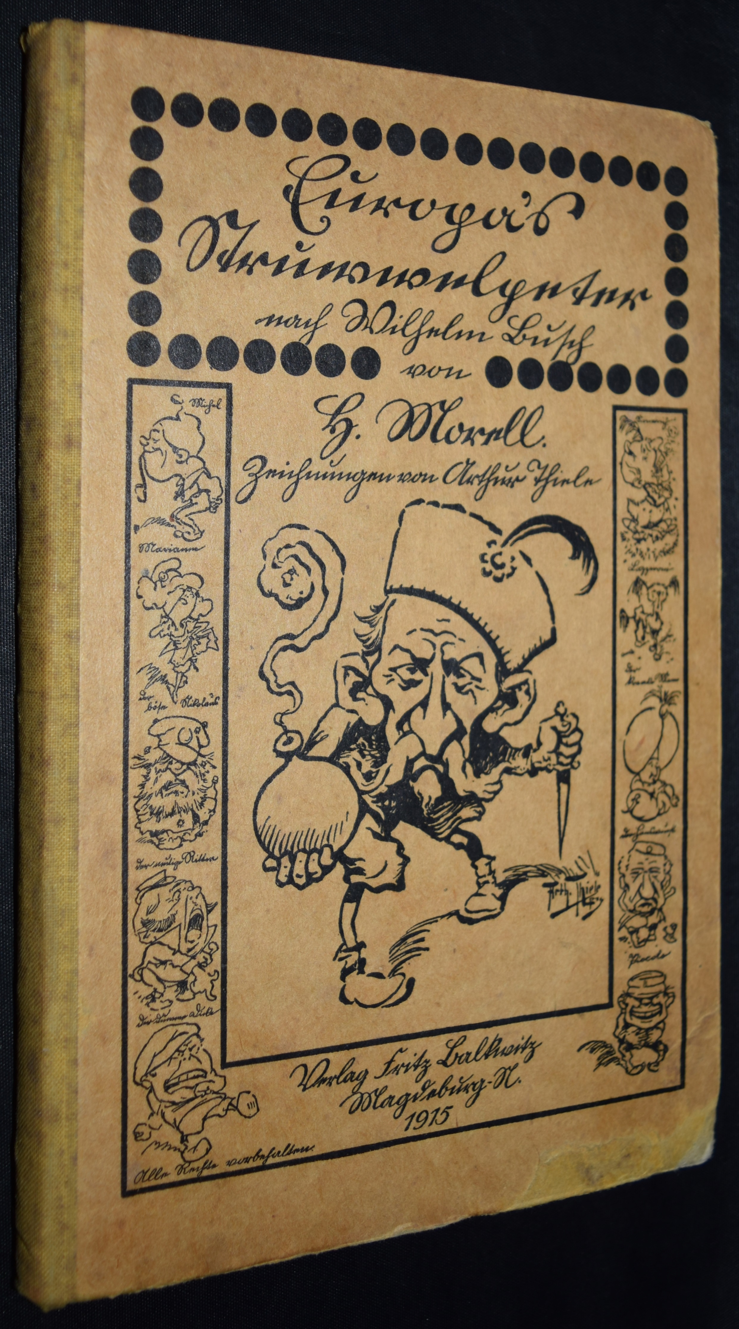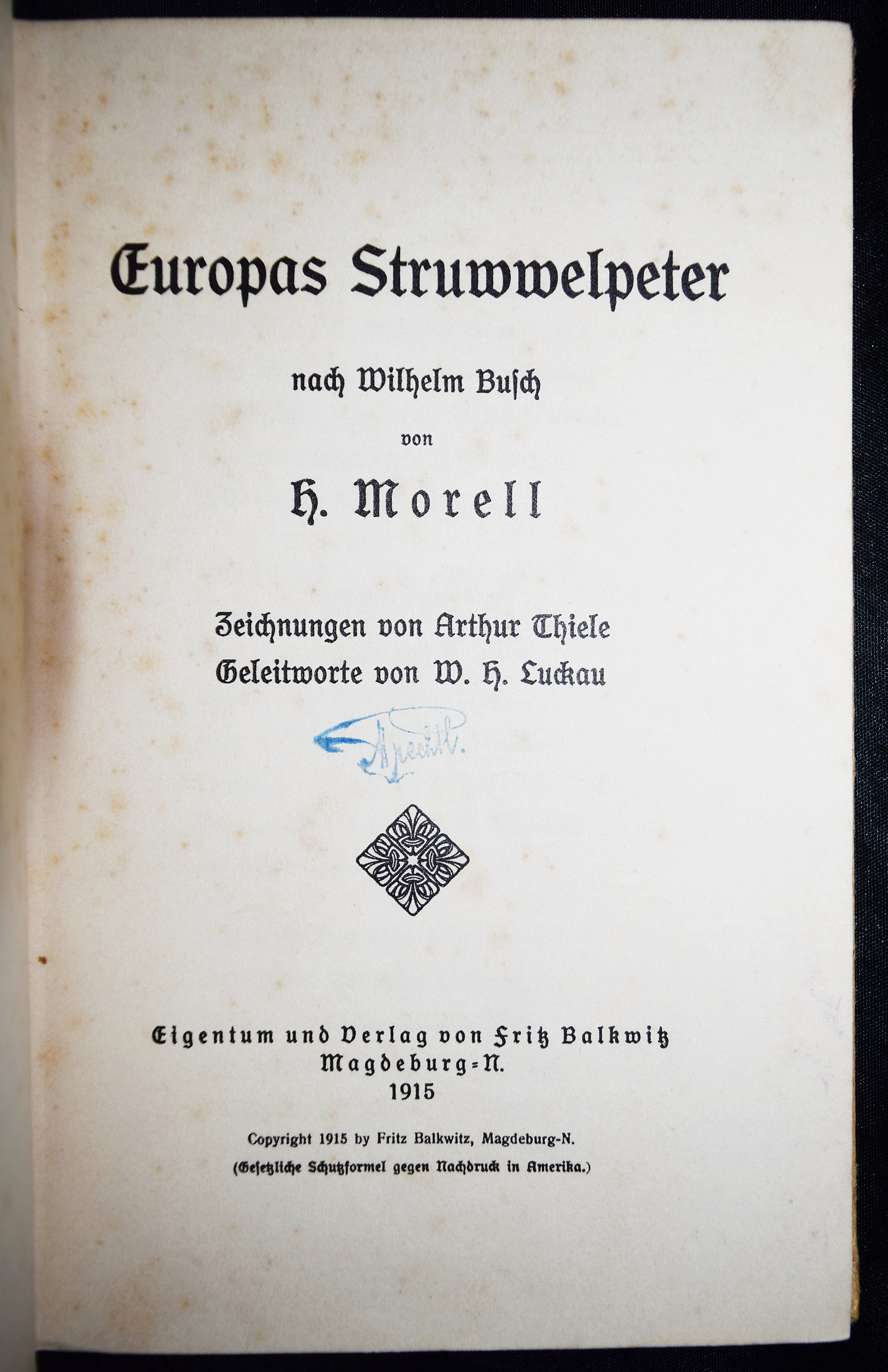 Struwwelpeteriade – Morell, H. (d. i. Hermann Jost). Europas Struwwelpeter nach Wilhelm Busch. Zeichnungen von Arthur Thiele. Geleitworte von W. H. Luckau. Magdeburg, Balkwitz 1915. 8°. 94 S., 1 w. Bl. mit zahlr. Illustrationen. Illustr. OHln. Baumgartner II, 17. Rühle 1245. Von Peter Struwwel bis Kriegsstruwwelpeter S. 49 u. 52. Wiswe 443. Vgl. Bilderwelt 1802 u. 150 Jahre Struwwelpeter S. 94 (2. Aufl. von 1916). – Erste Ausgabe dieser seltenen Struwwelpeter-Parodie. – „Dem Autor Morell (1885-?) ist entweder ein schwerer Lapsus unterlaufen, indem er als Autor des „Struwwelpeter“ Wilhelm Busch vermutet, oder er hat diese Angabe bewußt gewählt, weil die Geschichten auch den „Strichfigurengeschichten“ Buschs ähneln.“ (R. Rühle). – „Das Attentat von Sarajevo am 28.6.1914 war sicherlich der Anlaß, dem Serben-Peter die Struwwelpeterfunktion zukommen zu lassen. Umgeben von weiteren Platzhaltern für die Staaten Europas, wie dem deutschen Michel, der französischen Marianne oder dem russischen Nikolaus wird er auf dem Buchtitel als der Bombenleger für den später weltumspannenden Krieg der Jahre 1914-18 entlarvt.“ (J. Baumgartner). – Rücken u. Titel etwas stockfl., Deckel angestaubt und im unteren Rand etwas berieben, sonst gutes Exemplar.