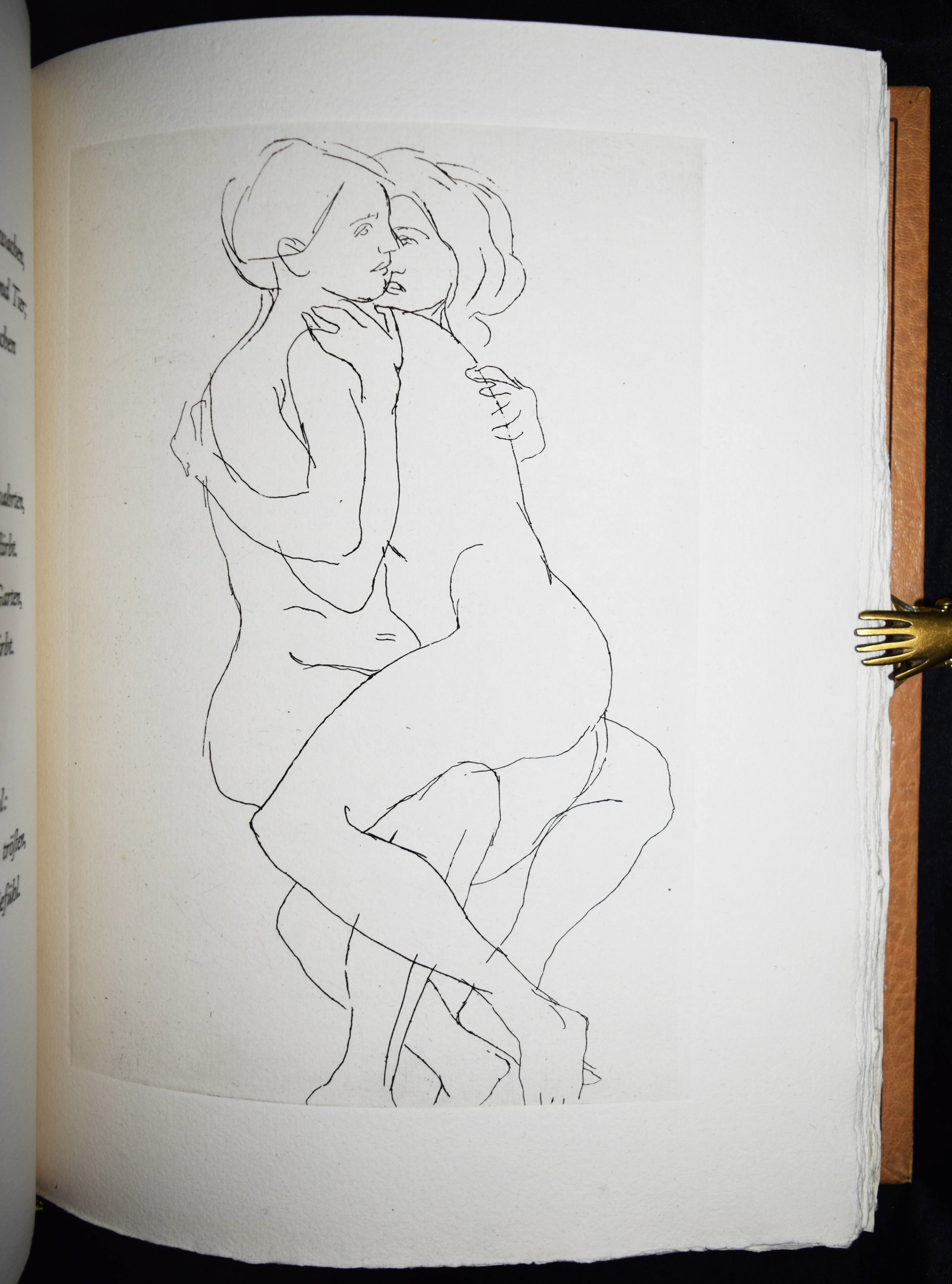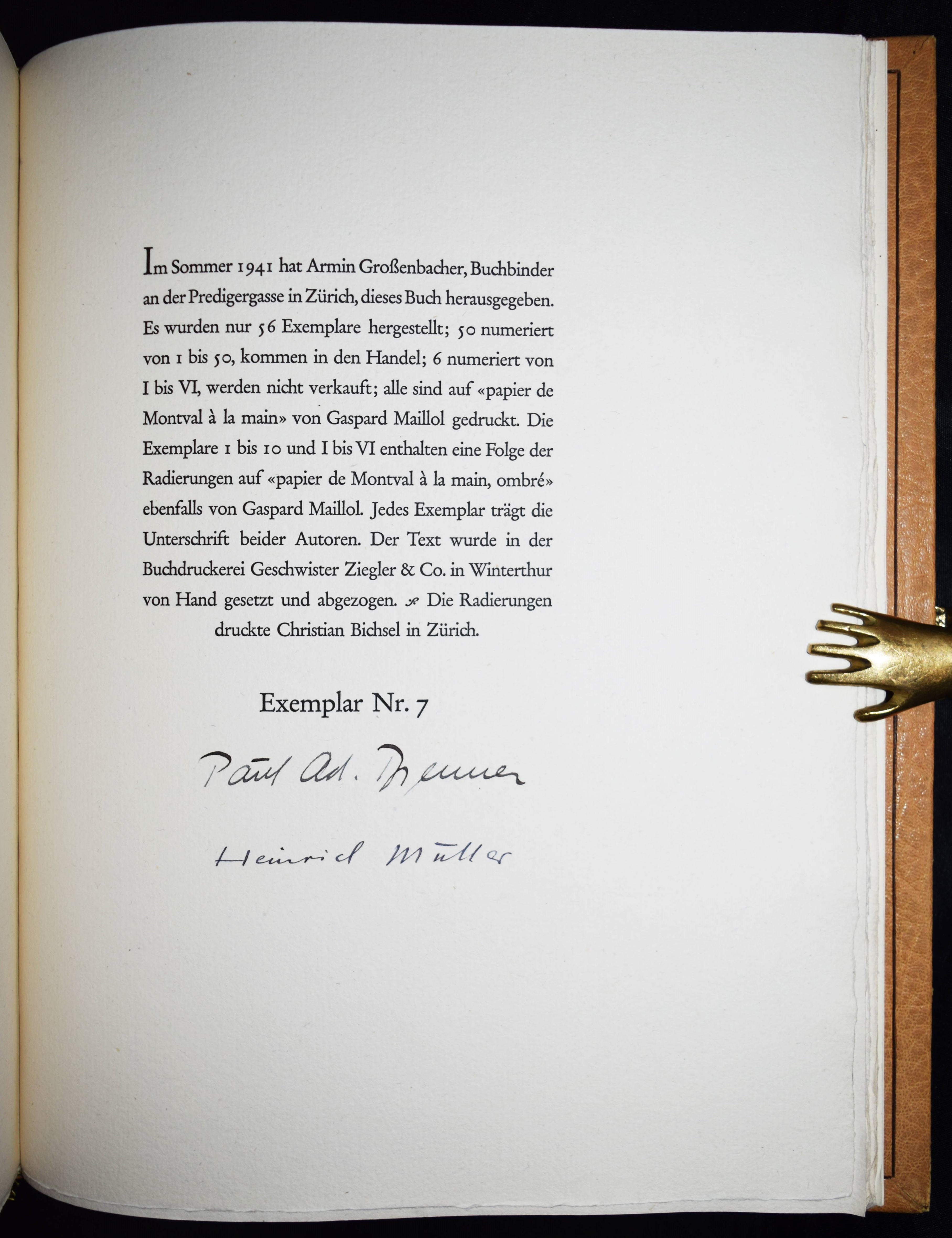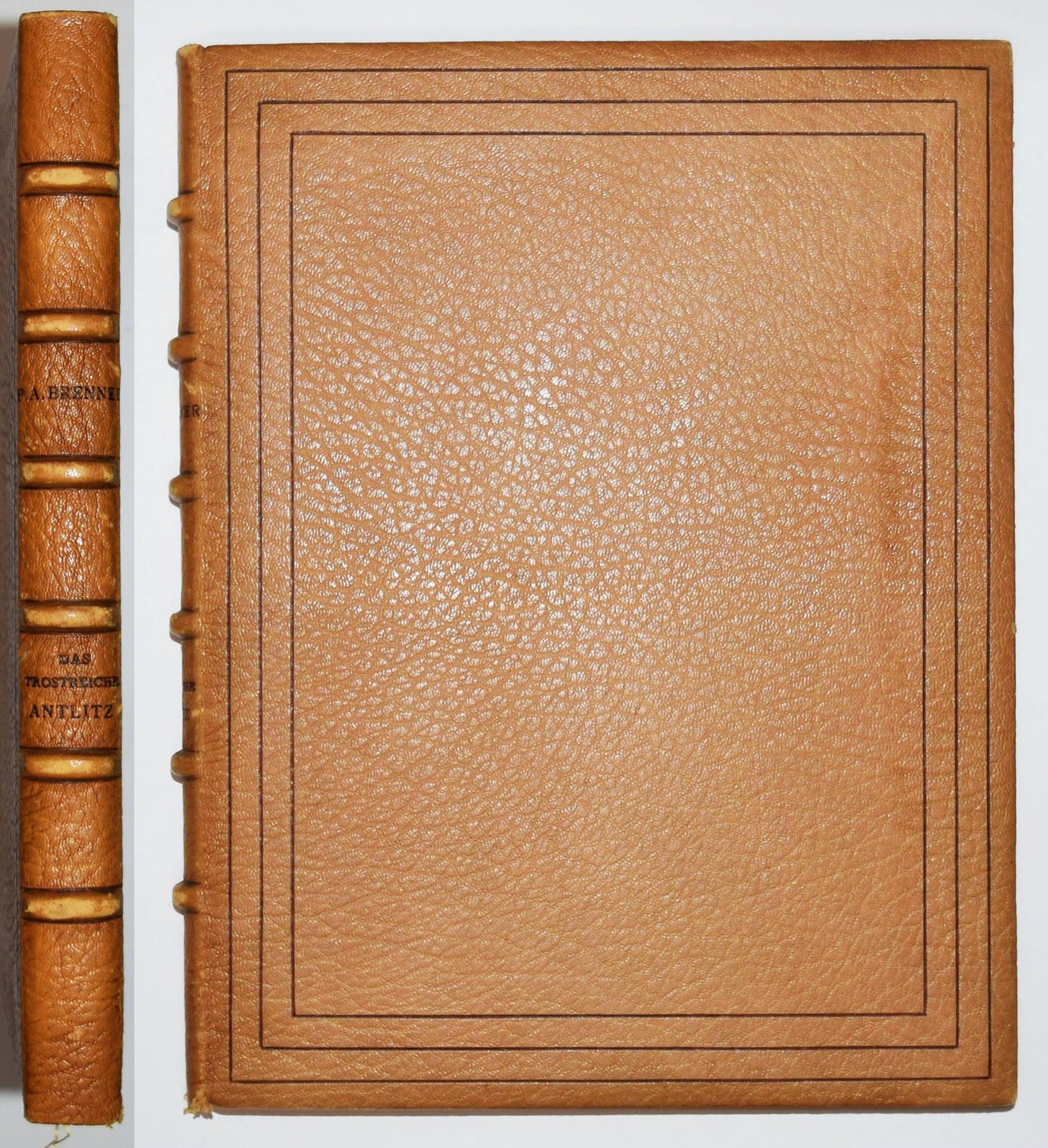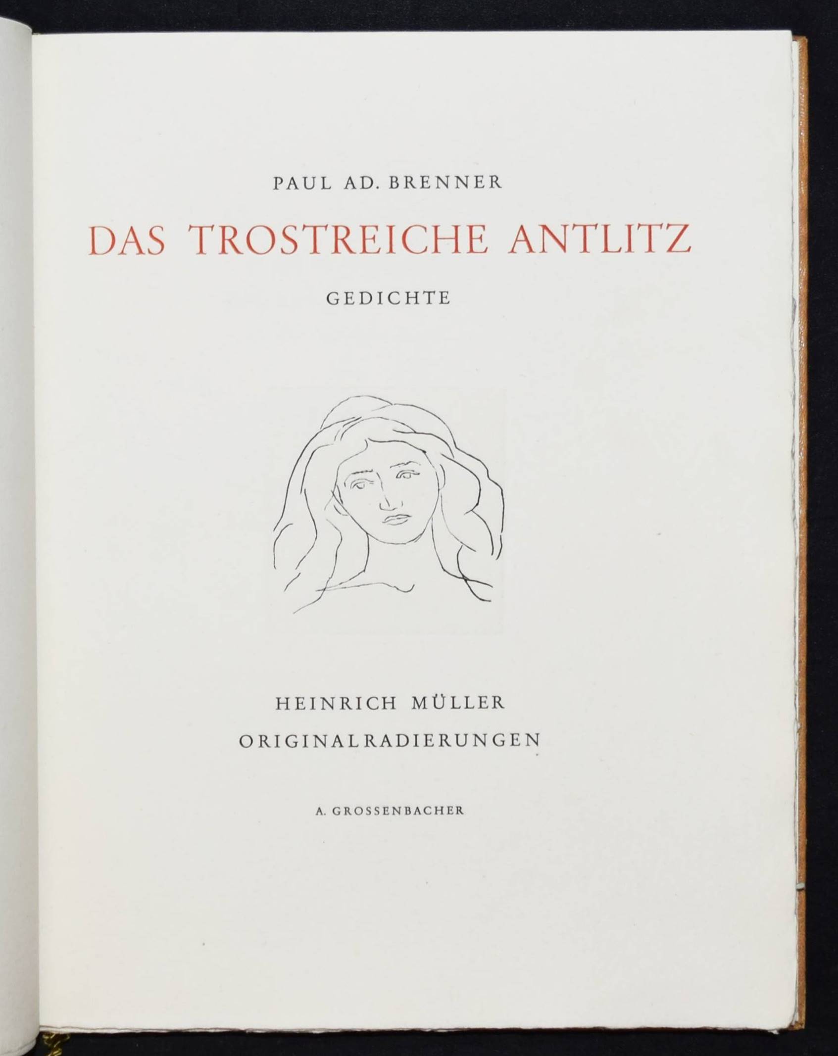 Brenner, Paul Ad(olf). Das trostreiche Antlitz. Gedichte. Heinrich Müller Originalradierungen. (Zürich, Armin Großenbacher 1941). Folio (35,5 x 26,5 cm.). 80 S., [1] Bl. mit Titel in Rot u. Schwarz, gestoch. Titelvignette u. 18 Orig.-Radierungen sowie Suite mit weiteren 18 Radierungen. Hellbrauner OLdr. mit 6 unechten Bünden, Rückentitel u. Deckelfiletten sowie Kopfgoldschnitt (signiert: D. Ogisz). Nr. 7 von 10 Exemplaren der Vorzugsausgabe (GA 56 Exemplare). – Von P. A. Brenner u. H. Müller im Druckvermerk signiert und mit einer zusätzlichen Suite der Radierungen. – Druck auf „Papier de Montval à la main“ von Gaspard Maillol. Die Radierungen druckte Christan Bichsel in Zürich. – Der Schweizer Lyriker P. A. Brenner (1910-1967) arbeitete bis 1957 als Kaufmann. „Man war jung genug, zwischen den Aufführungen der „Dreigroschenoper“, Vorträgen über das Bauhaus Dessau und Protestkundgebungen gegen die Verurteilung Saccos und Vanzettis dennoch in den Gedichtbüchern Hofmannthals, Rilkes und Georges sich zu ergänzen. Zwei Reisen nach Dalmatien, längere und kürzere Aufenthalte in Paris und in der Provence, bewahrten mich davor, in meinem unfreiwillig ausgeübten Berif als Kaufmann zu erstarren. Meine ersten Gedichtbücher schrieb ich unterwegs in Eisenbahnzügen, Wartesälen, in Cafés und billigen Hotelzimmern. Vieles von dem, das ich bis ungefähr 1938 publiziert habe, trägt deutlich die Zeichen des Unsteten und einer Zeit, die wirklichkeitswach und spannungsgeladener war als die heutige. Während man in Zürich den ersten Dichtern der Emigration begegnete und uns Ignazio Silone aus „Fonramara“ vorgelesen hatte, fielen Bomben auf Guernica. Als ich begriff, dass mit Verseschreiben die schiefen Verhältnisse, in die das ermüdete, zerwühlte Europa geriet, nicht zu ändern waren, stand ich mit meiner Arbeit dort, wo man nicht mehr an Eingebung und „blaue Stunden“ glaubt. Fragt man mich, warum ich trotzdem Gedichte mache, so muss ich antworten: Um mich in das zu verwandeln, was anscheinend meiner innersten Natur entspricht“ (P. A. Brenner am 29. 2. 1960 in „Schweizer Schriftsteller der Gegenwart“). – Der Maler, Graphiker und Kunstpädagoge H. Müller (1903-1978), Schüler von Ernst Würtenberger in Karlsruhe, war Mitbegründer der Künstlervereinigung „Der graphische Kreis“ und von 1943 bis 1949 Präsident der Zürcher Sektion der Gesellschaft Schweizerischer Maler und Bildhauer (GSAMBA). – Schönes Exemplar in einem dekorativen signierten Handeinband.